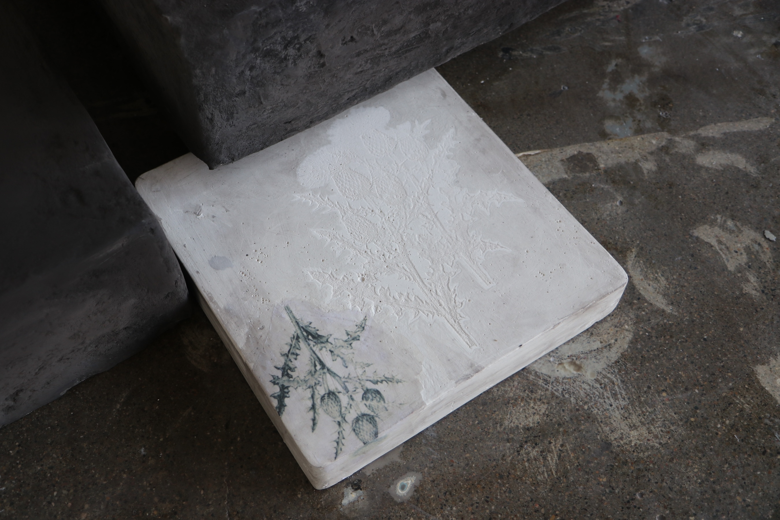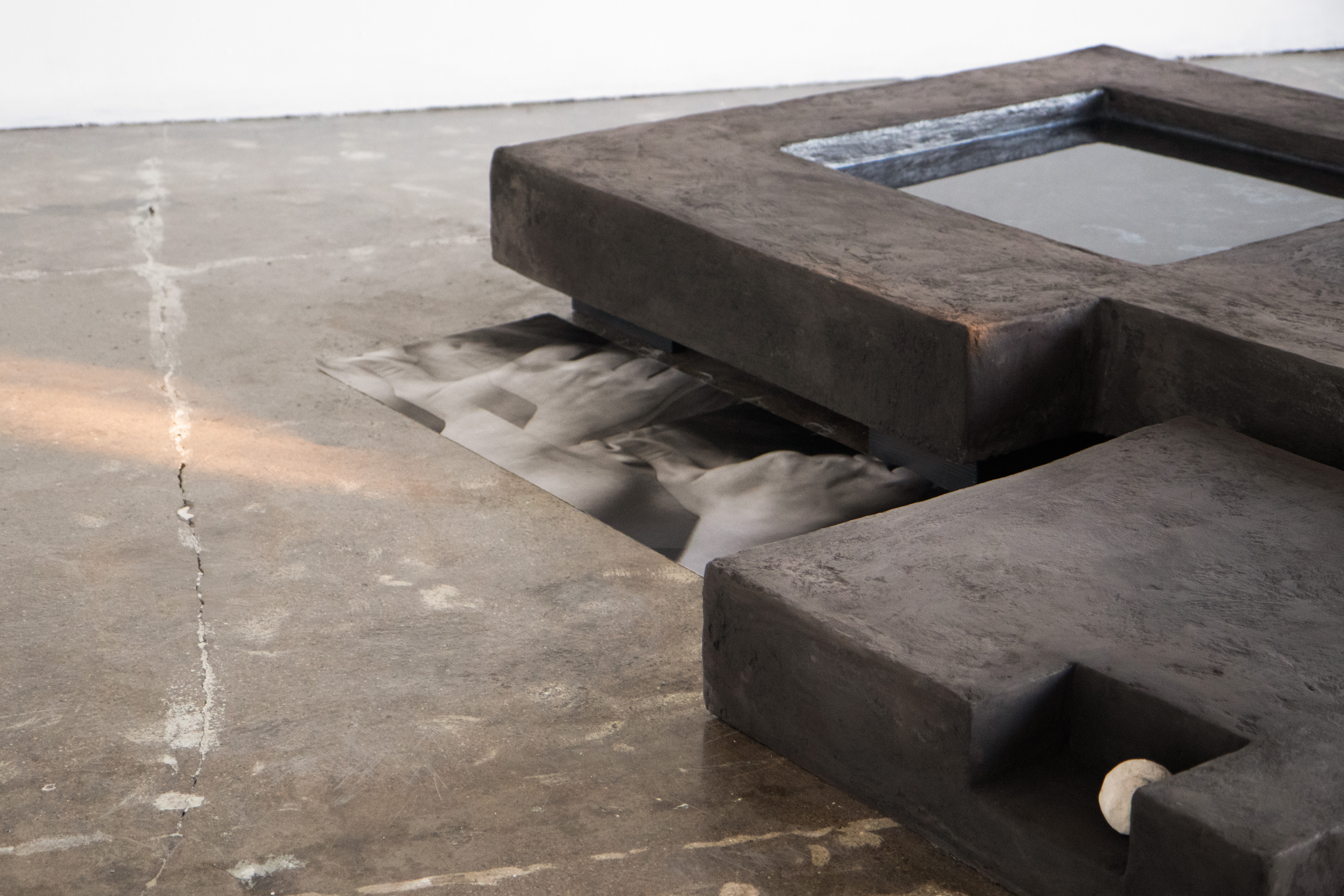 The cement slab itself, representing the hard outer shell of the oyster, is rubbed in charcoal and holds shallow still water. It hovers over its more delicate components: a repetitively laser etched plaster cast depicting resilient Bull Thistle, images of Theobald's own self-soothing and tenacious touch, and a sand-pearl from Lake Michigan. This piece pinpoints the affective tension point between weight/levity, harmony/dissonance, and reservation/seduction.