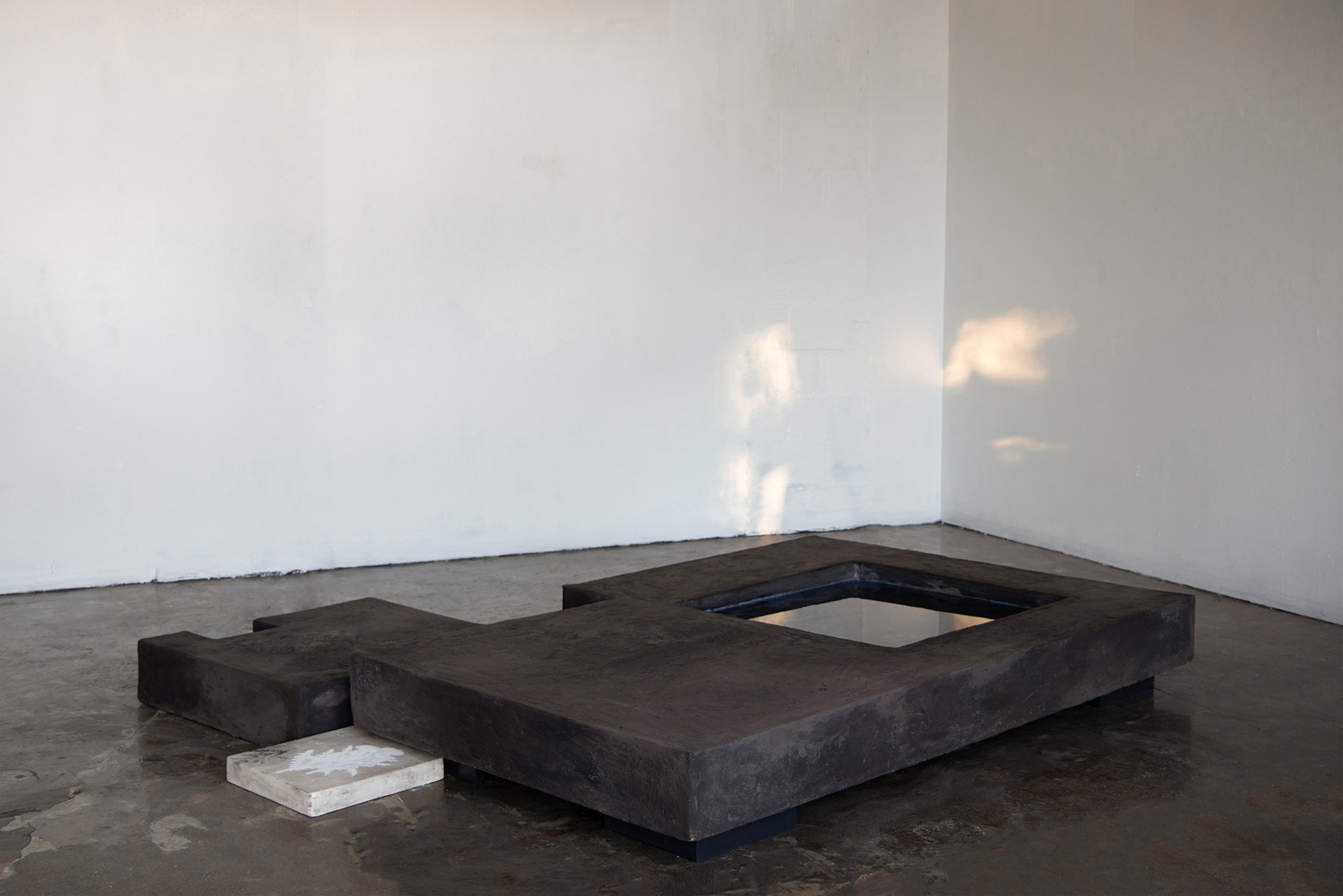 This sculptural work is paired in equal hierarchy with a looped cello score that the artist, Aubrey Theobald, composed and played herself, projected from two dual pairing speakers at opposing sides of the slab. The eight-minute looped cello score grows from delicate plucking to crushing dissonant chords. As viewers walk around the slab, the dissonance resolves itself and transitions to calm, then back again.