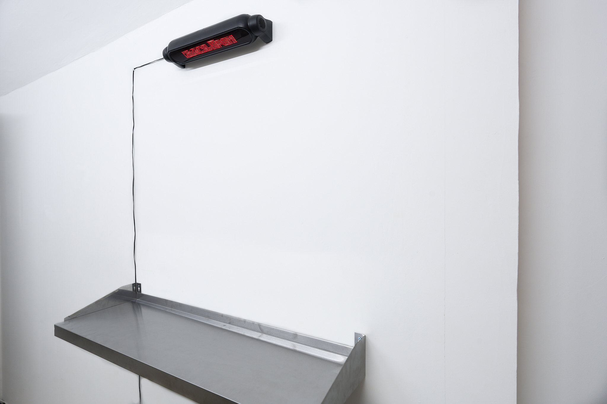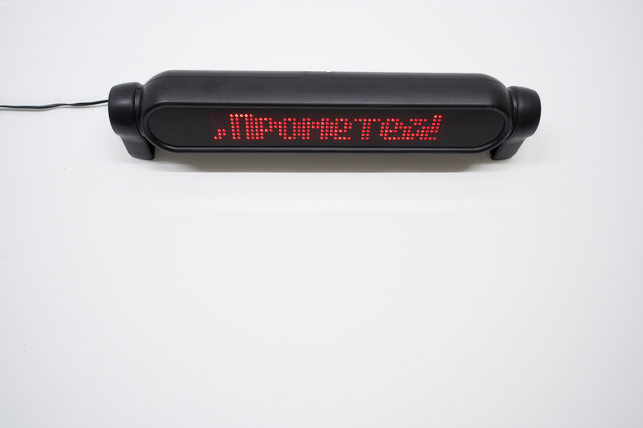 Yet the myth also raises questions about the limits of human aspiration. Prometheus does not simply rebel against the gods; he challenges the idea of predetermined fate, reminding us that progress carries both promise and consequence. Repeated endlessly on a scrolling LED display, the phrase transforms into a suspended address—oscillating between invocation and warning, command and plea. Prometheus appears here not only as a figure of defiance, but as a philosophical allegory of what it means to be human.