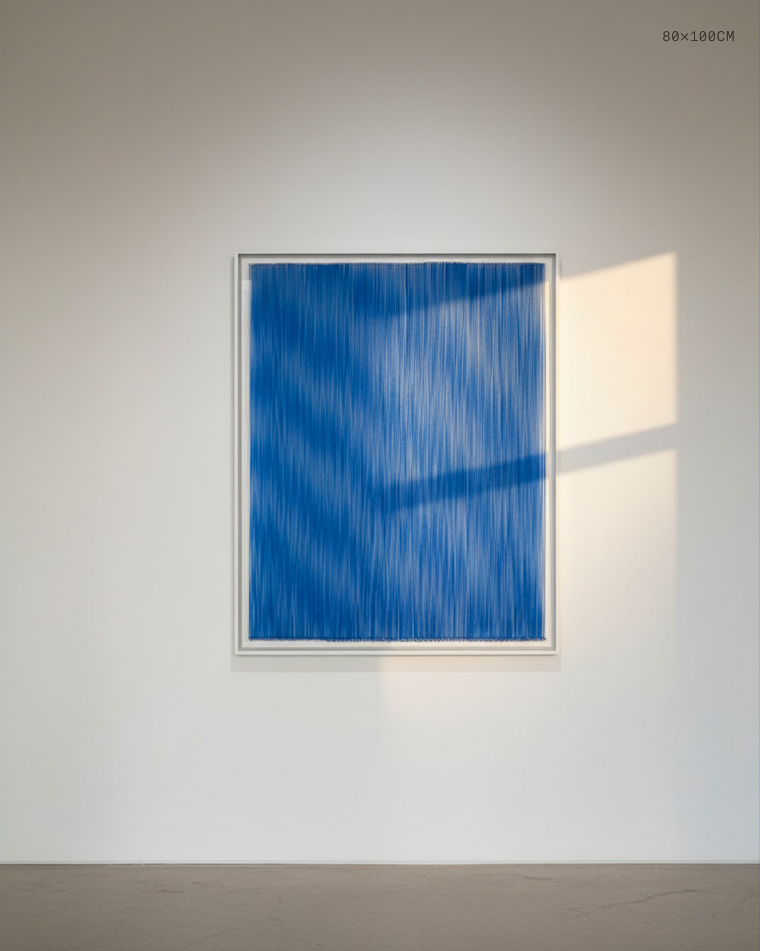 This work explores rhythm, tension, and subtle shifts through layered blue thread. Depending on light and viewpoint, the surface changes continuously, forming a visual field that never appears fully fixed.