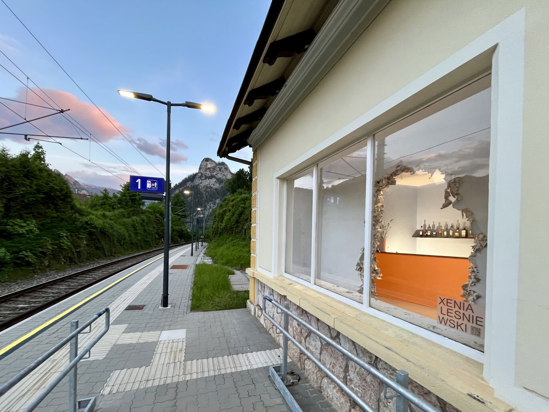 The railway station "Traunkirchen Ort", remote from the actual town of Traunkirchen, serves as a backdrop and performance space for the artist Xenia Lesniewski and her doomsday bar "APOCALYPSO".