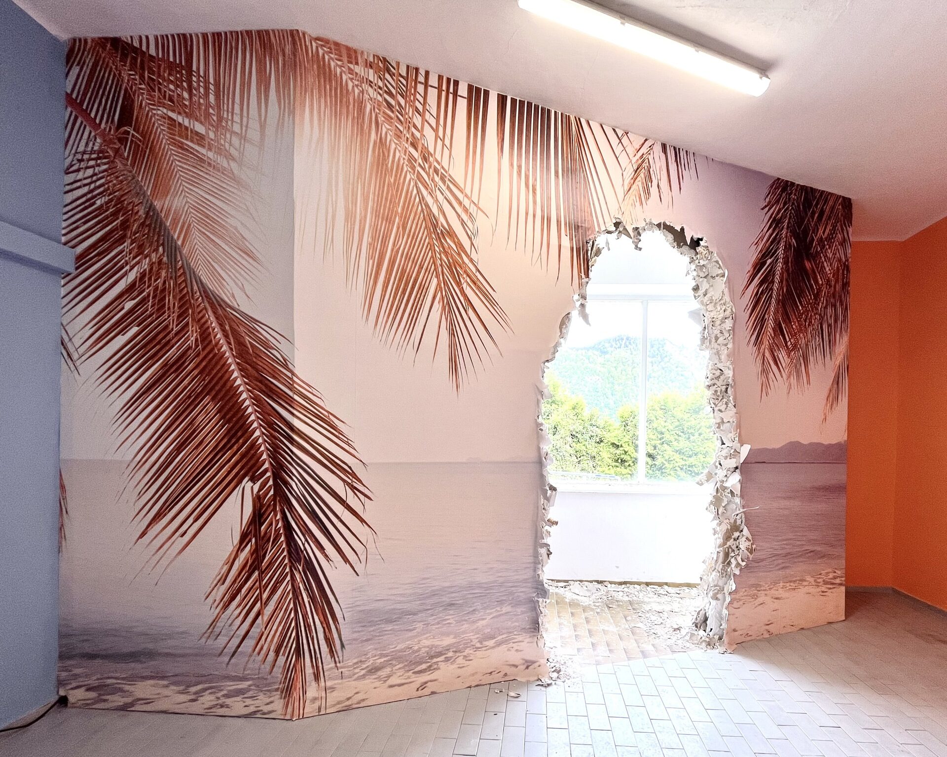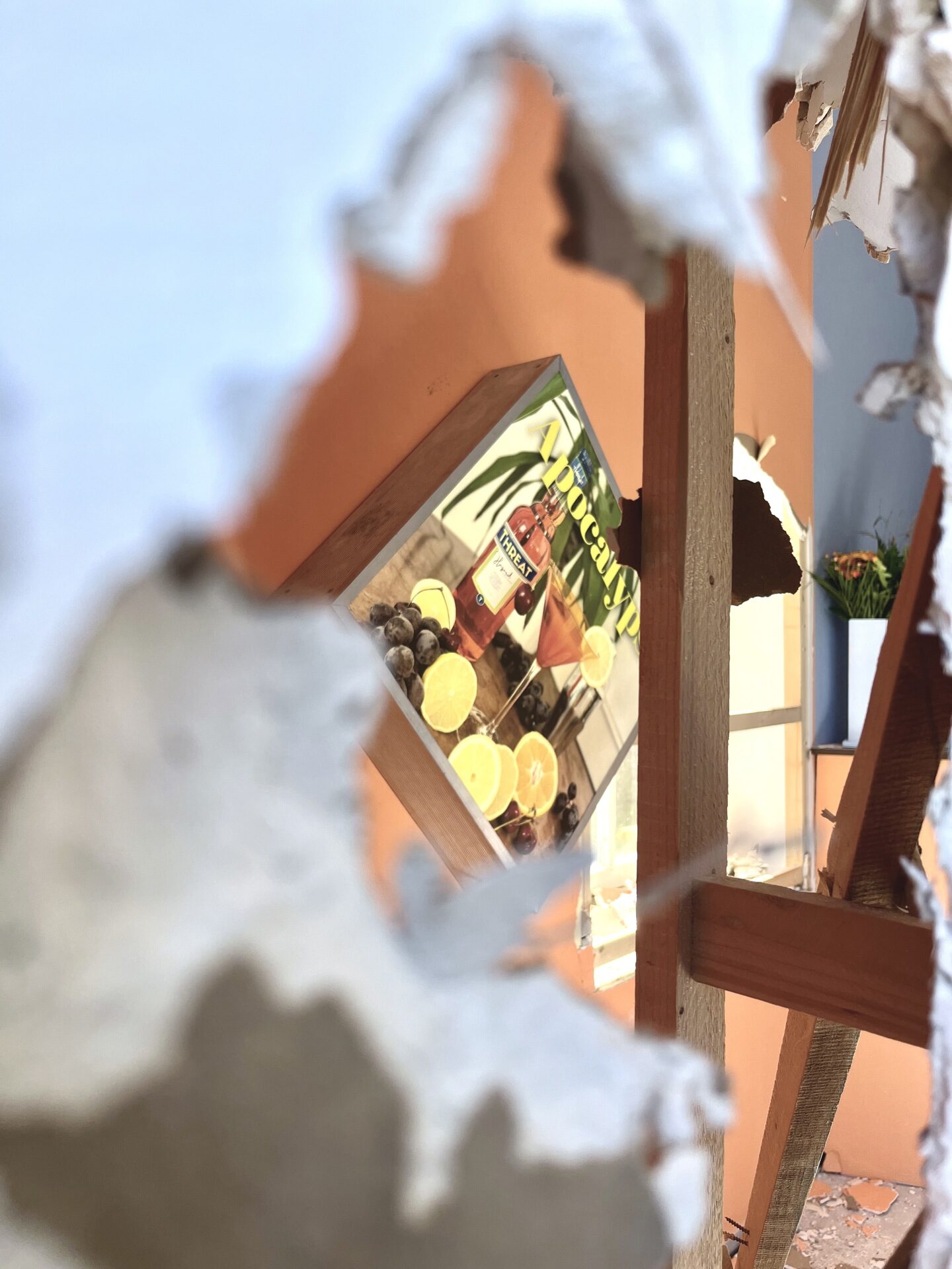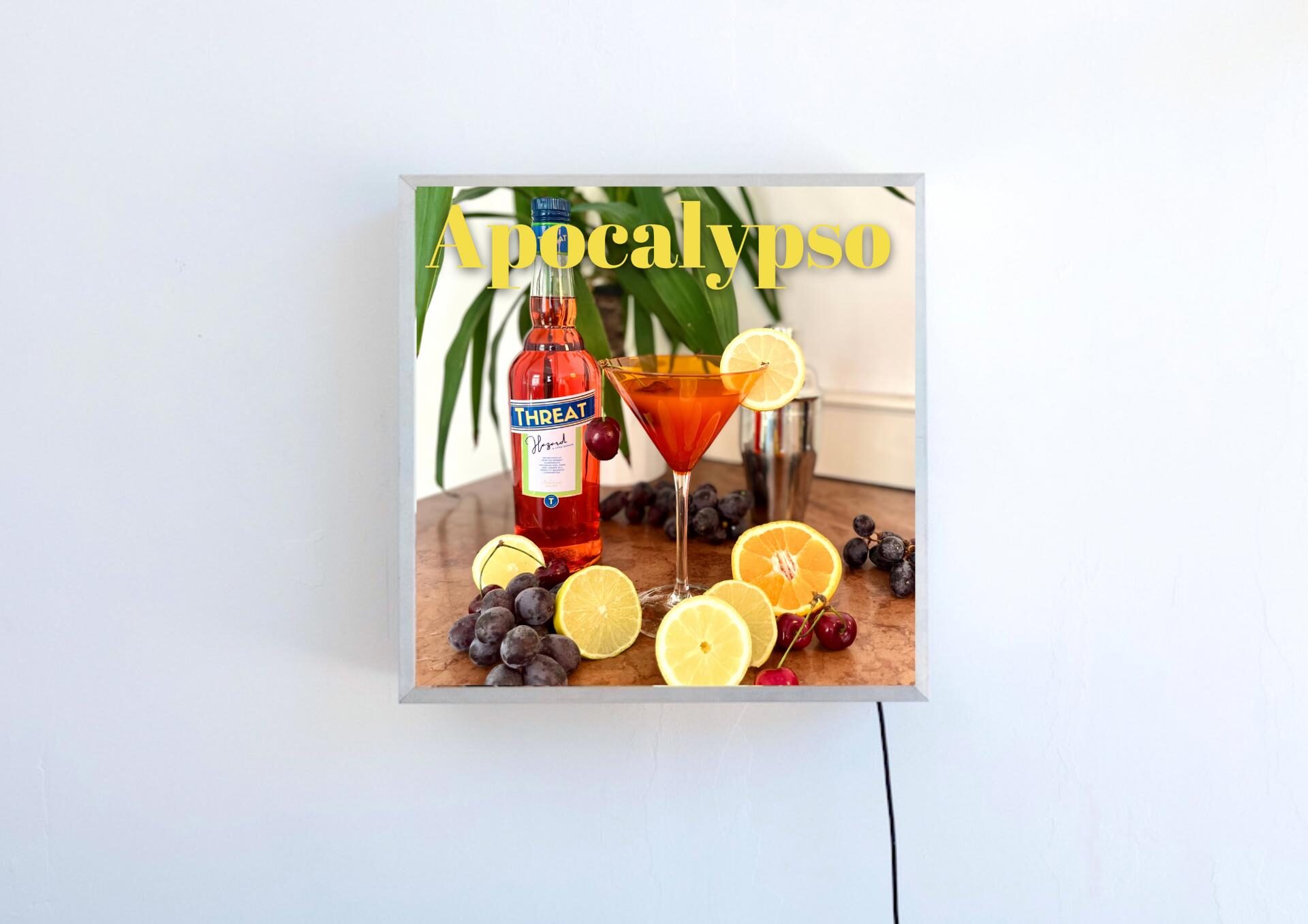 The site-specific environment includes a hidden panic room bar with bottle objects, light boxes, a drinks menu and hand-engraved glasses. Here, visitors can enjoy a glass of PANIC, CHANGE or HOPE and relax in a supposedly protected atmosphere. The “APOCALYPSO” offers the perfect ambience to deal with existential threats and uncertainties and to indulge in mixed feelings.