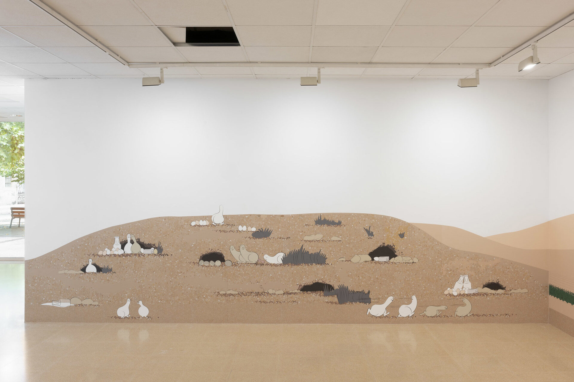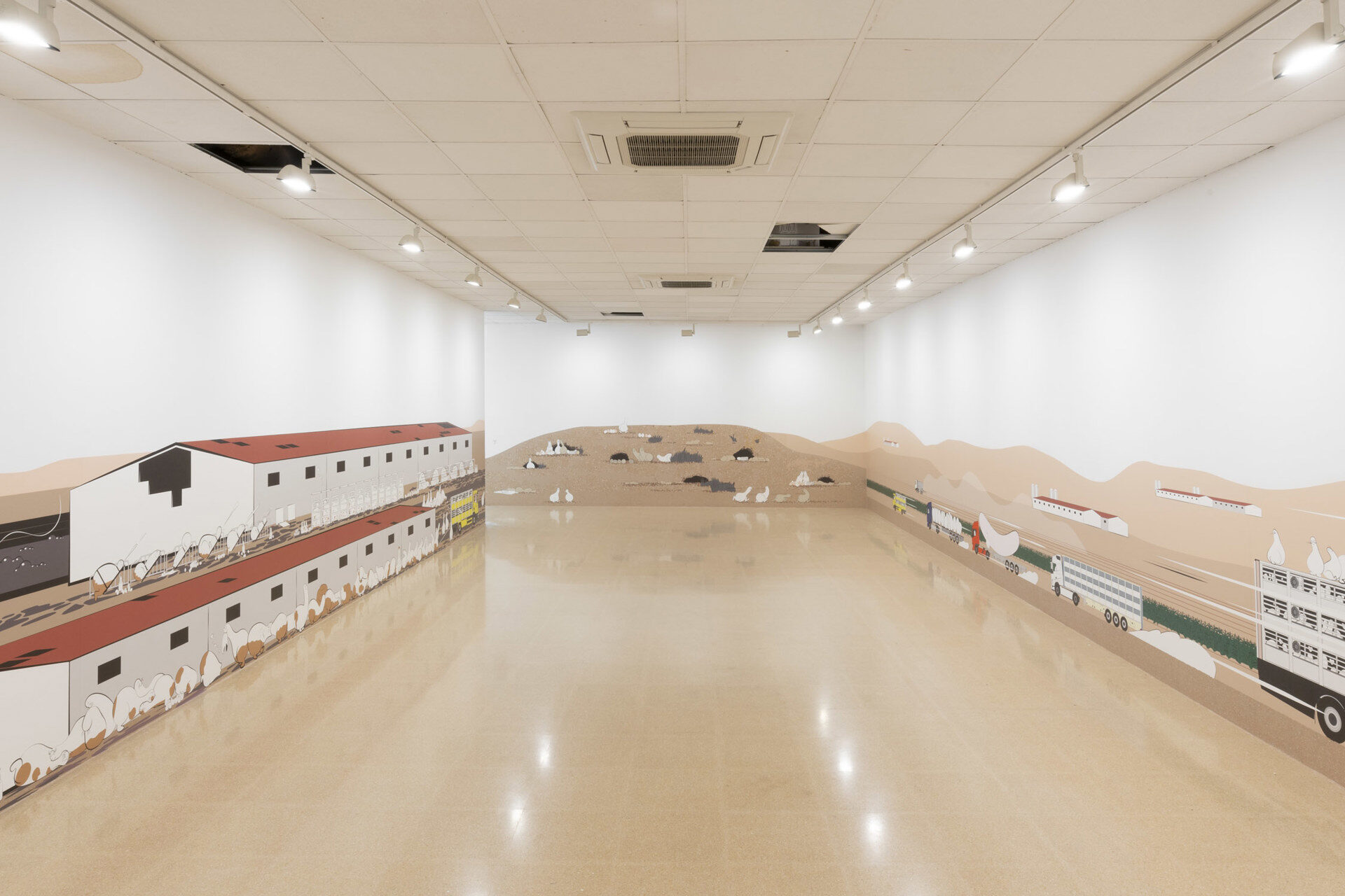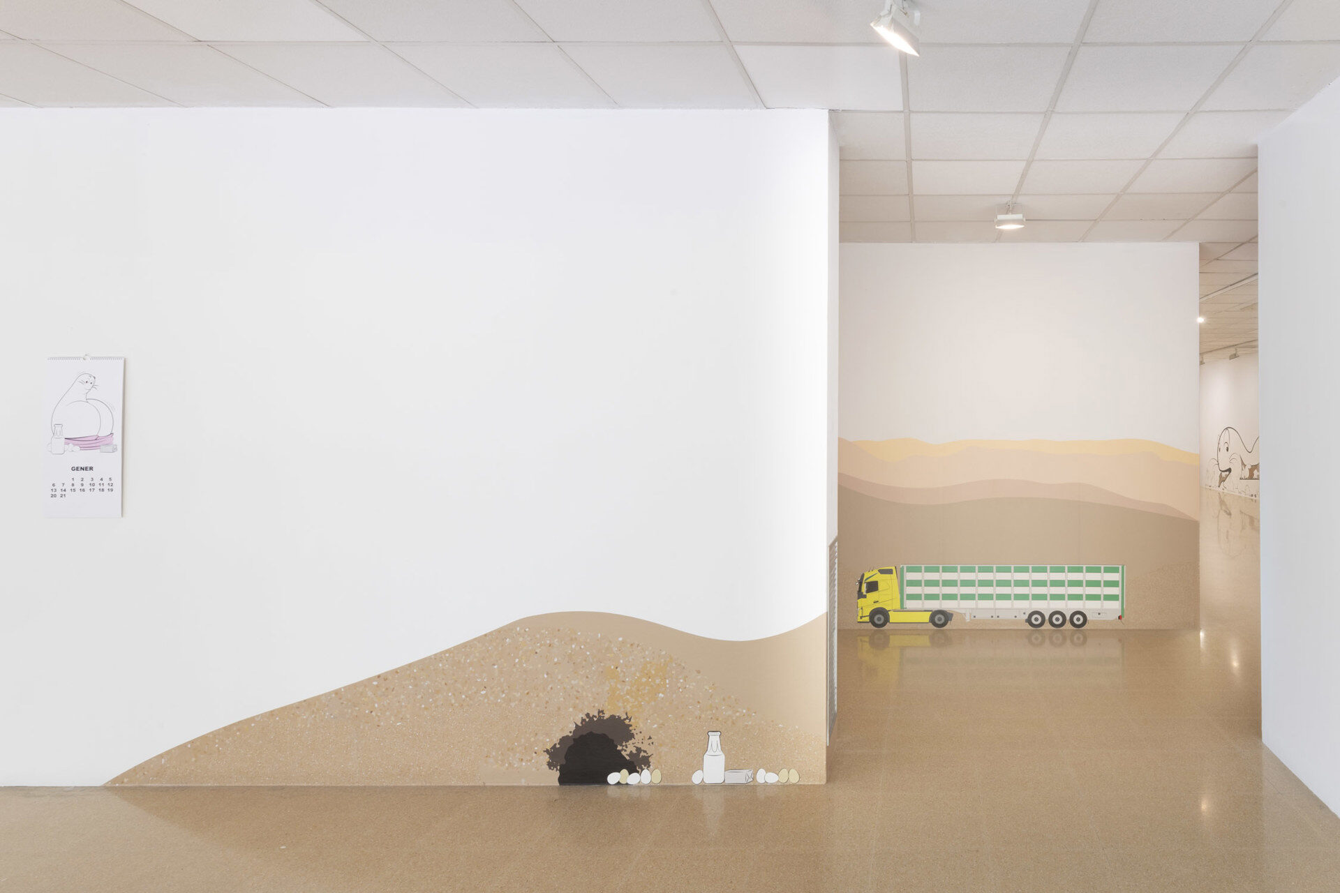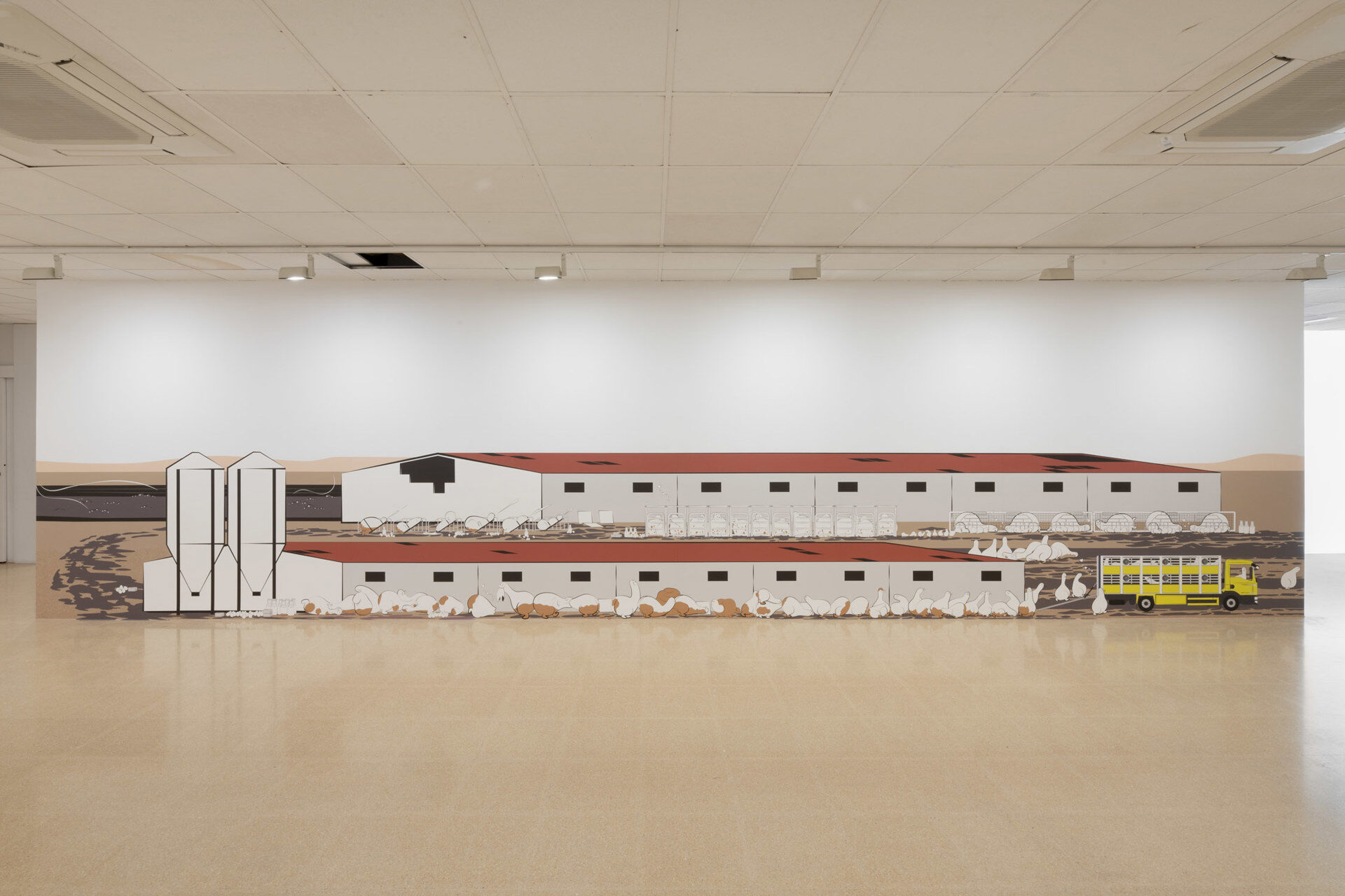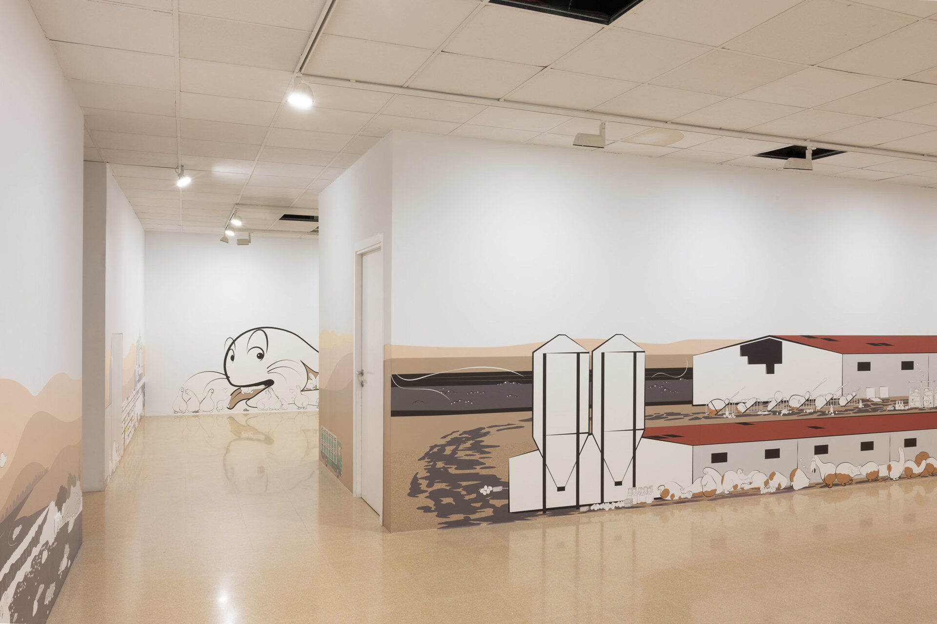 At ACVIC we can find a mural which covers the entirety of the two main rooms, where shmoos—a fictional animal species originally created by comic book artist Al Capp in the 1940s—run through the landscapes of the meat industry in the region, the farms, the C-25 motorway, the Balenyà slaughterhouses, the Gurb estate, the Ter river.
