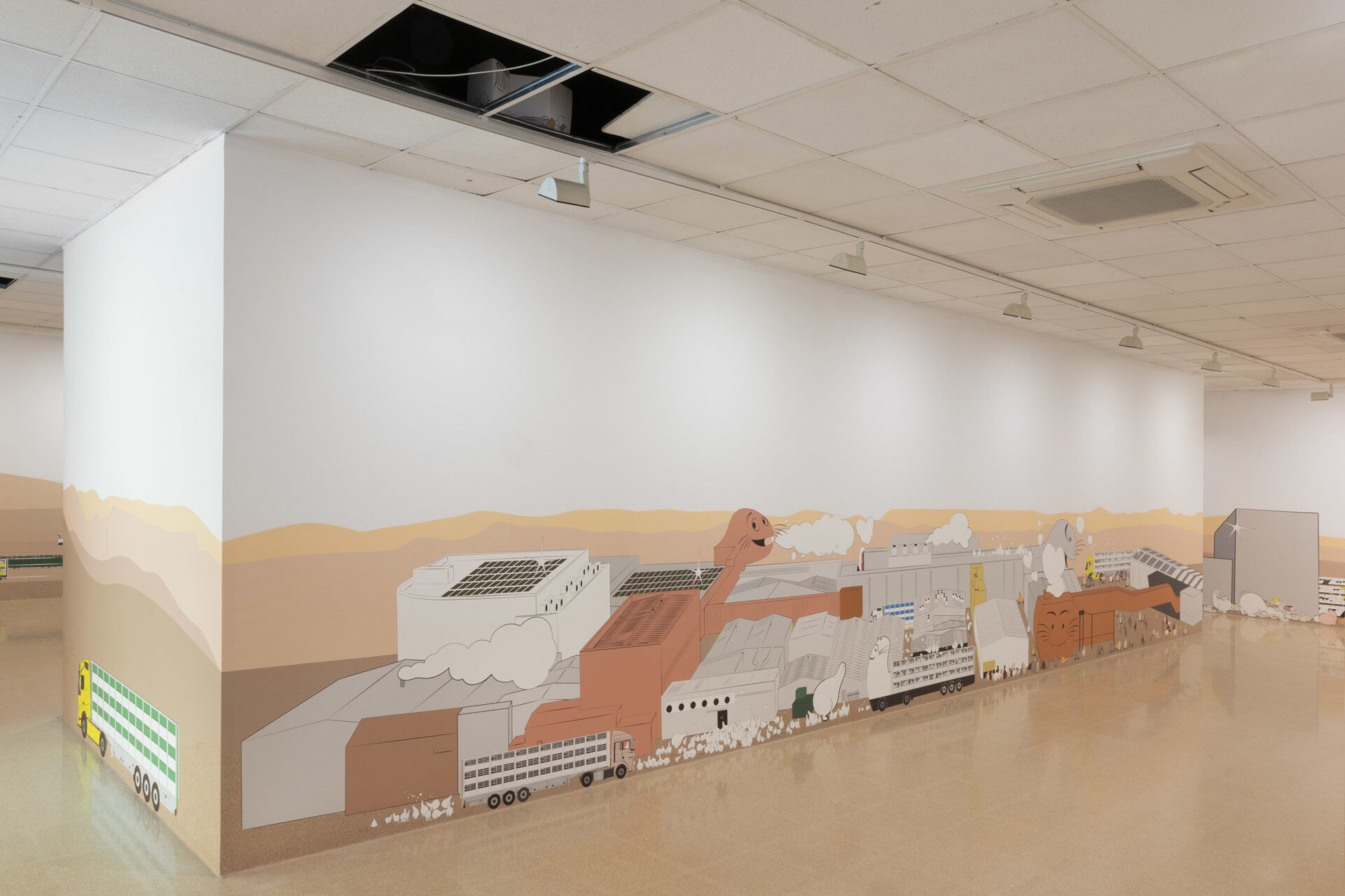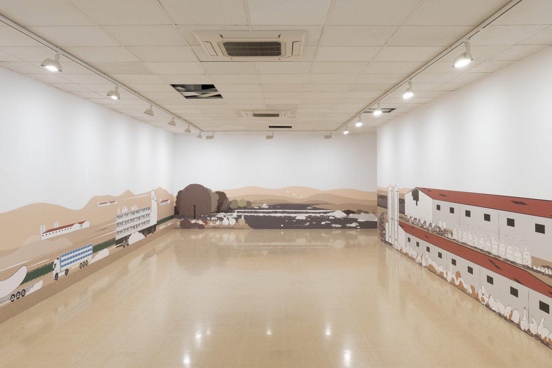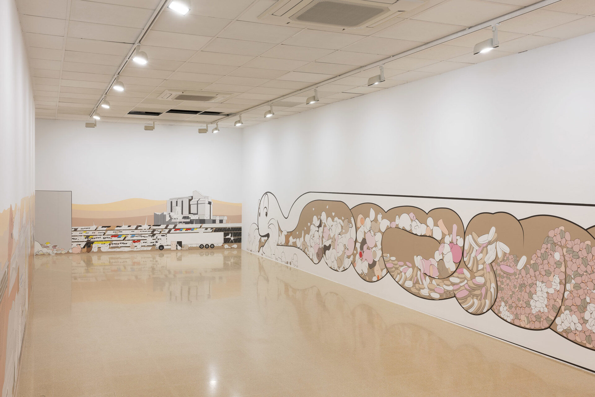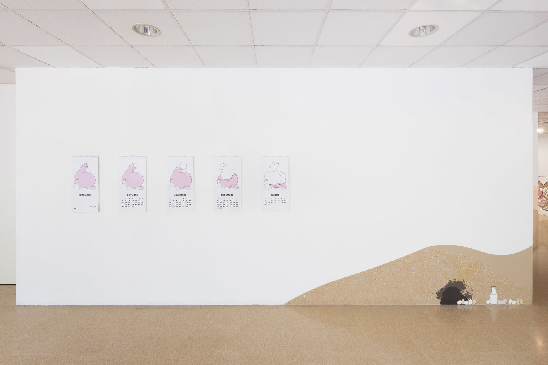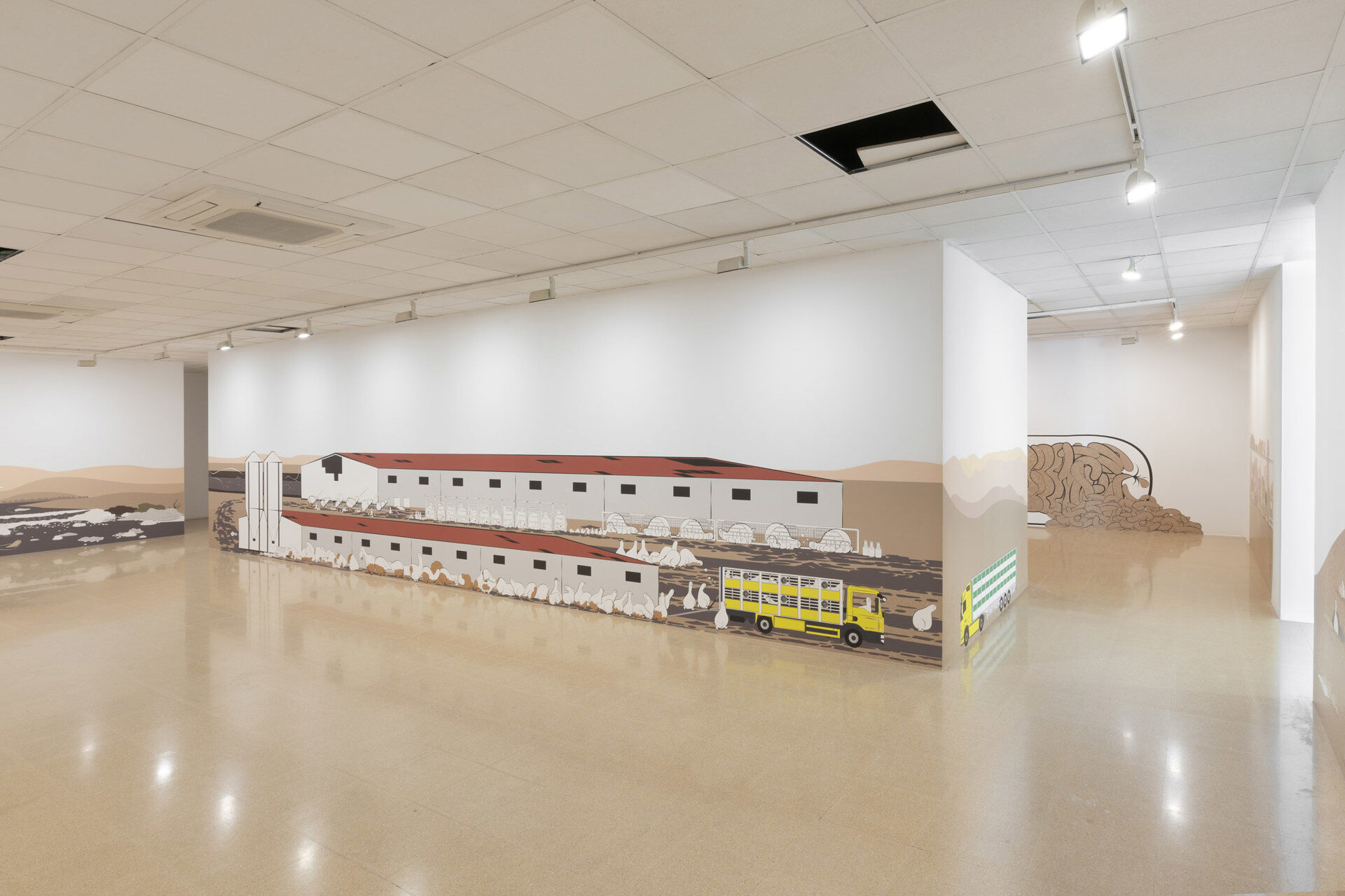 At ACVIC we can find a mural which covers the entirety of the two main rooms, where shmoos—a fictional animal species originally created by comic book artist Al Capp in the 1940s—run through the landscapes of the meat industry in the region, the farms, the C-25 motorway, the Balenyà slaughterhouses, the Gurb estate, the Ter river.
