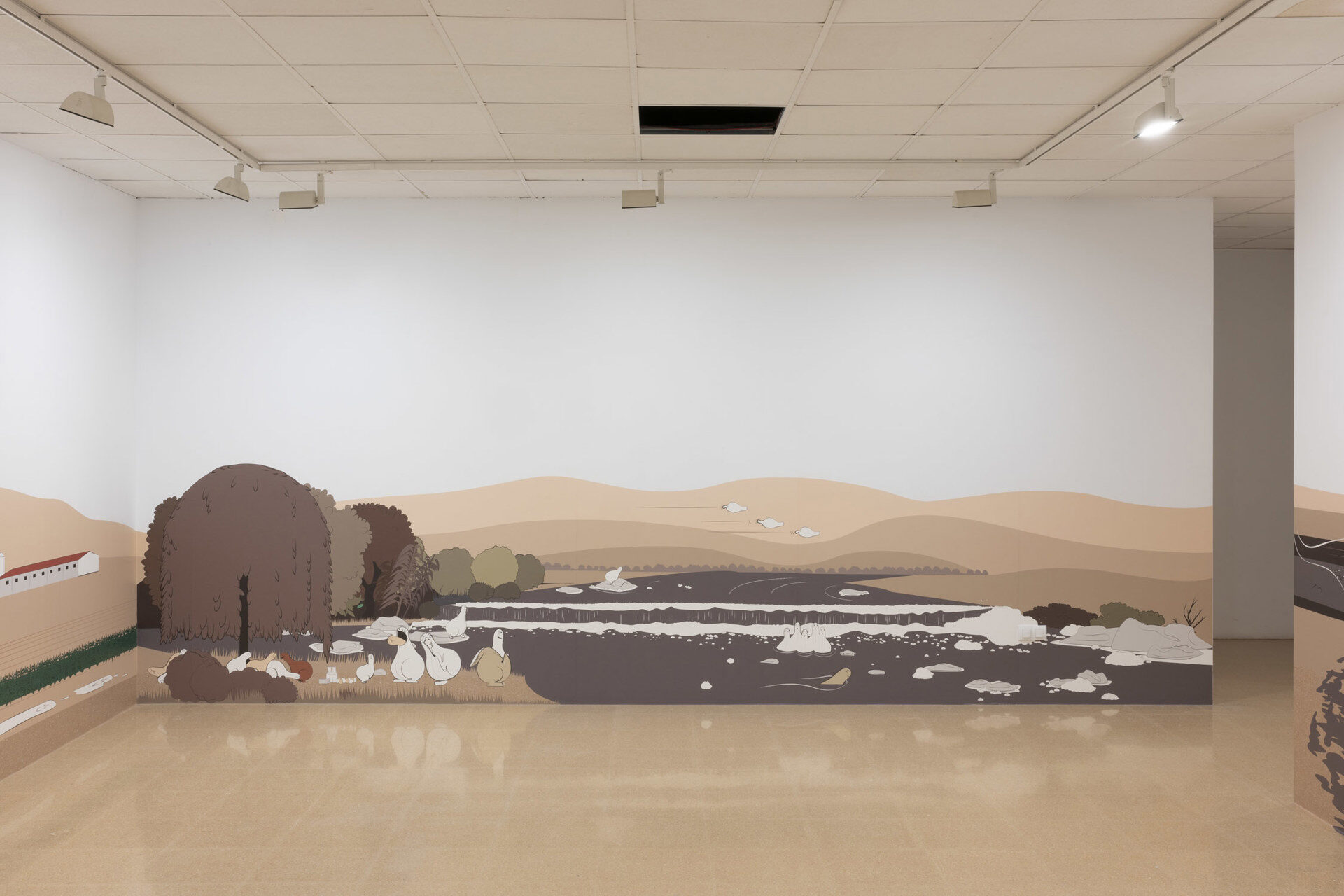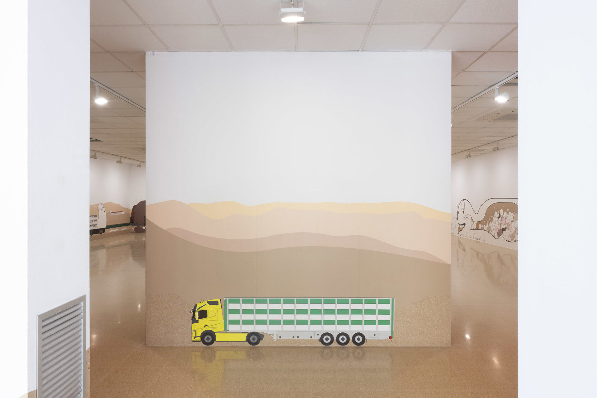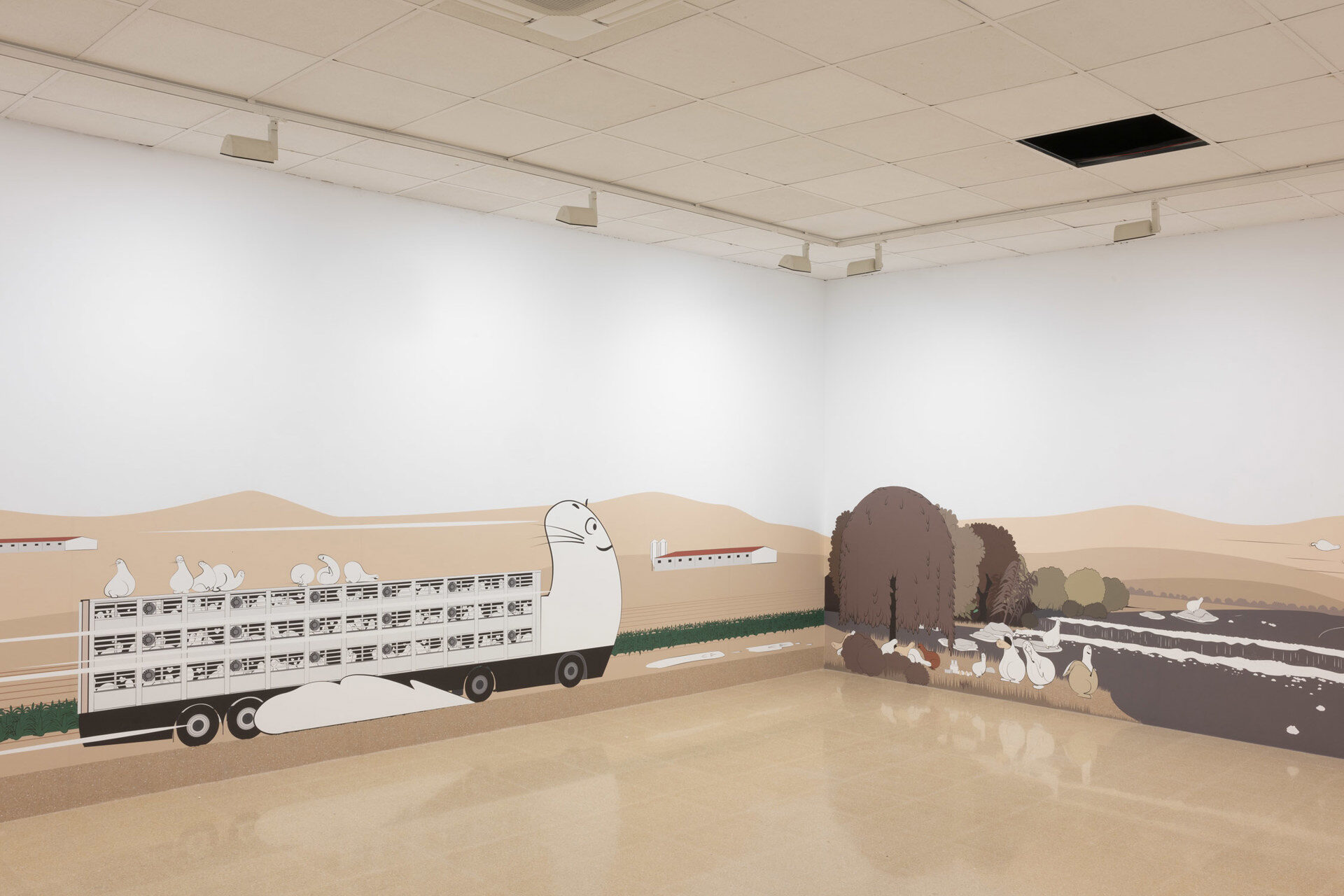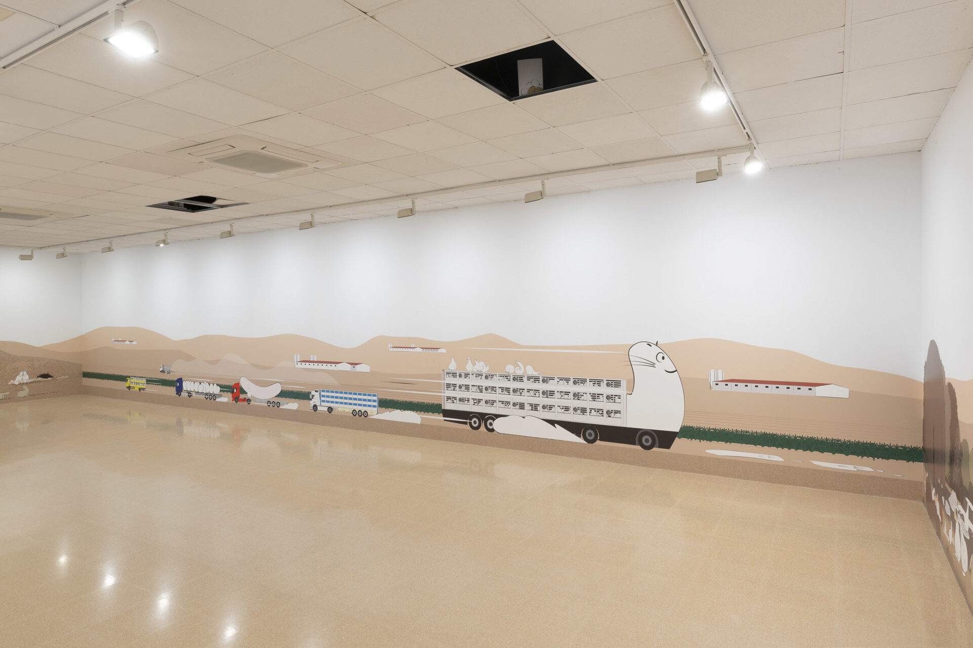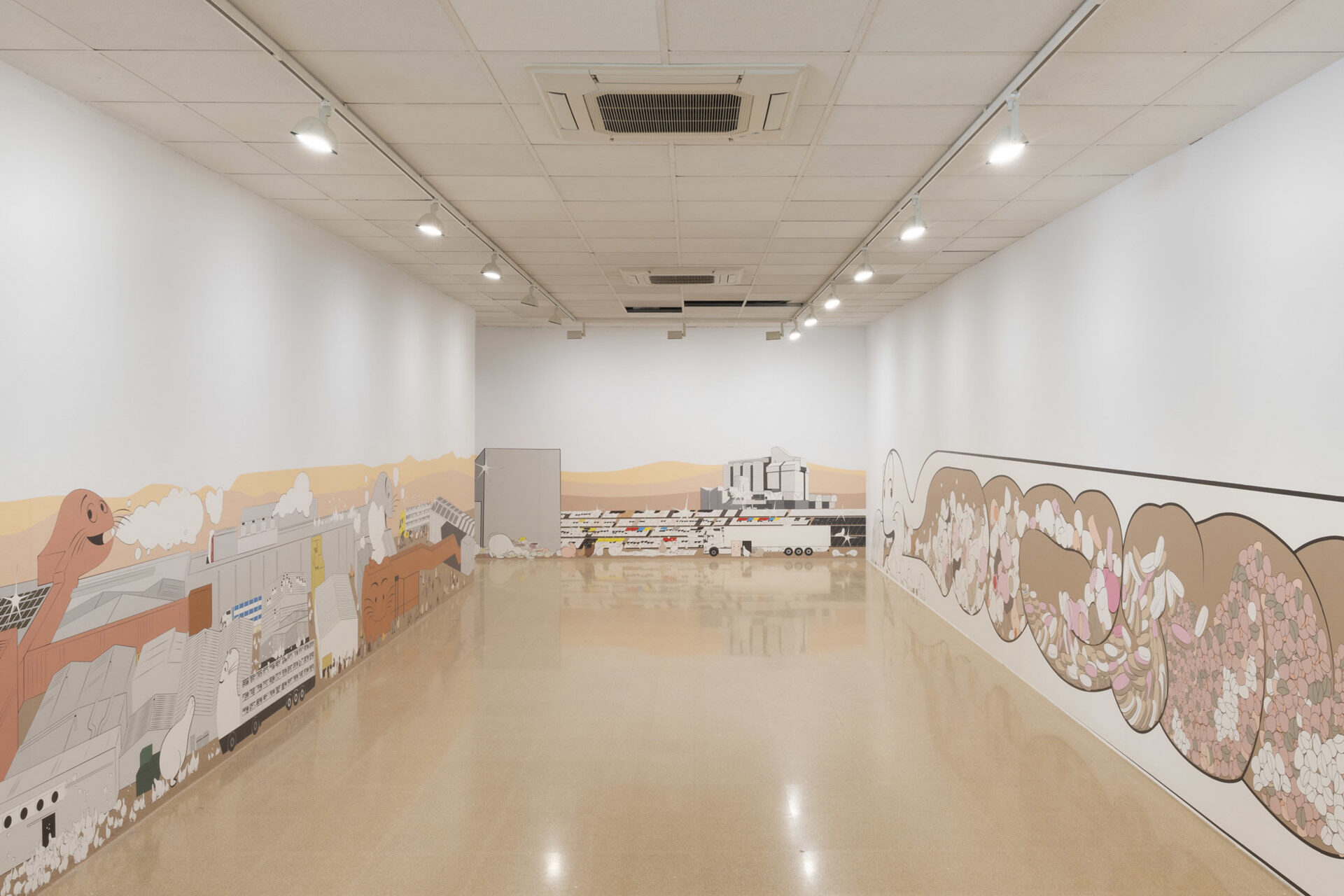 At ACVIC we can find a mural which covers the entirety of the two main rooms, where shmoos—a fictional animal species originally created by comic book artist Al Capp in the 1940s—run through the landscapes of the meat industry in the region, the farms, the C-25 motorway, the Balenyà slaughterhouses, the Gurb estate, the Ter river.