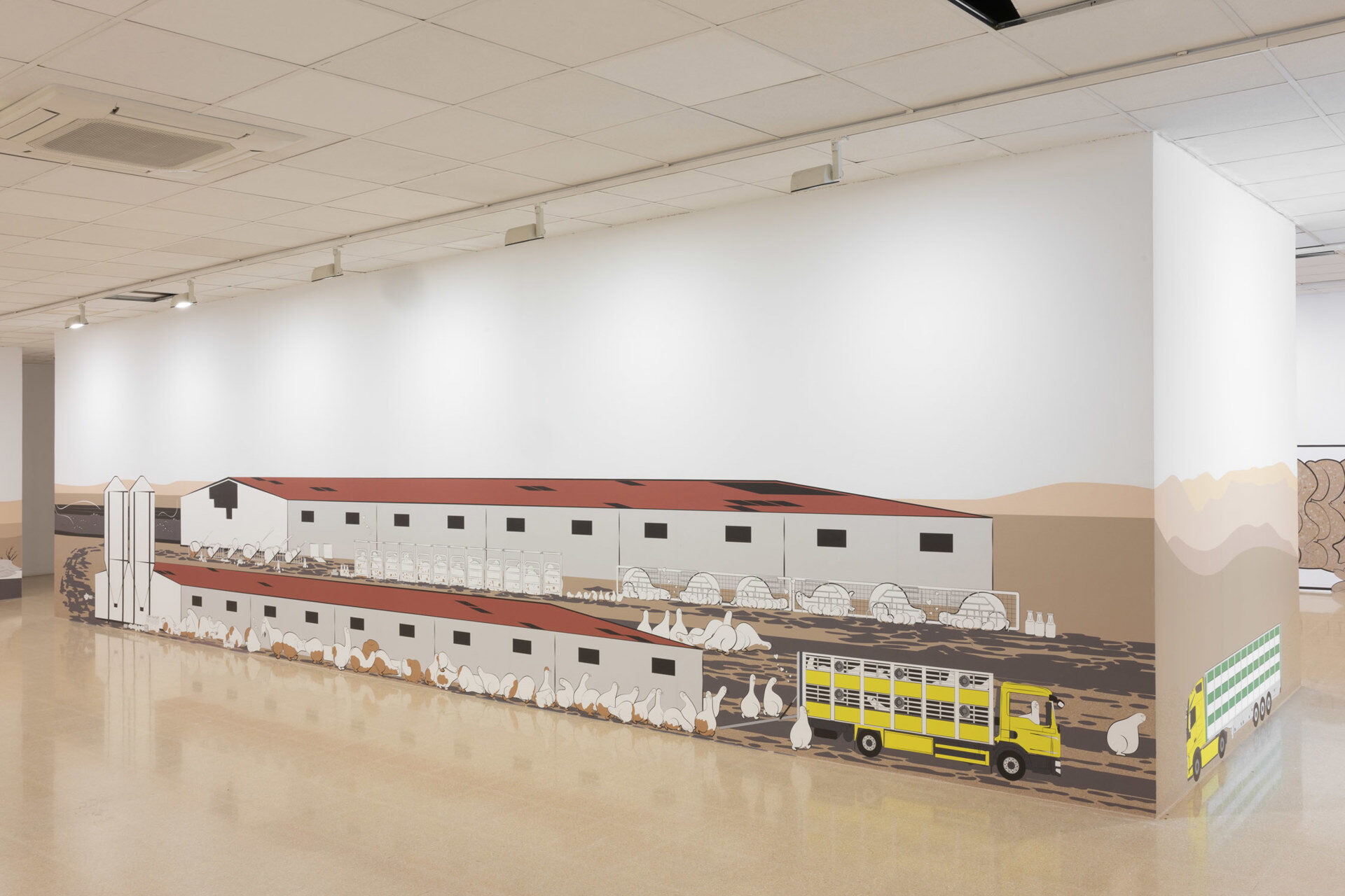 Francesc Ruiz’s project 3 months, 3 weeks, 3 days tackles the frictions which occur between animal exploitation, the food and tannery industries, logistics infrastructures, and the natural environment in the plain of Vic and its surrounding areas. The project opens up the already-existing imaginaries drawn from the history of comics, alternative hentai, and anti-speciesist feminism.
