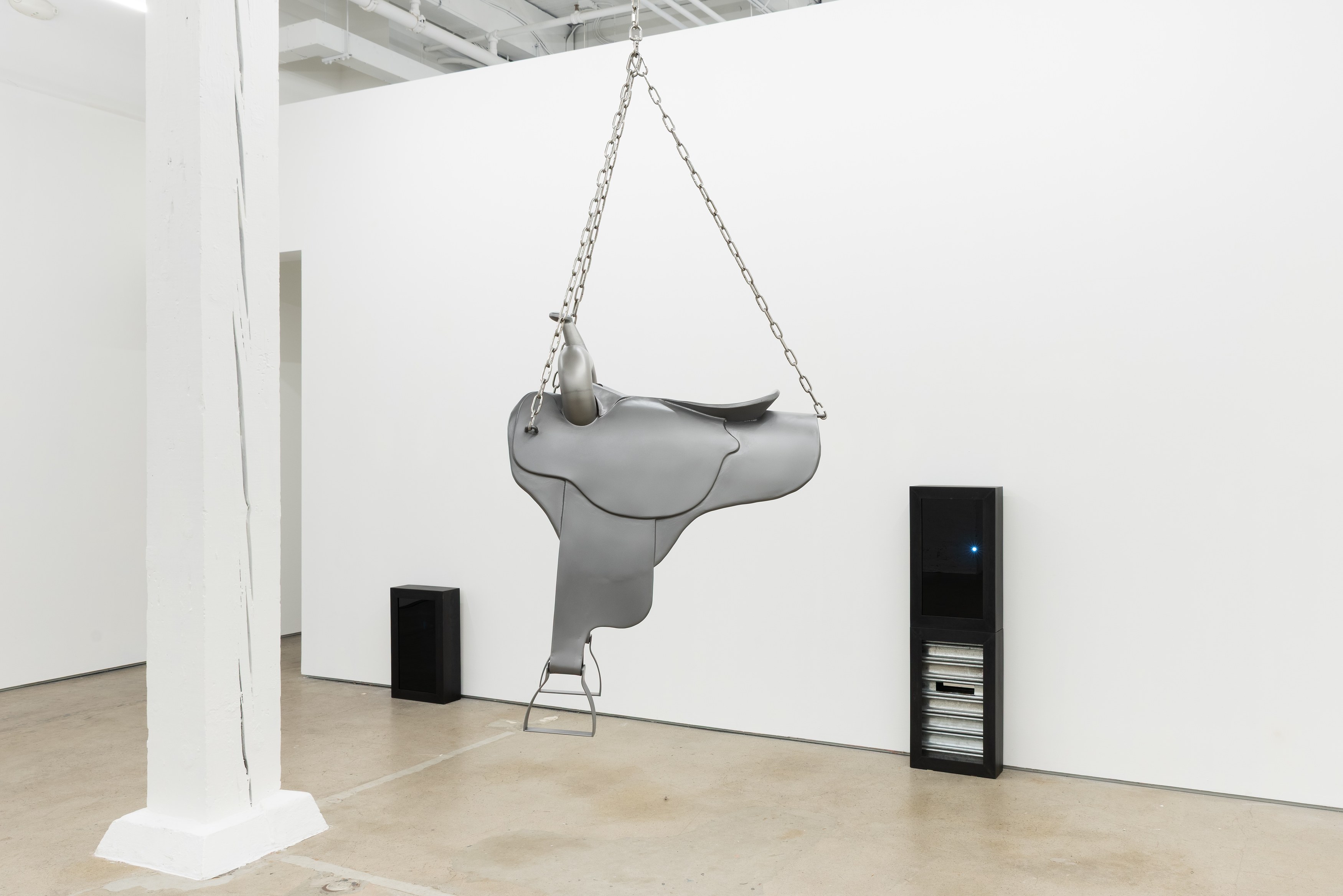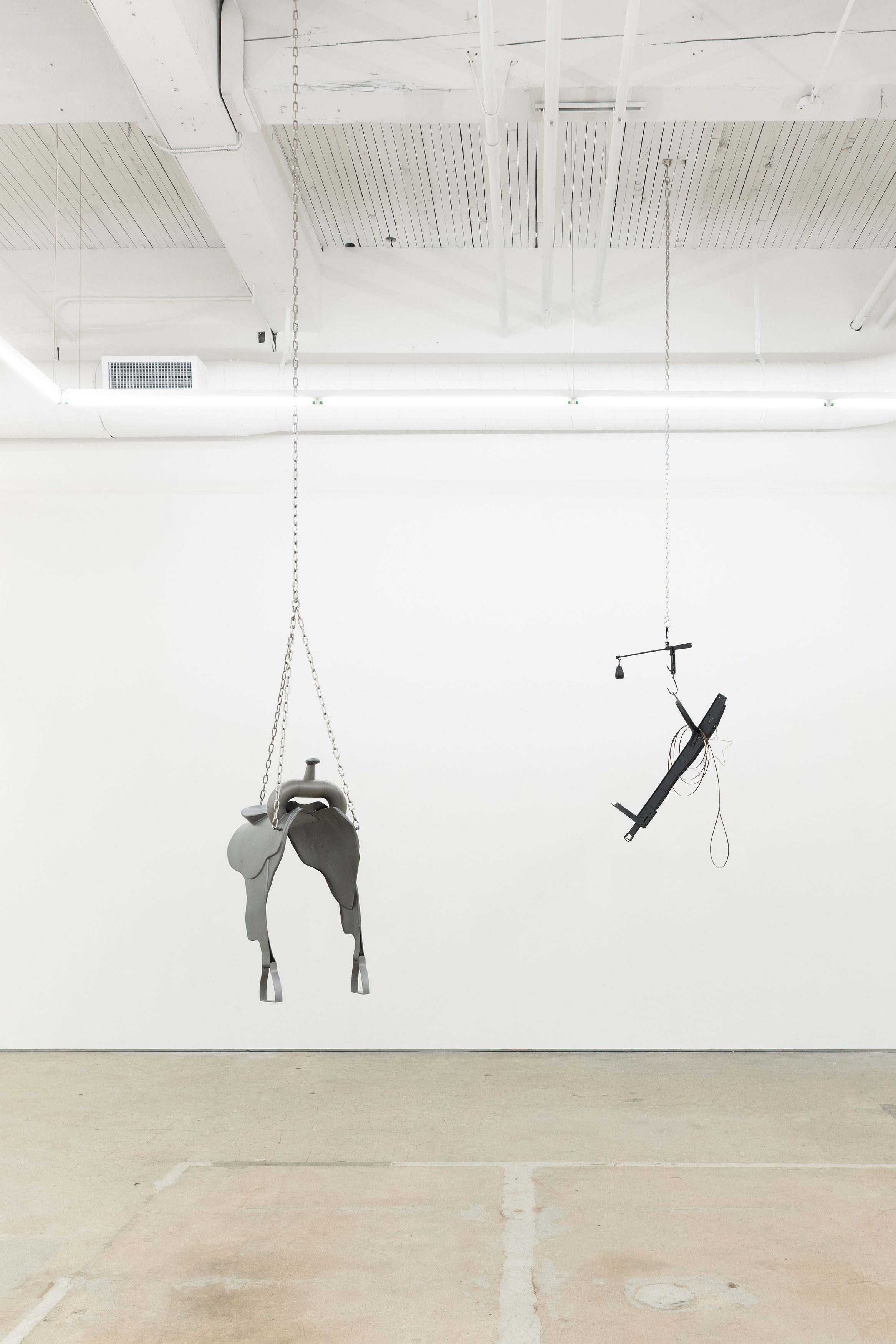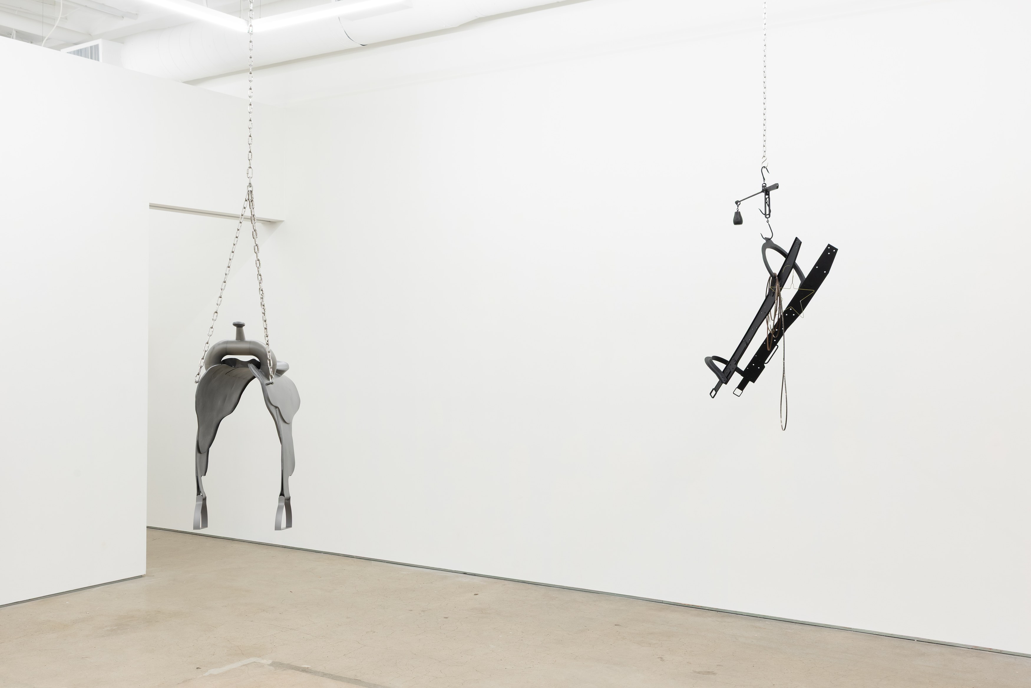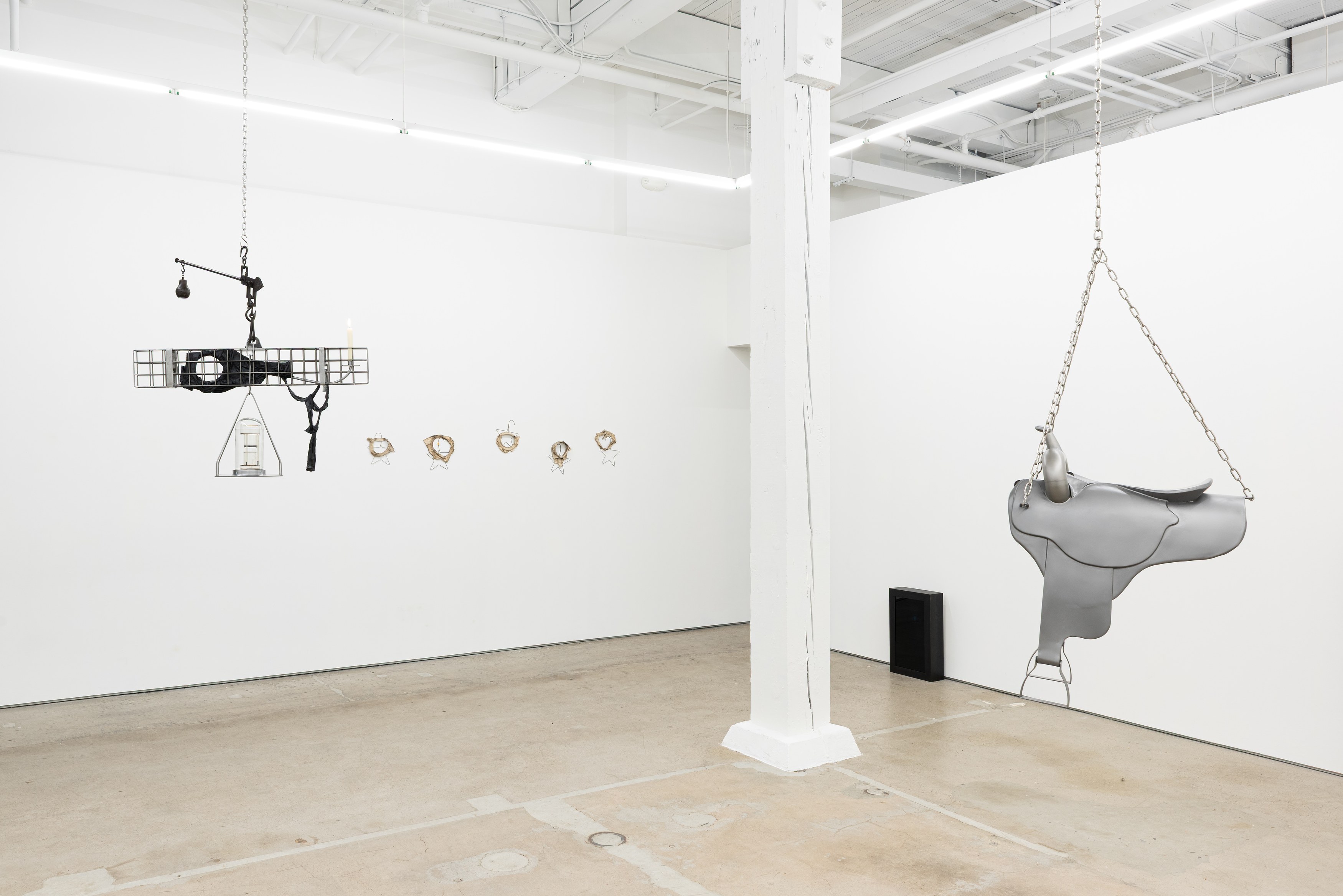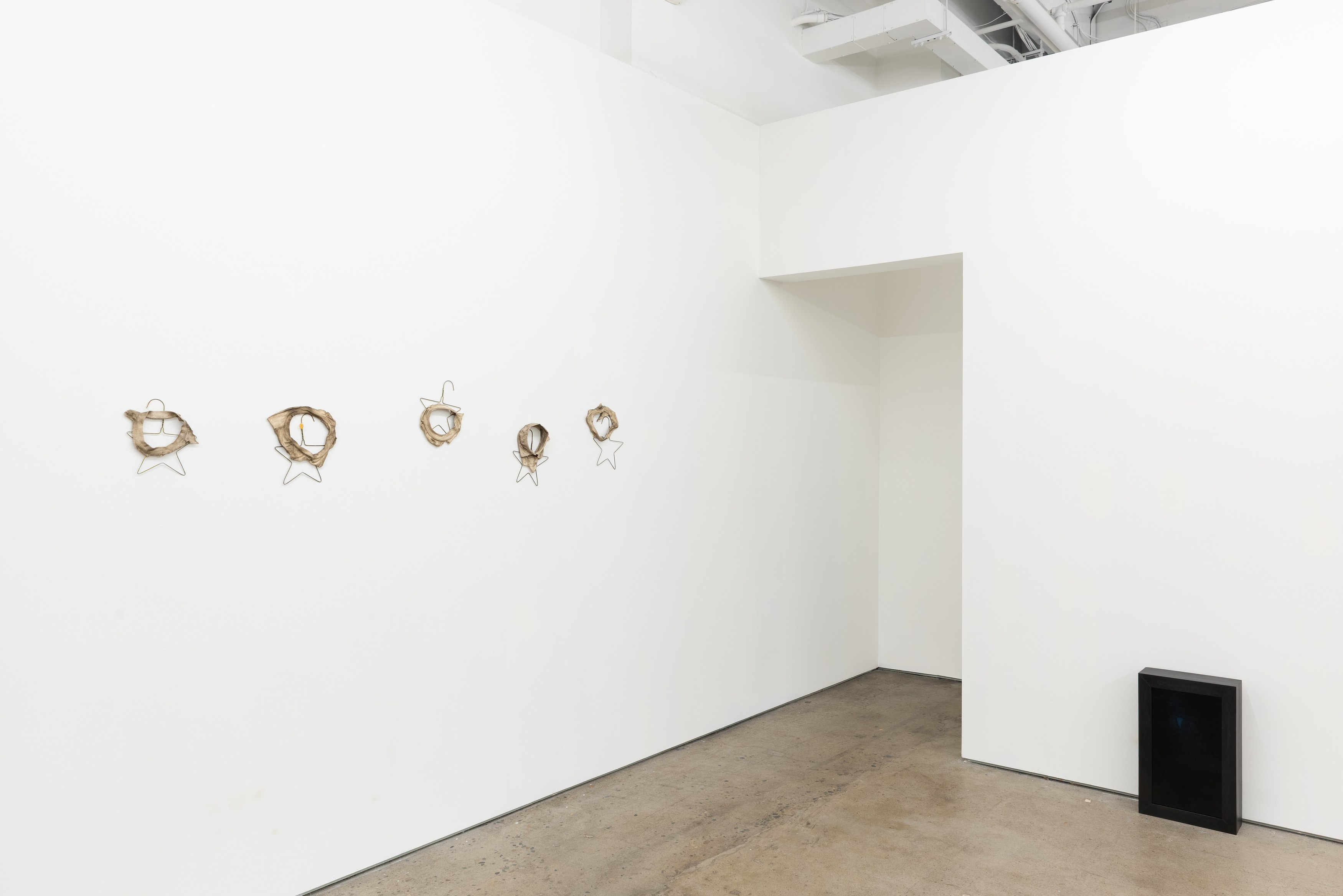 Adams and Ollman is pleased to announce barn burner, Brooklyn-based artist Peggy Chiang's first solo show on the West Coast of the United States. The exhibition is comprised of discrete objects that explore a distinctly American narrative. Using oil, wire hangers, bandsaw blades, shirt collars, roll-up gates and bone, the artist suggests a violence that is omnipresent in American identity and engenders a resonance that echoes out from the four walls of the gallery into the architecture, structures and systems that make up modern life. The exhibition opens with a reception with the artist on Saturday, September 13 and will be on view through October 25, 2025.