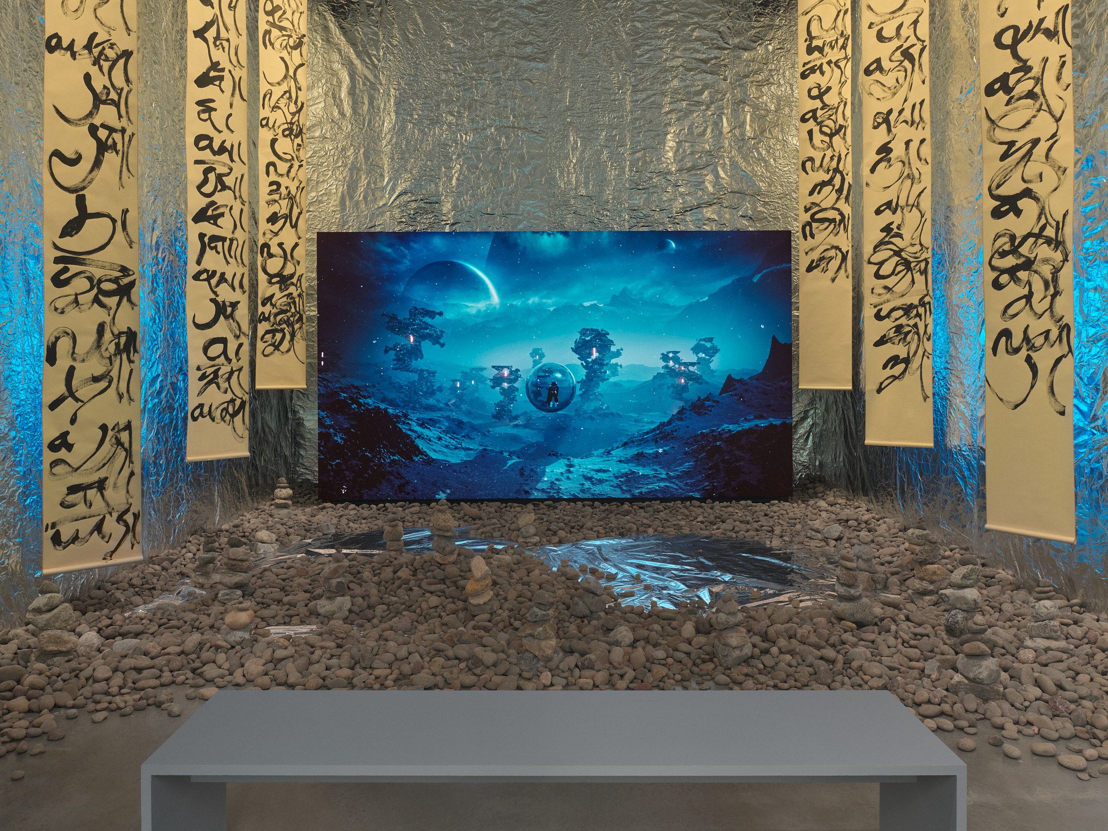 The exhibition centers on DOKU, a virtual avatar modeled on the artist’s own body and face. Referencing the Japanese Buddhist phrase dokusho dokushi—“We are born alone, and we die alone”—DOKU serves as both a personal surrogate and philosophical vessel, navigating a cosmos where spiritual belief, neuroscience, and technological mediation converge.