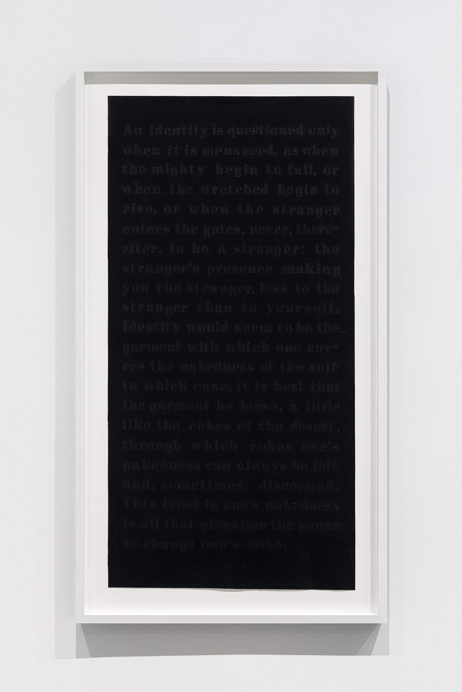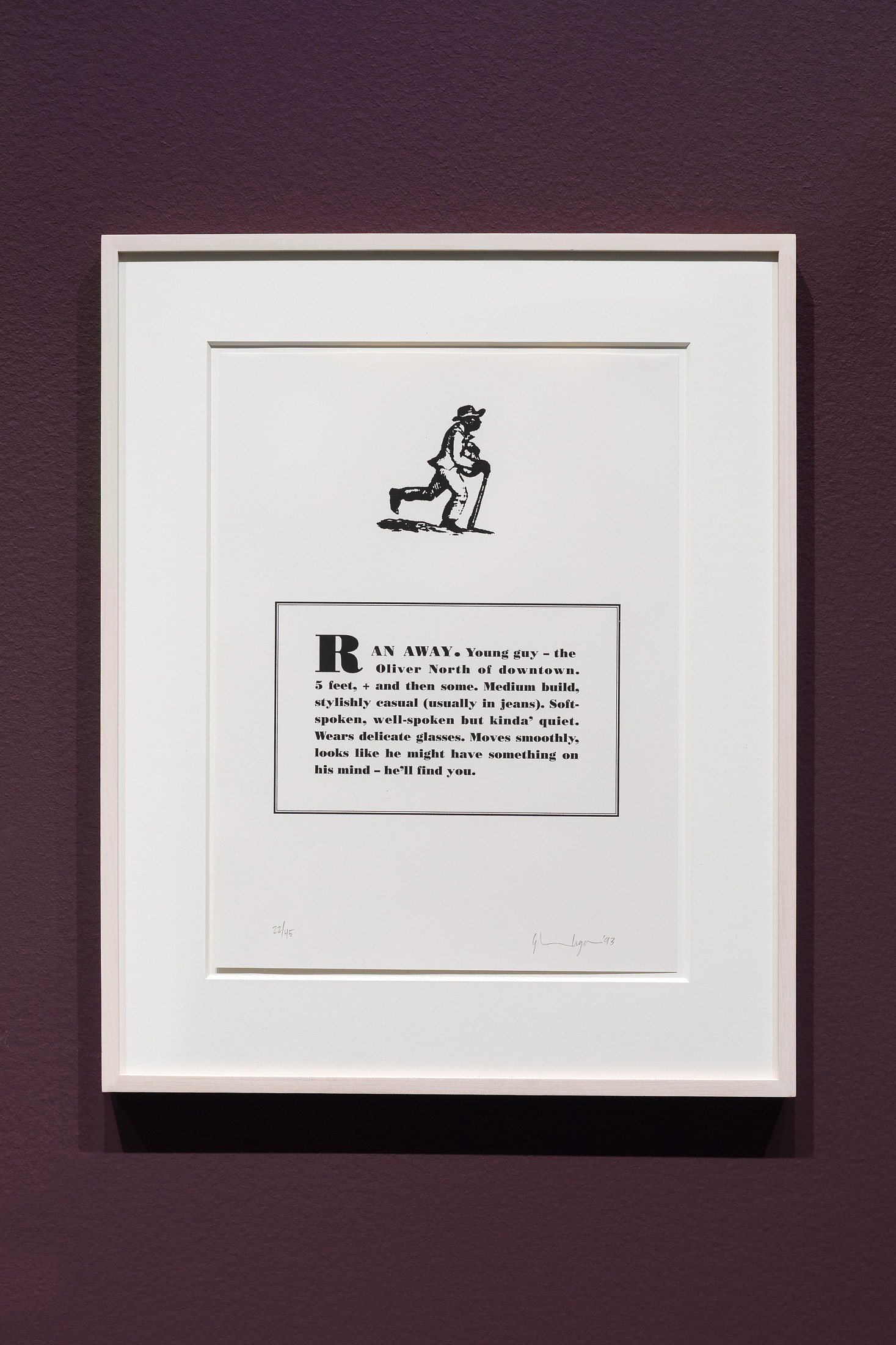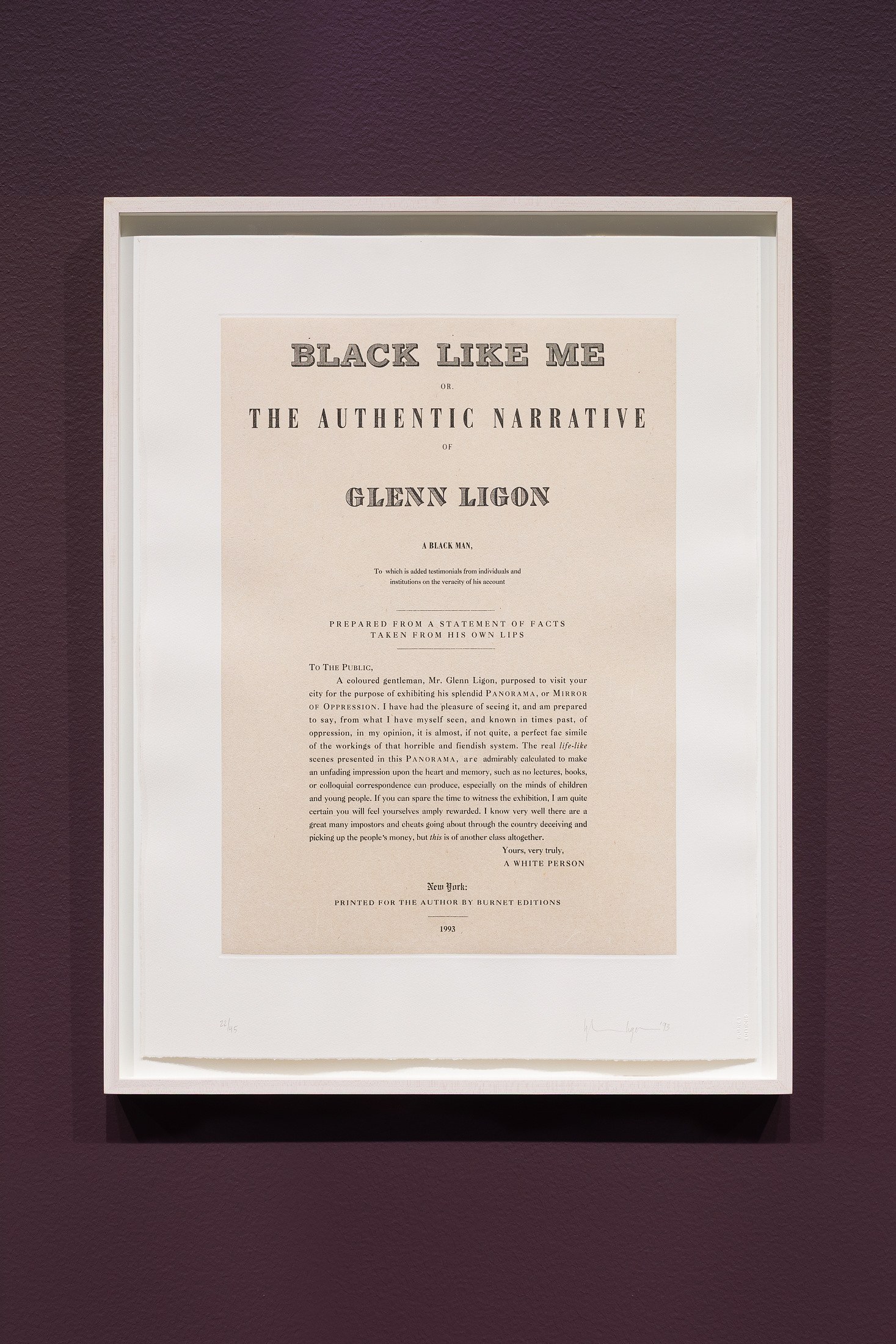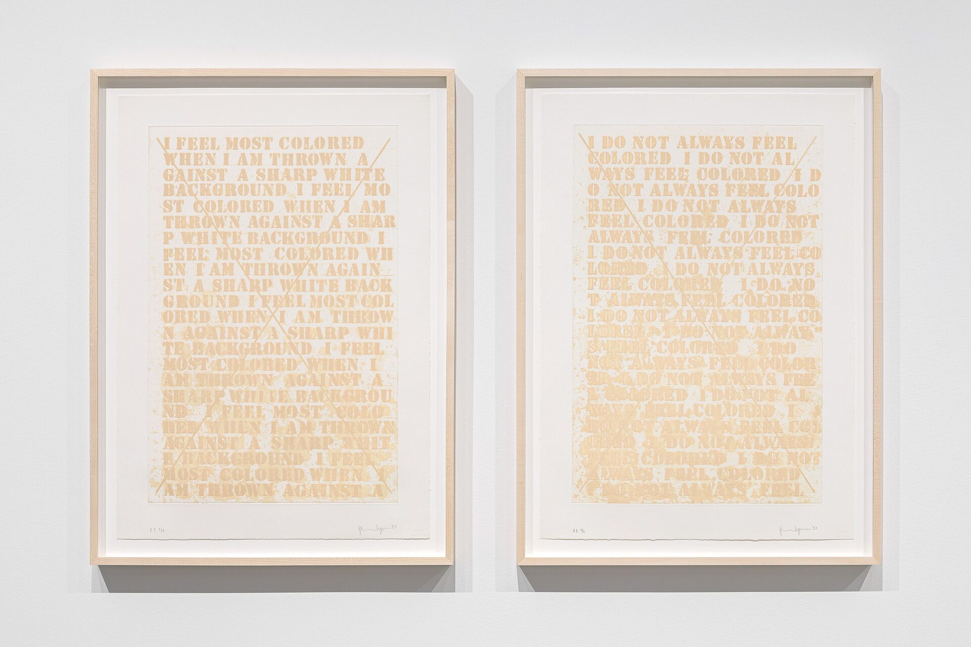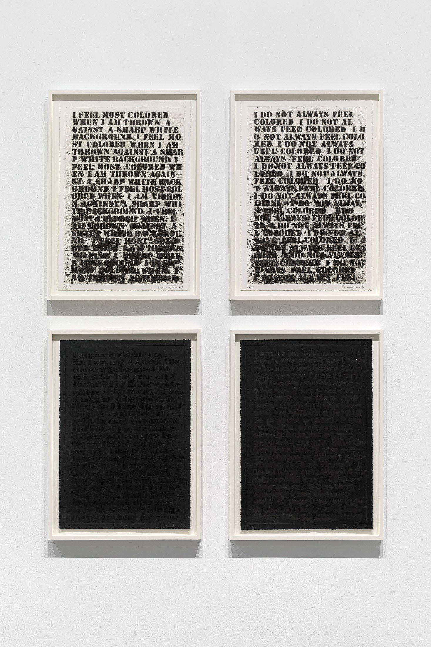 Break It Down is an exhibition of works by Glenn Ligon that brings together prints, multiples, and works on paper made by the artist since the early 1990s. A preeminent voice in American art, Ligon (b. 1960, New York) often incorporates language into his work to examine the ways in which identity and culture are constructed against the backdrop of the nation’s complex and insidious past. Ligon appropriates a diverse range of writing, including literary passages from authors such as James Baldwin, Jean Genet, Gertrude Stein, and Zora Neale Hurston, as well as disclosures from confidants and strangers. Ligon often lays the ground for his work using stencils or templates, tools that belie the intimate, vulnerable, and expressive quality of the chosen text. In discussing his early ventures in printmaking, Ligon remarked, “I am interested in the border between what is mechanical, repetitive, impersonal, and what is autobiographical.” This exhibition inhabits and troubles that border to…