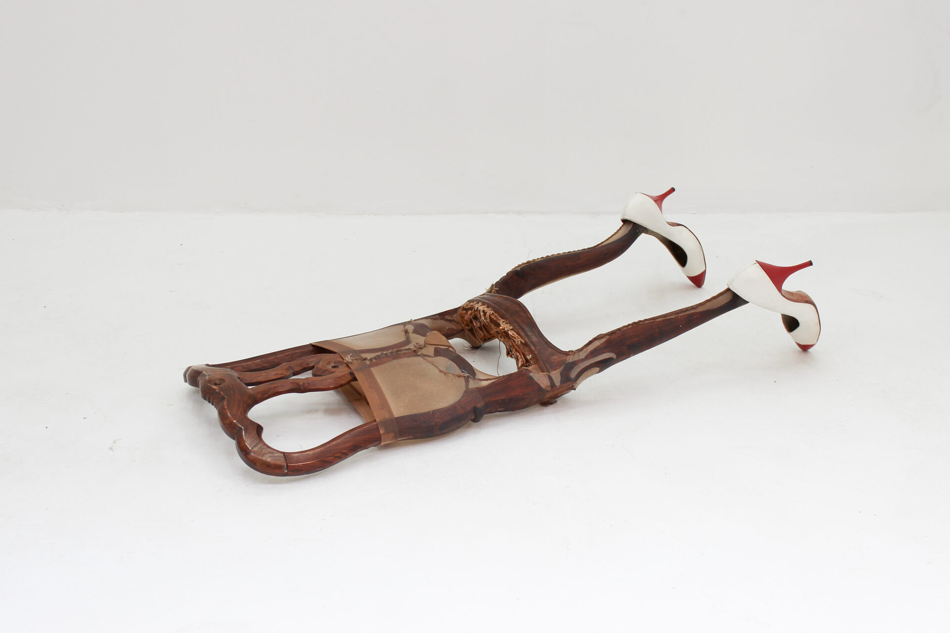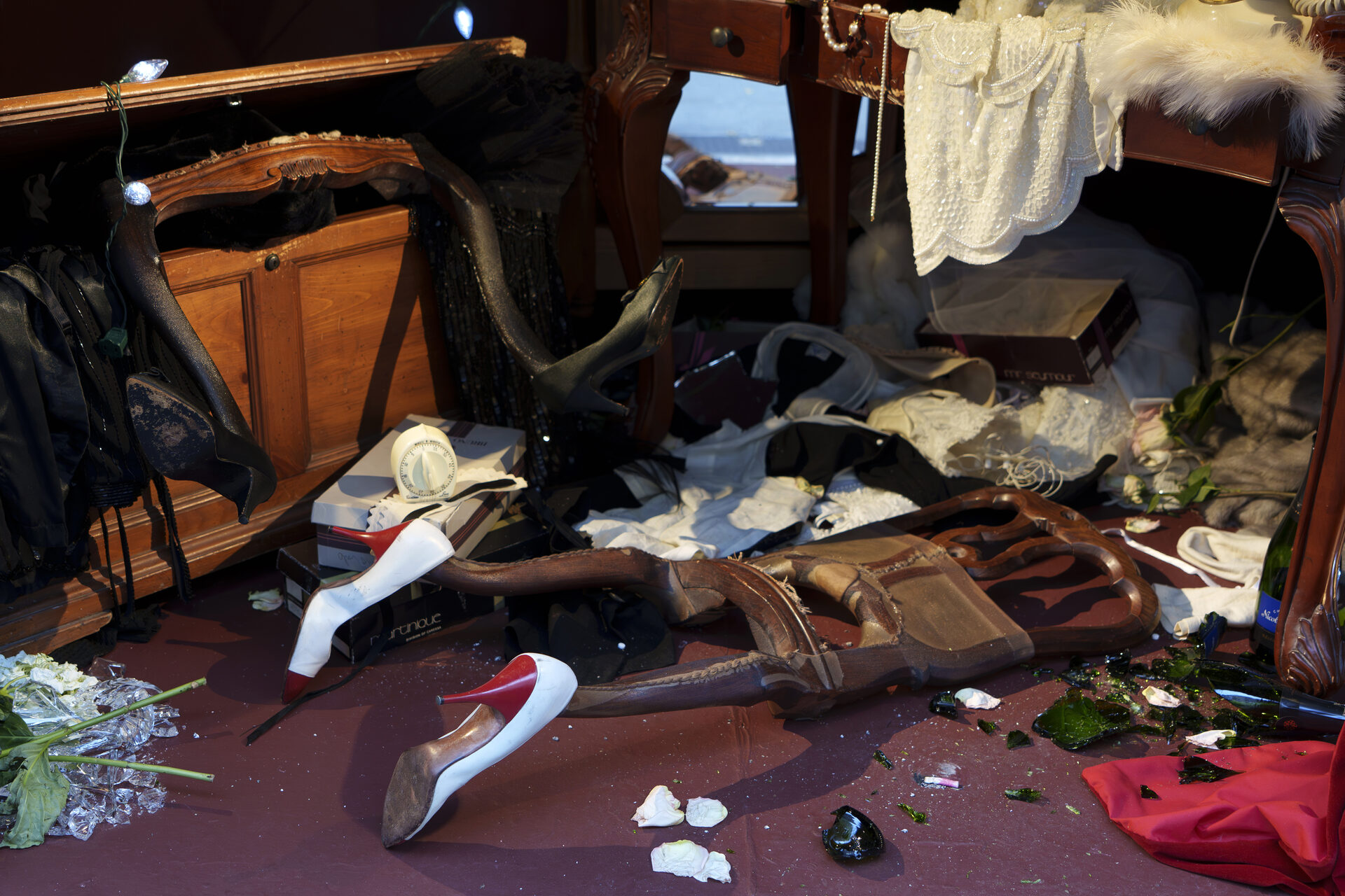 In a daisychain of fever dreams, innuendos, egos, and alter-egos, the exhibition is this play’s wreckage, staged by Gambino and building upon (stealing from) Jean Genet’s The Maids, a psychosexual drama of sweet reprise. Without its ending, without his roses, without his stage, Gambino finds his footing, his eternal refrain and refuge in this mythic origin story, staged in fragments, told in shambles, and performed by the very detritus…