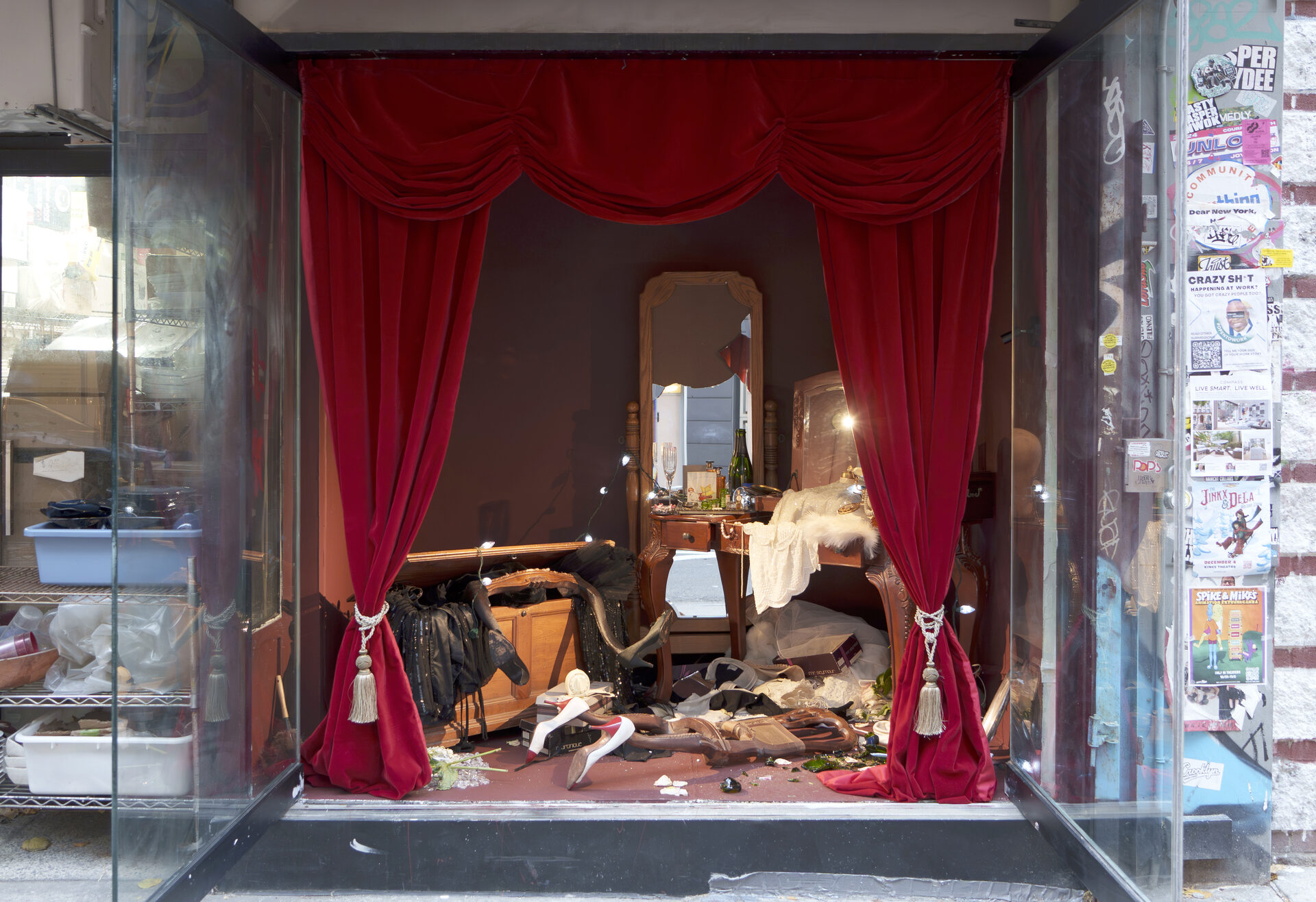 The Christmas Show by artist, playwright, and grand delusionary—or is it visionary?—Christopher Gambino is a crime scene, a holiday altar, and a cursed theatre starring sculptures-cum-bodies engaging in the unending encore of a new play. This new play, also called the The Christmas Show, is written by Christopher Gambino, the artist, and features Christopher, the Star, performing her new holiday showcase, The Christmas Show.