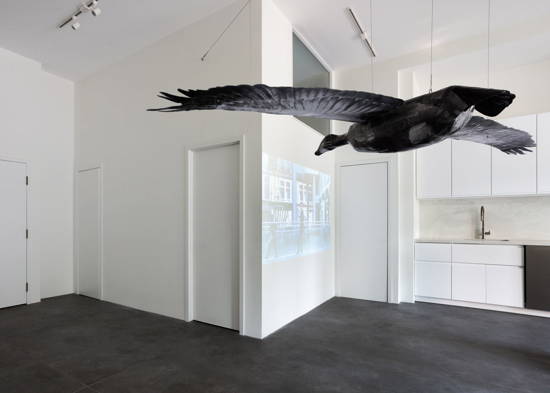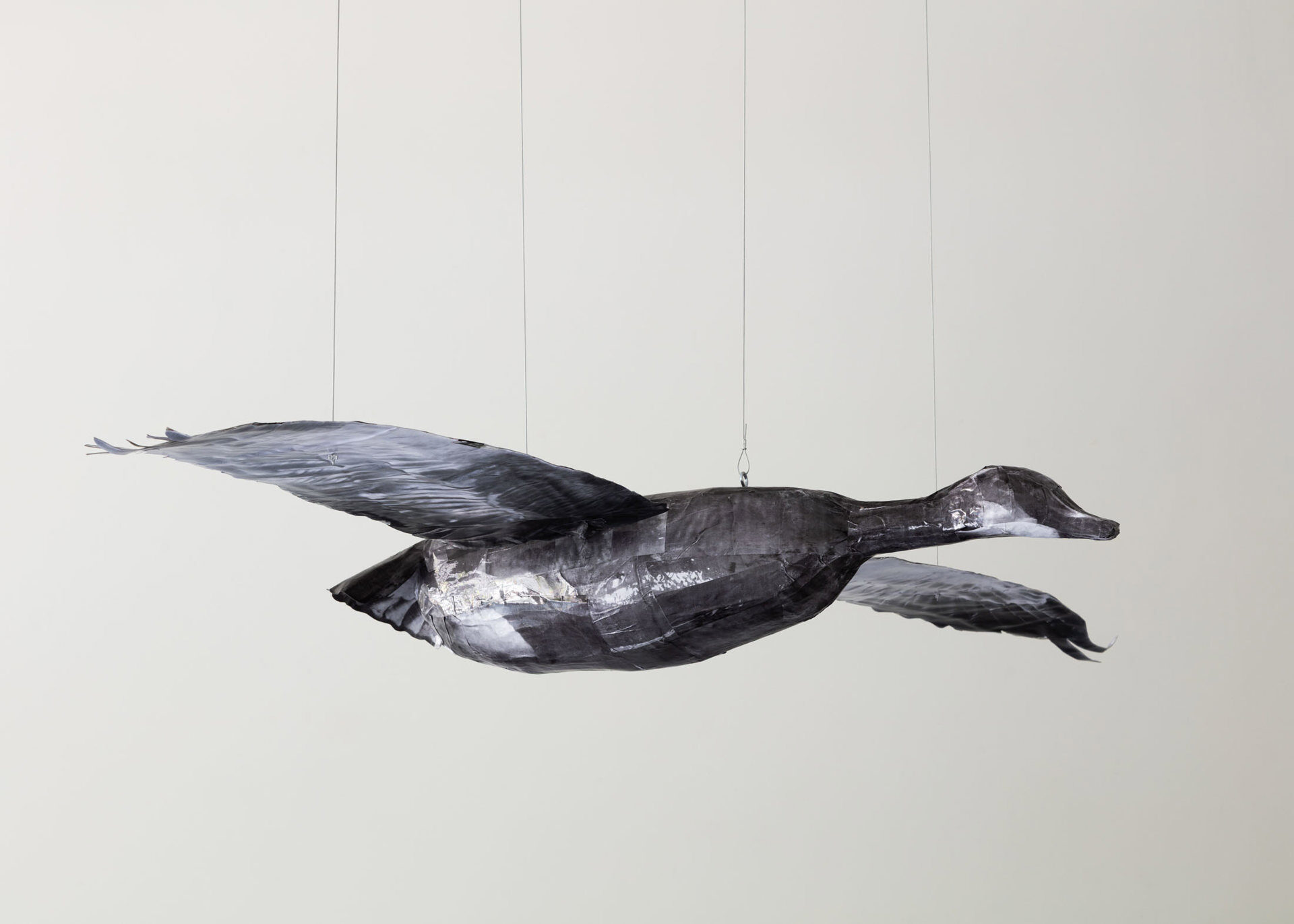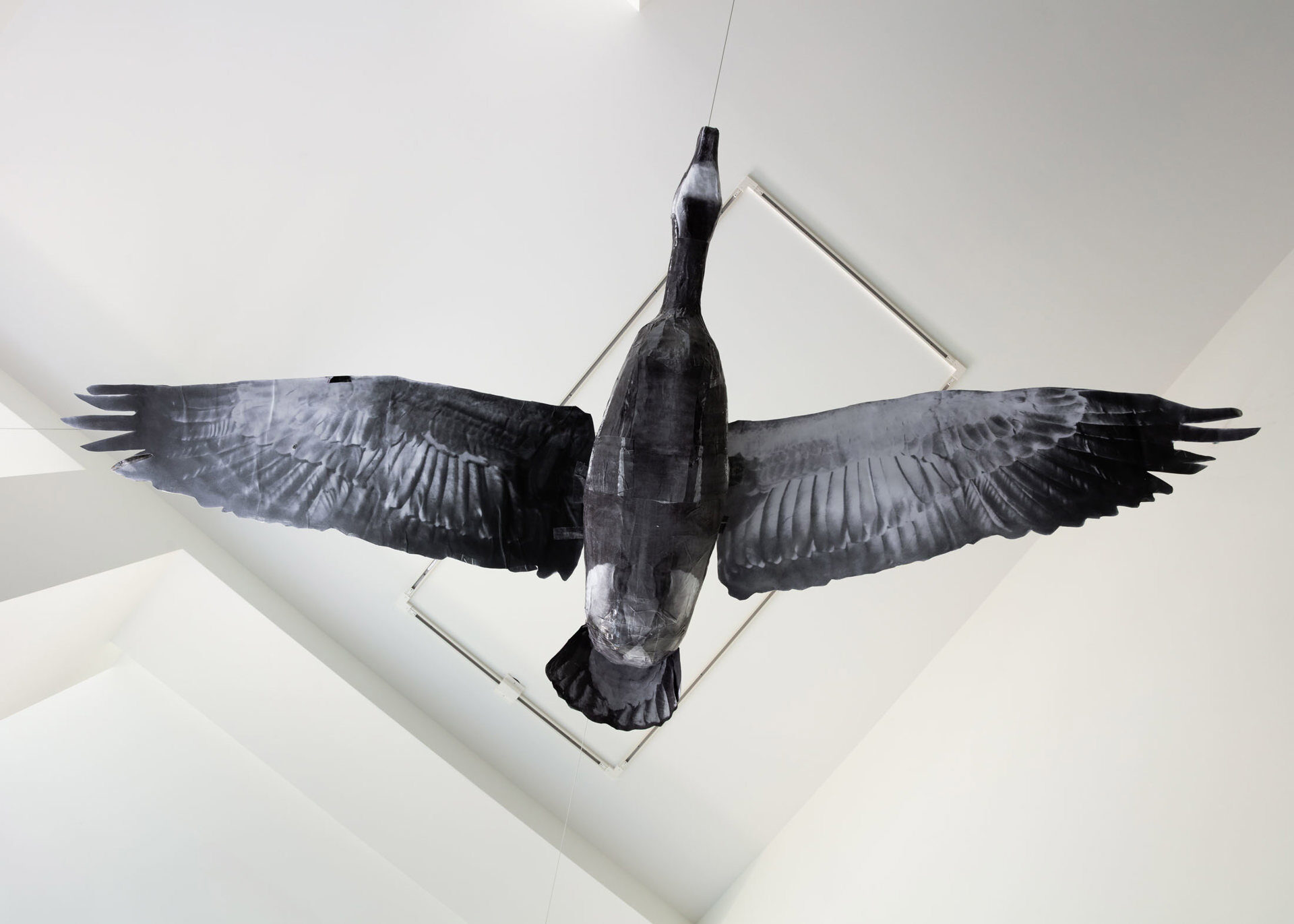 Centre of Pressure is a sculpture based on Michael Snow’s Flight Stop which synthesized two-and three-dimensional proportions from all 60 geese in the original installation into a single, abstract, imprecise, composite. This project is grounded in my long-term proximity to the geese by virtue of being at the mall a lot as both a passive cohabitant/shopper/loiterer and as an active observer/researcher/admirer. Frozen in flight in the glass atrium, the Flight Stop geese are always lit by a combination of natural and artificial light-seen often contre-jour and literally suspended within the visual noise of the mall: signage, flashing digital billboards, passersby, exposed elevator shafts. They aren’t especially detailed up close, but they register as real (istic).