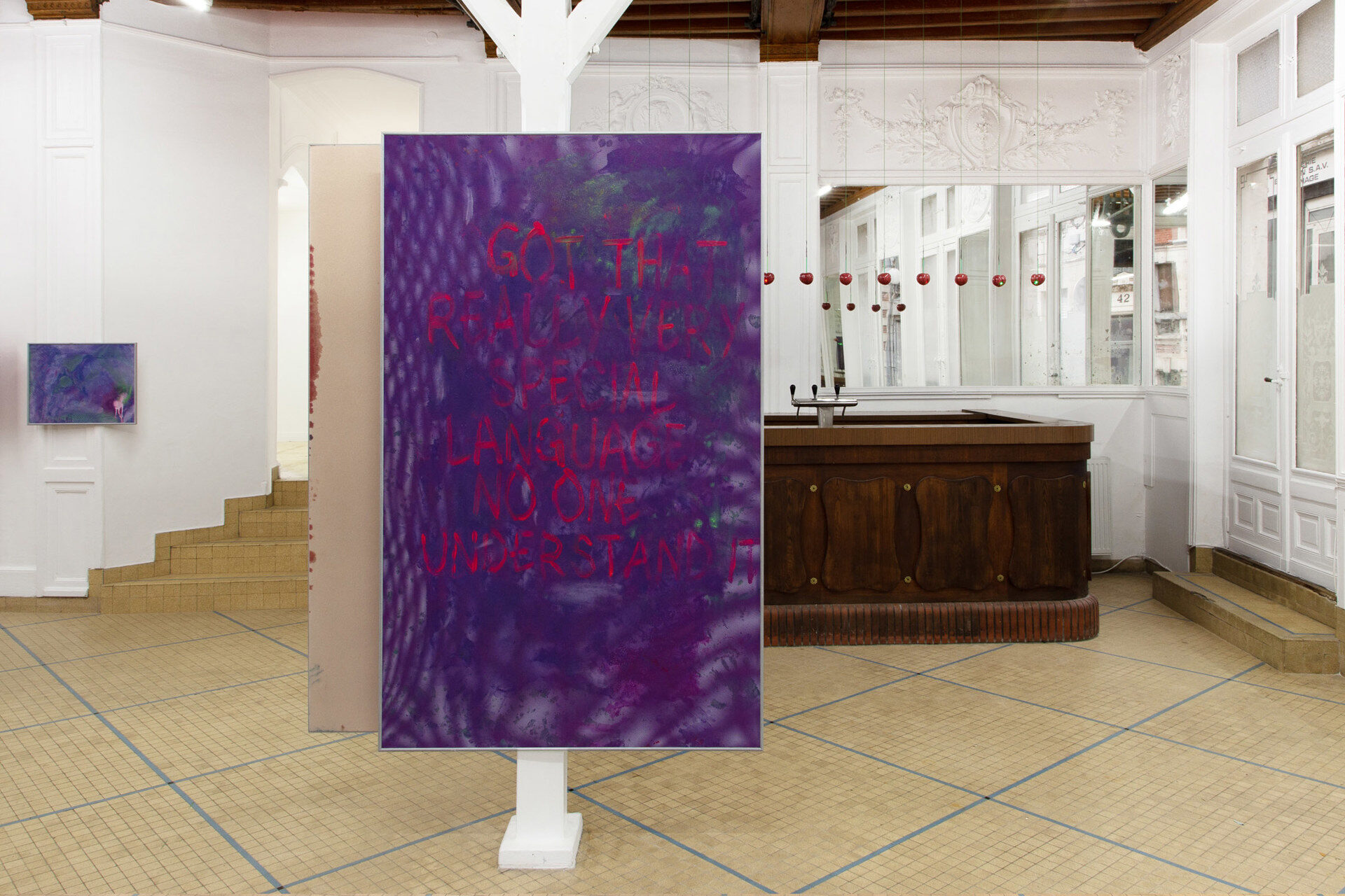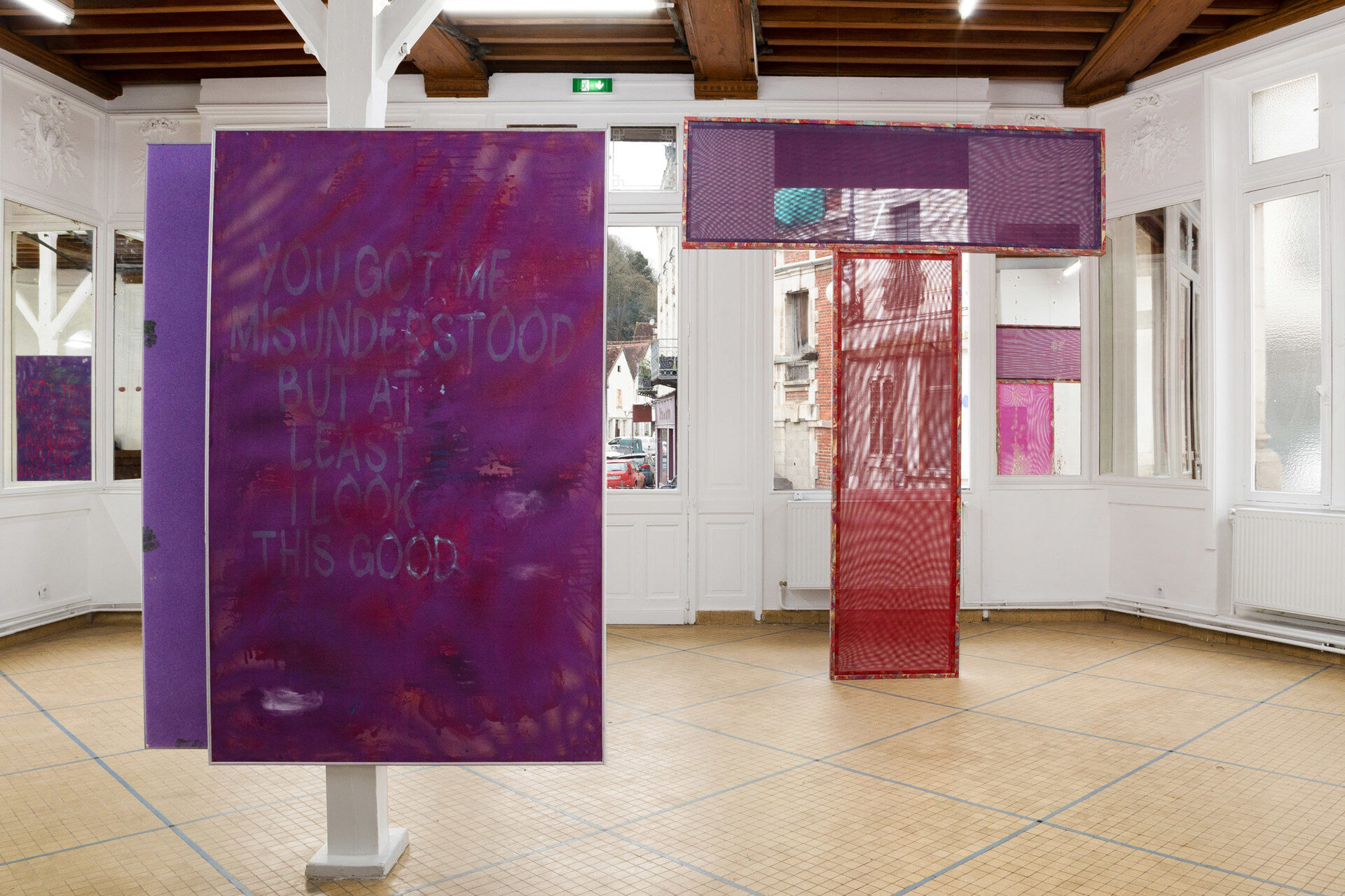 The exhibition presented at the Café des Glaces brings together a new series of works by Matthieu Hemmer, specifically designed as an installation for this unique space. The pieces originate from the singular characteristics of a fabric recovered from a Spanish luxury house. This material, imbued with strong aesthetic and symbolic significance, serves as a starting point for a reflection on aesthetic trips and the pictorial, social, and cultural stereotypes shaped by today’s dominant visual signs.