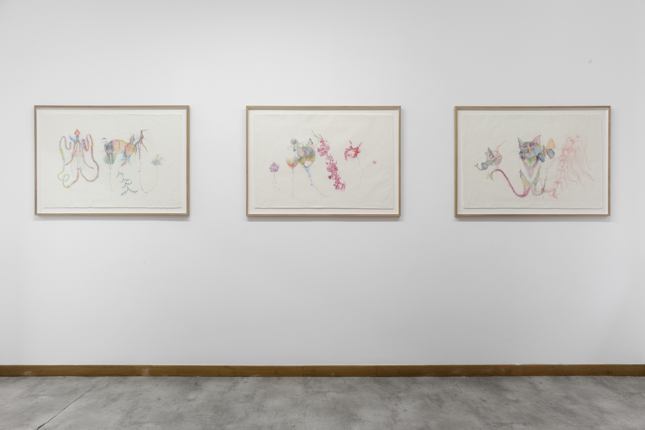Subtly surreal, her works evoke the sea, dreams and the womb as parallel realms of perpetual change. Recurring motifs such as mirrors, mountains and hybrid creatures alluding to plants, sea animals, cats, and butterflies evolve into organic, interspecies forms. Through this biomorphic language, bodies become fluid and unstable, suspended between animal presence and landscape, tracing processes of growth and metamorphosis.