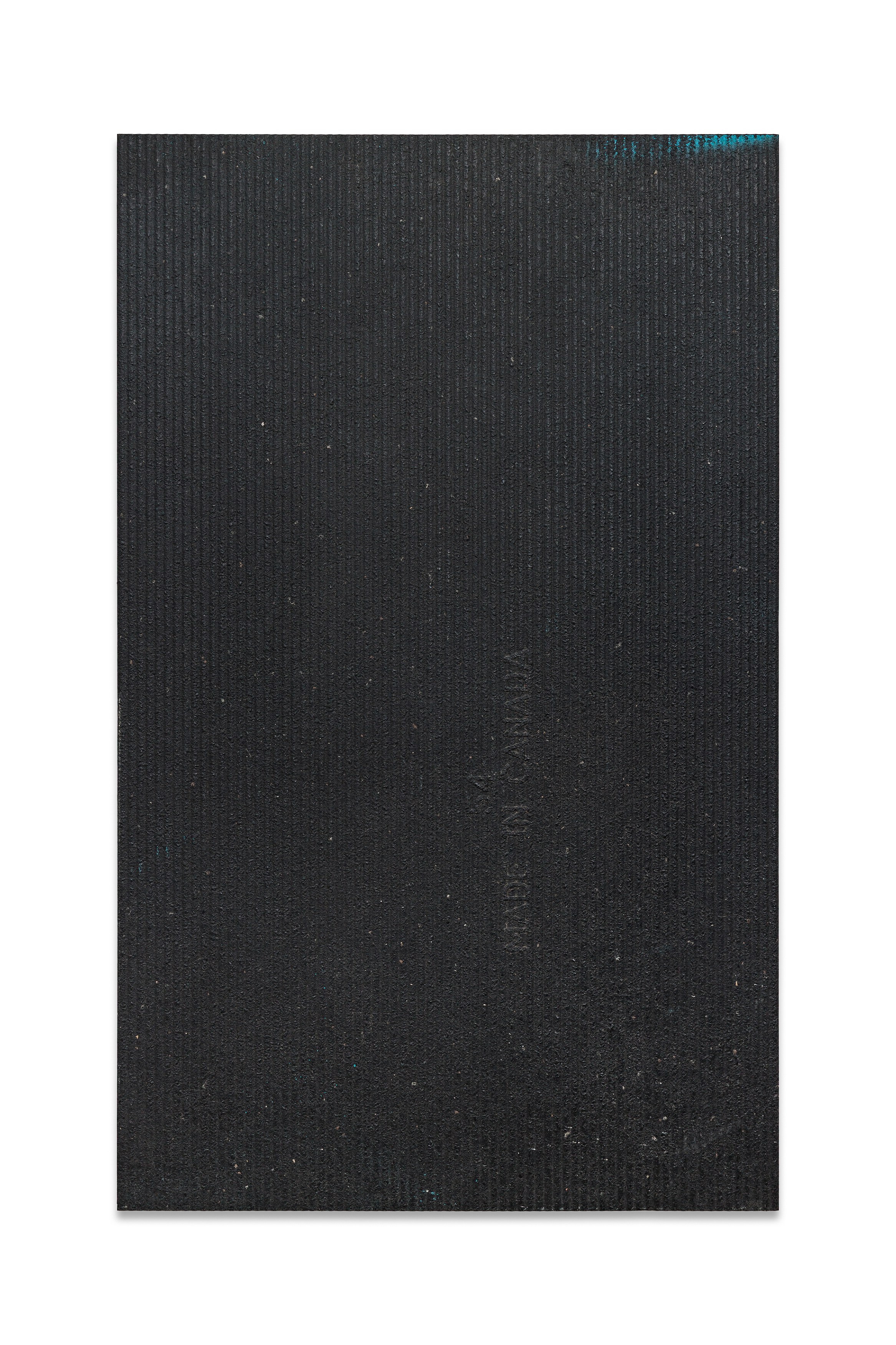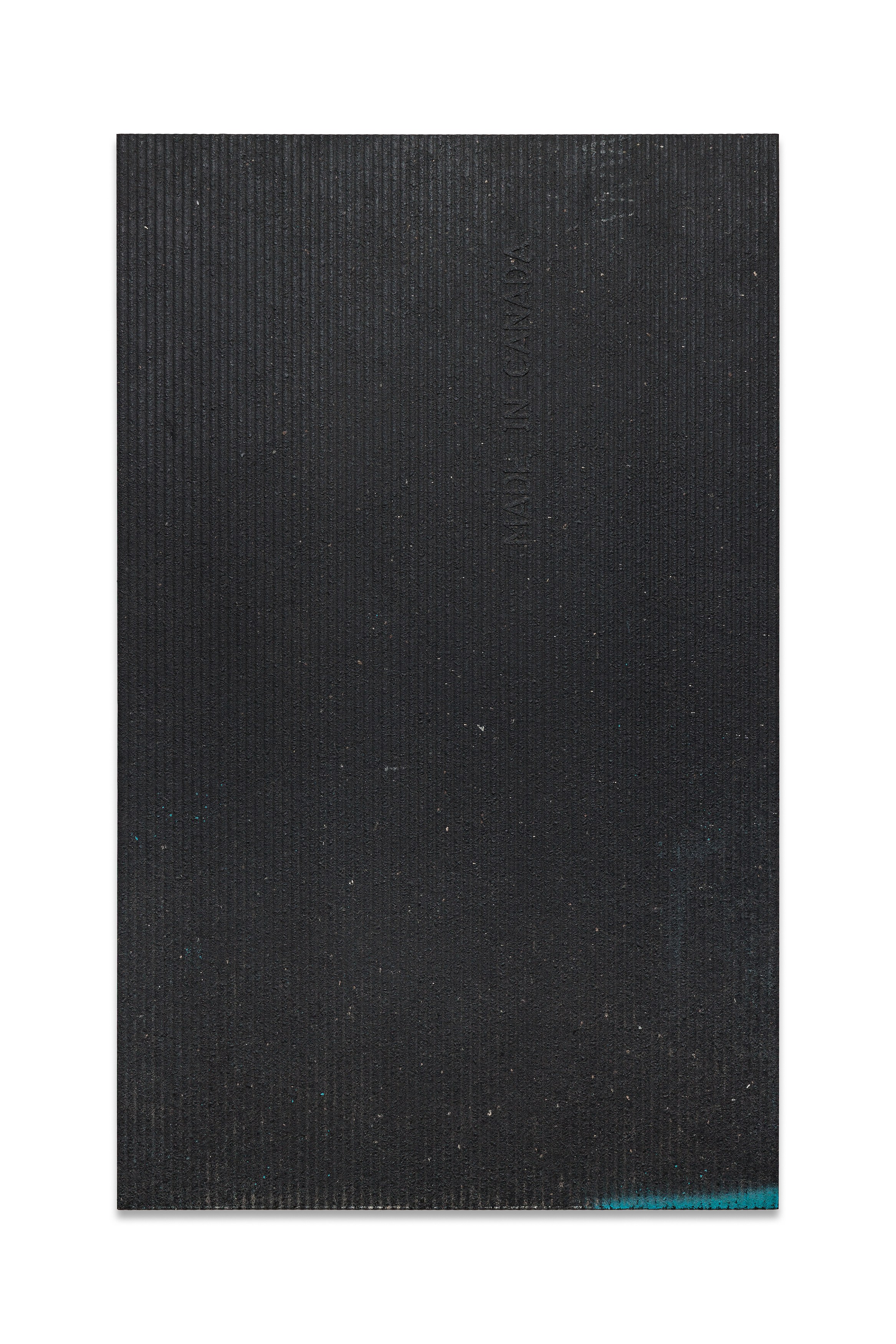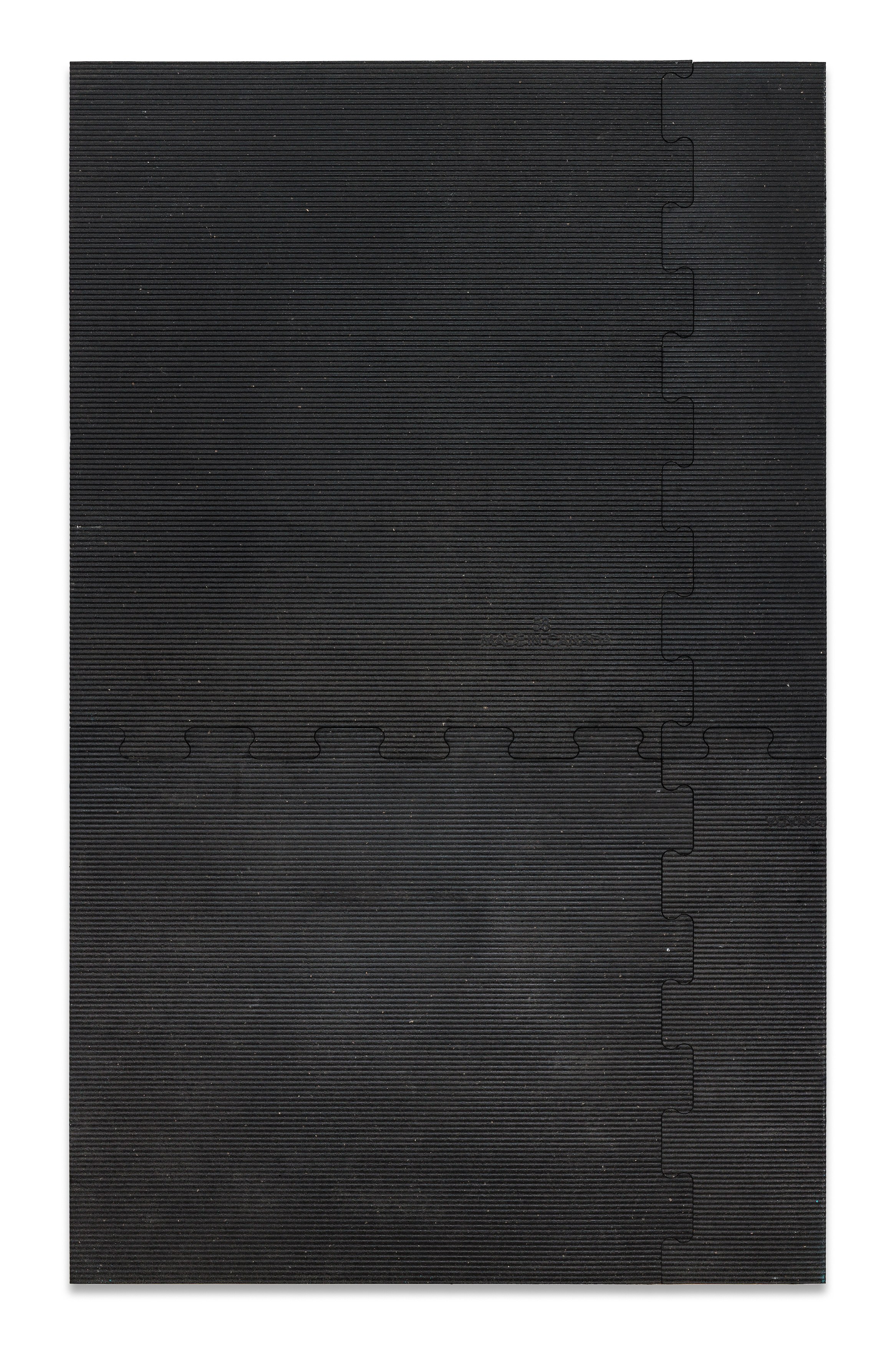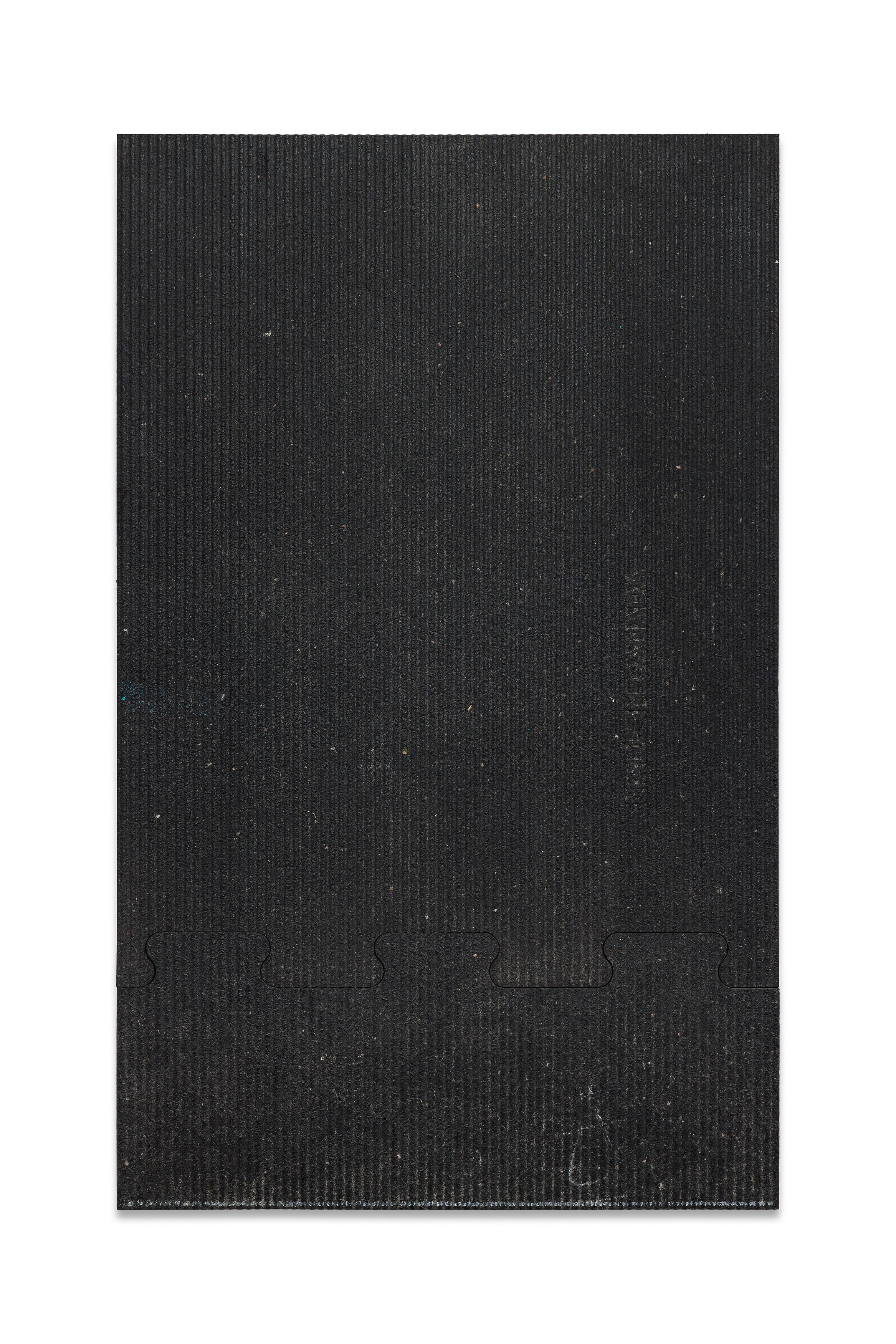 Matte / geschnitten, 2023, recycled rubber, spray paint, tire marker. 19 pieces. Made from Matte, 2022, recycled rubber, 2650 mm x 3760 mm x 19 mm.