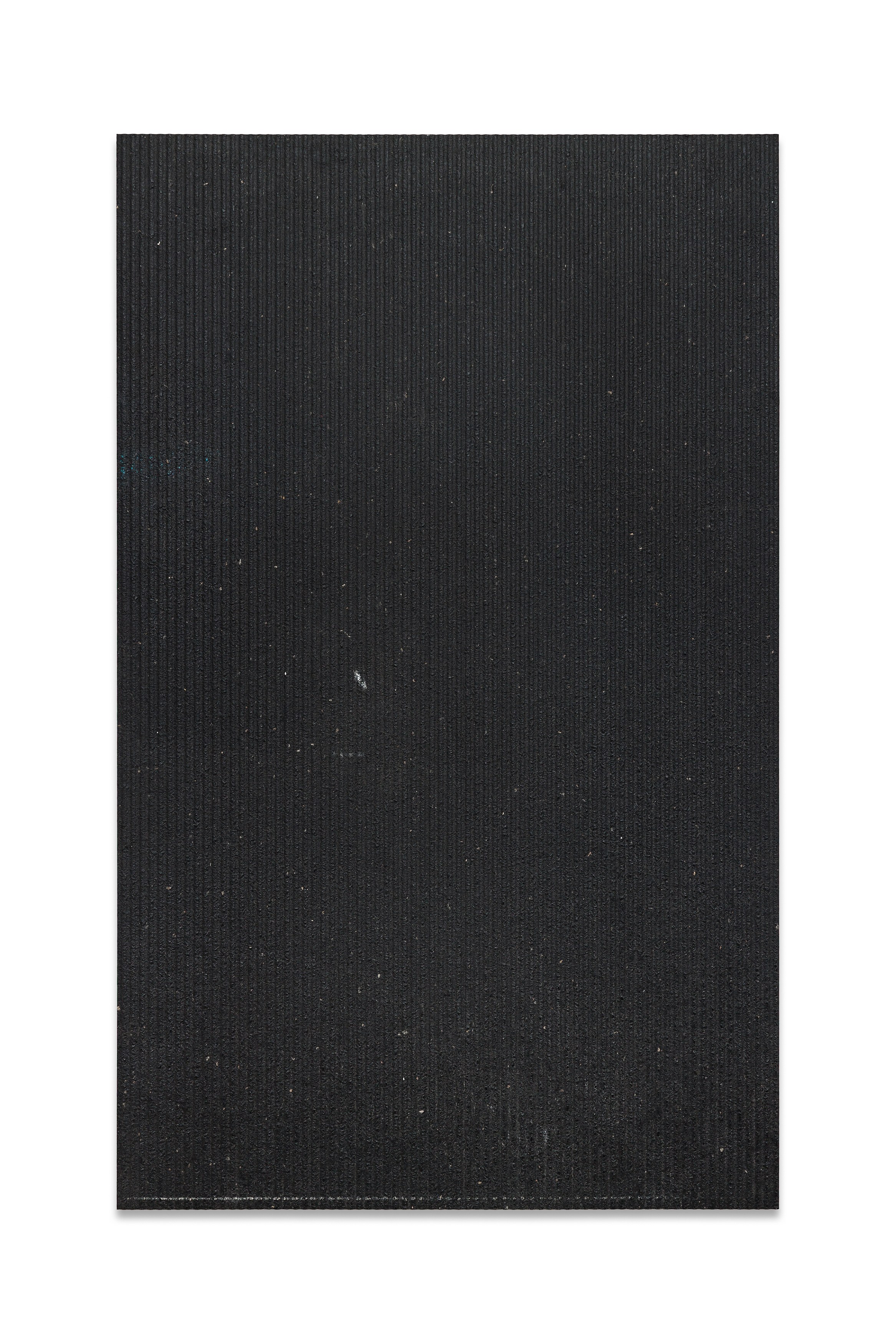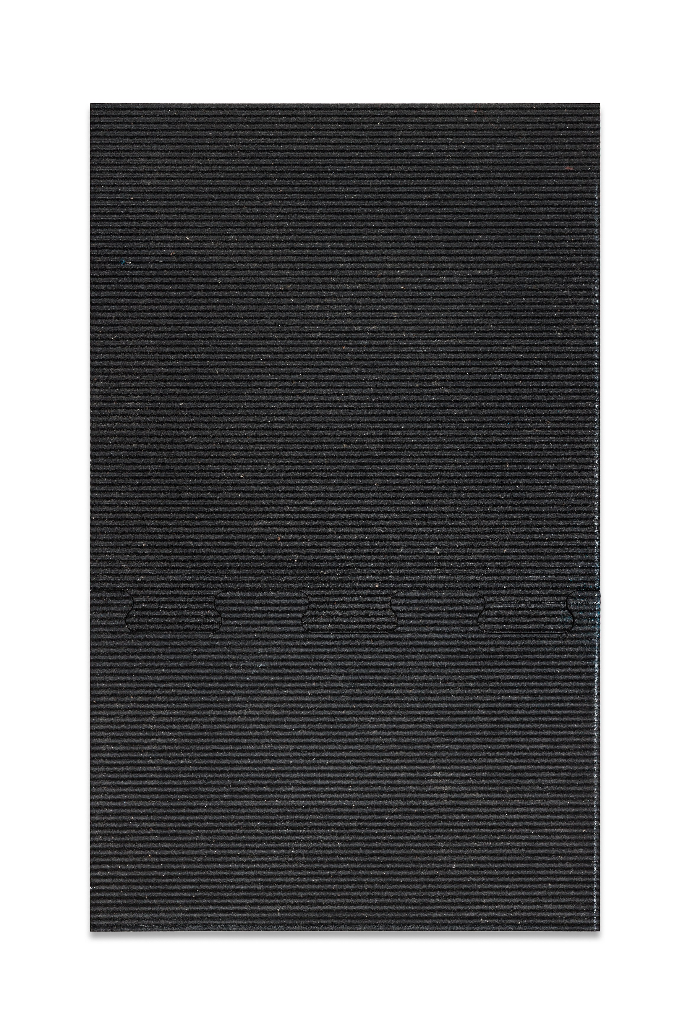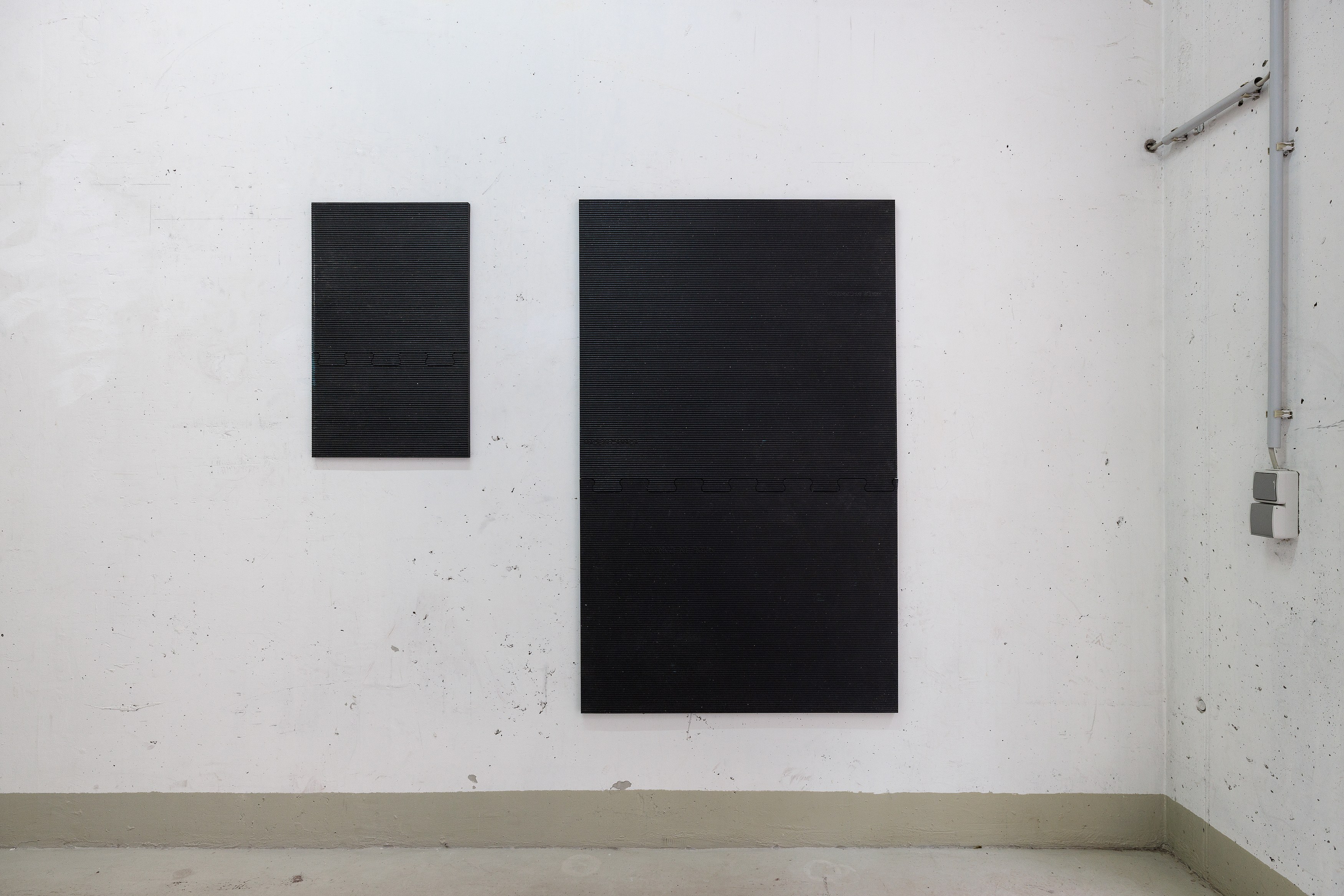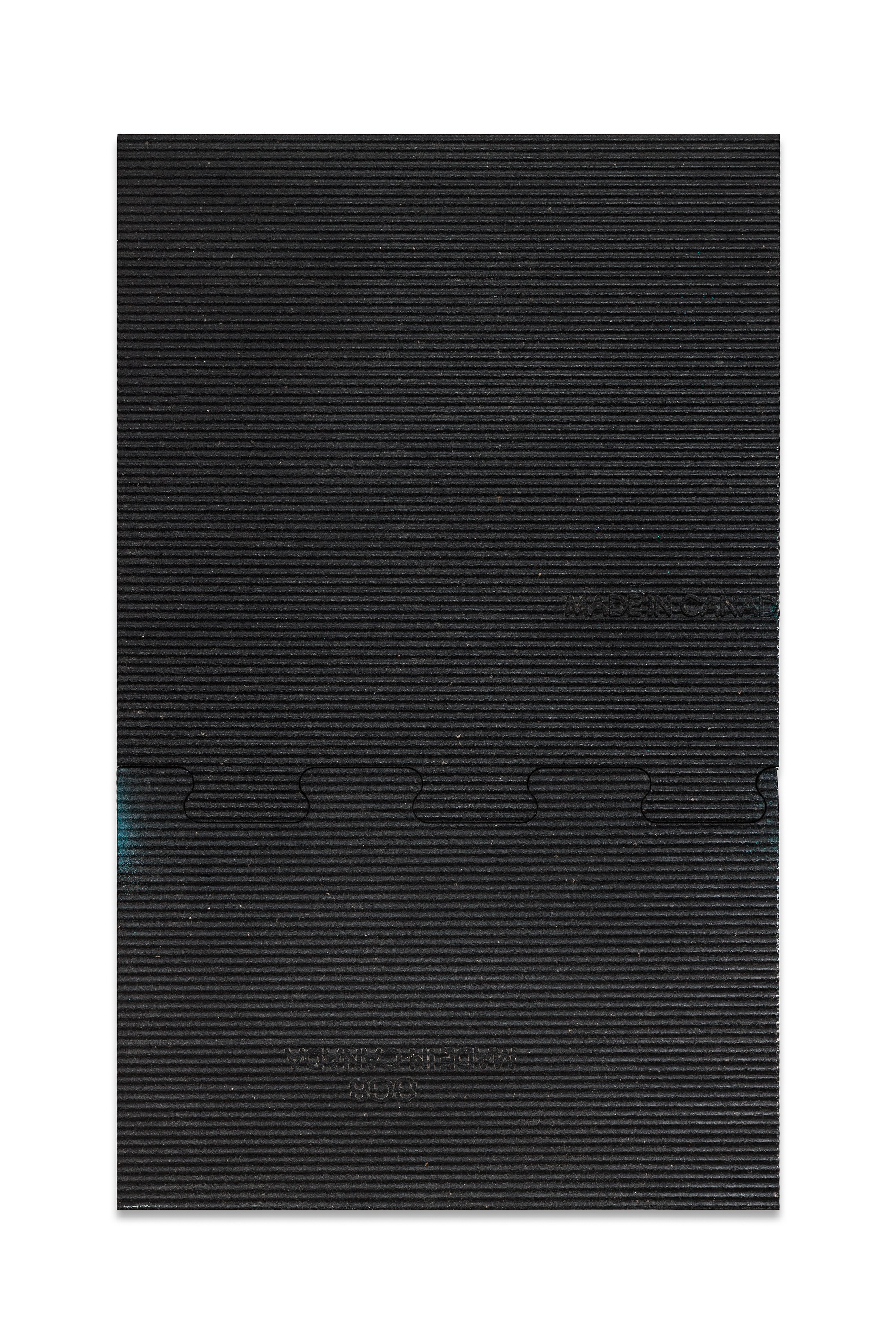 Matte / geschnitten, 2023, recycled rubber, spray paint, tire marker. 19 pieces. Made from Matte, 2022, recycled rubber, 2650 mm x 3760 mm x 19 mm.