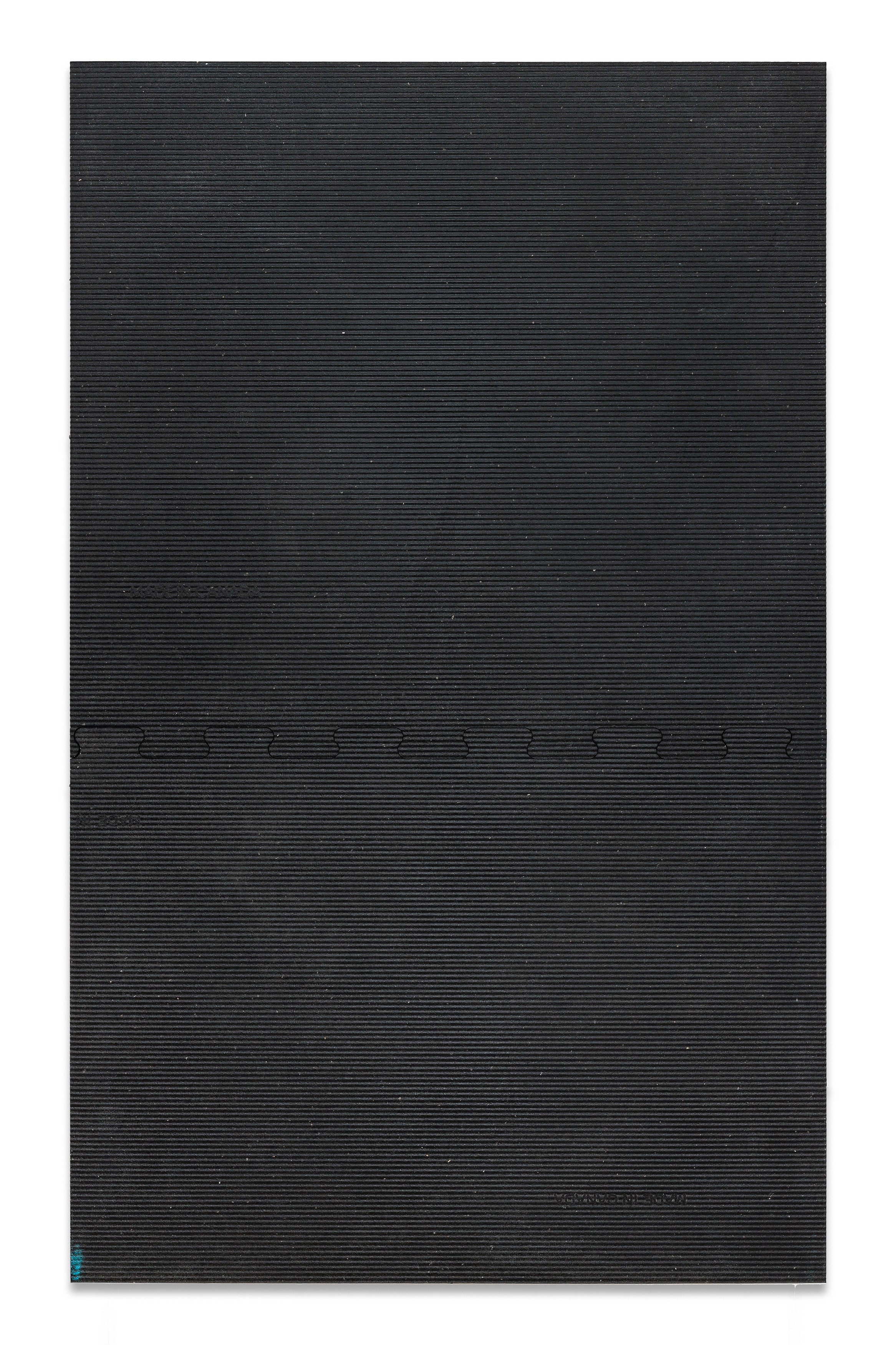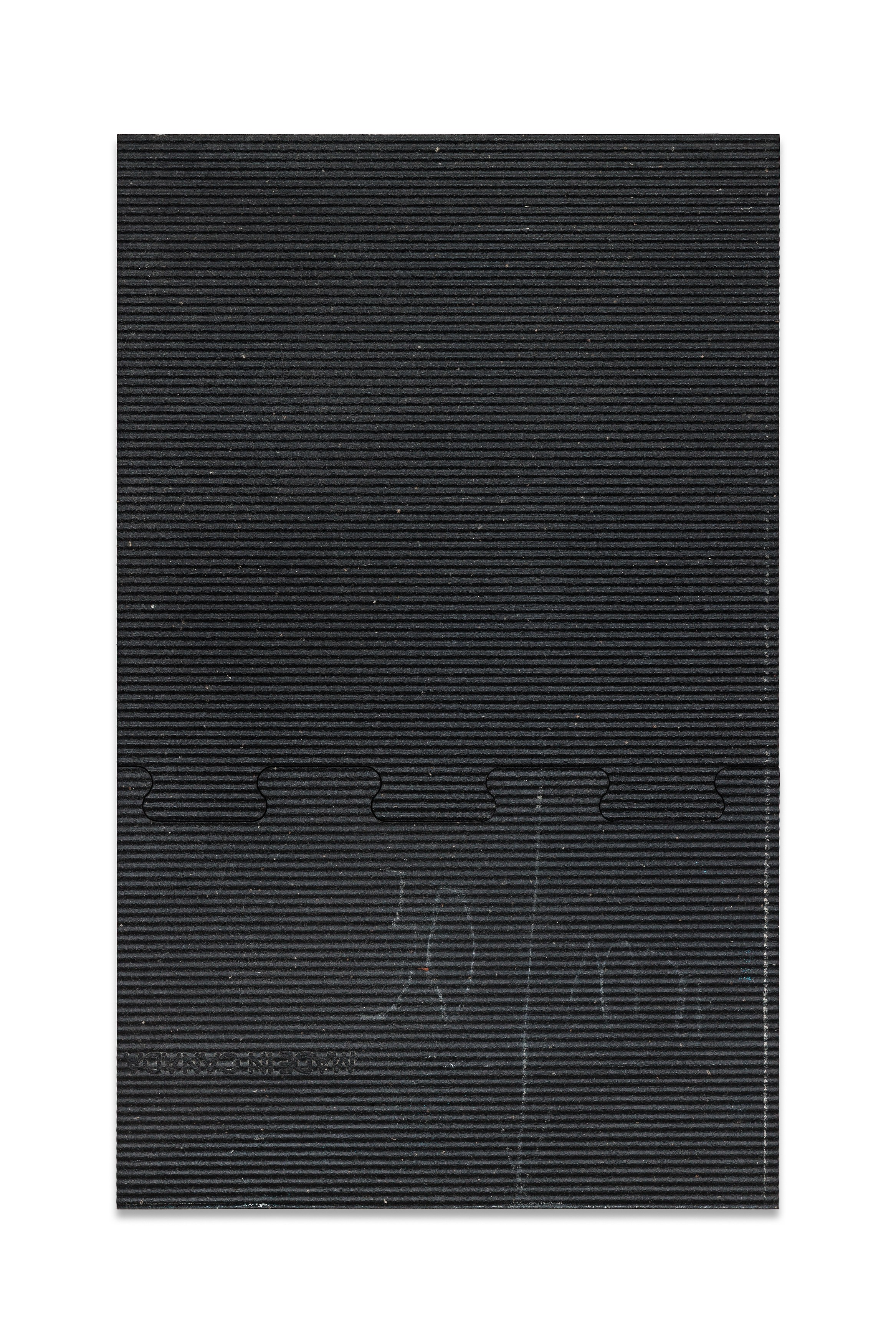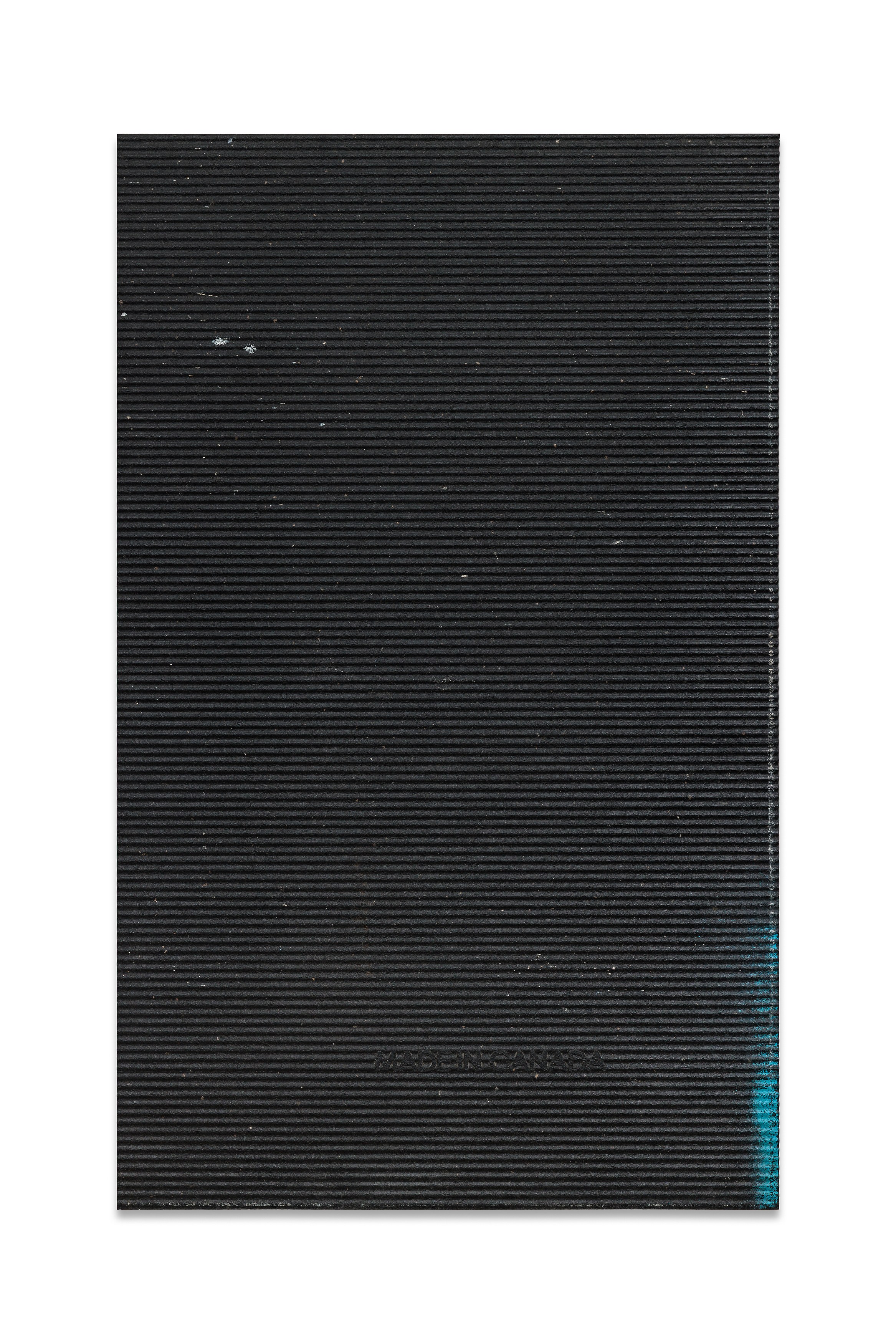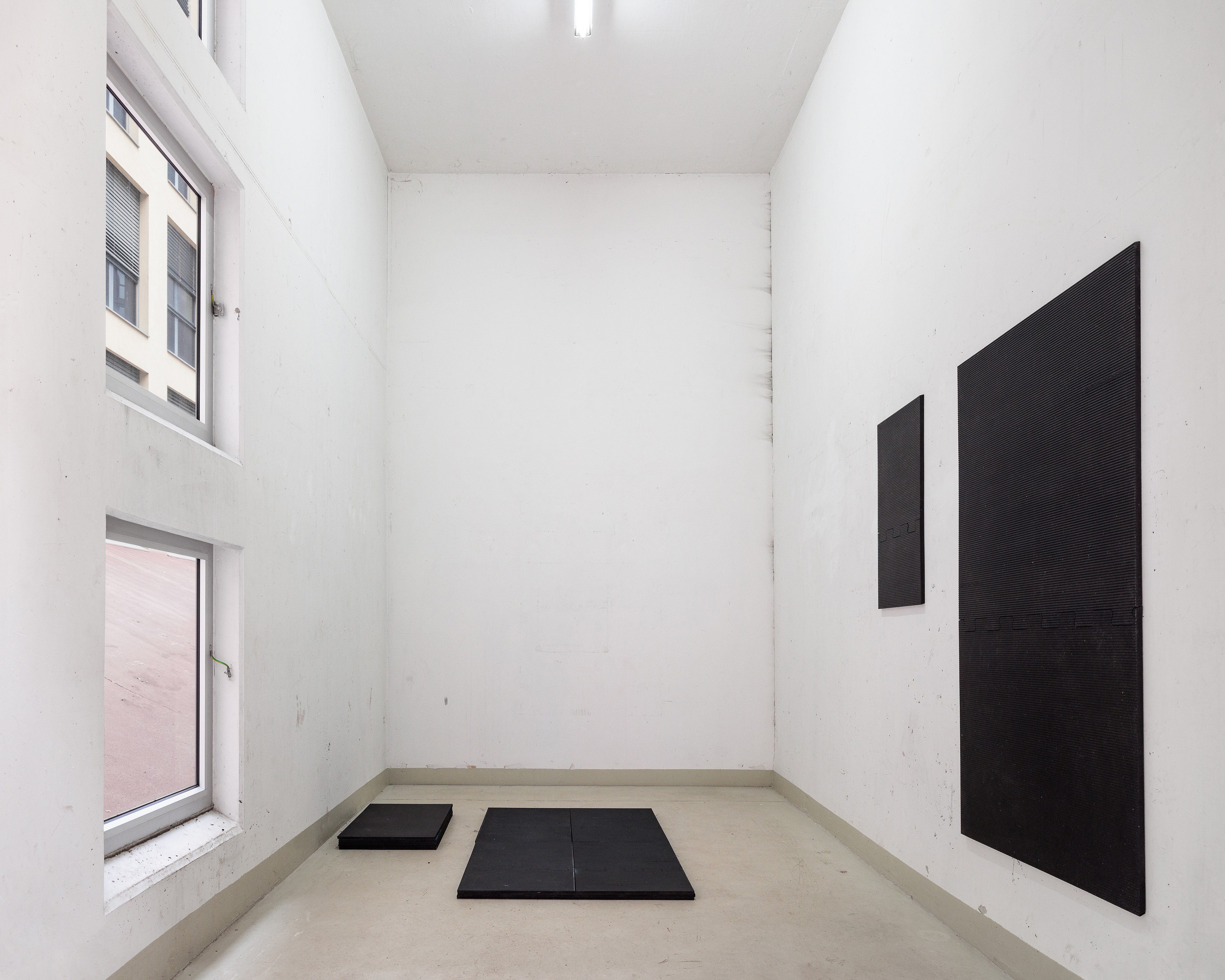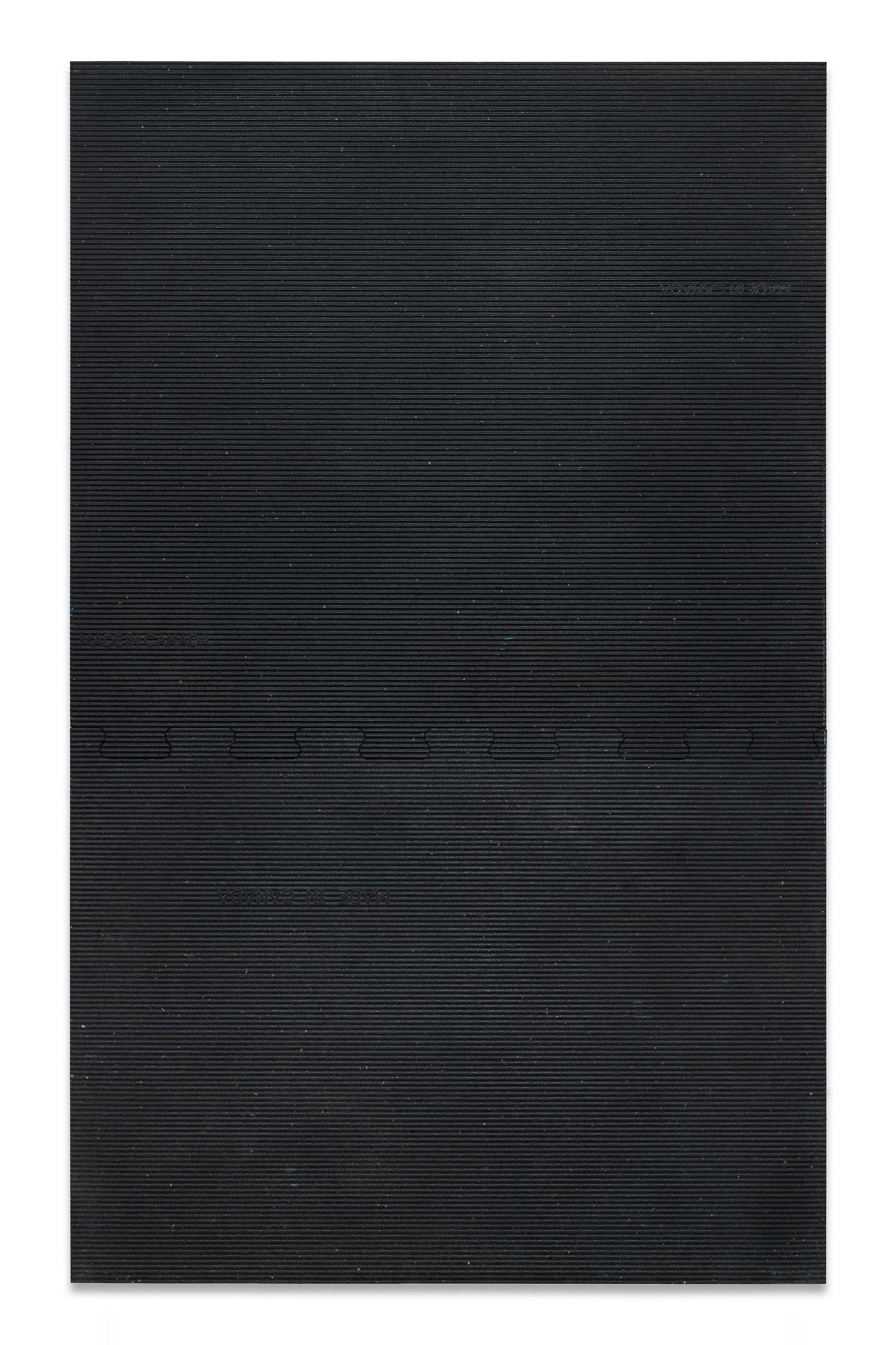 Matte / geschnitten, 2023, recycled rubber, spray paint, tire marker. 19 pieces. Made from Matte, 2022, recycled rubber, 2650 mm x 3760 mm x 19 mm.
