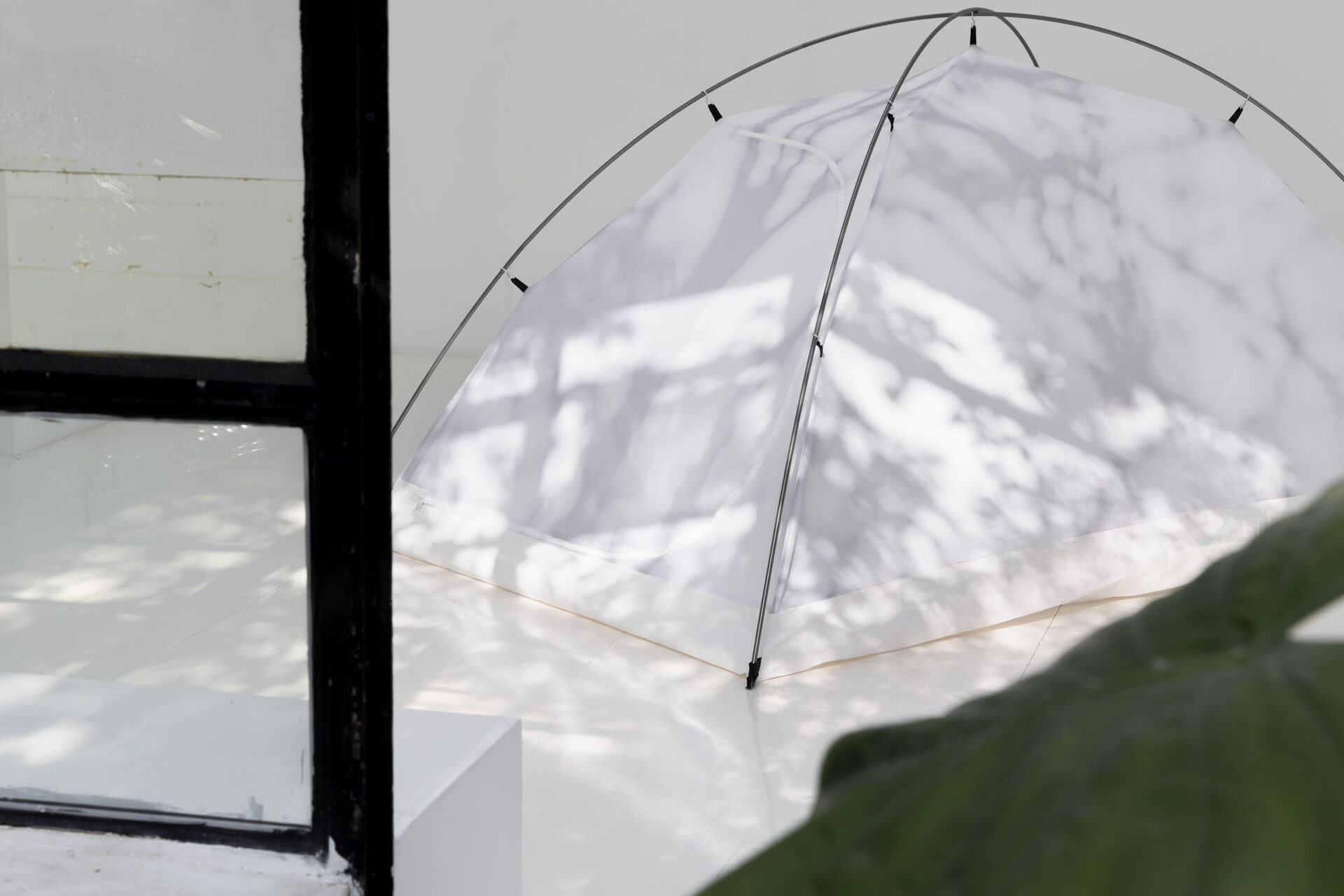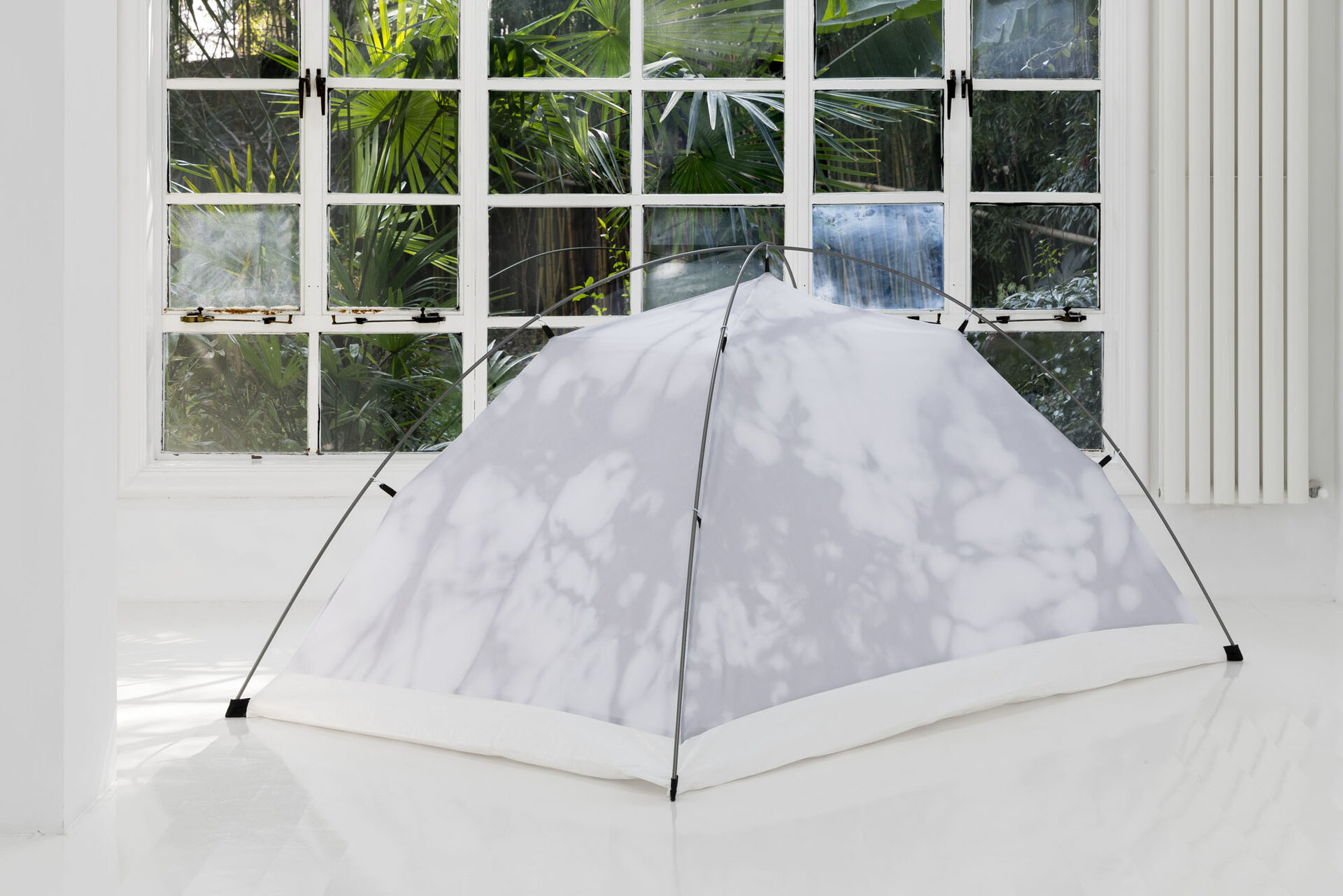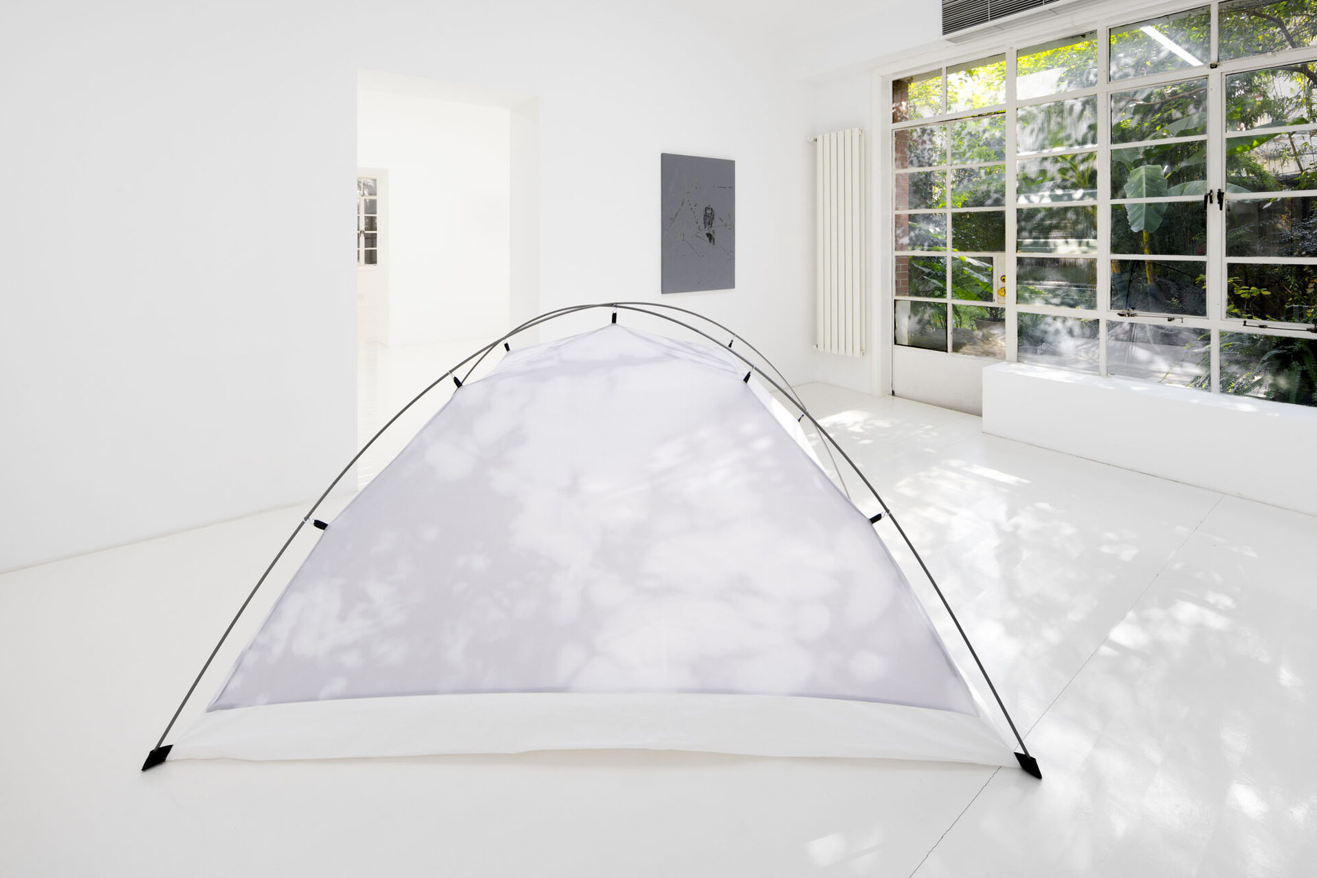 Through sculptural, installation, and photographic works, Campestri deconstructs the idea of home into fragments of journey, memory, and nomadism. Central to the exhibition is the tent as a mobile and temporary dwelling—a space continuously assembled, disassembled, abandoned, and revisited. Everyday acts, such as the care involved in watering plants, are highlighted in a set of camping cutlery engraved with the simple instruction, “I need to remember to water the plants”, underscoring the intimate rituals that constitute domestic life.