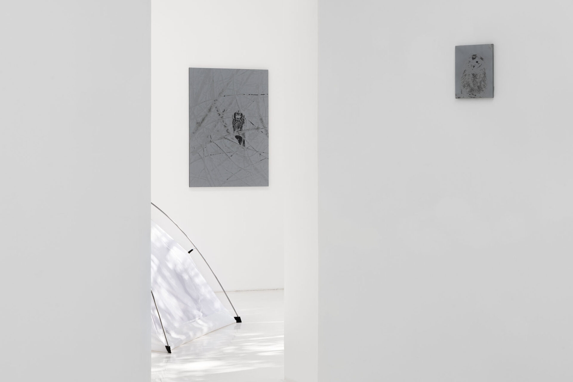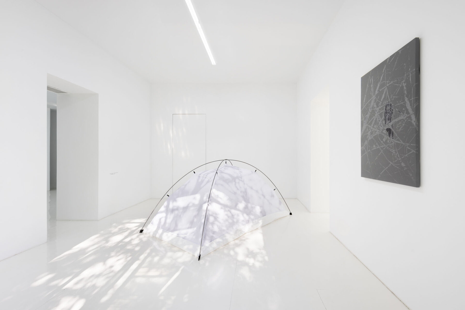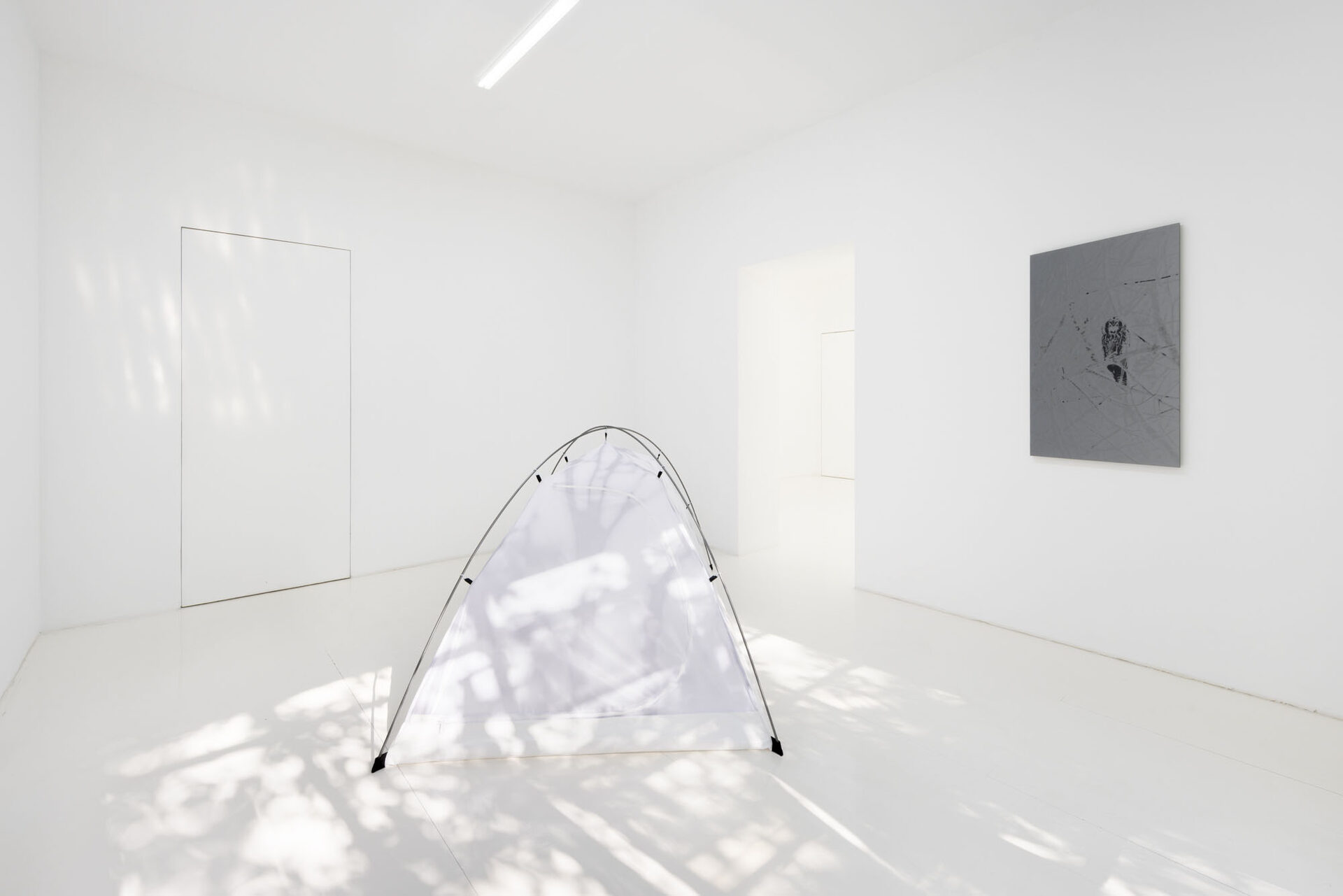 Through sculptural, installation, and photographic works, Campestri deconstructs the idea of home into fragments of journey, memory, and nomadism. Central to the exhibition is the tent as a mobile and temporary dwelling—a space continuously assembled, disassembled, abandoned, and revisited. Everyday acts, such as the care involved in watering plants, are highlighted in a set of camping cutlery engraved with the simple instruction, “I need to remember to water the plants”, underscoring the intimate rituals that constitute domestic life.