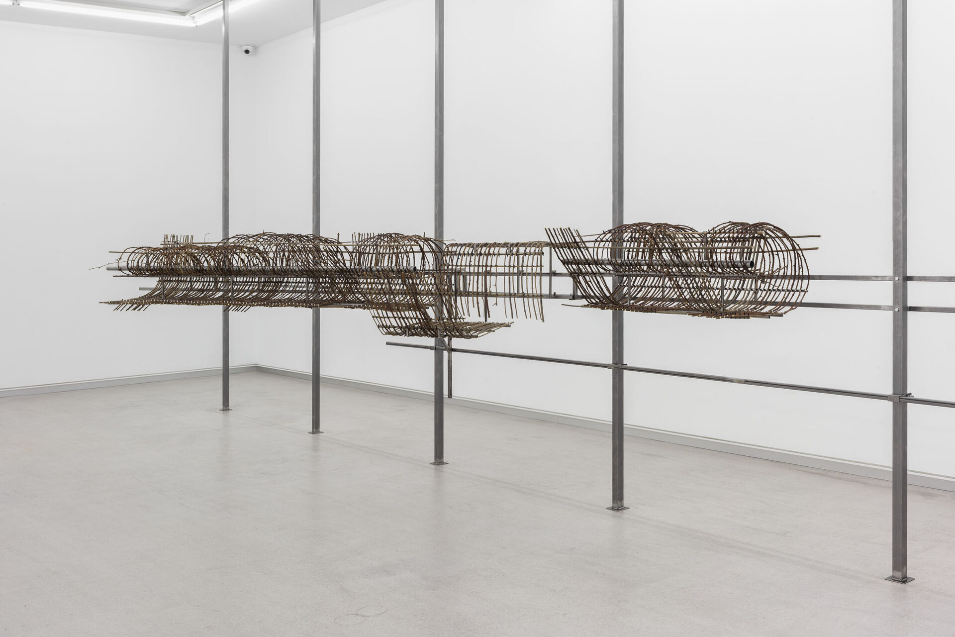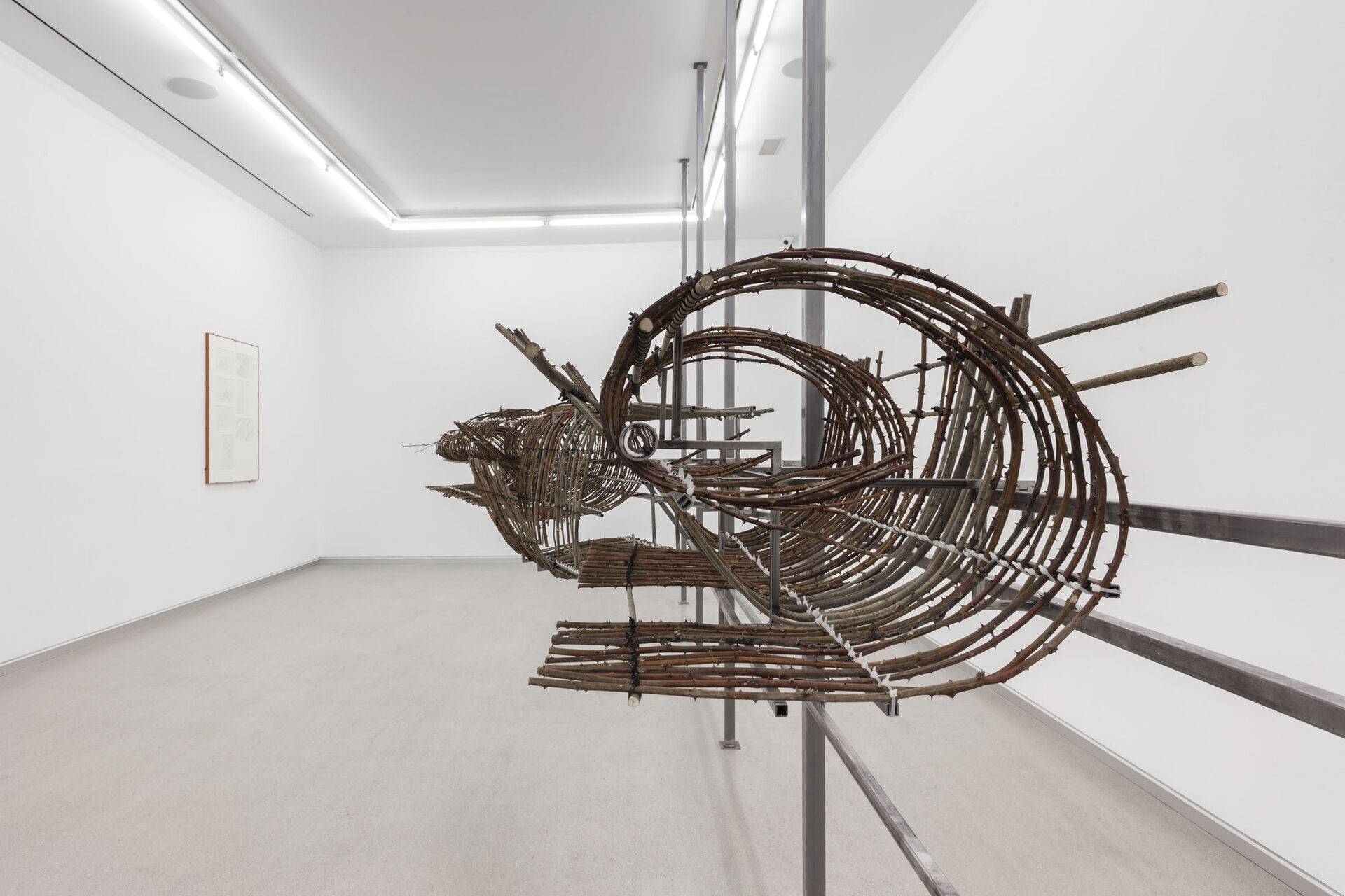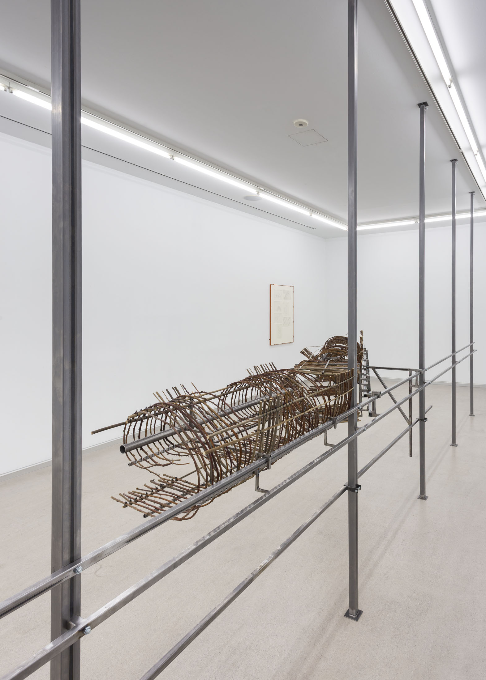 The work I am presenting in the studio space is an adaptation of an exhibition with the same title I had last summer at Temple Bar Gallery + Studios in Dublin. I started off from a drawing based on a written description of the inside of a tiny room with a door opening onto the galleryin Dublin. Inside it there was nothing but light switches, the closed-circuit system and cleaning products. The effort of imagining the space from the meticulous text that Michael Hill, the exhibition’s curator, had sent to me and the attempt to represent it in a drawing, was my way of foreclosing the impulse to explore my affective relationship with Dublin or any history associated with the site. And so, in this way, the main sculpture, made from bramble branches collected in Artxanda, established a certain distance from the Irish art centre and its audience, in contrast to the insect drawings, which sought to appeal directly to visitors. Now, here in Bilbao, I believe those…