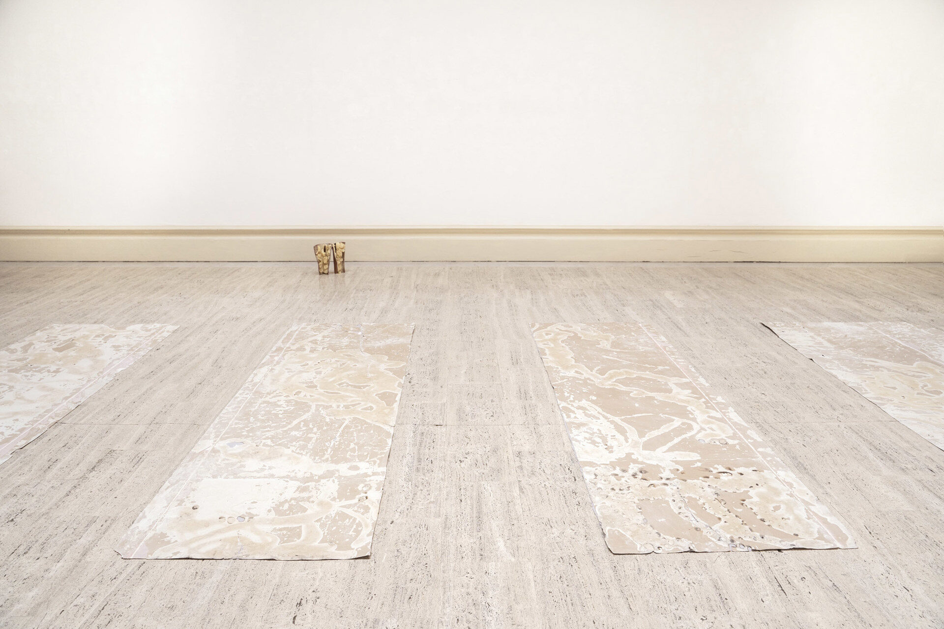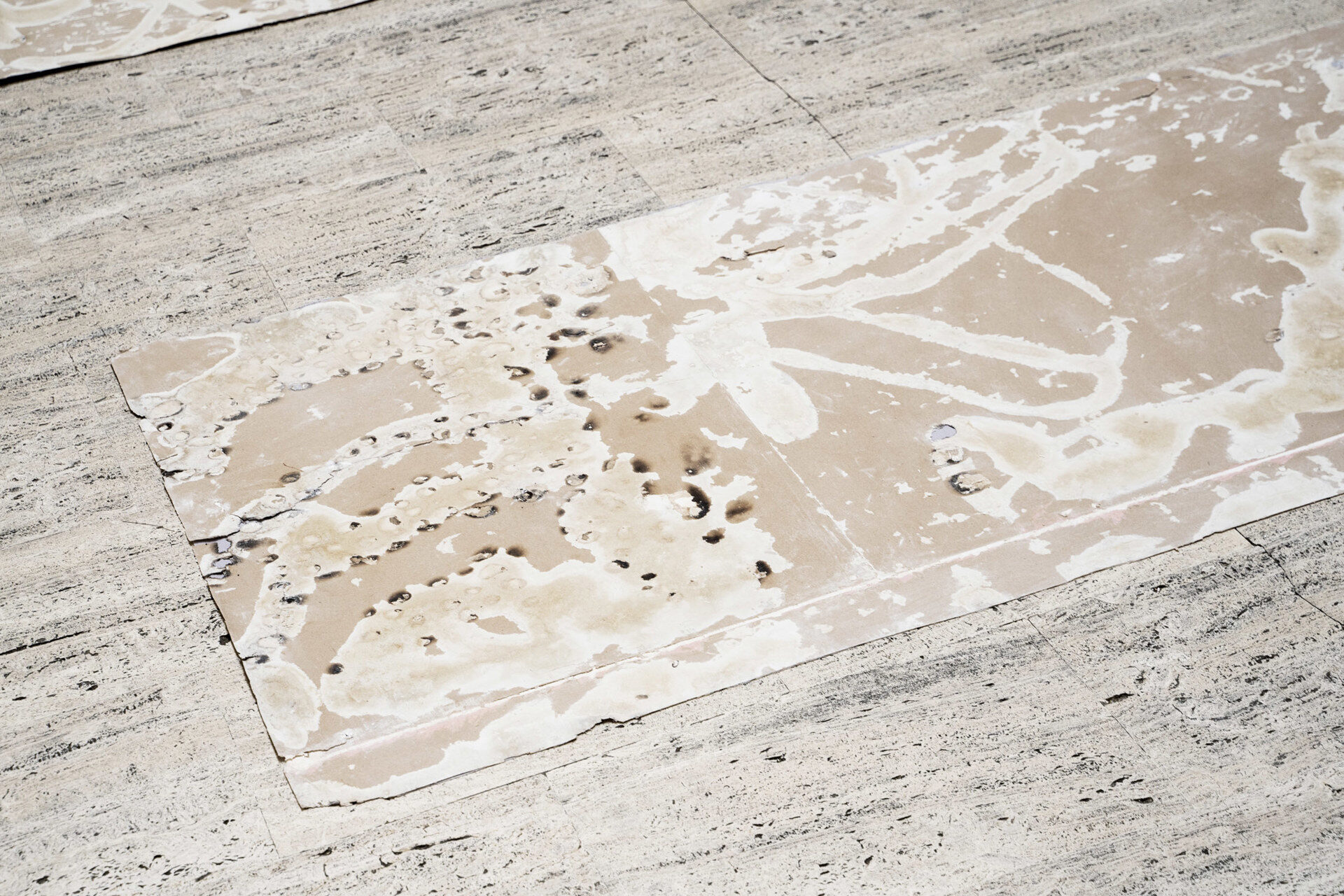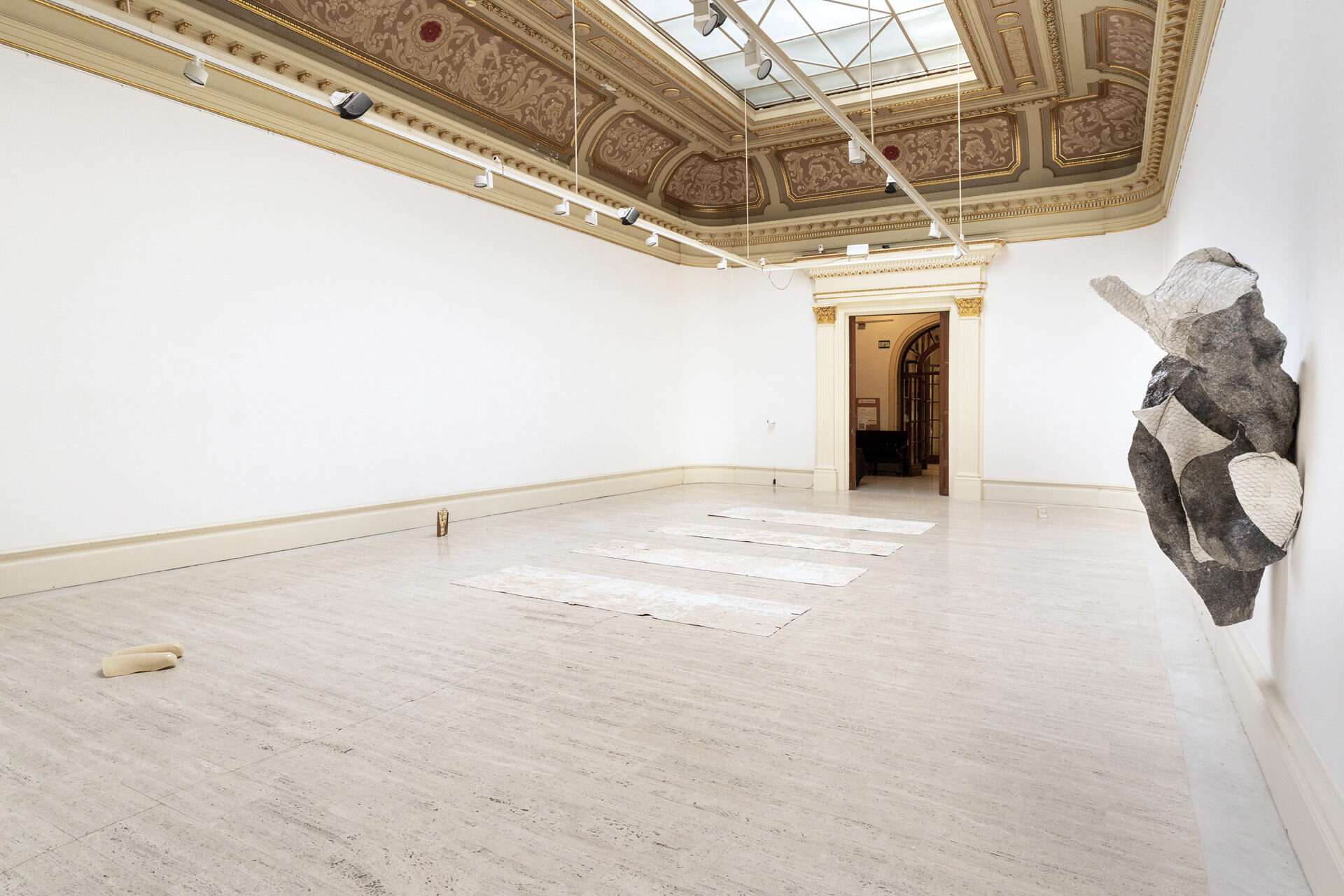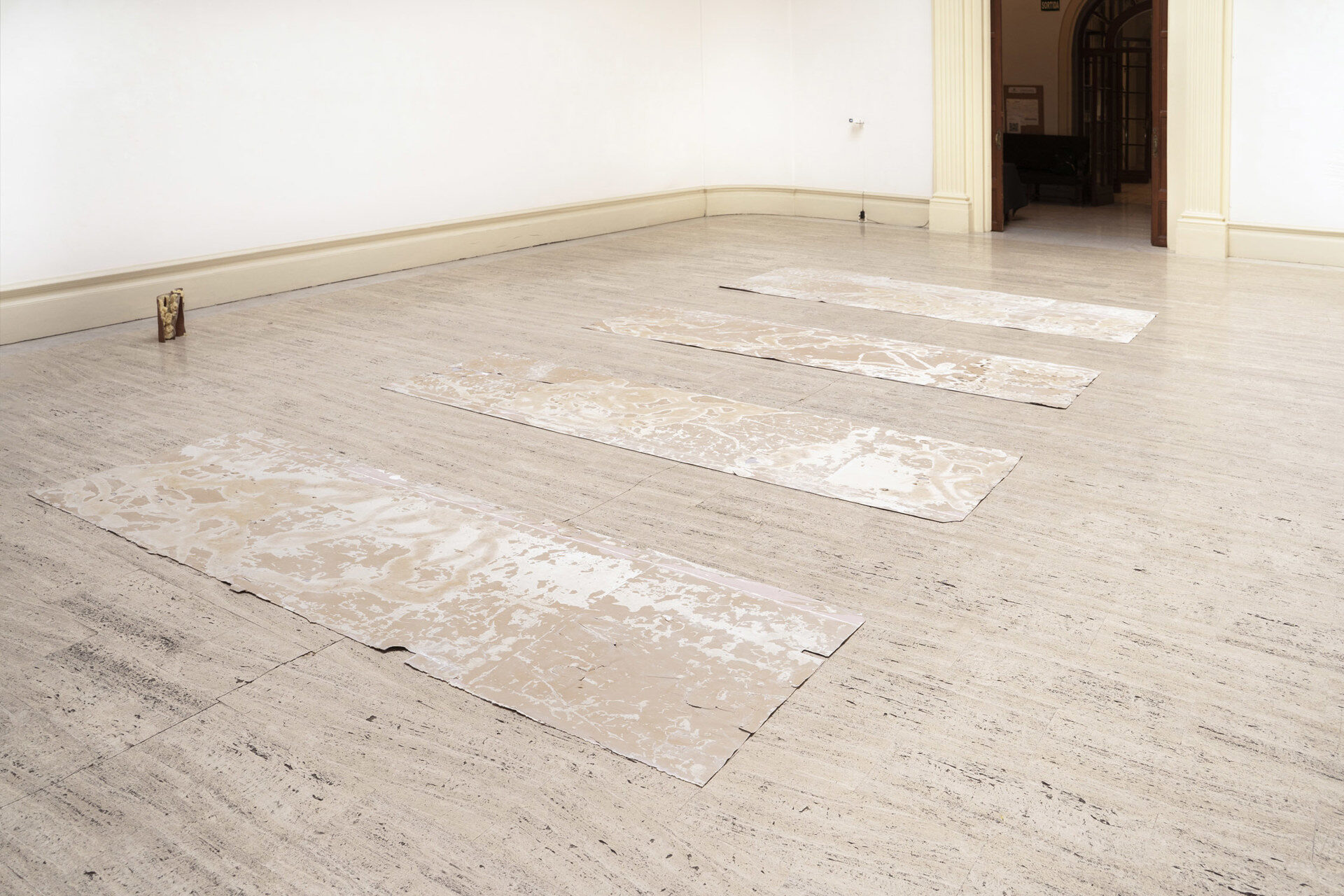 Resurrecting only the skin, without the body that covers and belongs to it. Cristina Spinelli (Madrid, 1993) brings back to life the trimming of the drawing she made two years ago, with fire, on plasterboard walls, later repainted. The flourish burned into the wall was buried under the plastic paint; and now, the surfaces have been polished, the membranes have been torn from the plasterboard body and under the title of folus (aura) appear again like burnt clothes spread out on the floor. Like niches, like archaeological research plots. Archeology as scar.