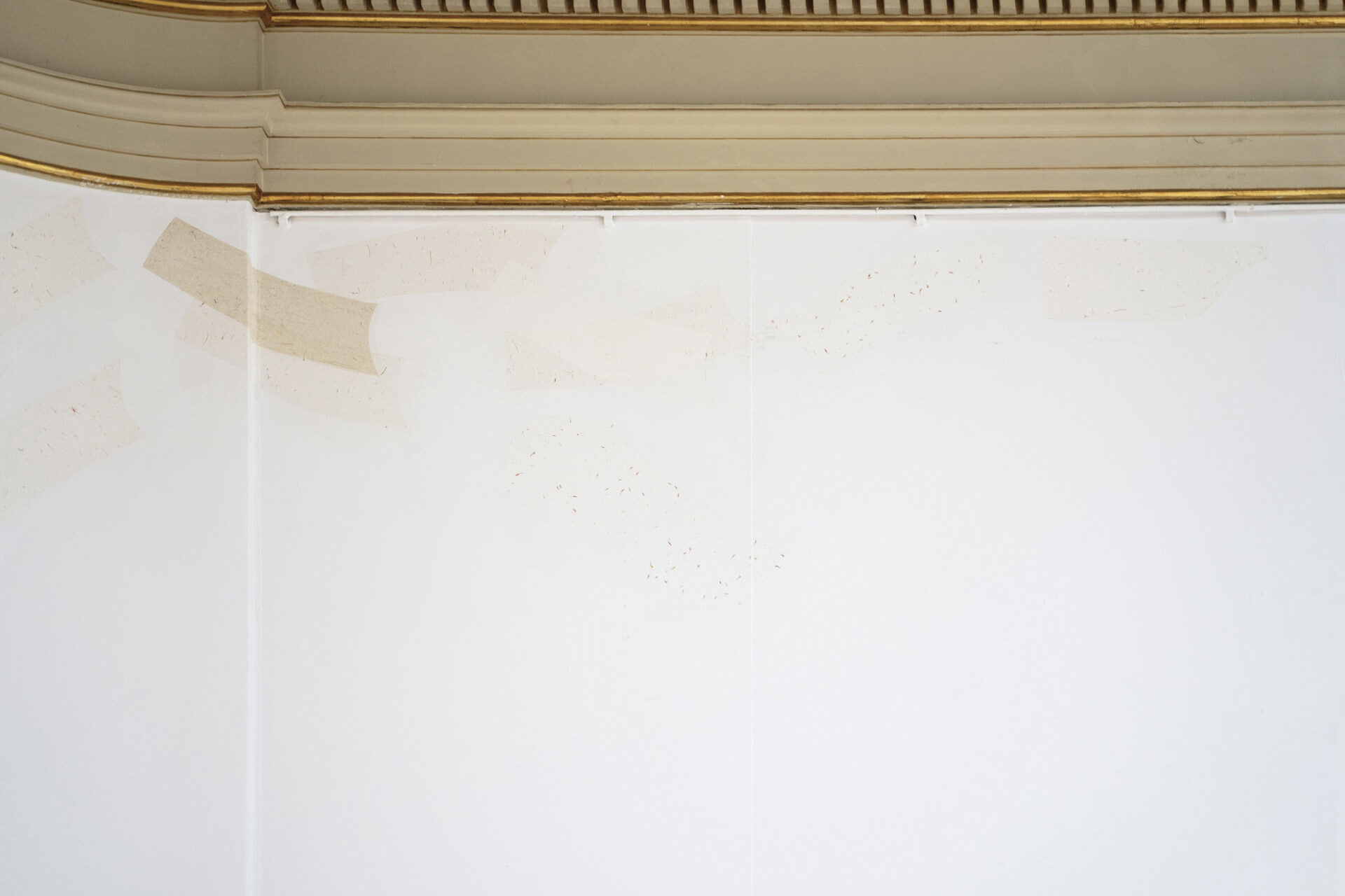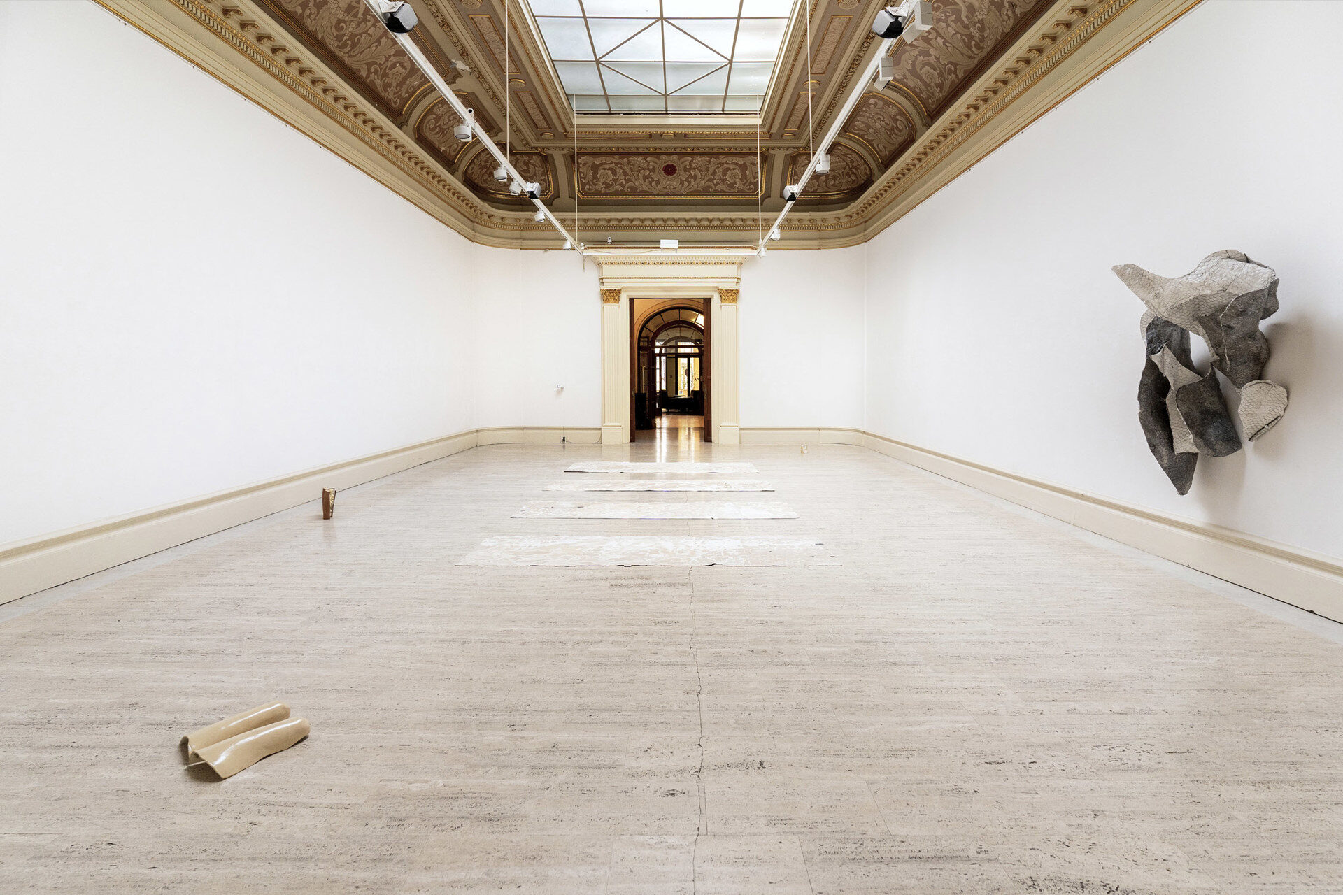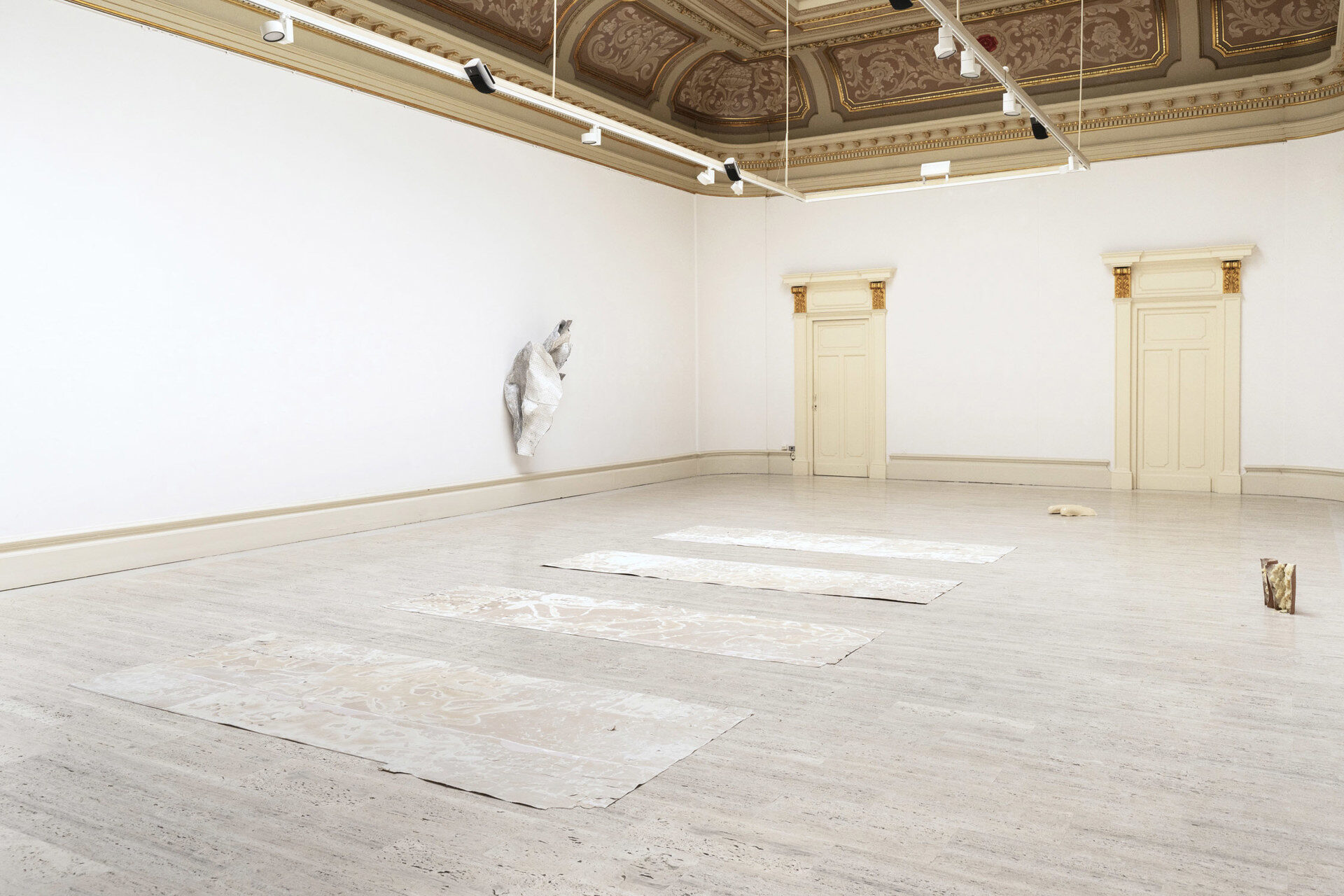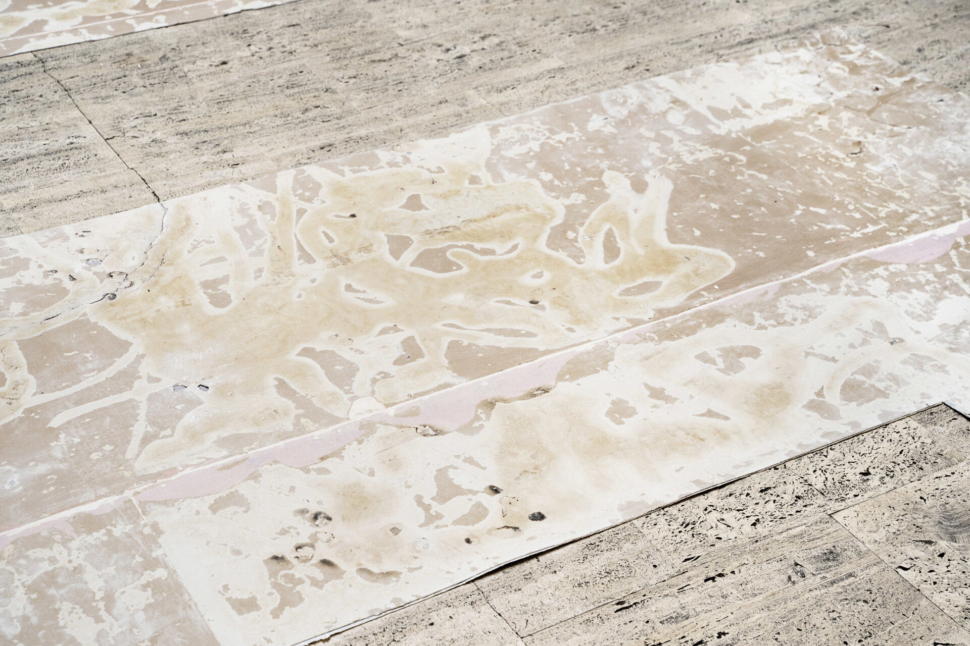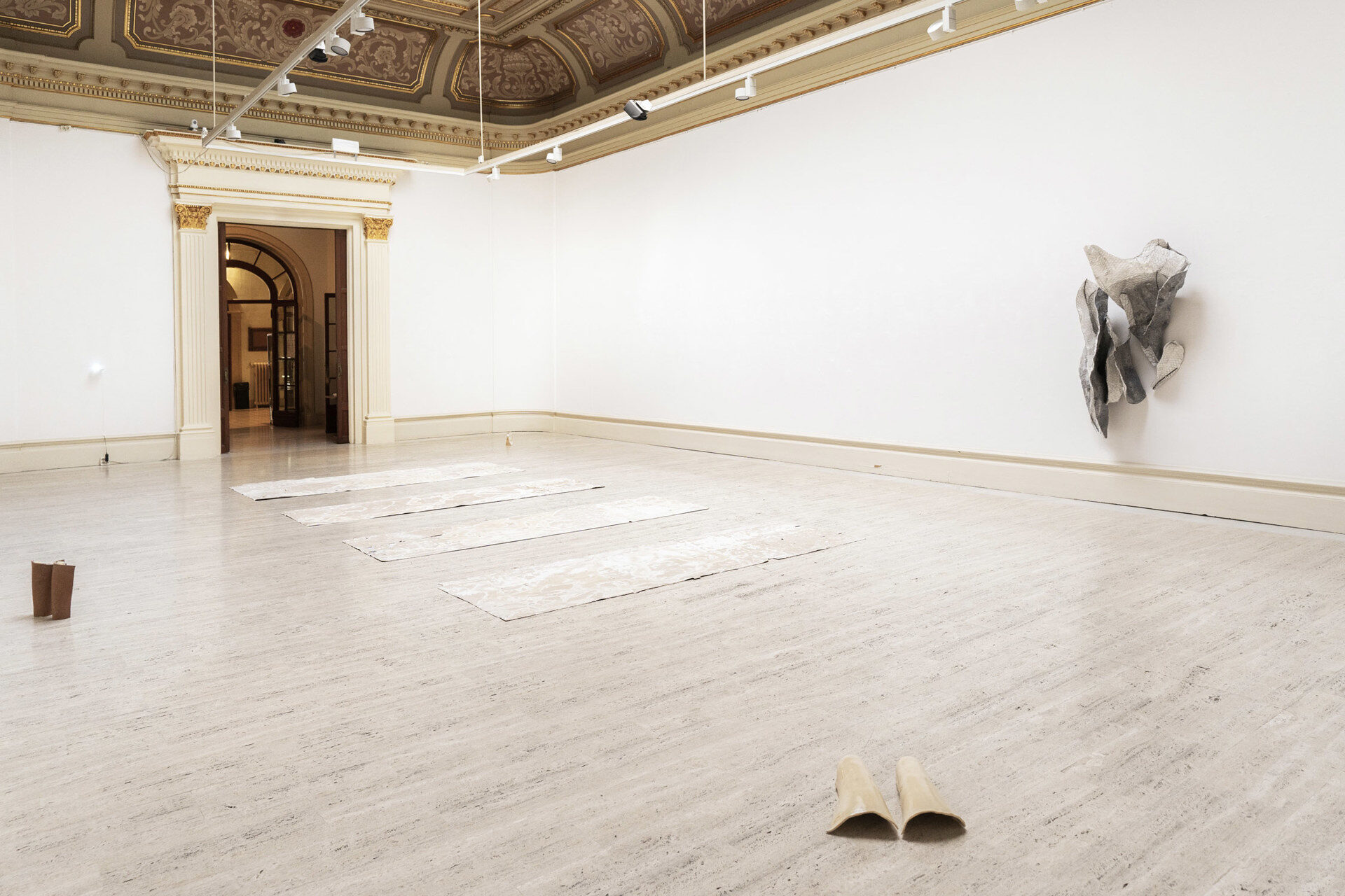 Resurrecting only the skin, without the body that covers and belongs to it. Cristina Spinelli (Madrid, 1993) brings back to life the trimming of the drawing she made two years ago, with fire, on plasterboard walls, later repainted. The flourish burned into the wall was buried under the plastic paint; and now, the surfaces have been polished, the membranes have been torn from the plasterboard body and under the title of folus (aura) appear again like burnt clothes spread out on the floor. Like niches, like archaeological research plots. Archeology as scar.