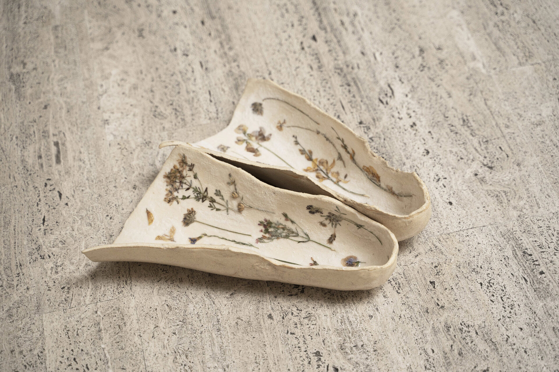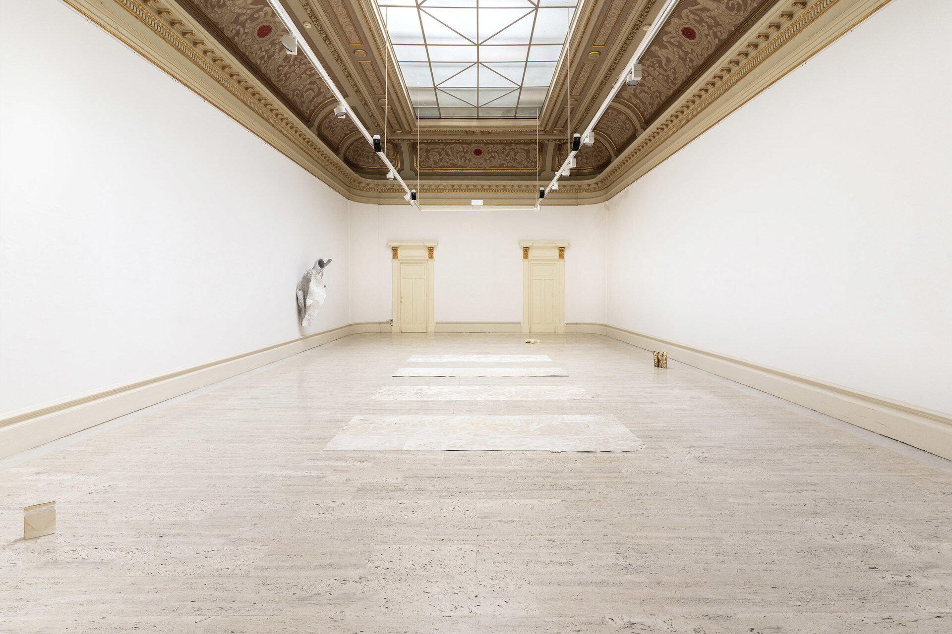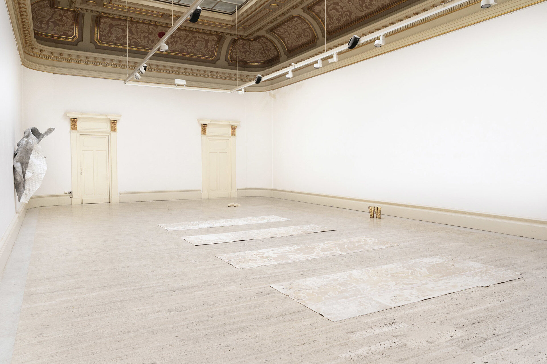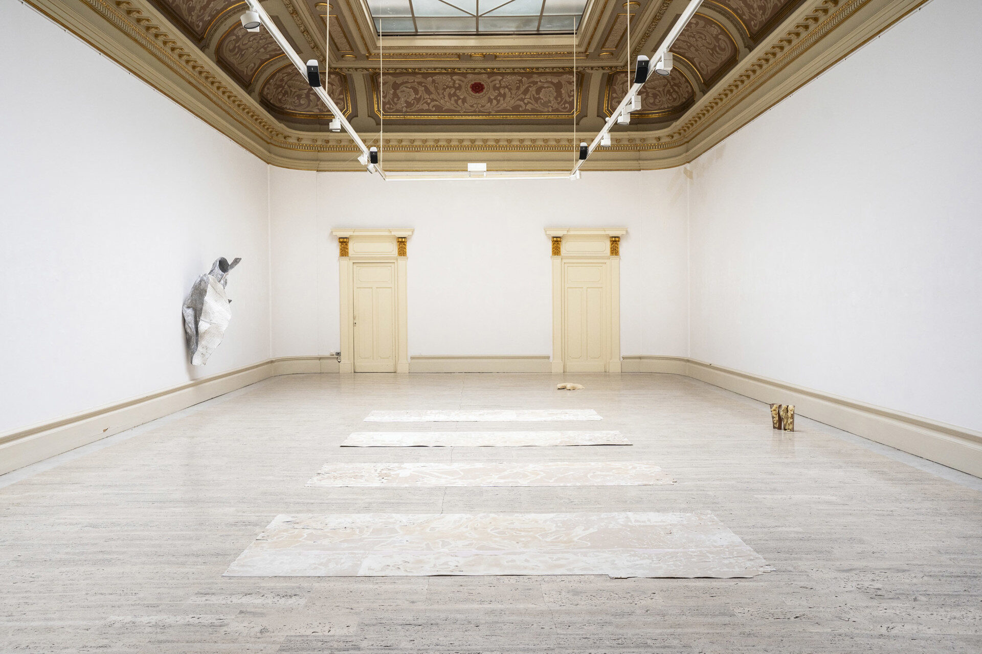 Resurrecting only the skin, without the body that covers and belongs to it. Cristina Spinelli (Madrid, 1993) brings back to life the trimming of the drawing she made two years ago, with fire, on plasterboard walls, later repainted. The flourish burned into the wall was buried under the plastic paint; and now, the surfaces have been polished, the membranes have been torn from the plasterboard body and under the title of folus (aura) appear again like burnt clothes spread out on the floor. Like niches, like archaeological research plots. Archeology as scar.