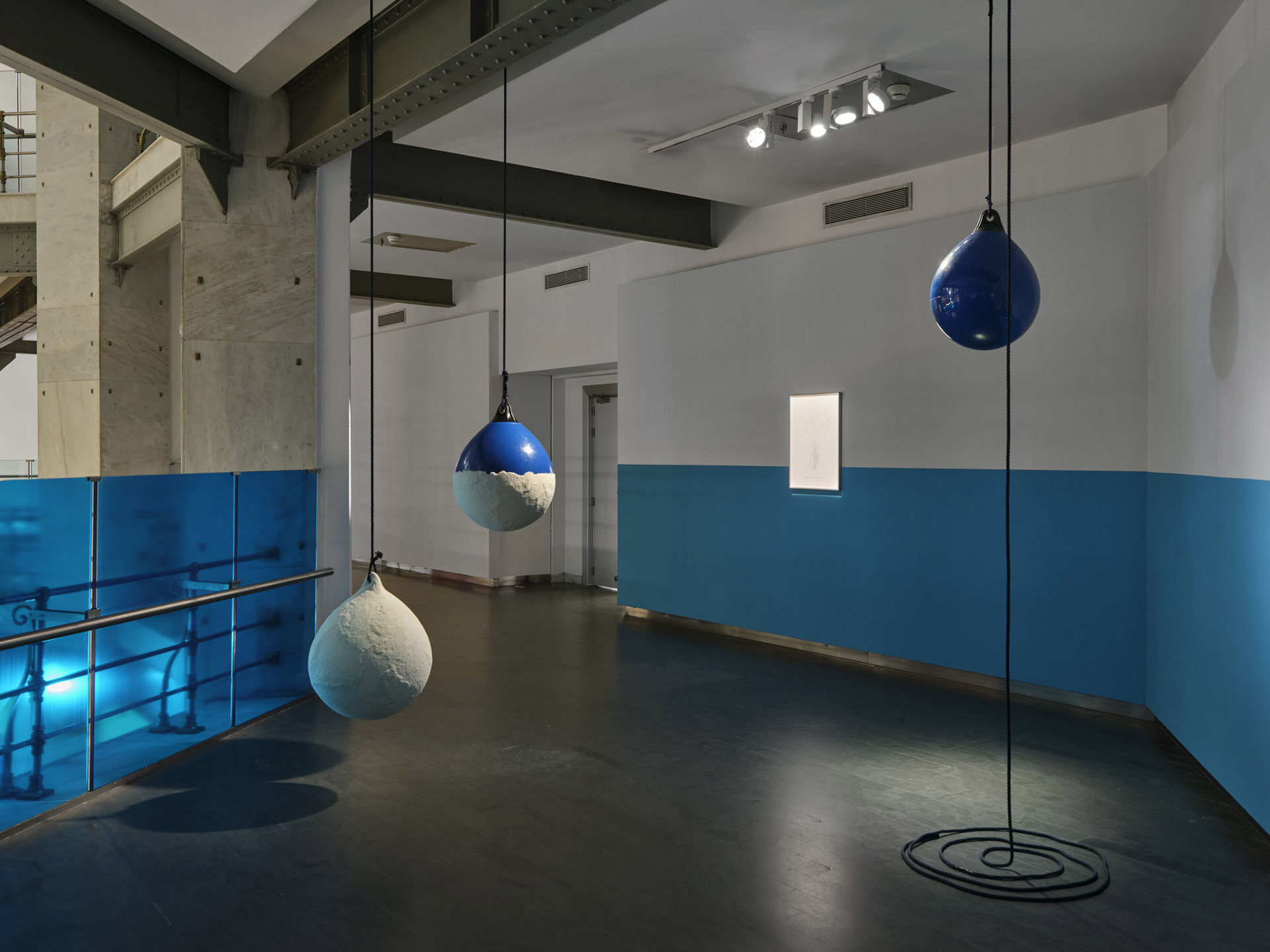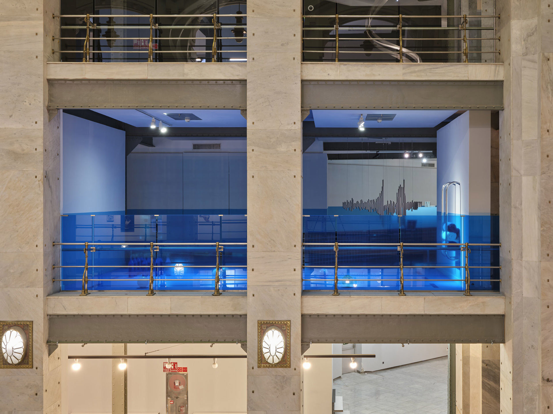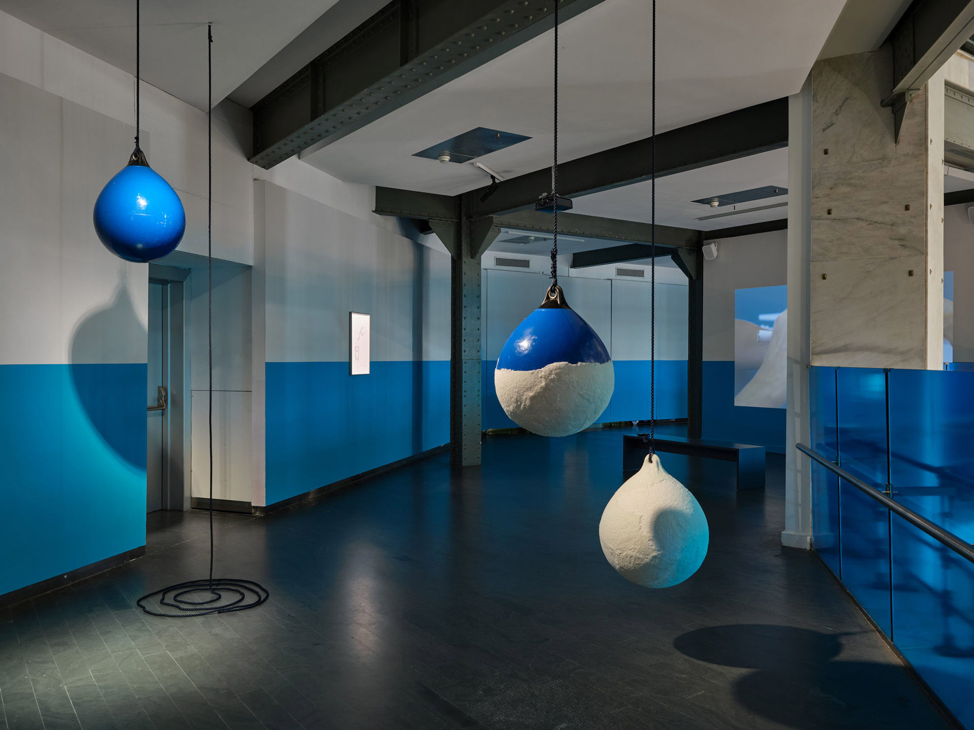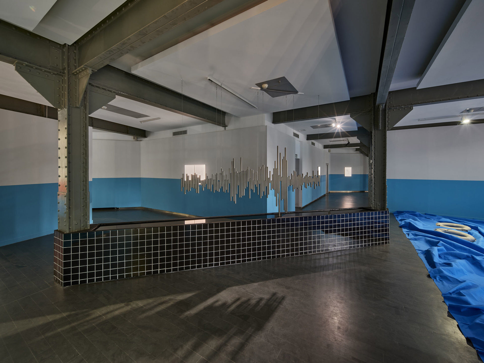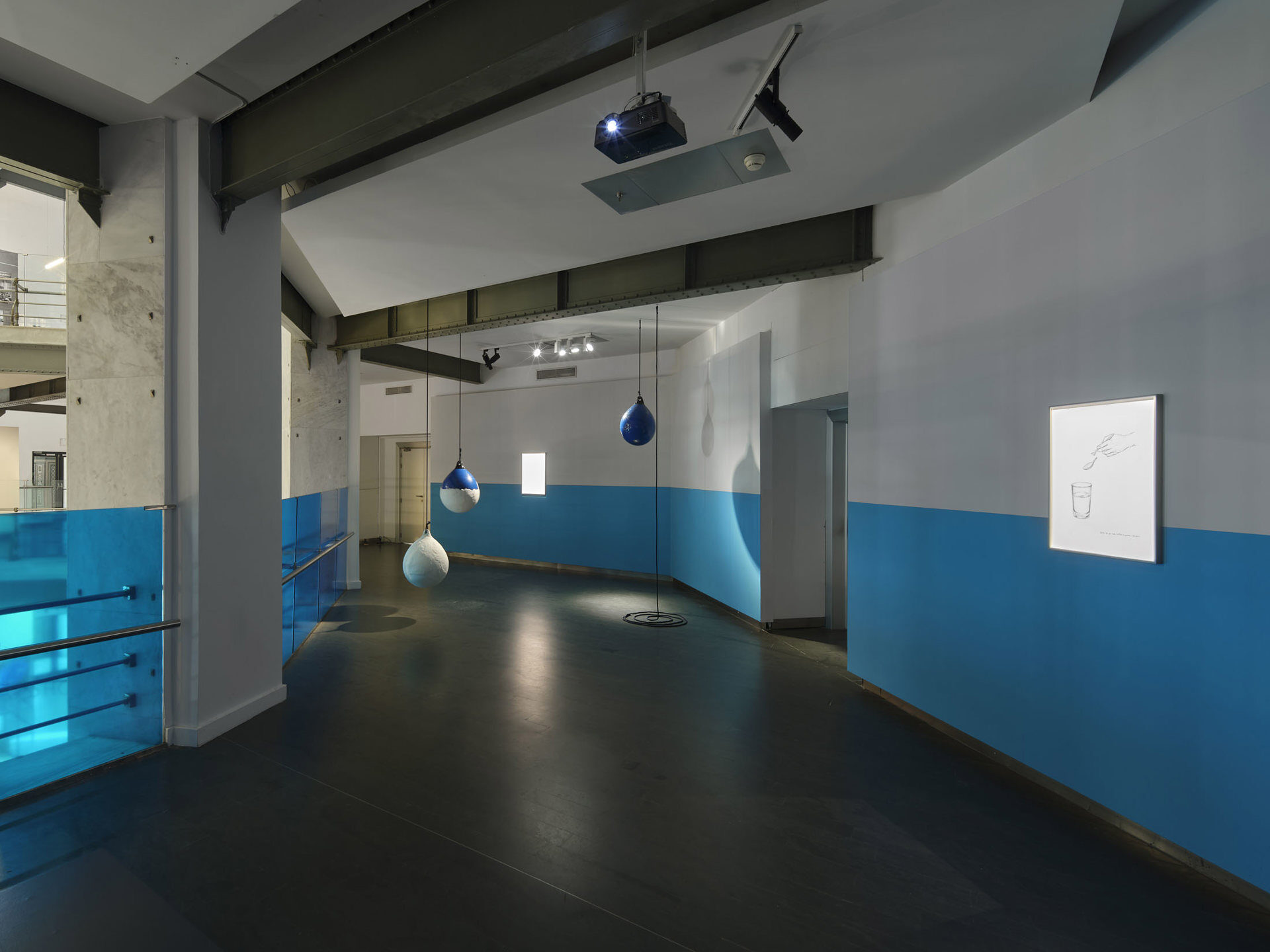 The exhibition explores dualities and repetition, using the unique architecture of the venue as a narrative device. A blue band at neck height runs throughout the entire floor, transforming the space into a metaphorical pool. This visual element connects all the rooms and recalls Lobera’s previous works on liminality and perception.
