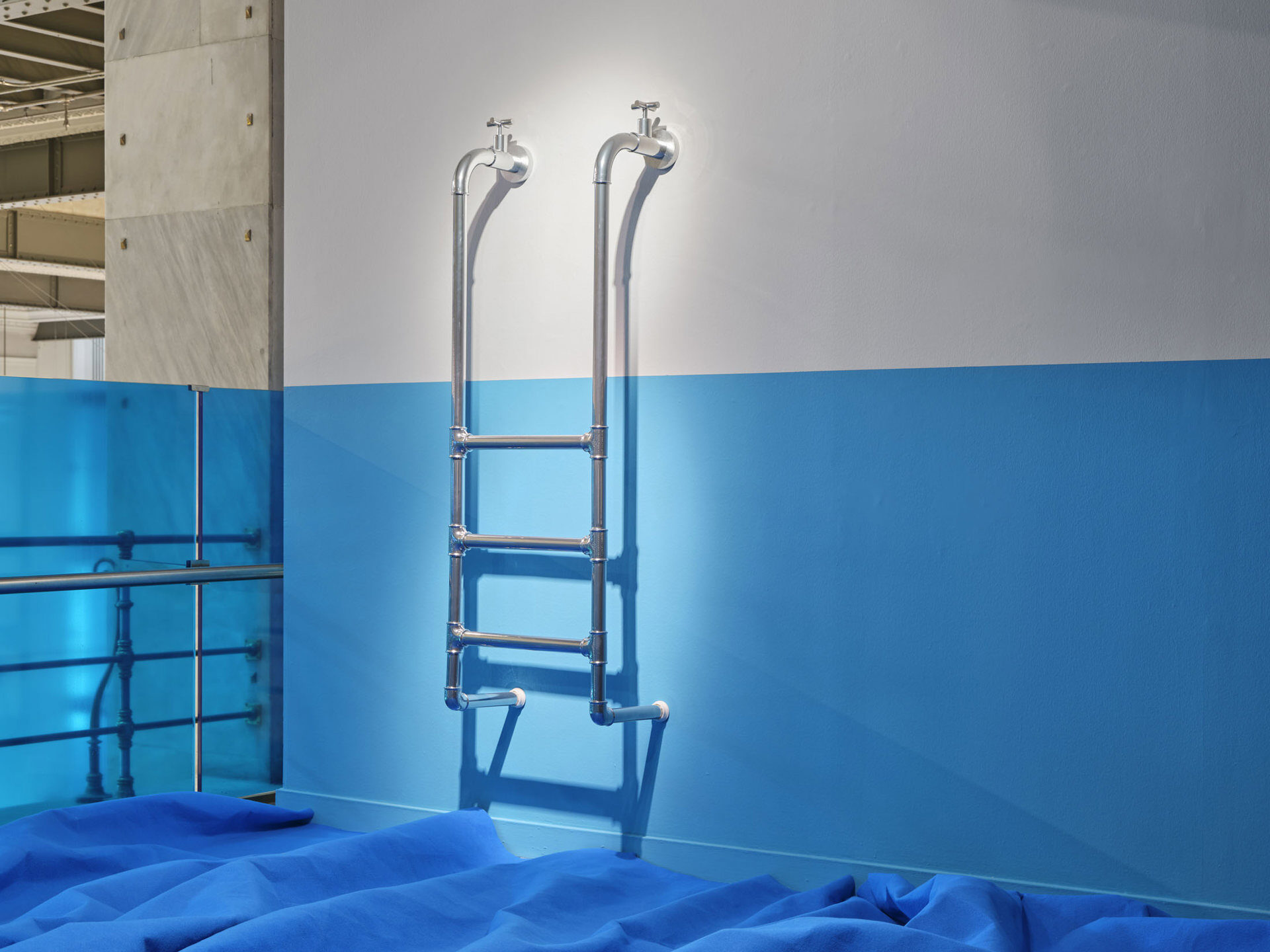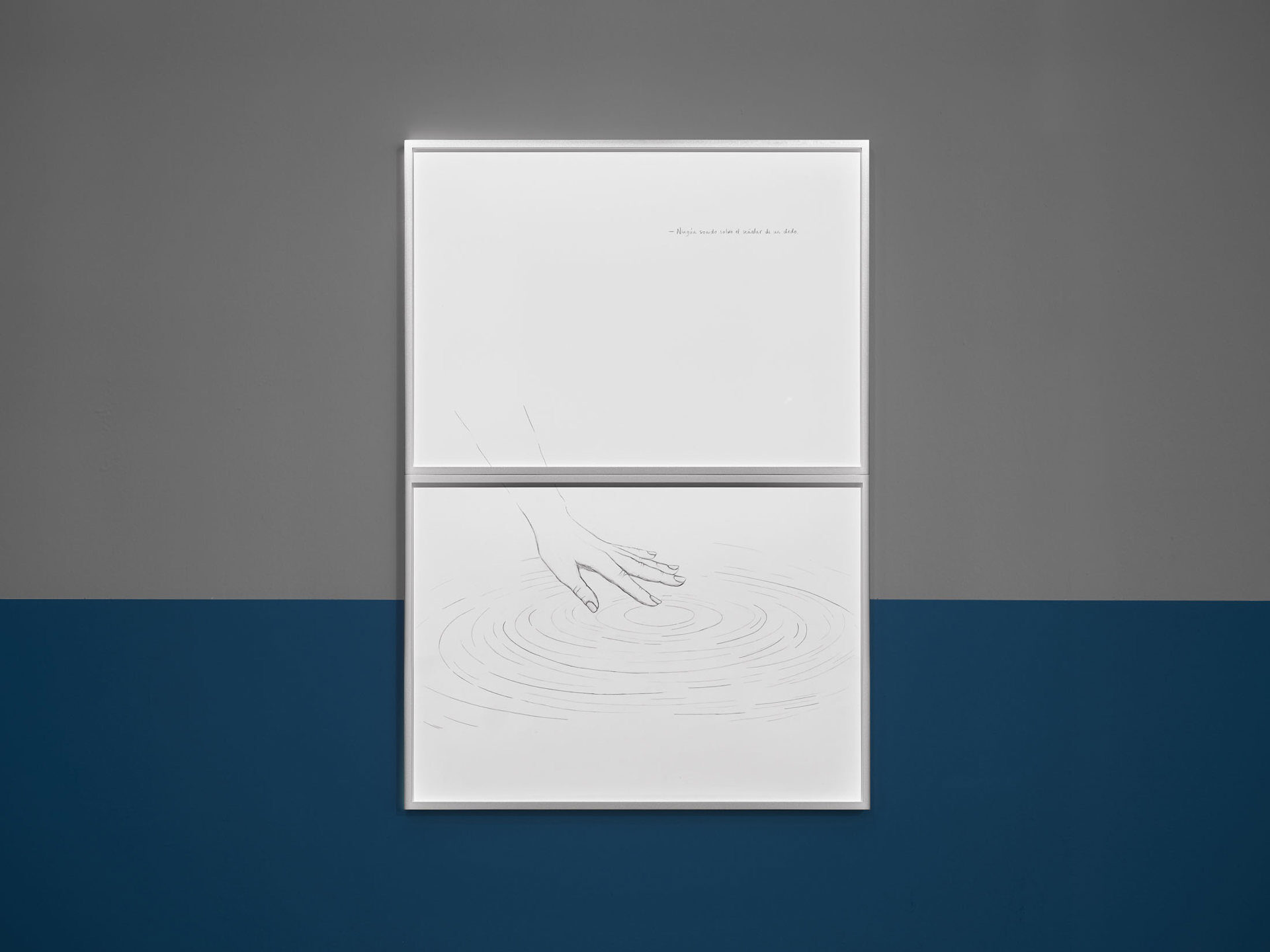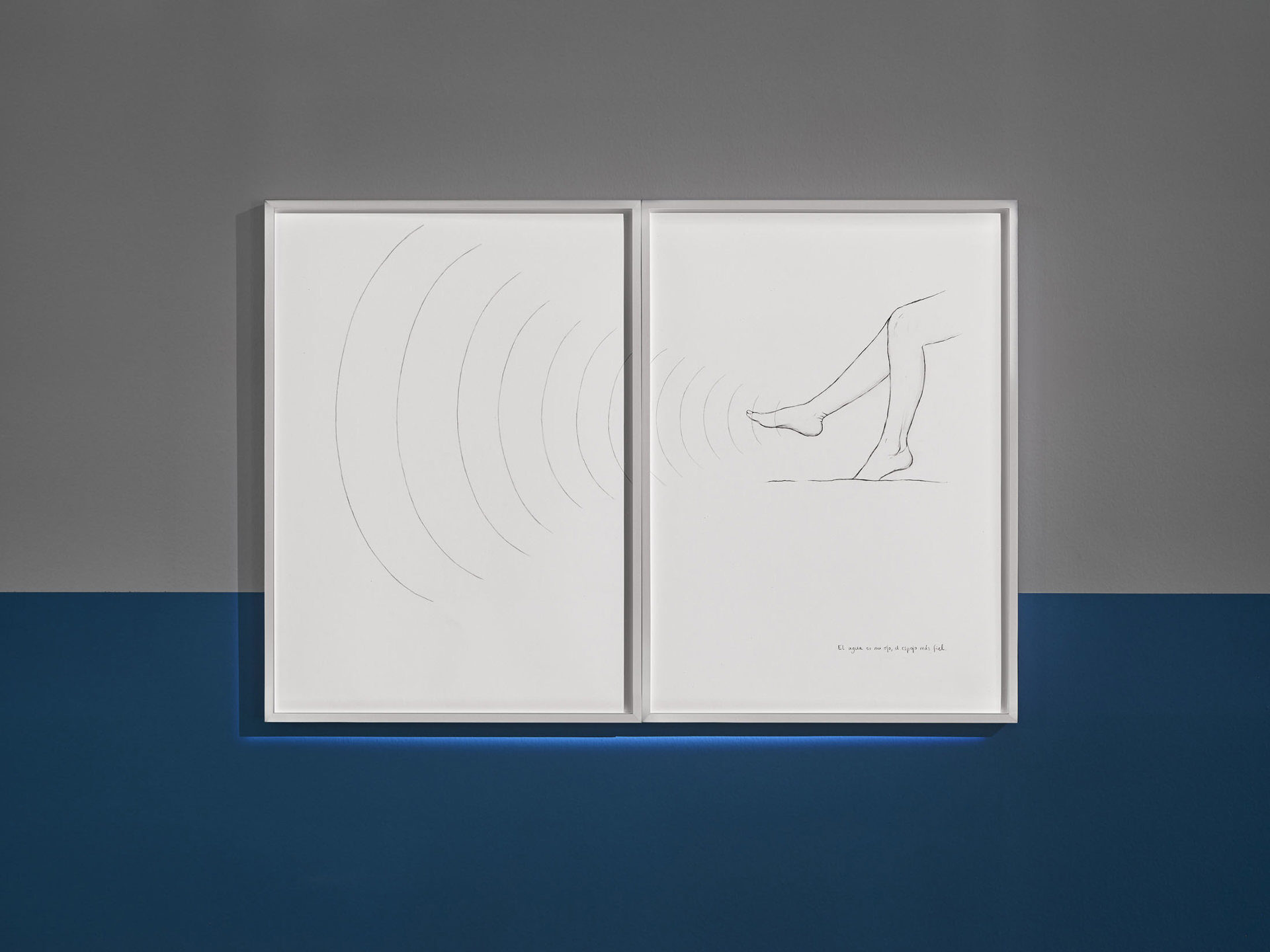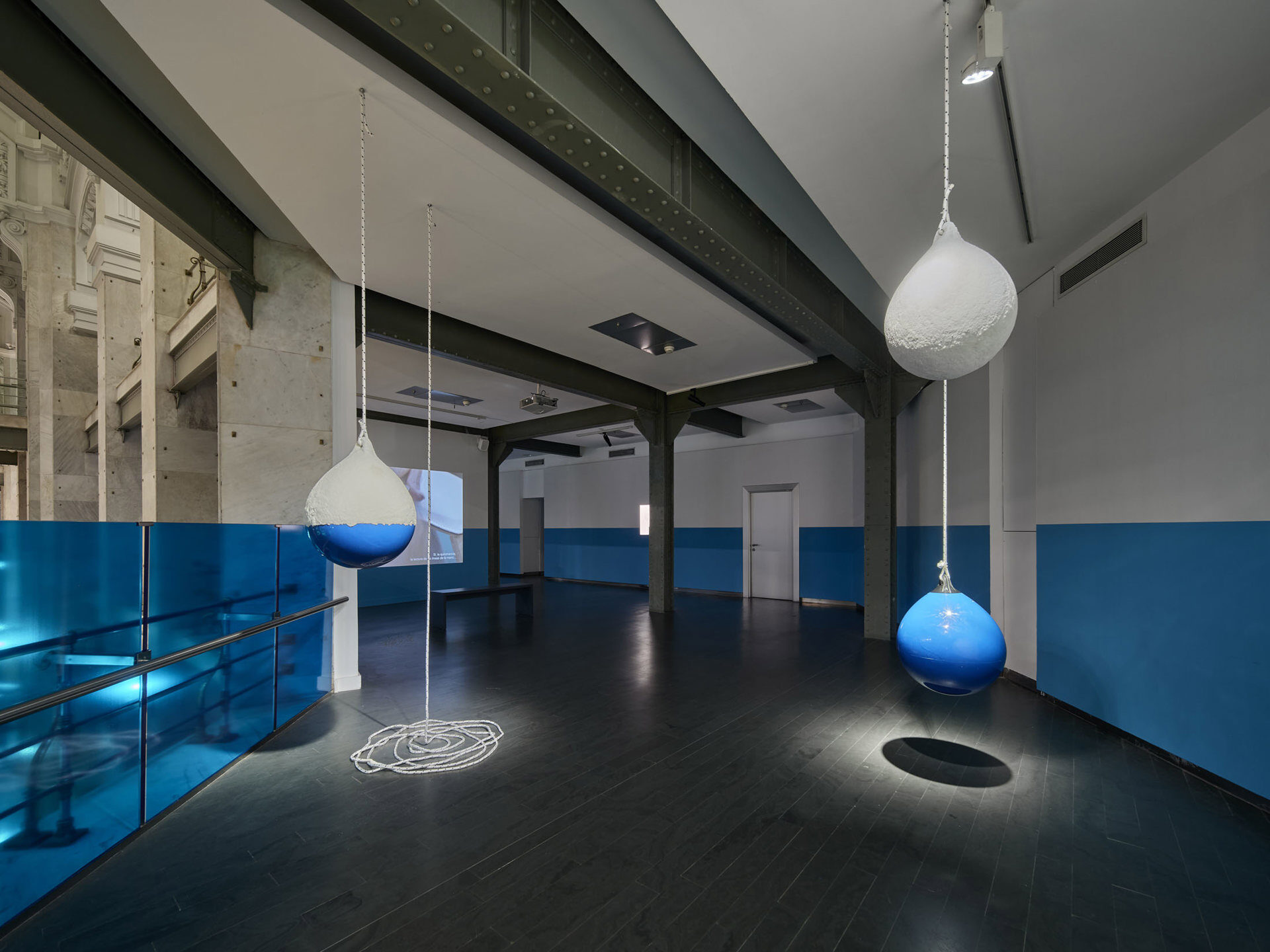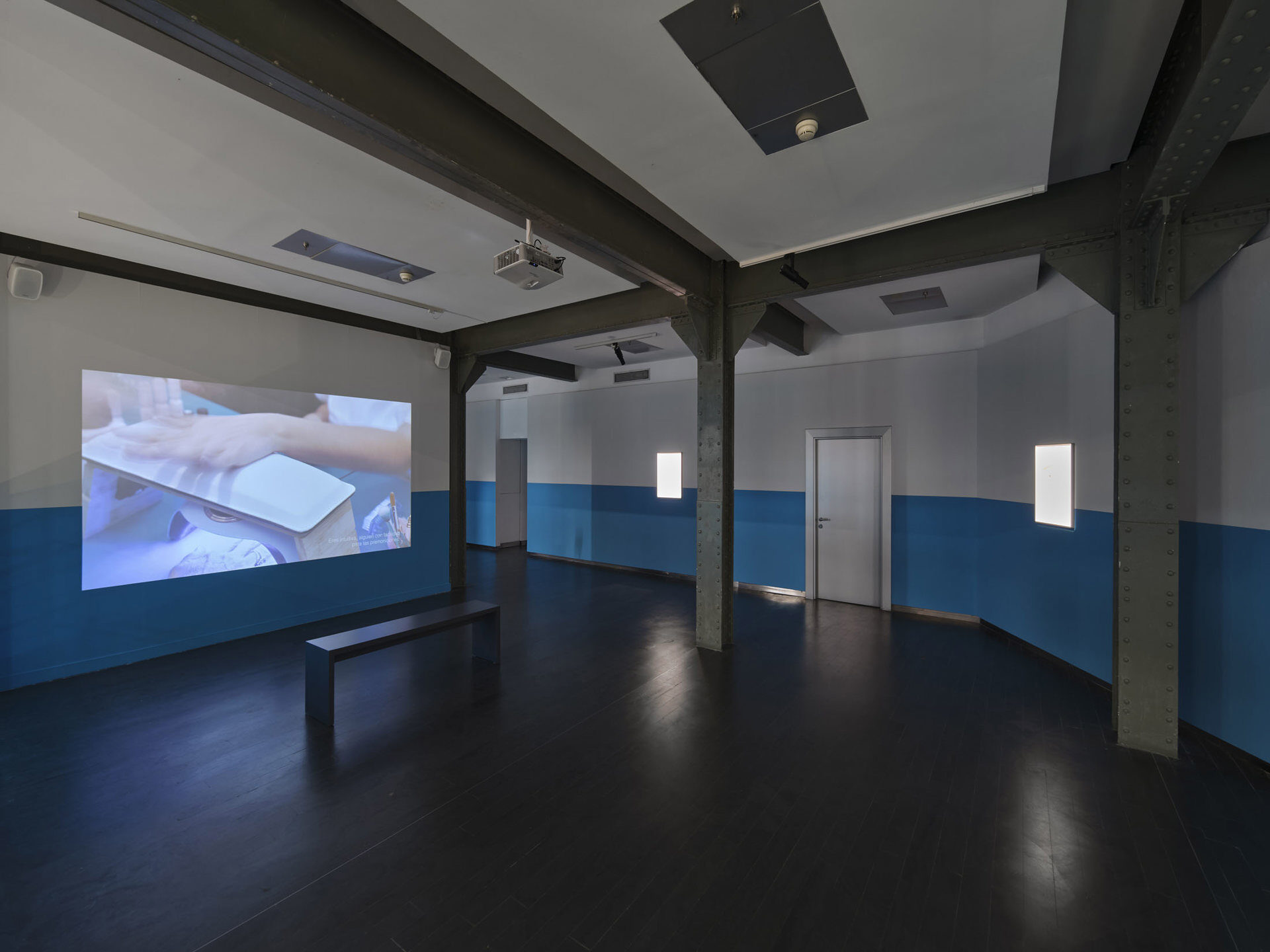 The exhibition explores dualities and repetition, using the unique architecture of the venue as a narrative device. A blue band at neck height runs throughout the entire floor, transforming the space into a metaphorical pool. This visual element connects all the rooms and recalls Lobera’s previous works on liminality and perception.