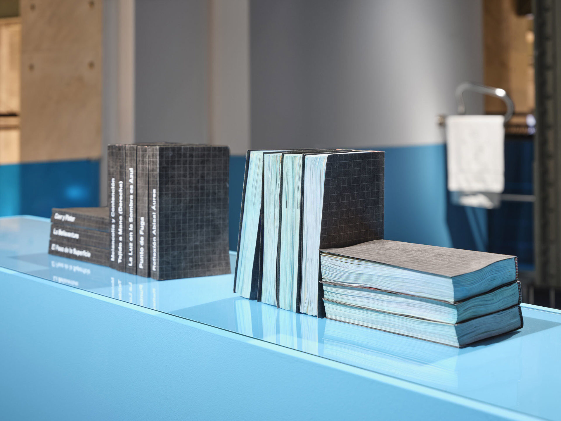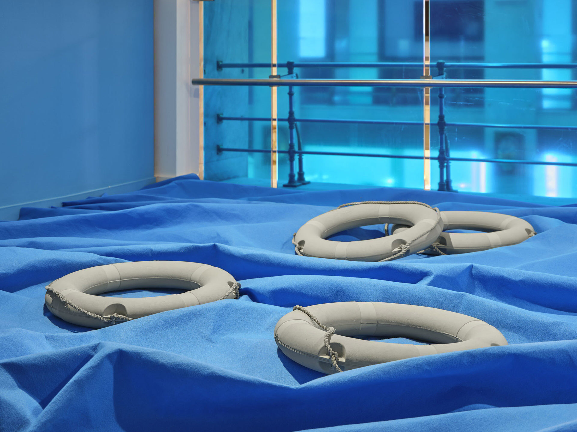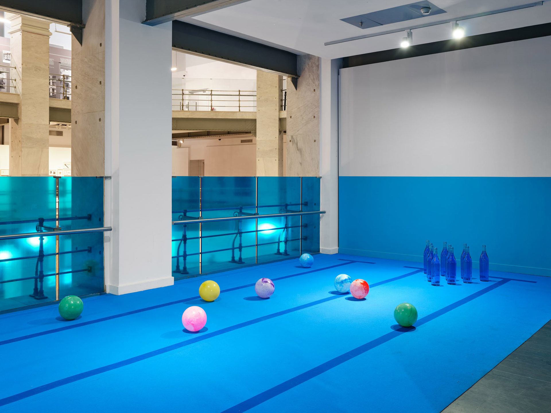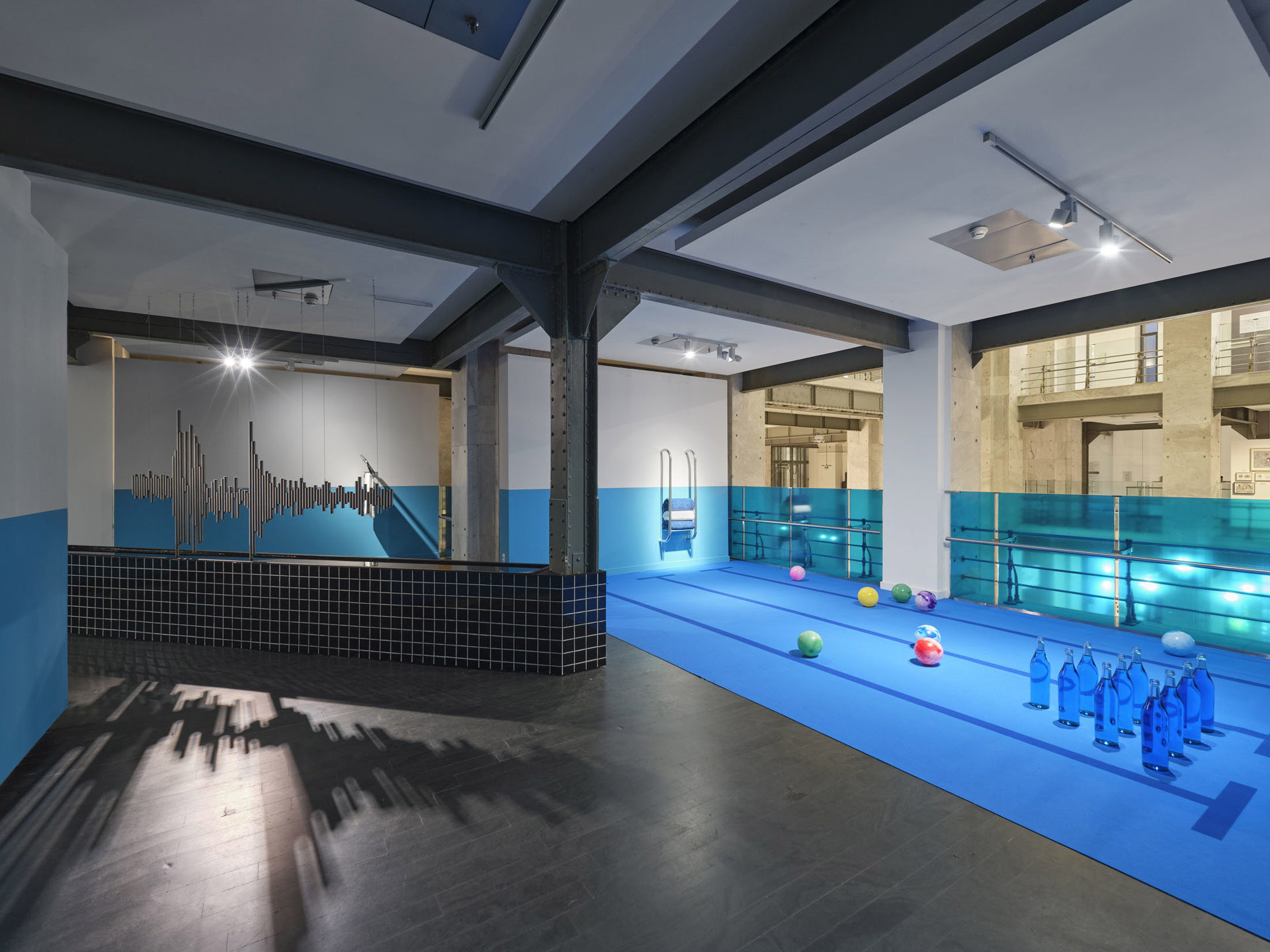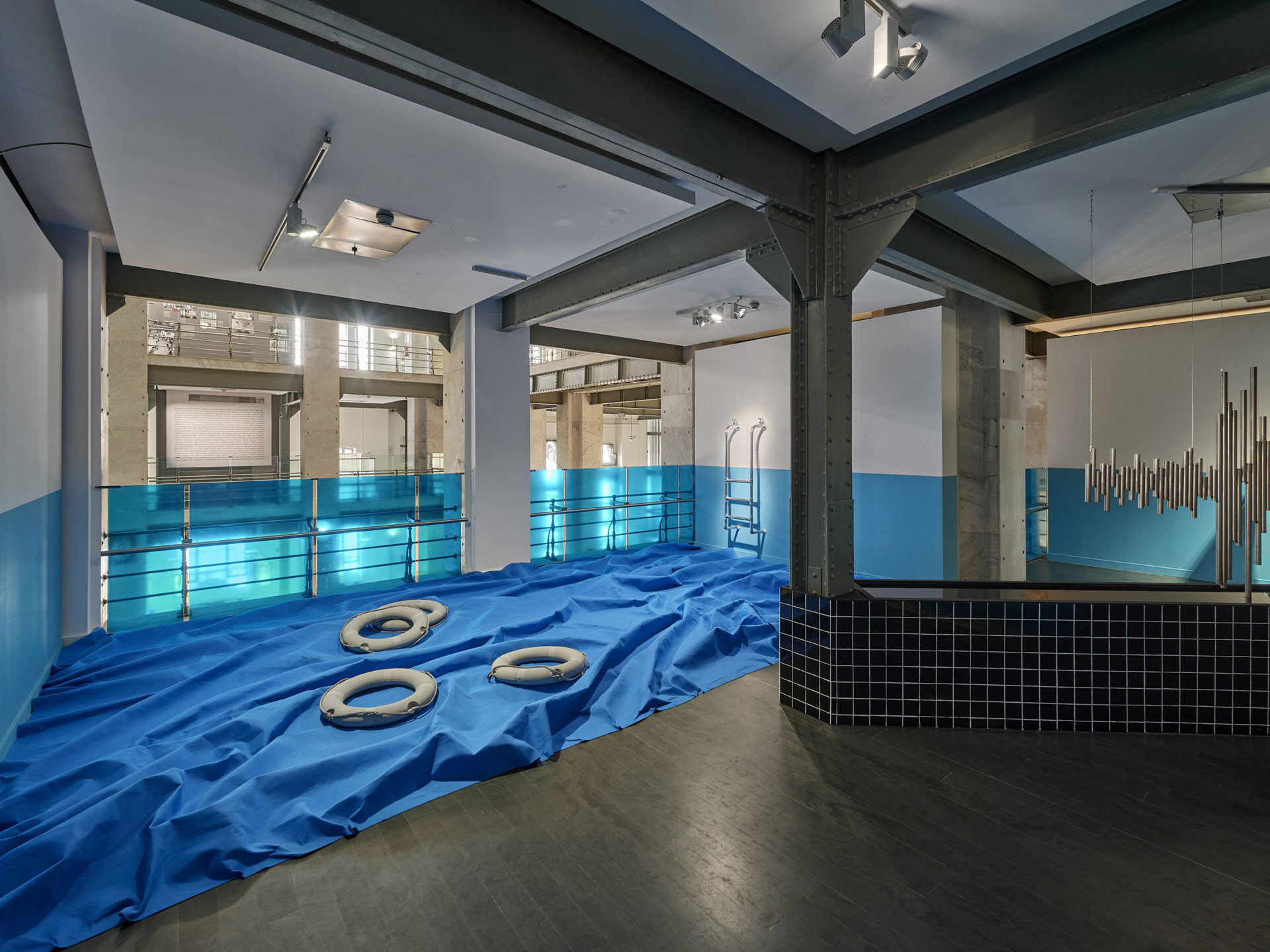 The exhibition explores dualities and repetition, using the unique architecture of the venue as a narrative device. A blue band at neck height runs throughout the entire floor, transforming the space into a metaphorical pool. This visual element connects all the rooms and recalls Lobera’s previous works on liminality and perception.