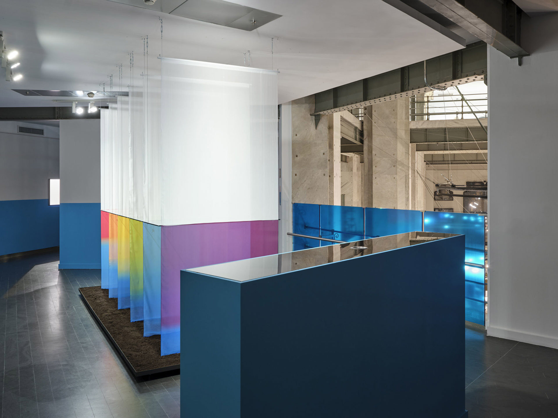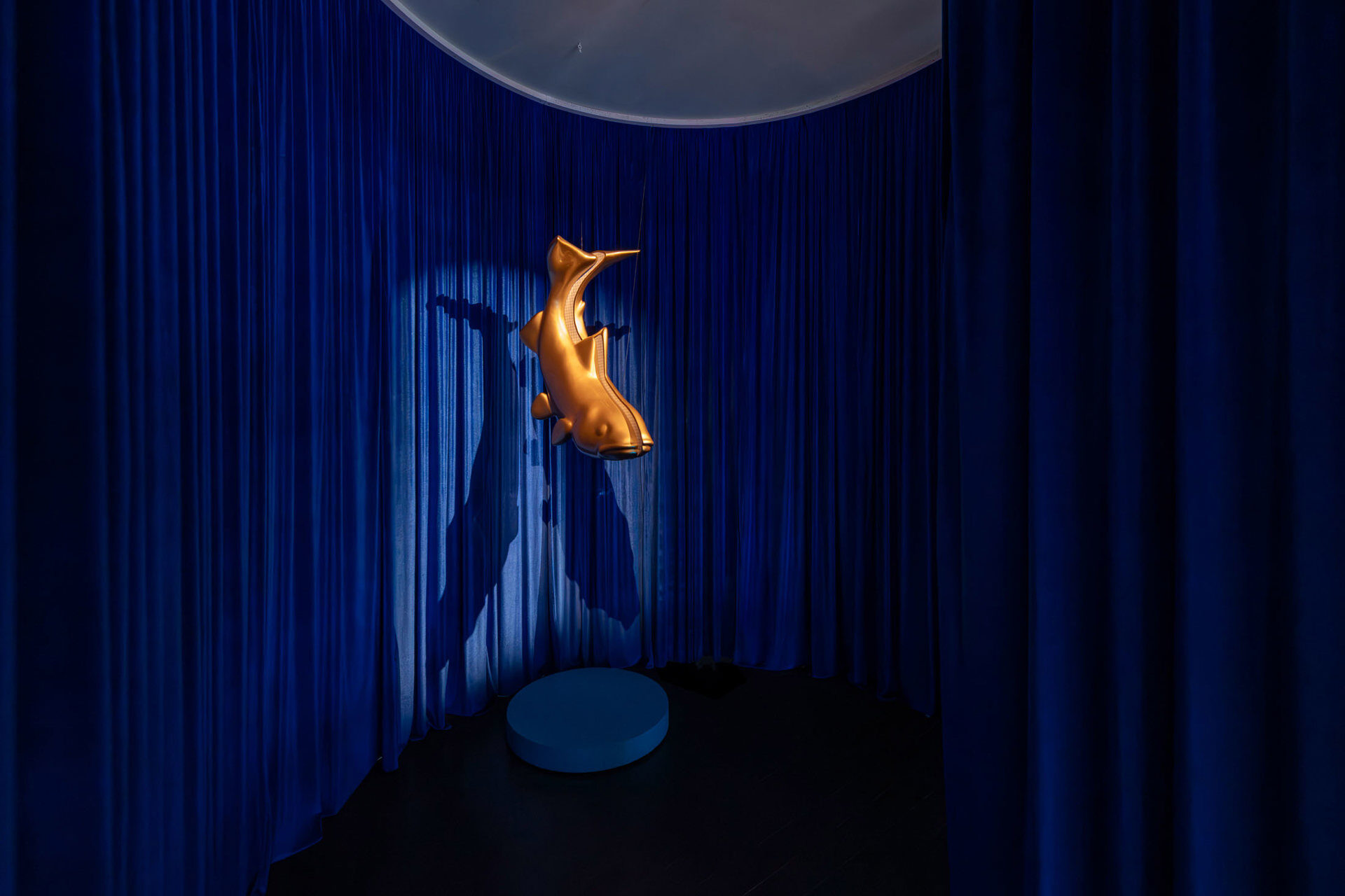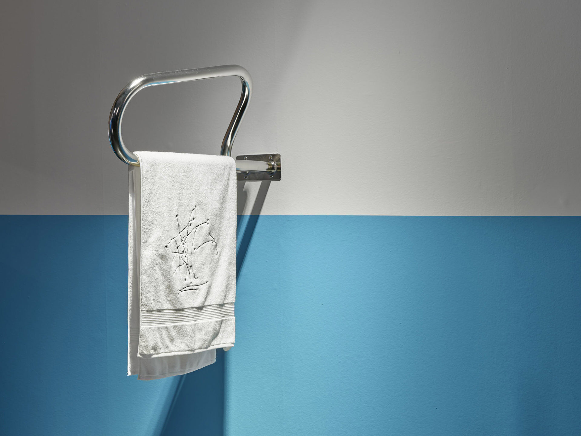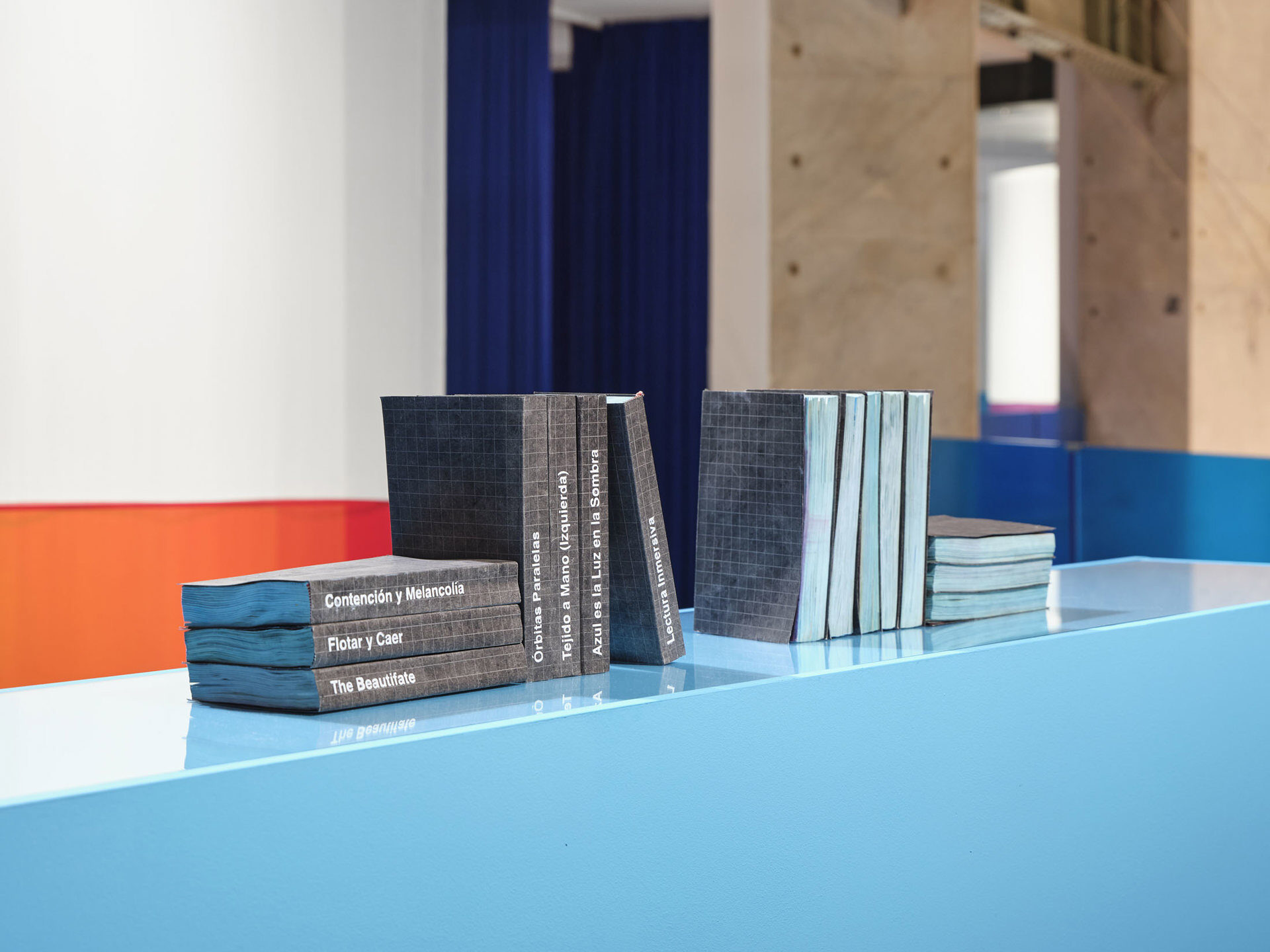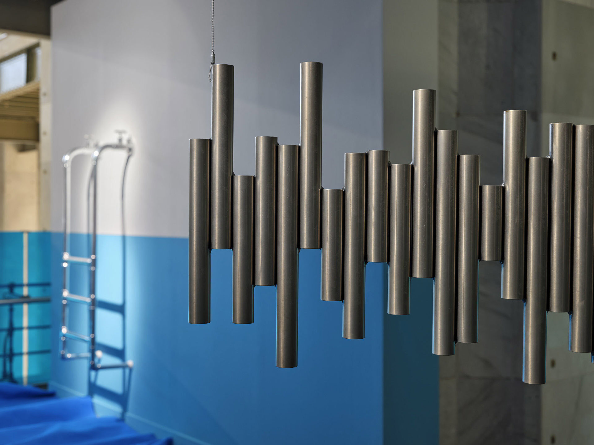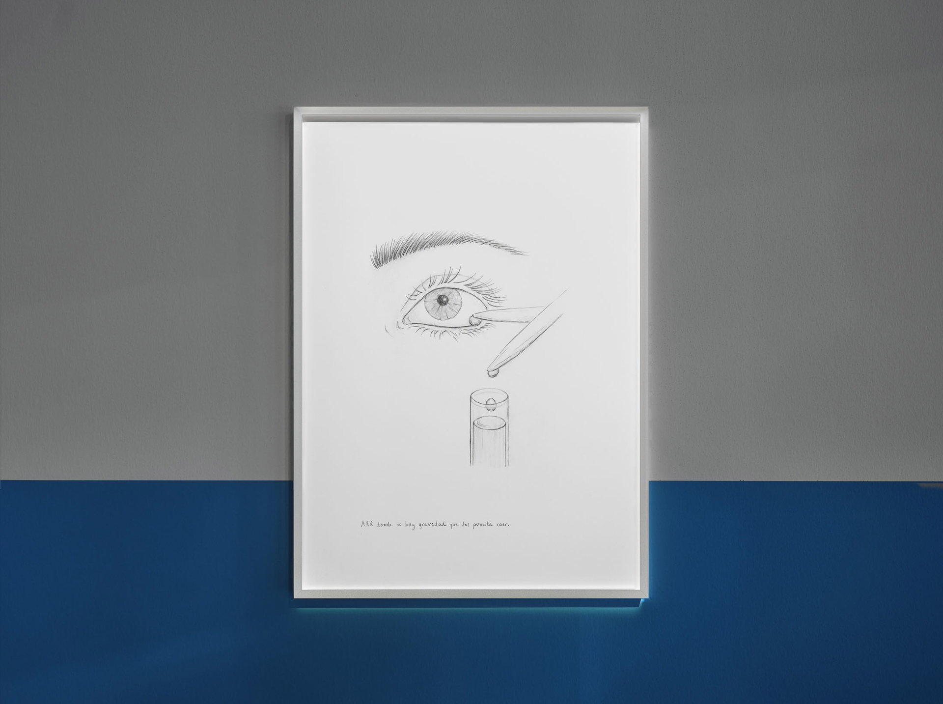 The exhibition explores dualities and repetition, using the unique architecture of the venue as a narrative device. A blue band at neck height runs throughout the entire floor, transforming the space into a metaphorical pool. This visual element connects all the rooms and recalls Lobera’s previous works on liminality and perception.