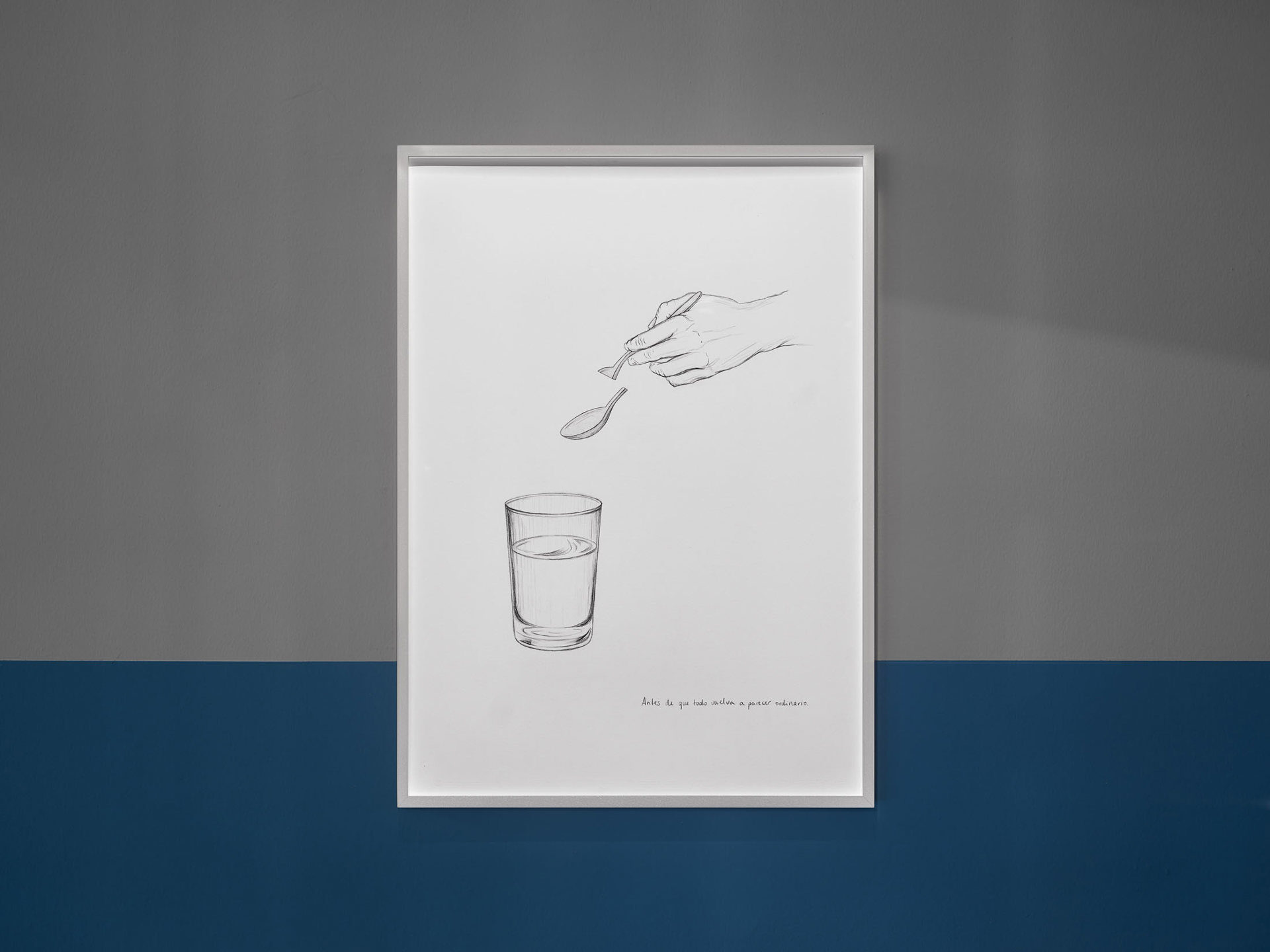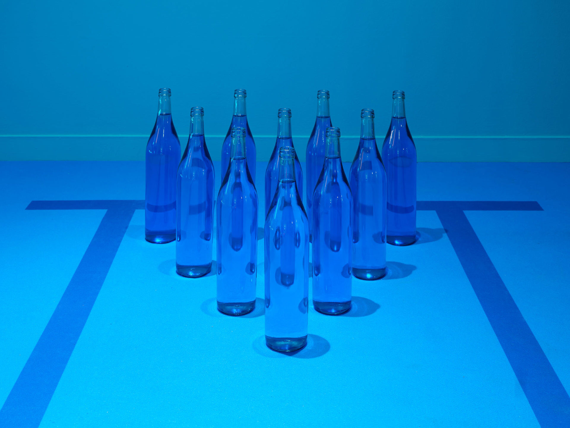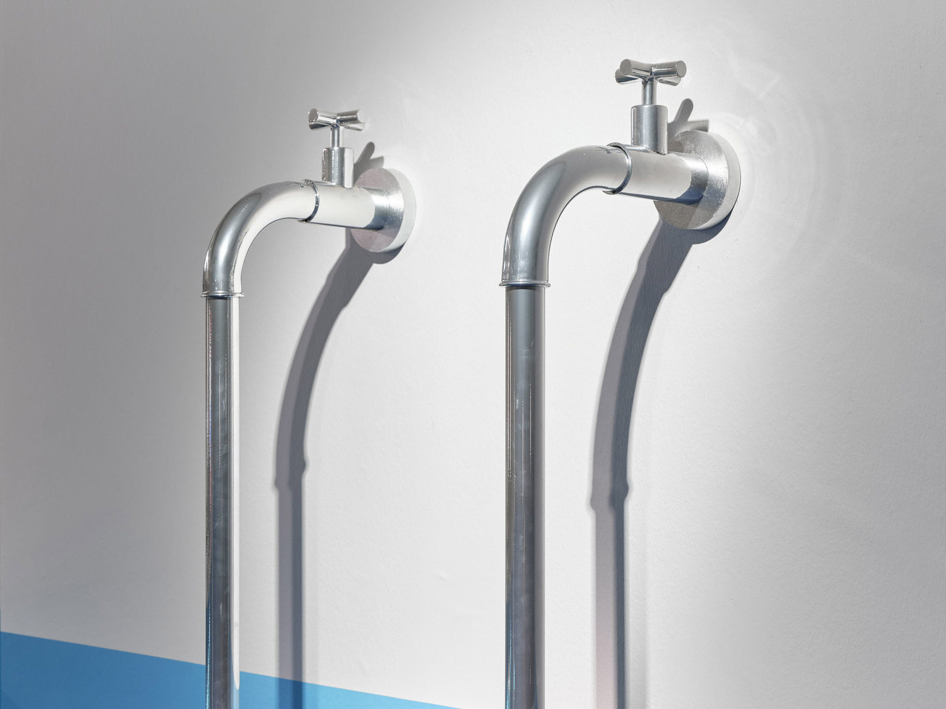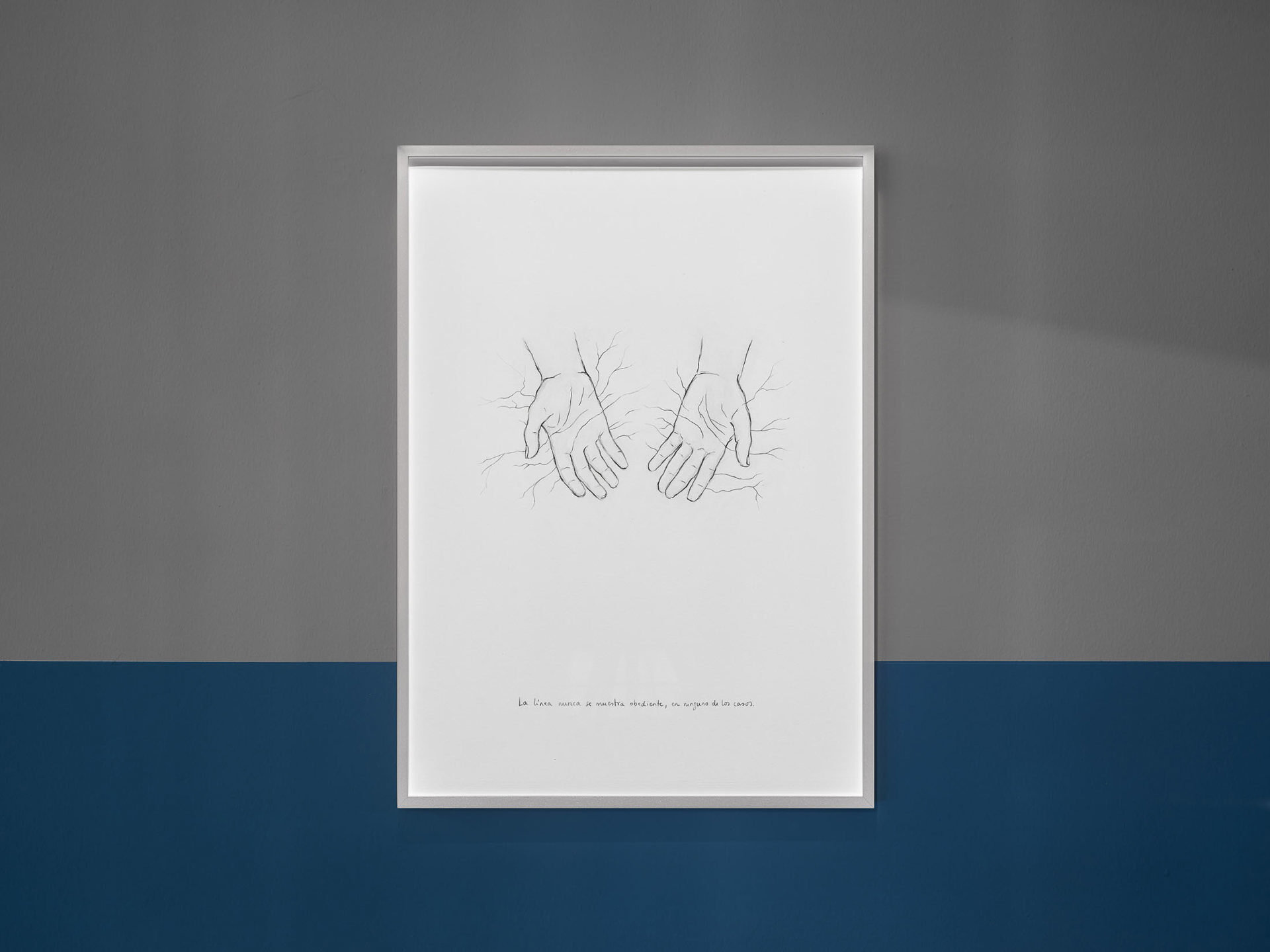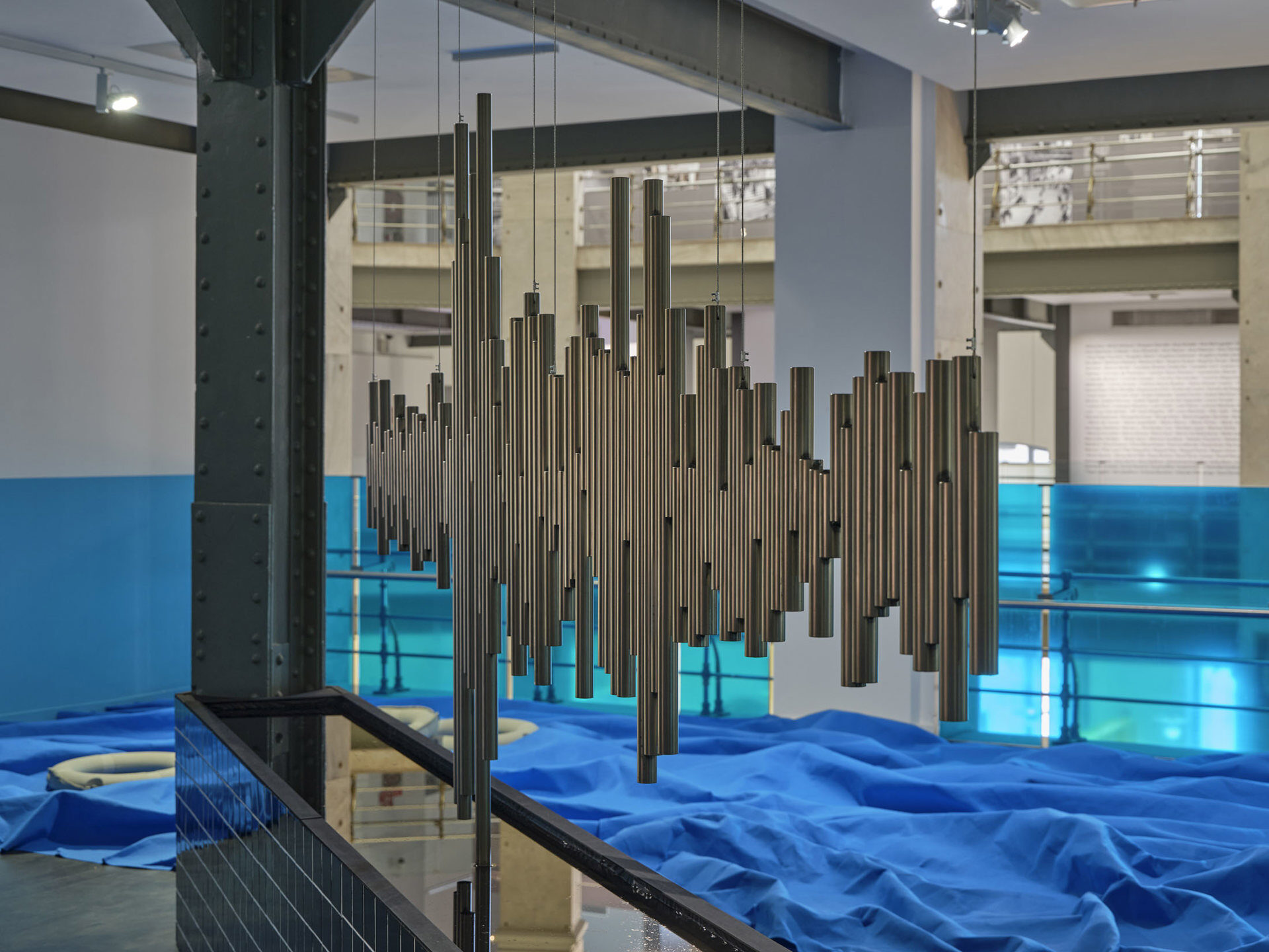 The exhibition explores dualities and repetition, using the unique architecture of the venue as a narrative device. A blue band at neck height runs throughout the entire floor, transforming the space into a metaphorical pool. This visual element connects all the rooms and recalls Lobera’s previous works on liminality and perception.