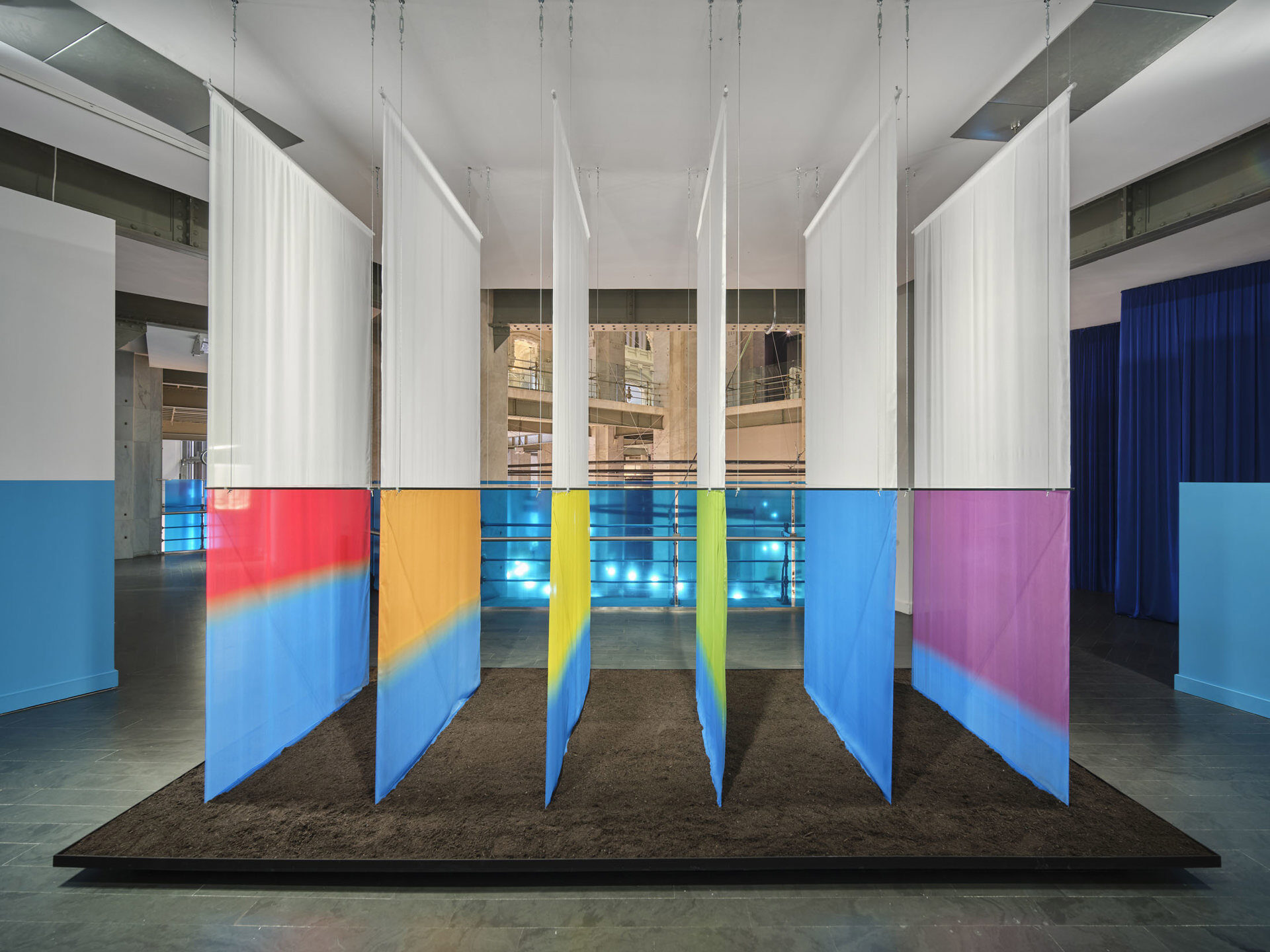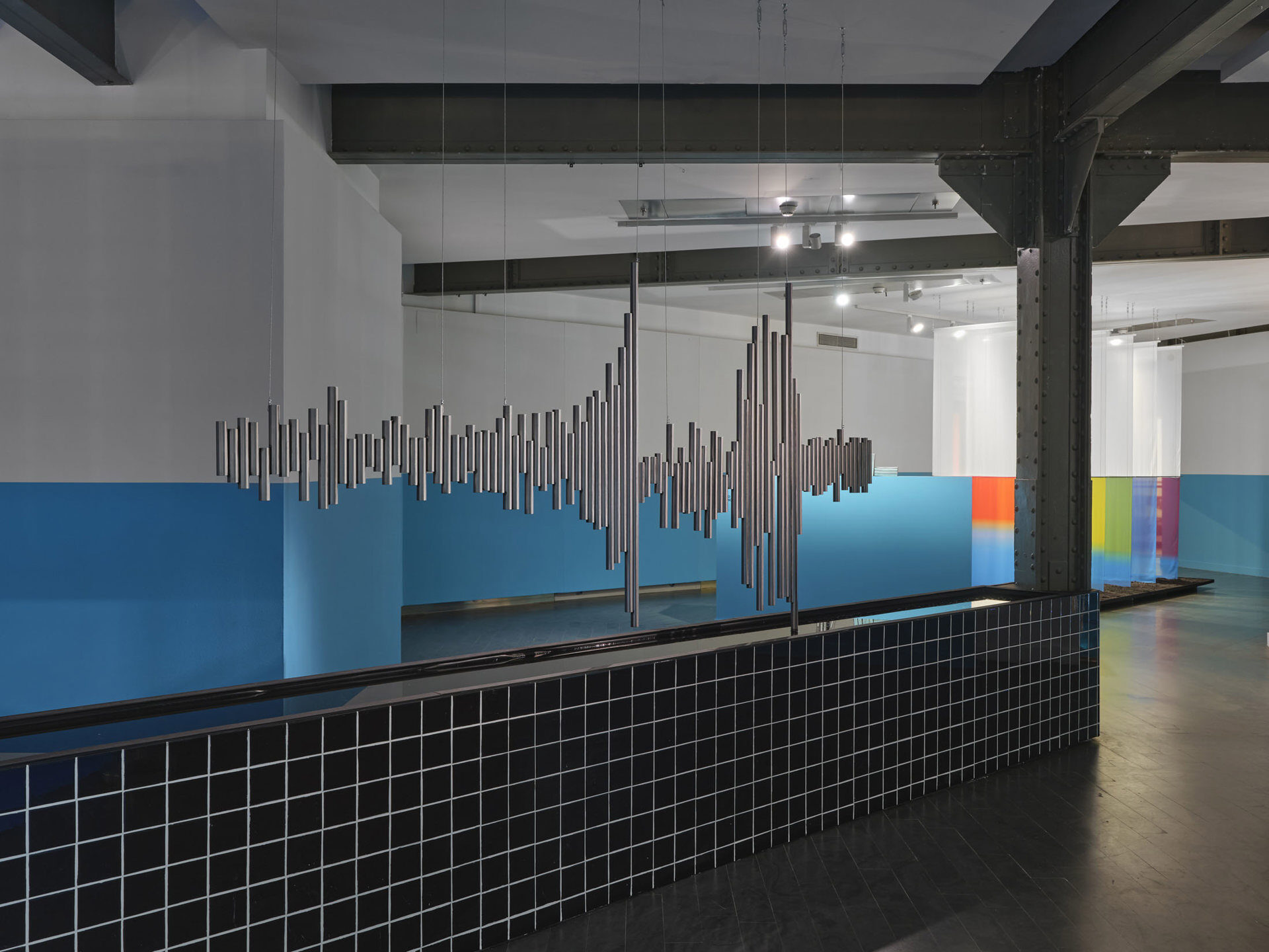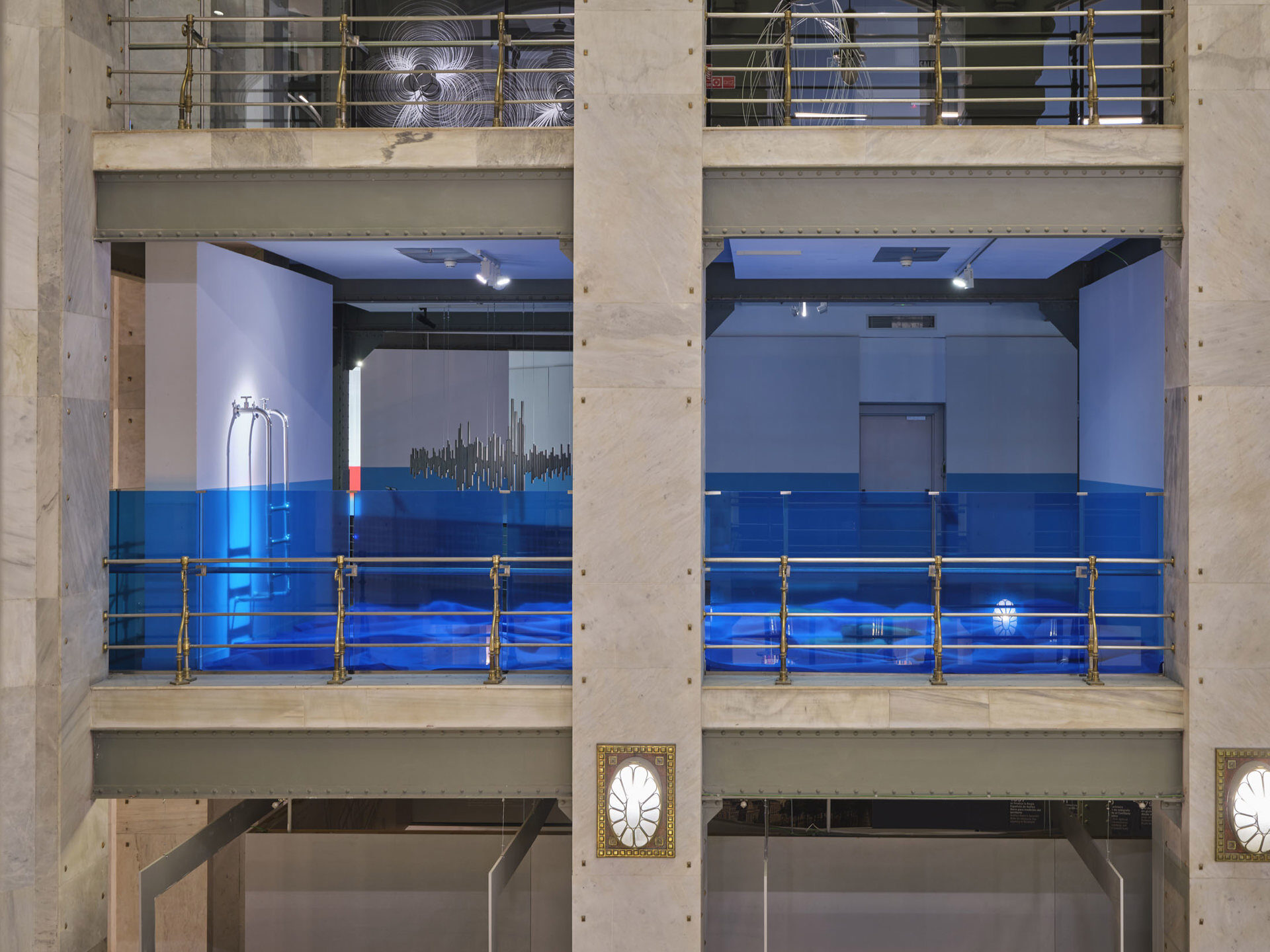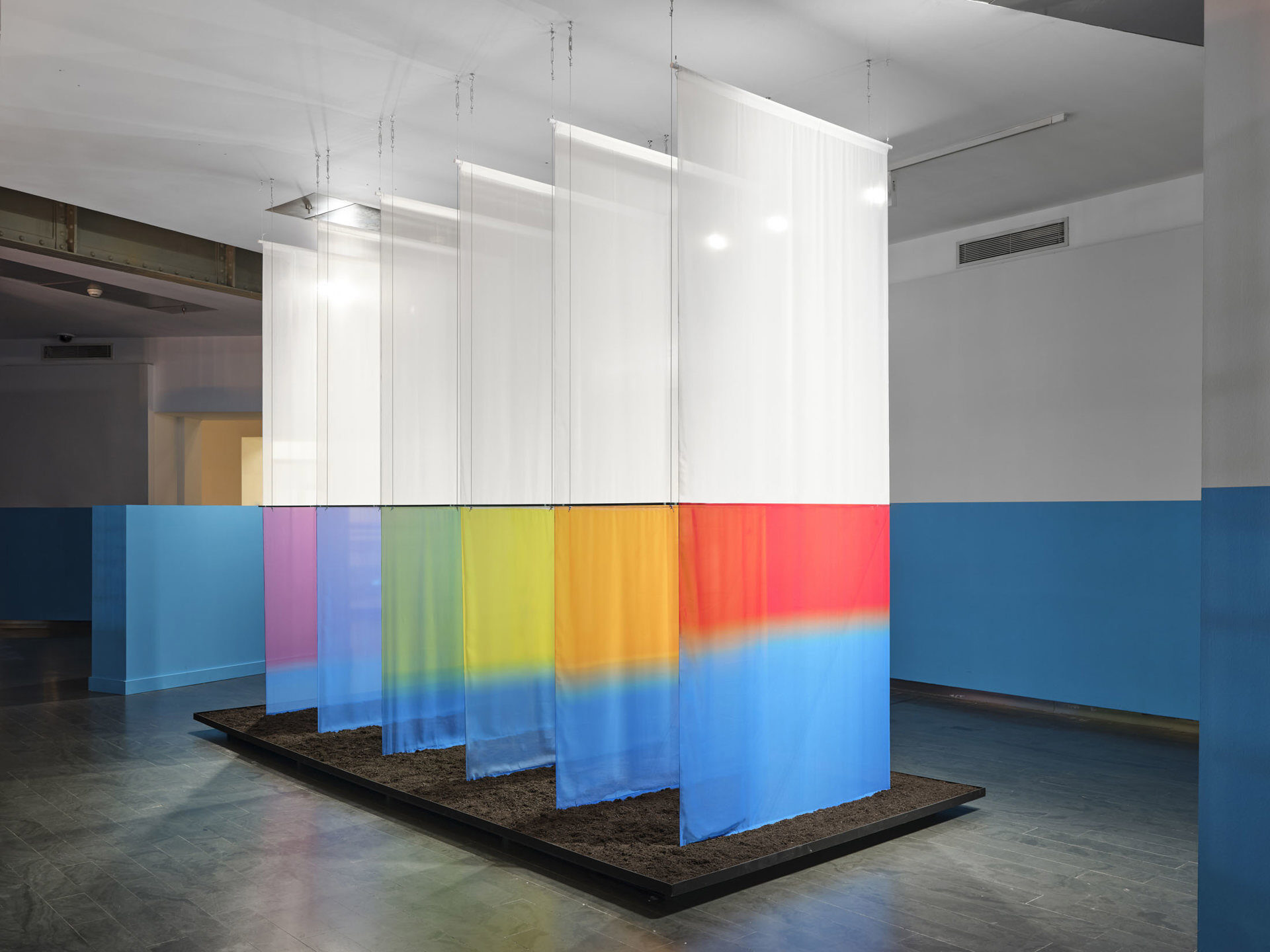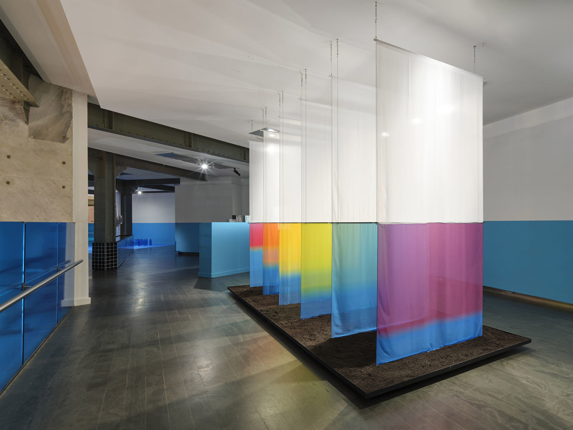 The exhibition explores dualities and repetition, using the unique architecture of the venue as a narrative device. A blue band at neck height runs throughout the entire floor, transforming the space into a metaphorical pool. This visual element connects all the rooms and recalls Lobera’s previous works on liminality and perception.