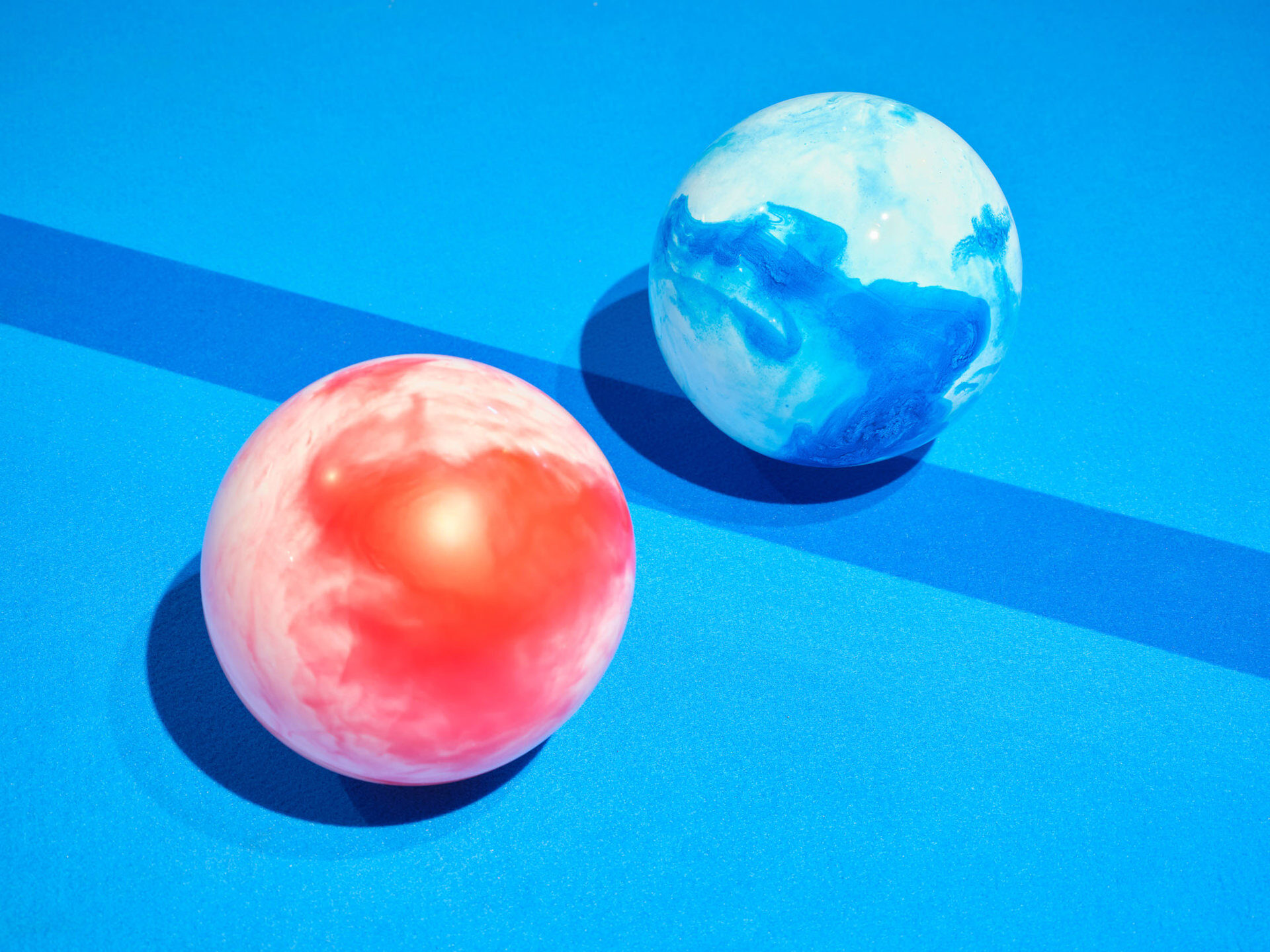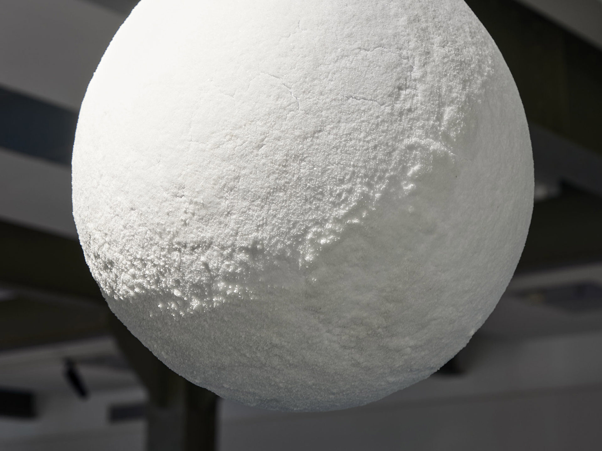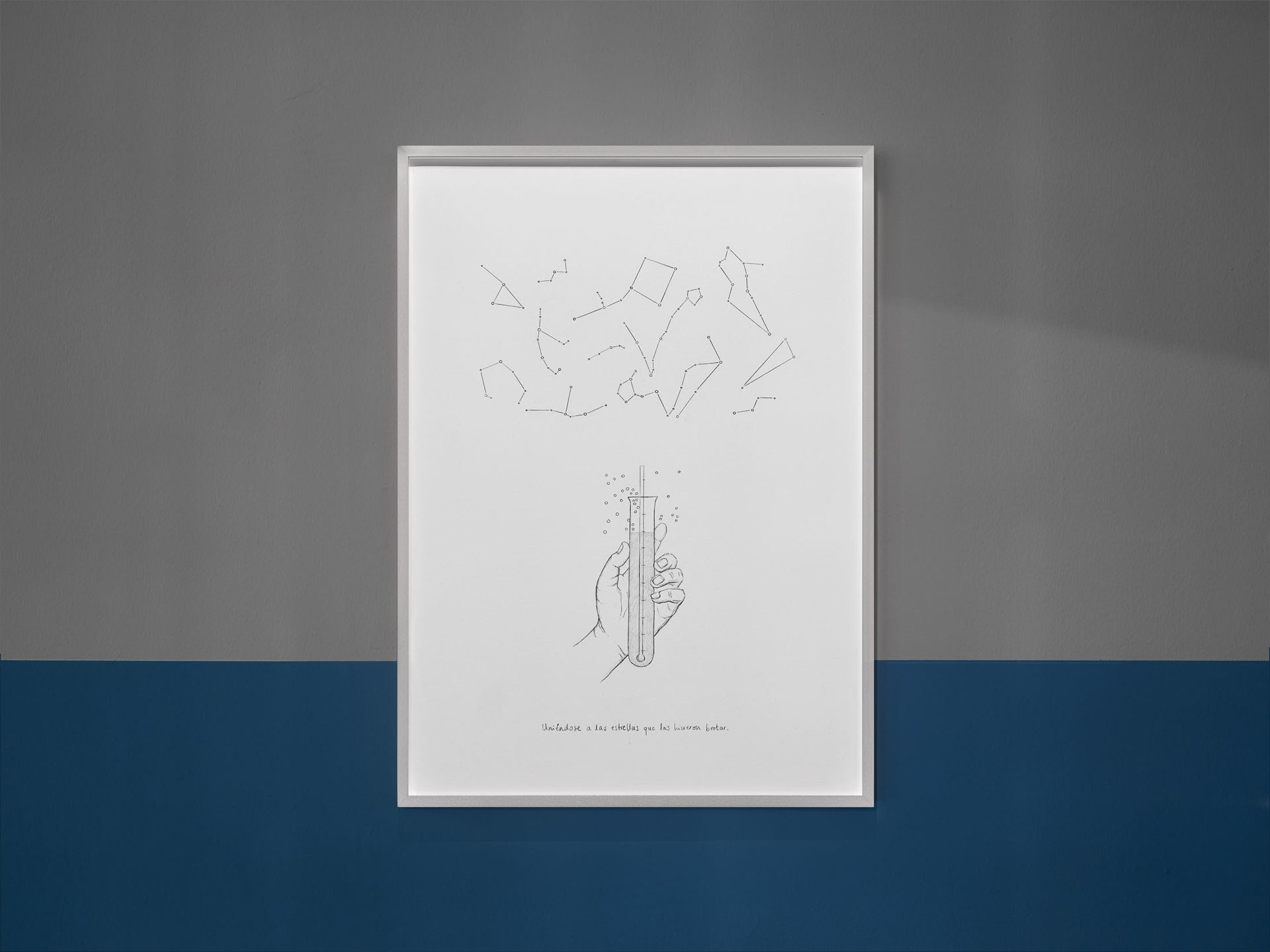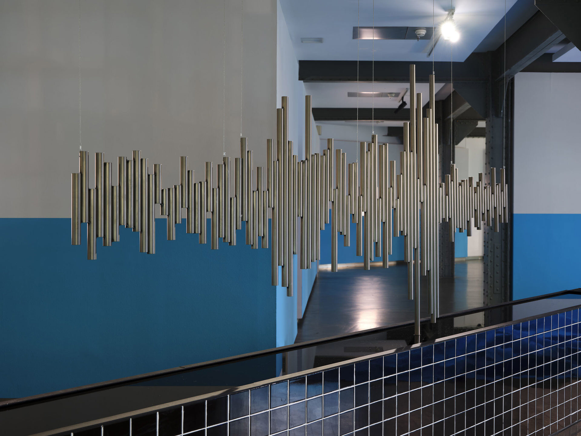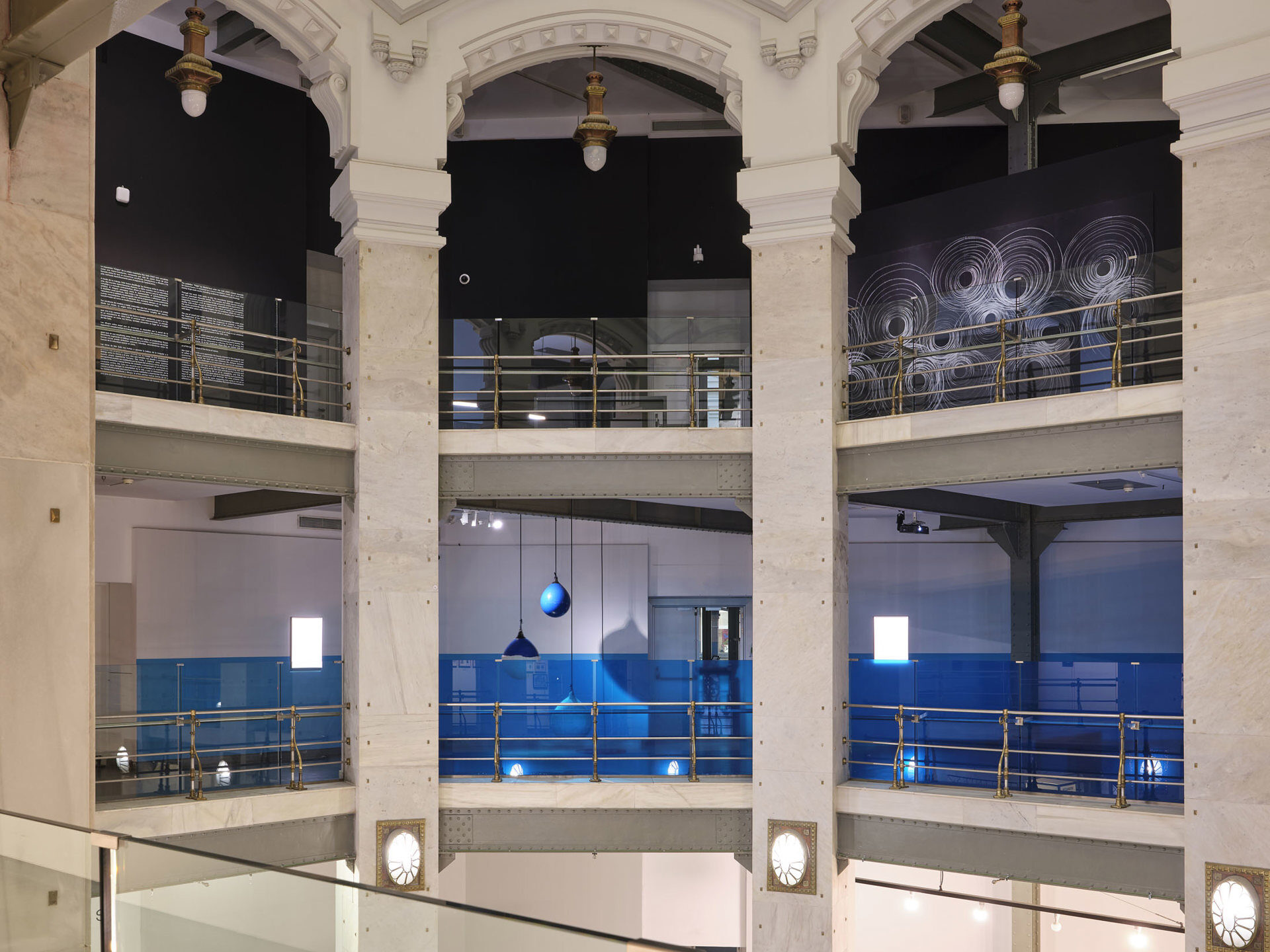 The exhibition explores dualities and repetition, using the unique architecture of the venue as a narrative device. A blue band at neck height runs throughout the entire floor, transforming the space into a metaphorical pool. This visual element connects all the rooms and recalls Lobera’s previous works on liminality and perception.