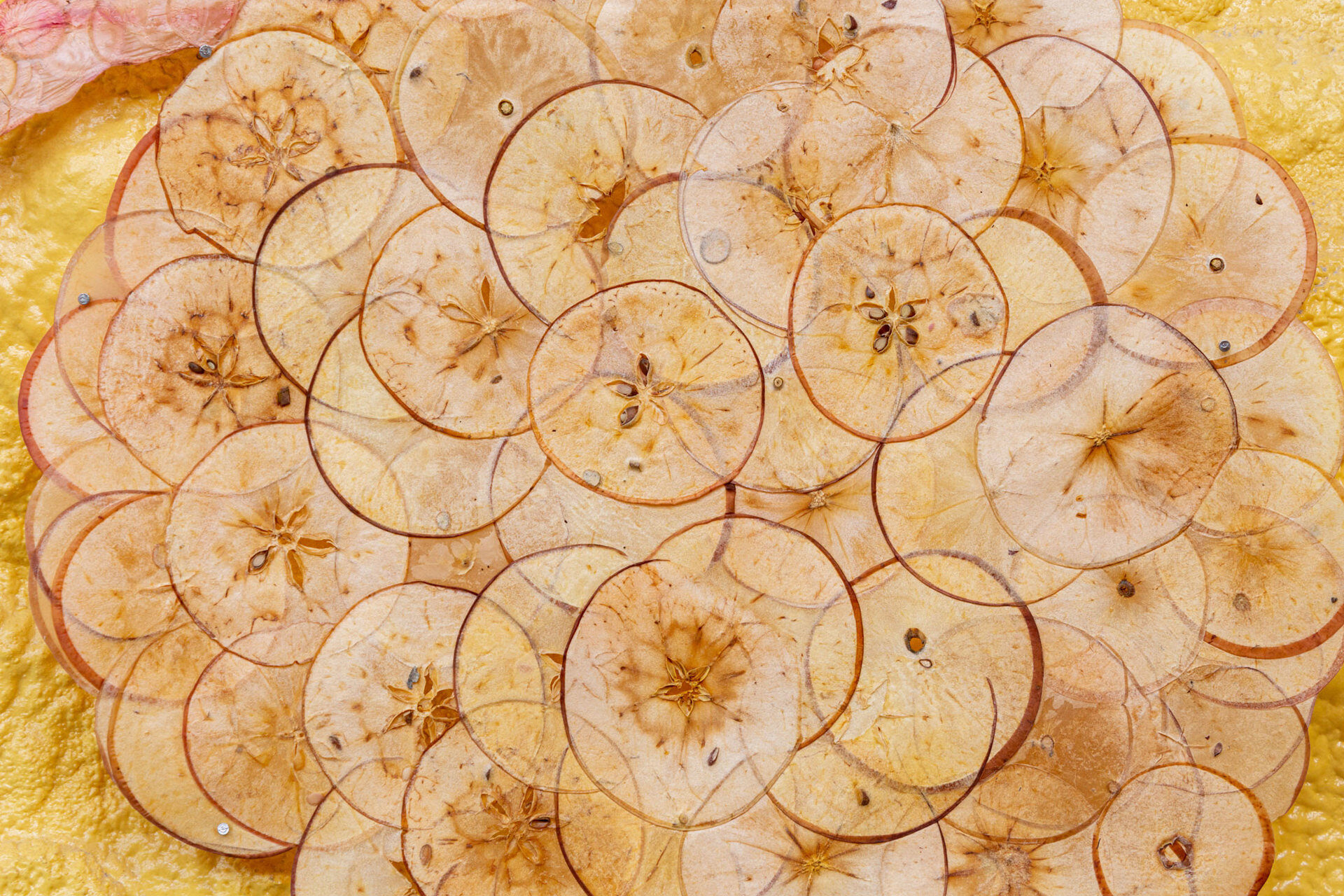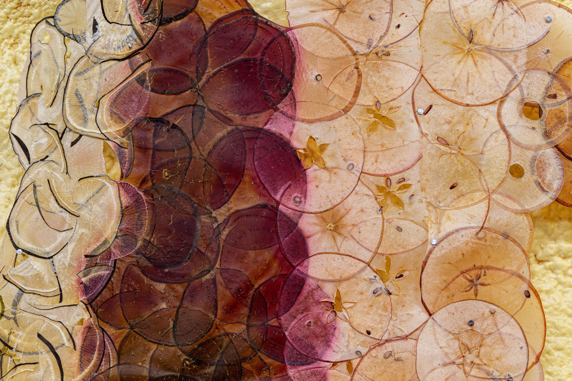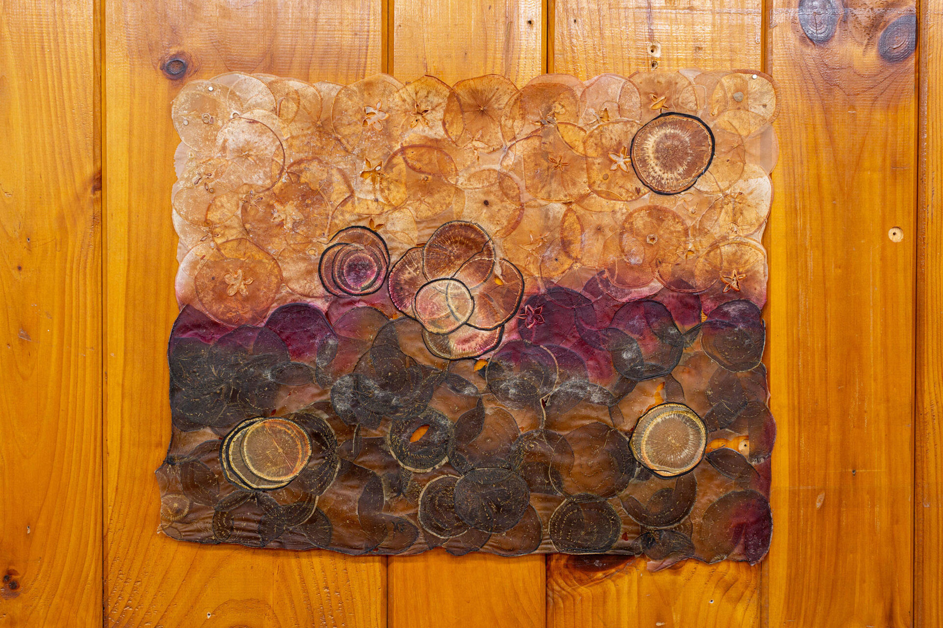 This piece is built from apples as well. Apples and many other crops. Its final form is what papermakers commonly refer to as papyrus. Papyrus is a paper-like material which is made by layering and pressing organic matter together until it fuses in partnership. It is bound by sharing its sugars and natural moisture.