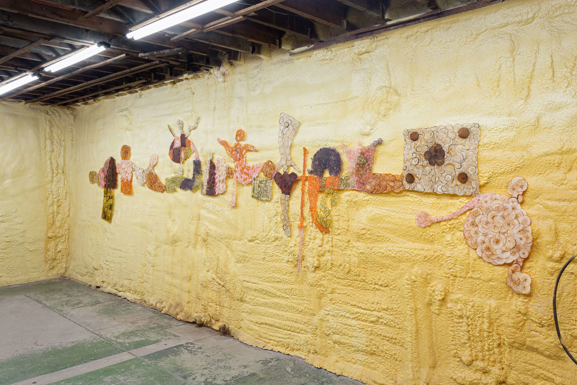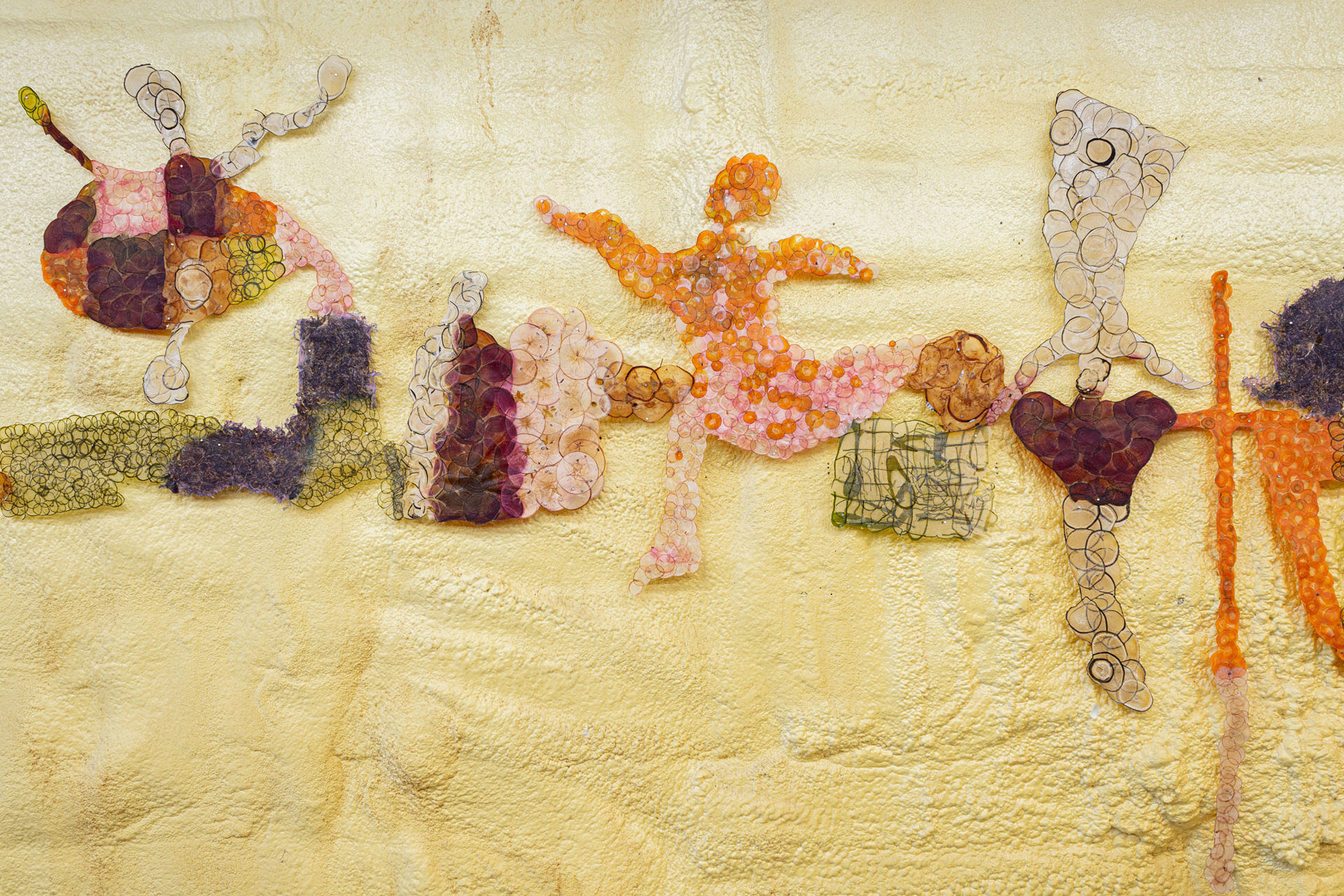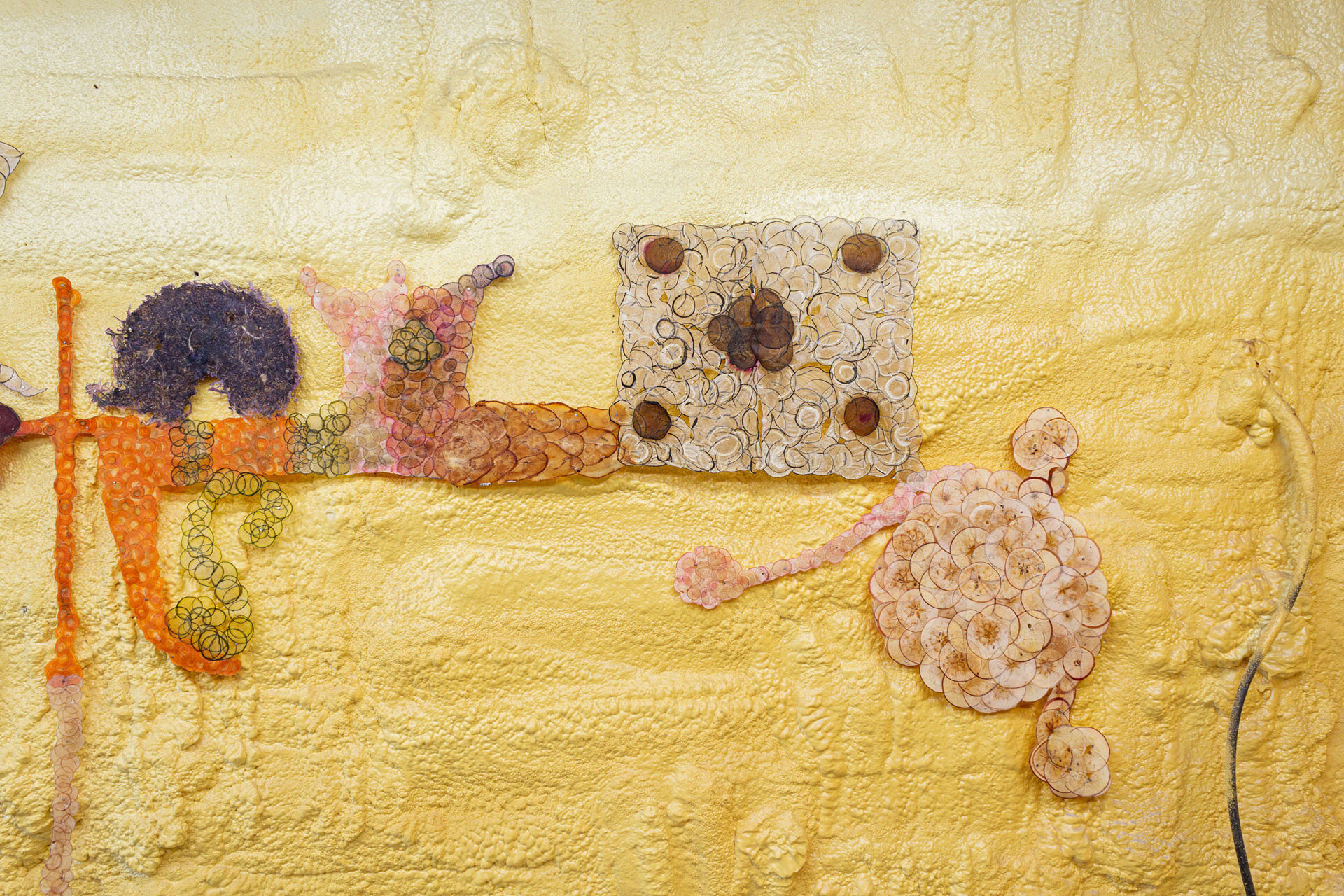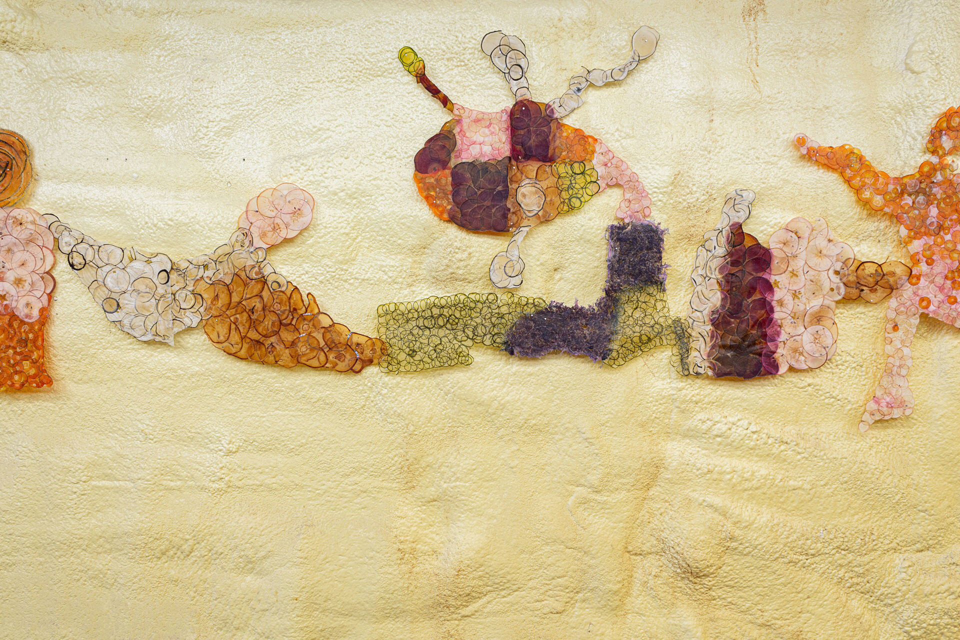 Rather than a substrate for ink, this papyrus serves as its own inscription. A medley of attened rounds rendered into lines and silhouettes. It’s a work of overlapping circles and stolen shapes from a Long Island antique store – a drawing, a memory spell, a bear covered in apples.