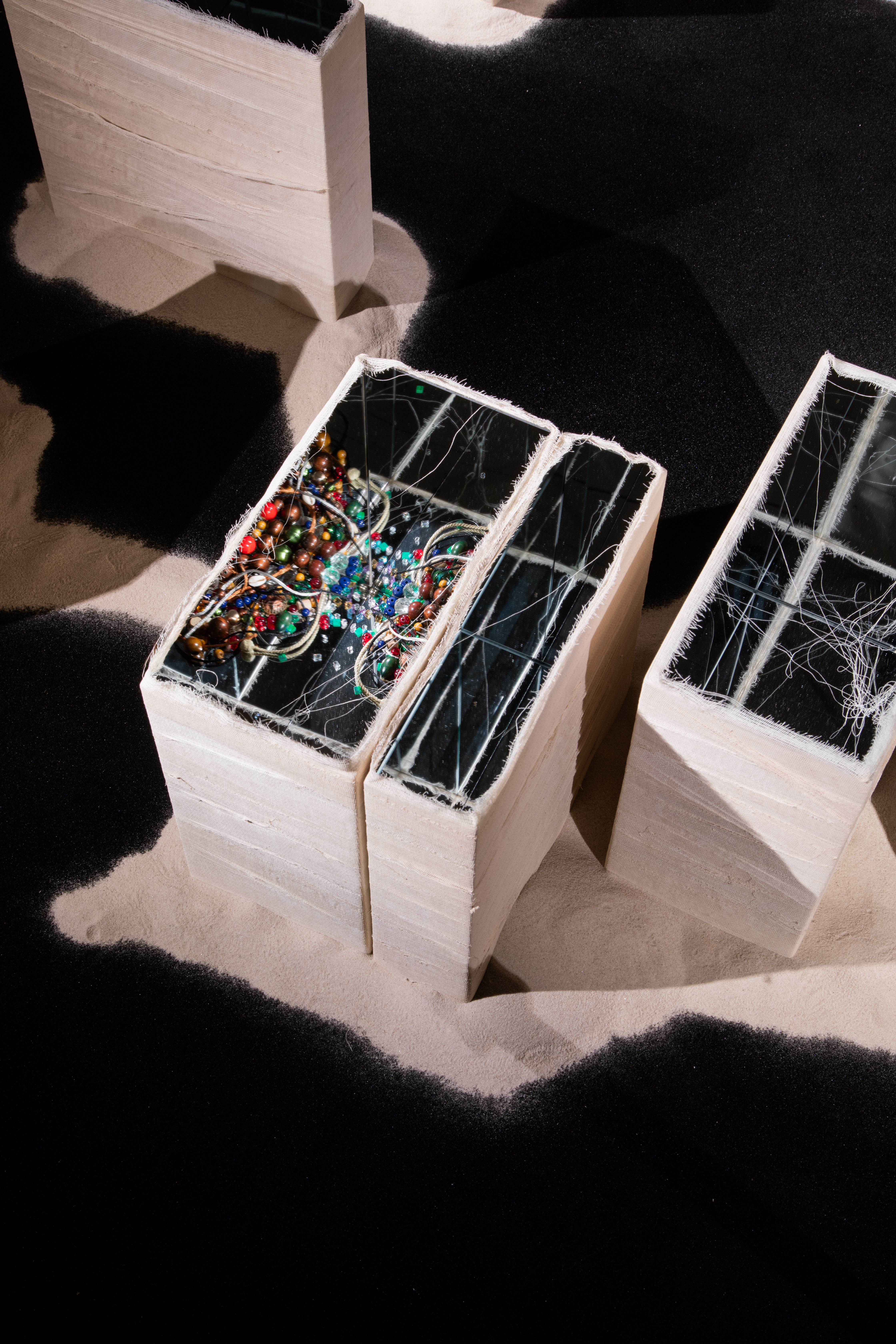 Contained within these mirrored boxes are objects ranging from dust to precious gems, playful elements such as beads, alongside everyday items like cutlery and burnt matches. This eclectic mix summons a kaleidoscope of ephemeral memories, which shift and transform with the viewer's movement. As one navigates through the installation, the reflections and the objects within engage in a dance of perpetual change, inviting…