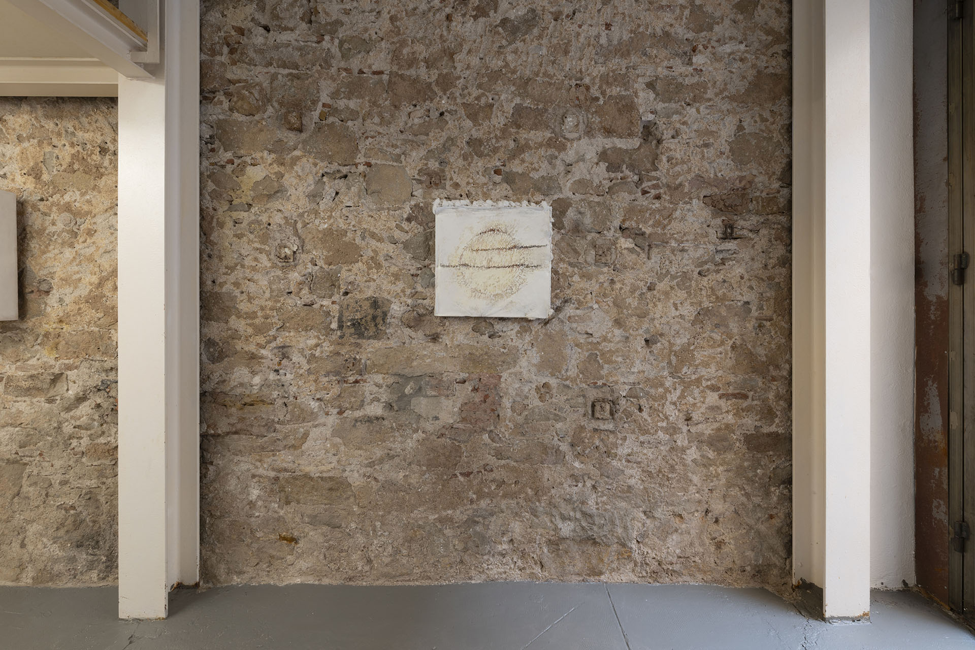 In the first room, with one work extending out into the entrance way, there are three painted sunsets. The artist is interested in the sunset because of how ubiquitous and generic images of them are, relaying beauty and peace which tend to feel deep and one’s own when experienced. In the exhibition, they’re meant to be welcoming and comforting. Sunset is also the time of lowest cortisol of the day and low cortisol = low anxiety. Two of them are painted on acoustic diffusers. Berdugo is interested in sound because of its acute responsiveness to spatial conditions…