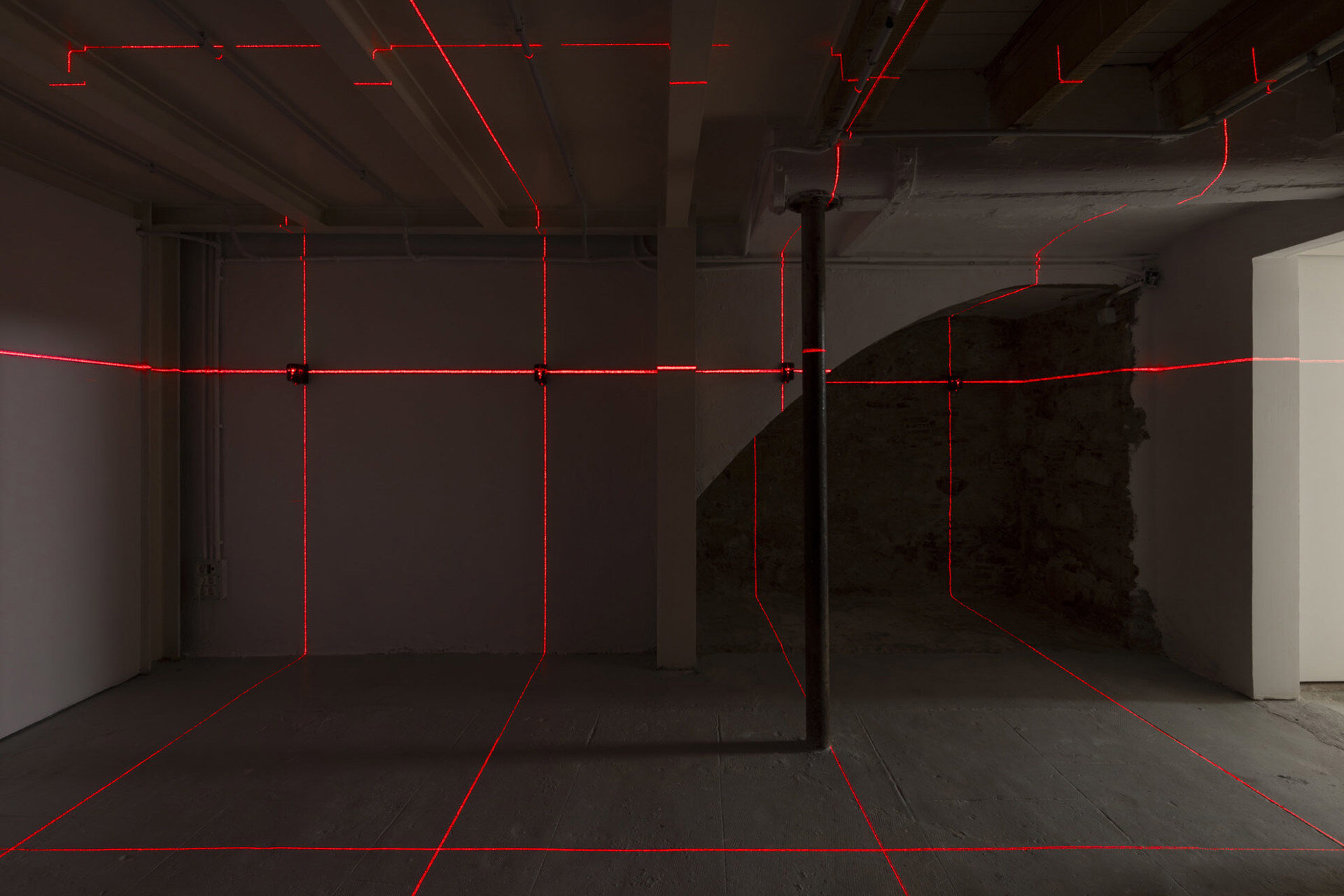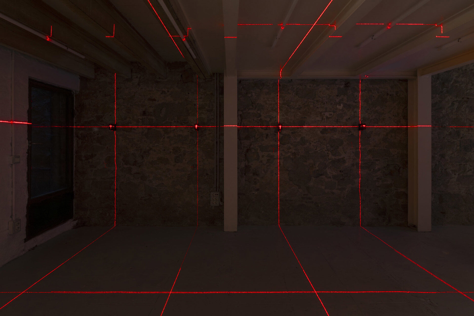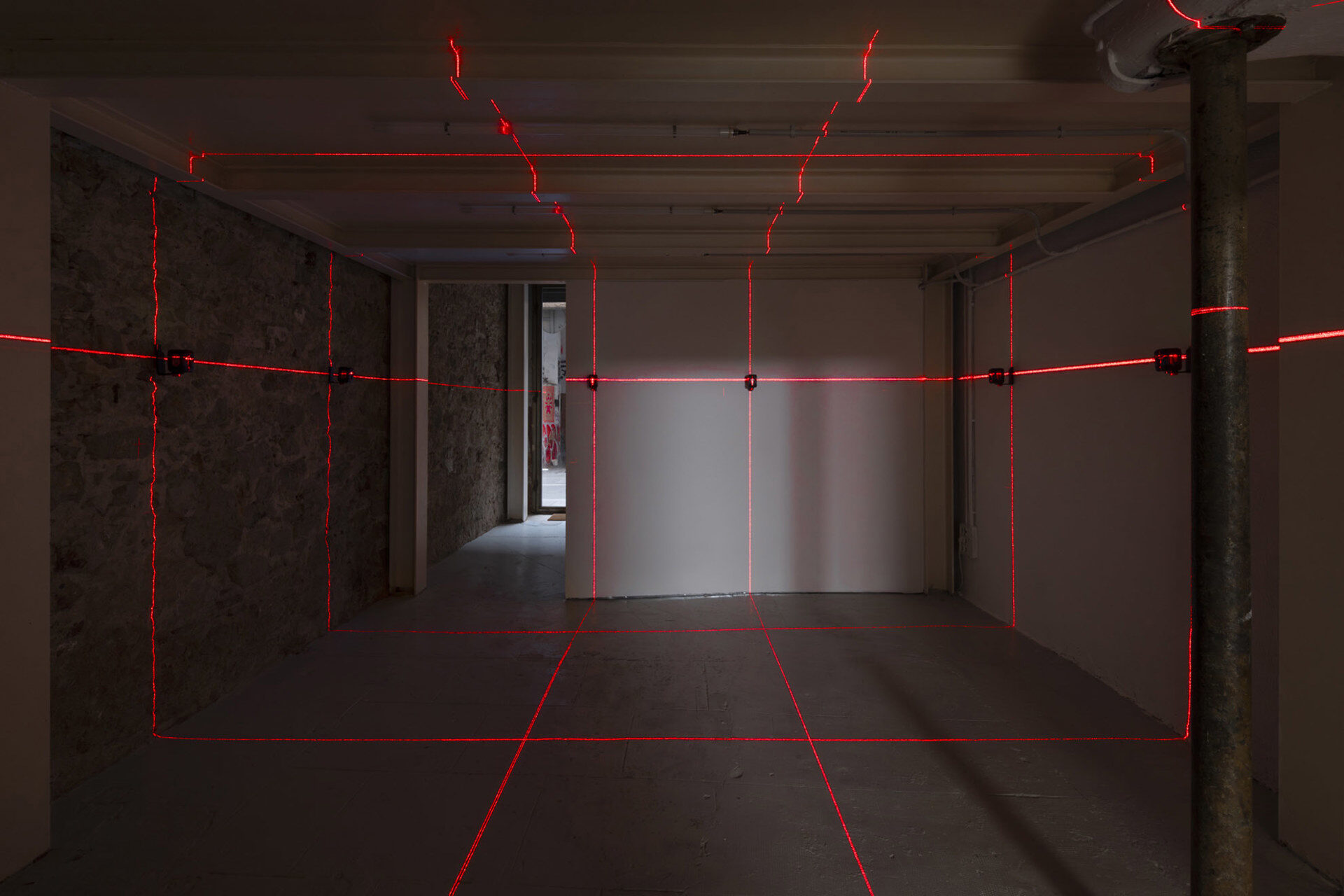 Following on, Oj□ Rojo LEVEL LEVEL, is positioned in the first main exhibition space, a light installation consisting of twelve laser levels installed in a horizontal line roughly aligned to the height of the artist’s heart and positioned vertically with one another to create a grid. These particular lasers are used in construction to secure consistent straight lines, but the technology has its origins in military use and for the…