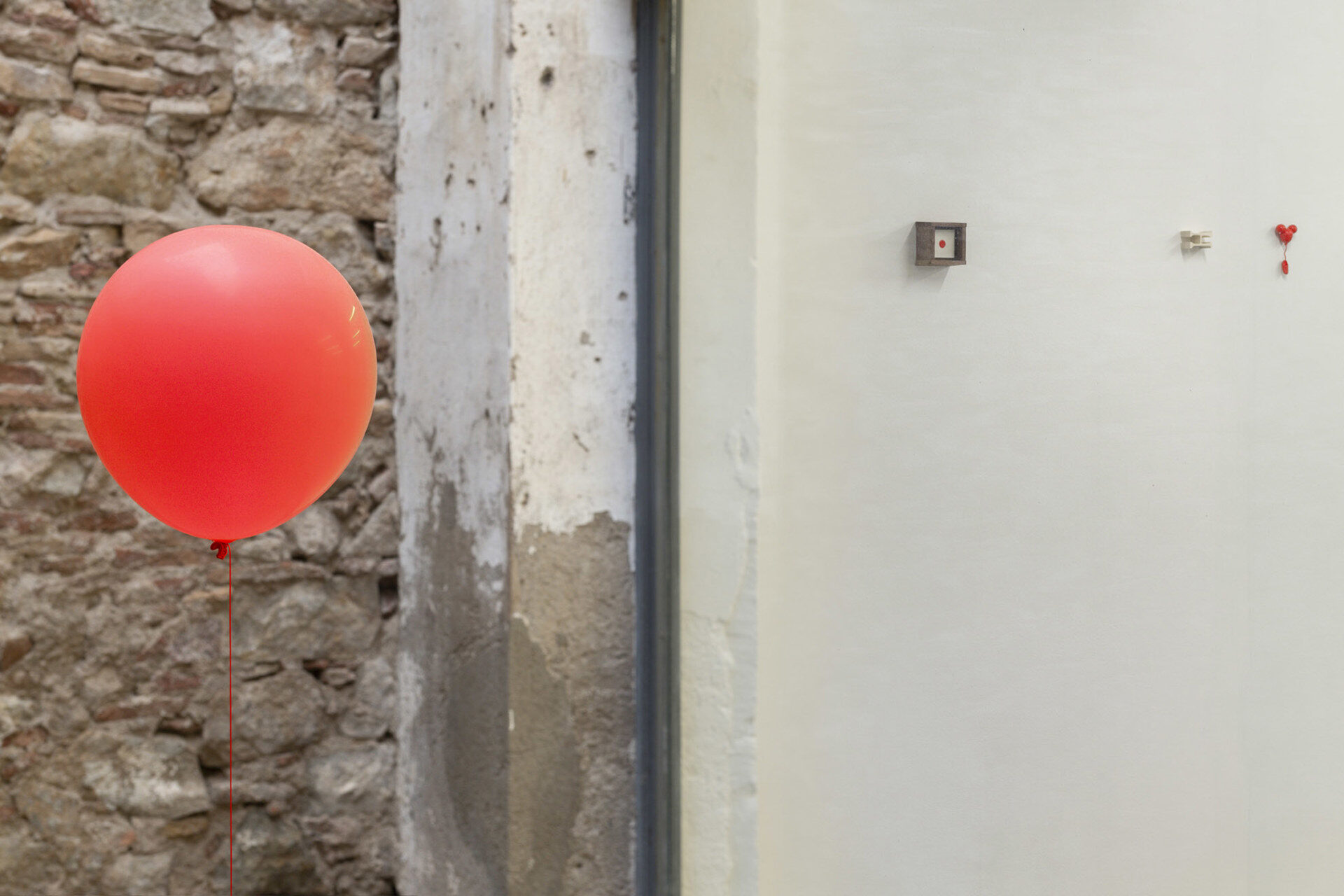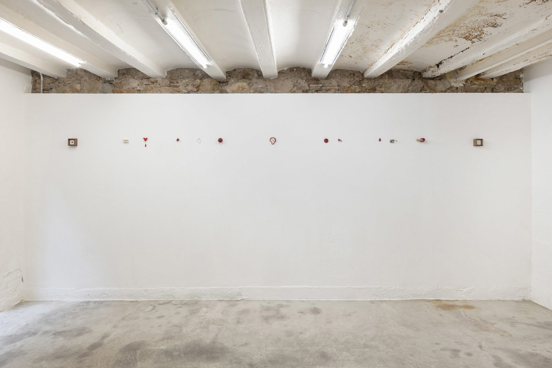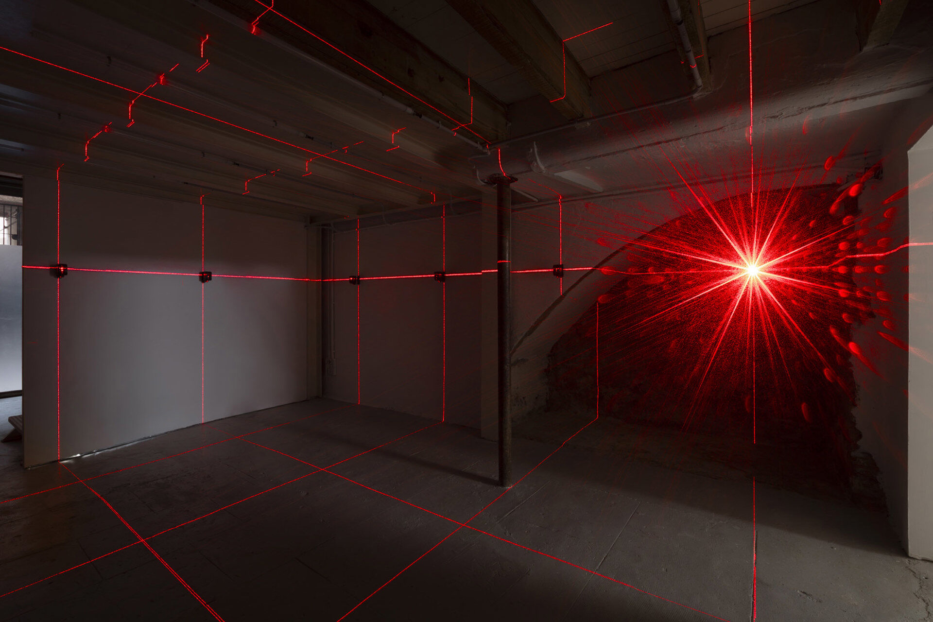 Following on, Oj□ Rojo LEVEL LEVEL, is positioned in the first main exhibition space, a light installation consisting of twelve laser levels installed in a horizontal line roughly aligned to the height of the artist’s heart and positioned vertically with one another to create a grid. These particular lasers are used in construction to secure consistent straight lines, but the technology has its origins in military use and for the…