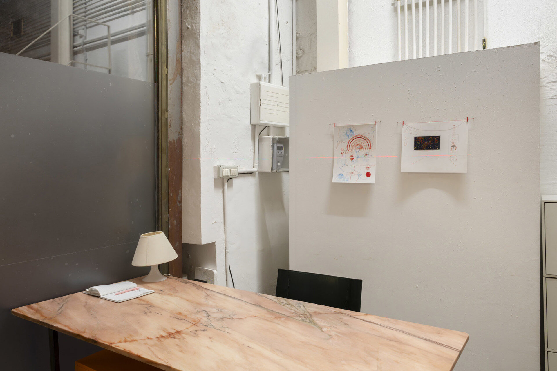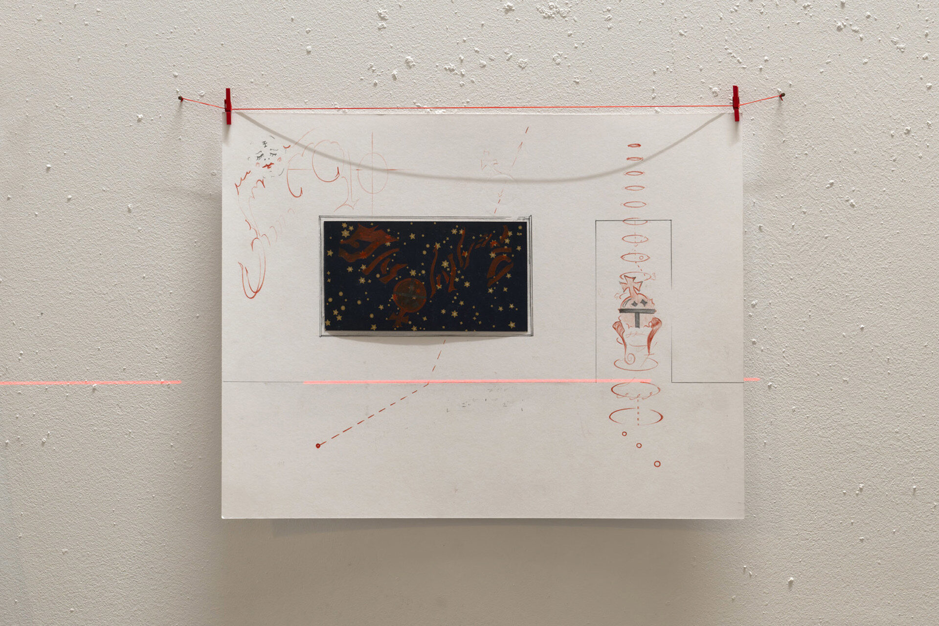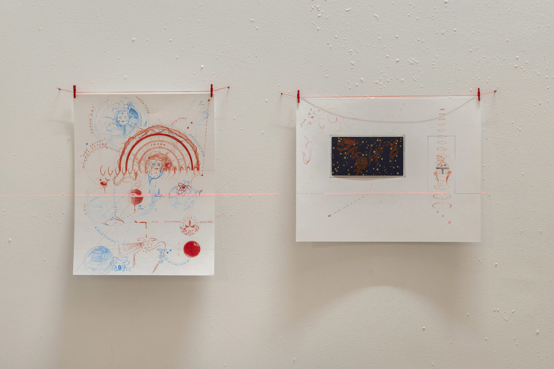 LEVEL LEVEL is a solo exhibition by Harry Gould Harvey IV developed in response to the spatial configuration of the gallery. It begins with two drawings – a central tenet of Harvey’s practice – displayed behind the reception desk. These works on paper, entitled ShⒶdows B444 Babylon and W/h/Ⓔ/n D\r\e\a\m\i\n\g, were produced as part of a larger series in the lead up to the opening, and for the artist set the tone for the rest of the exhibition. Their imagery, language and symbolism can be used as a viewfinder through which to look at the rest of the show.