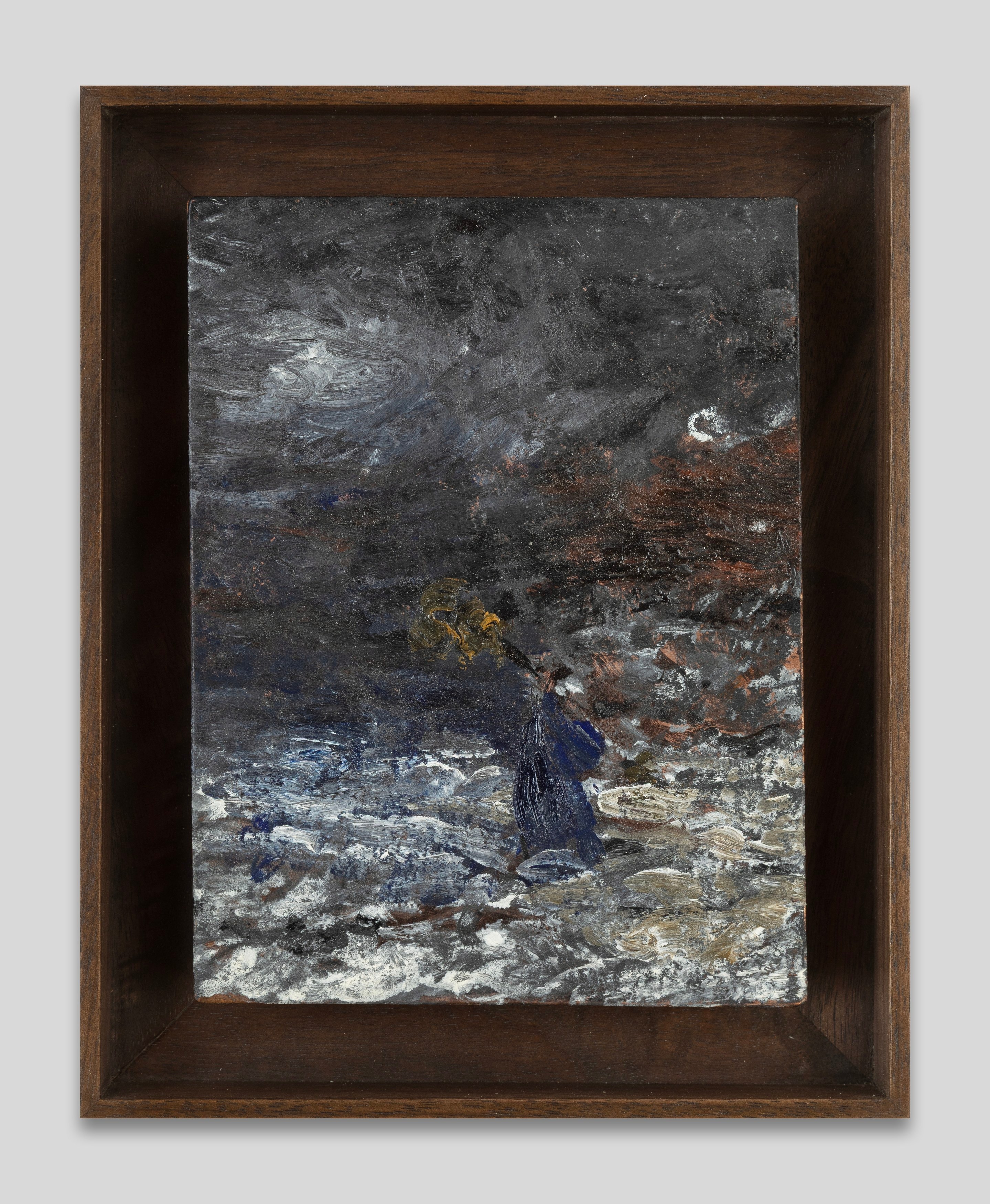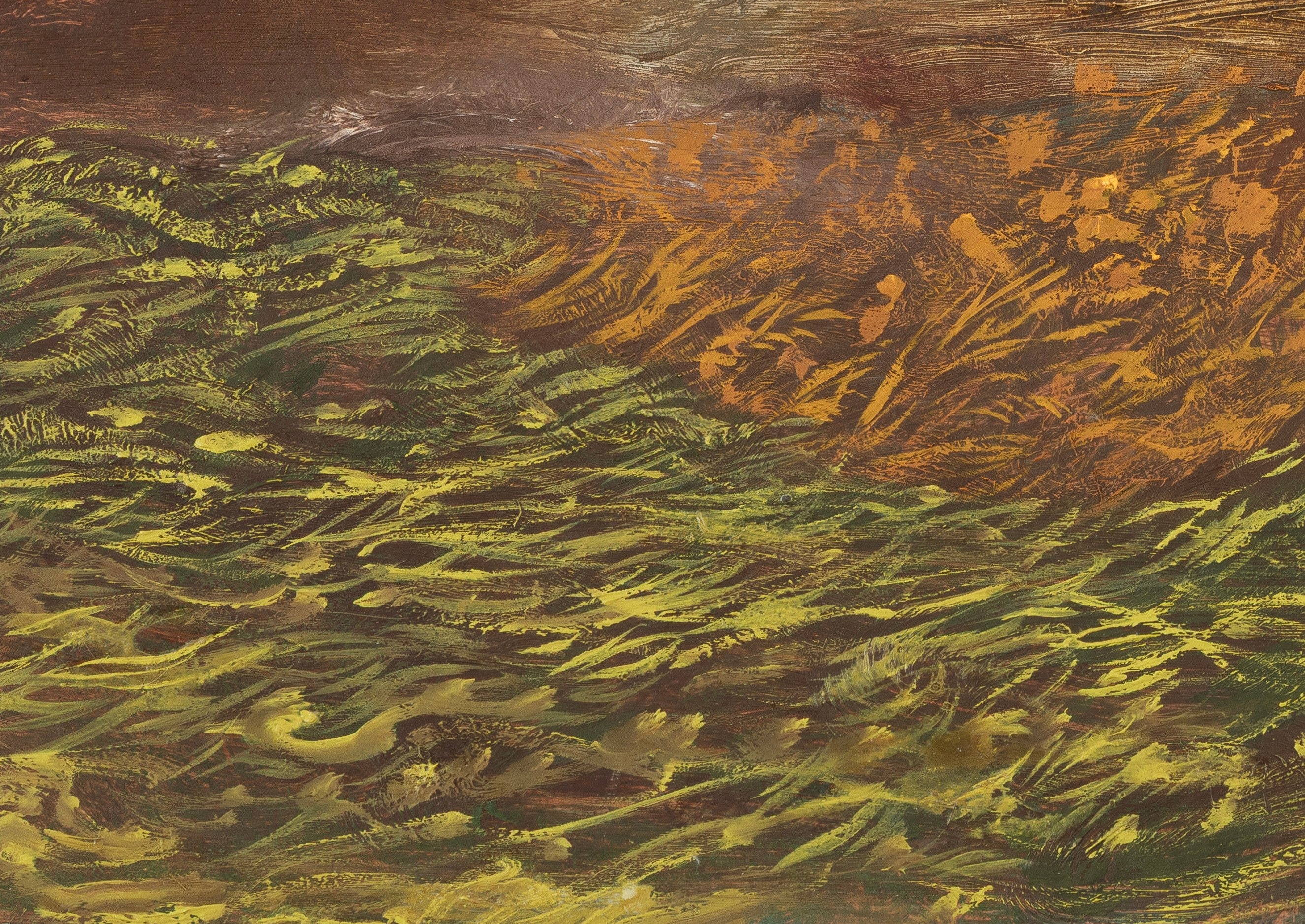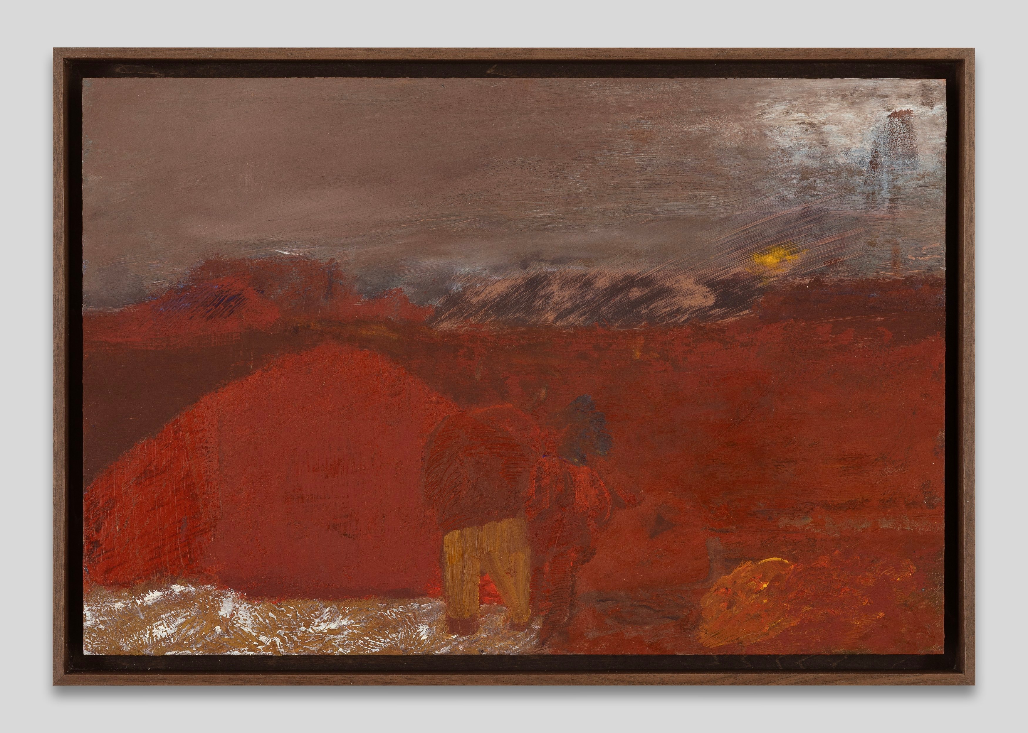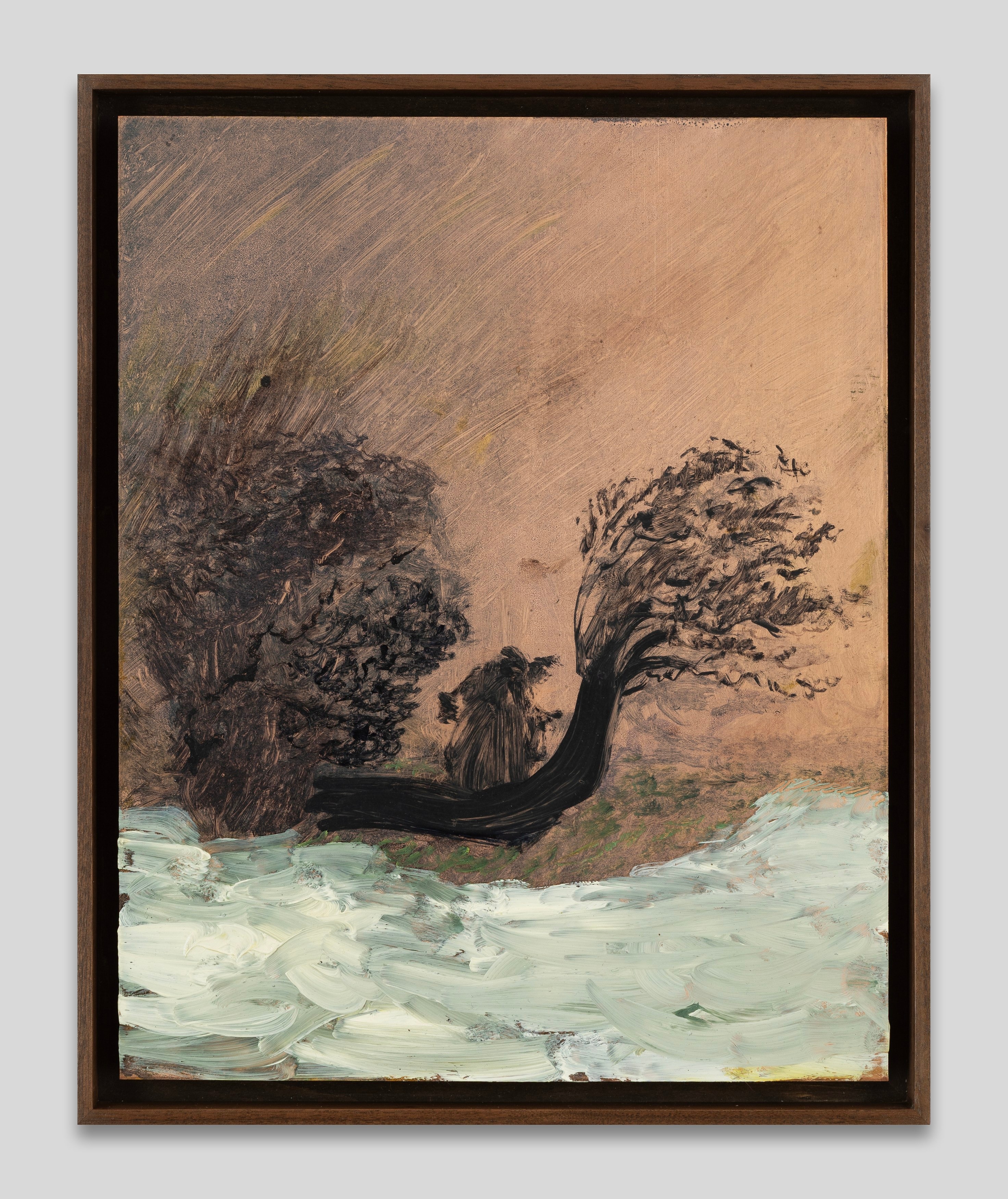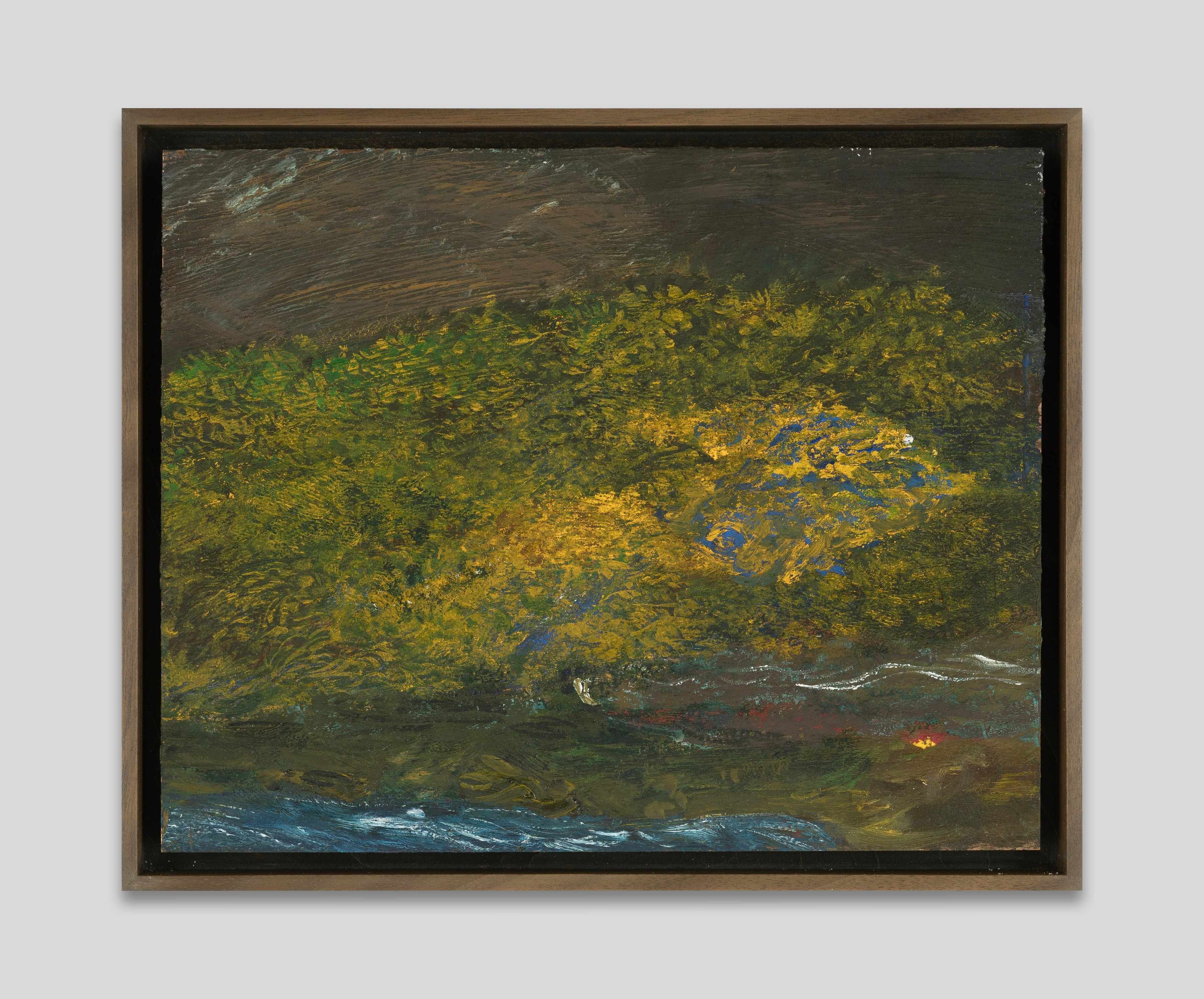 Brett Goodroad moved to San Francisco to study art. After graduating, he drove large trucks for a company that hauled organic produce across the American Southwest—from the Pacific coast to New Mexico and back. He’d leave on Saturday around midnight, and drive for five days with relatively little rest before returning home, his bones still rattling in his frame. The open road informed his painting: his landscapes, like the views through the front windshield, were indeterminate and headlong. He painted in his backyard, which was generally overgrown.