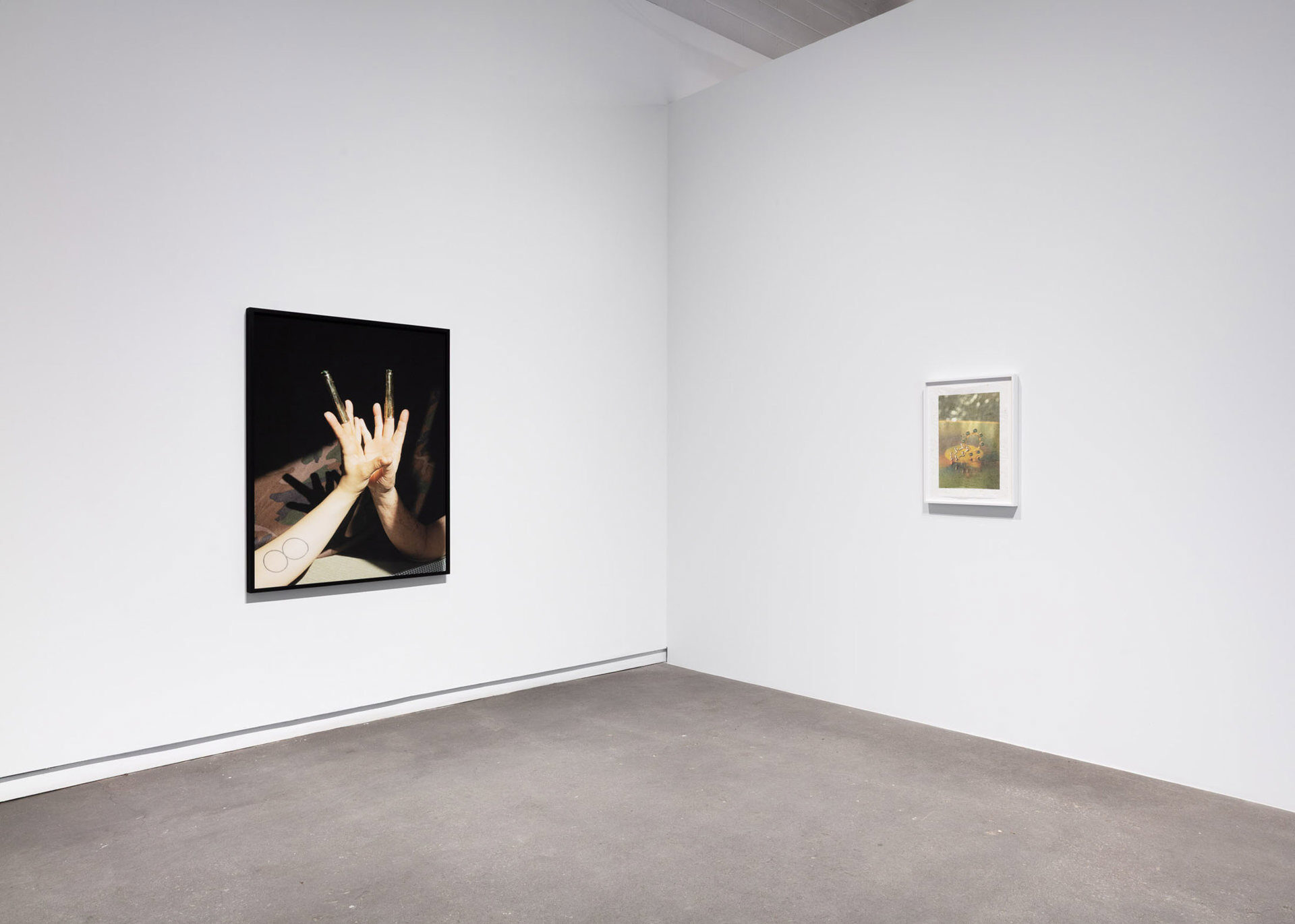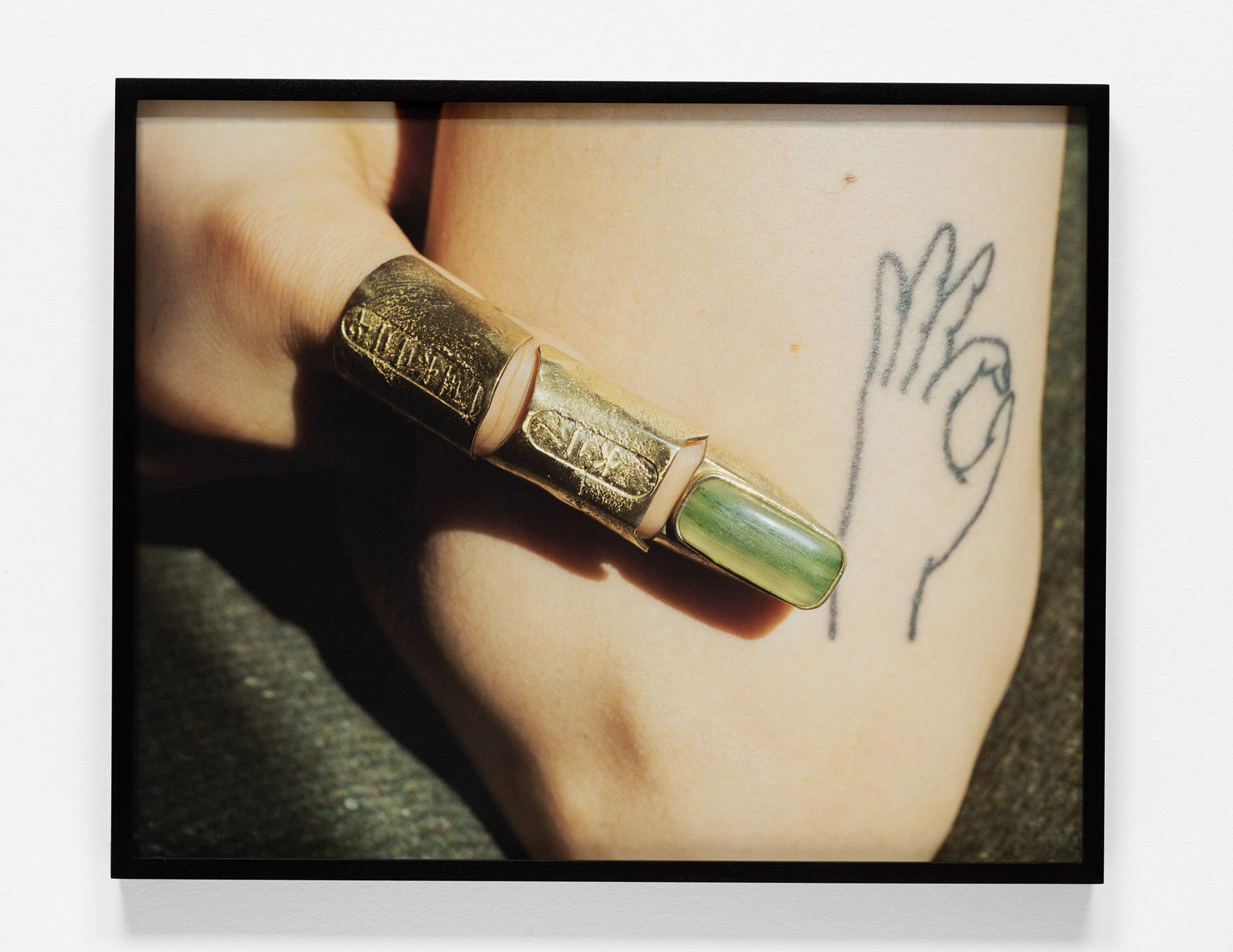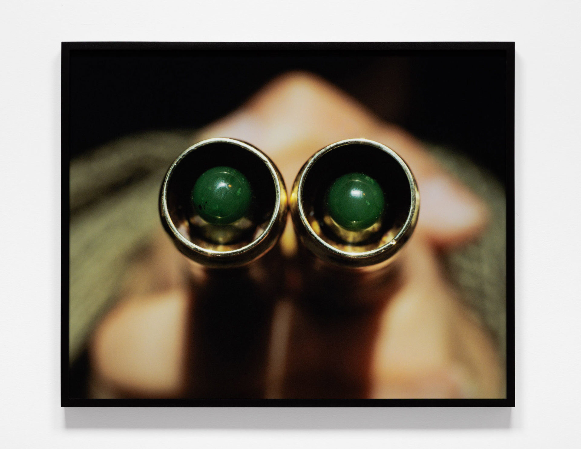 The photographs in Handy Work emerge from a collaborative process between Beckly and his father, a Chinese-Canadian war veteran. Based on conversations between the two about his father’s time as a weapons technician during the Vietnam War, Beckly worked with a local jewelry designer to fashion a series of unique rings referencing the shapes of bullets, casings, and shields, some inlaid with jade and gemstones. Their surfaces also reveal hints of the natural world: the veins of a leaf or the rippled texture of water. These are based on Beckly’s existing photographs, which have been translated into brass using 3D printing technology. Captured in chiaroscuro lighting against army-green and camouflage-patterned backdrops, the rings appear on Beckly’ and his father’s hands, as they twist and tangle in various evocative…