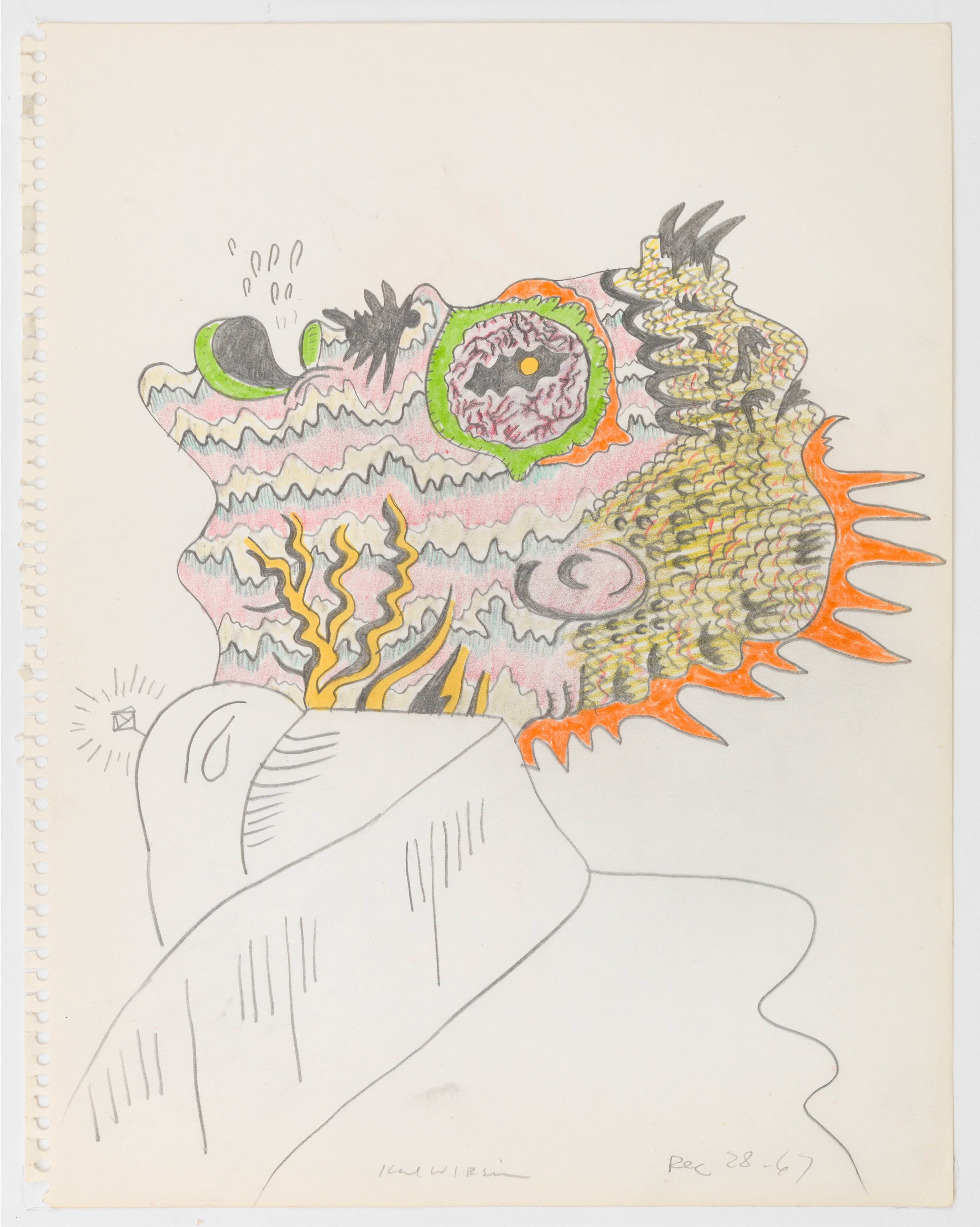 For Wirsum, drawing has always been central to his creative practice, an outlet for spontaneity as well as a means of working through an idea in terms of both content and form. Through repeated iterations, sometimes spaced over the course of years, lines are meticulously perfected, color is finely tuned, and content evolves. For example, his Untitled (Study for Gargoyle Gargle Oil), 1967, features a humanoid figure in profile, his scaly face and bulging eyes carefully colored and patterned. This is one of several versions of this theme, and over time, humanoid slowly morphs into reptile and back to humanoid, as the final painting (currently on view in the exhibition Sixties Surreal at the Whitney Museum of…