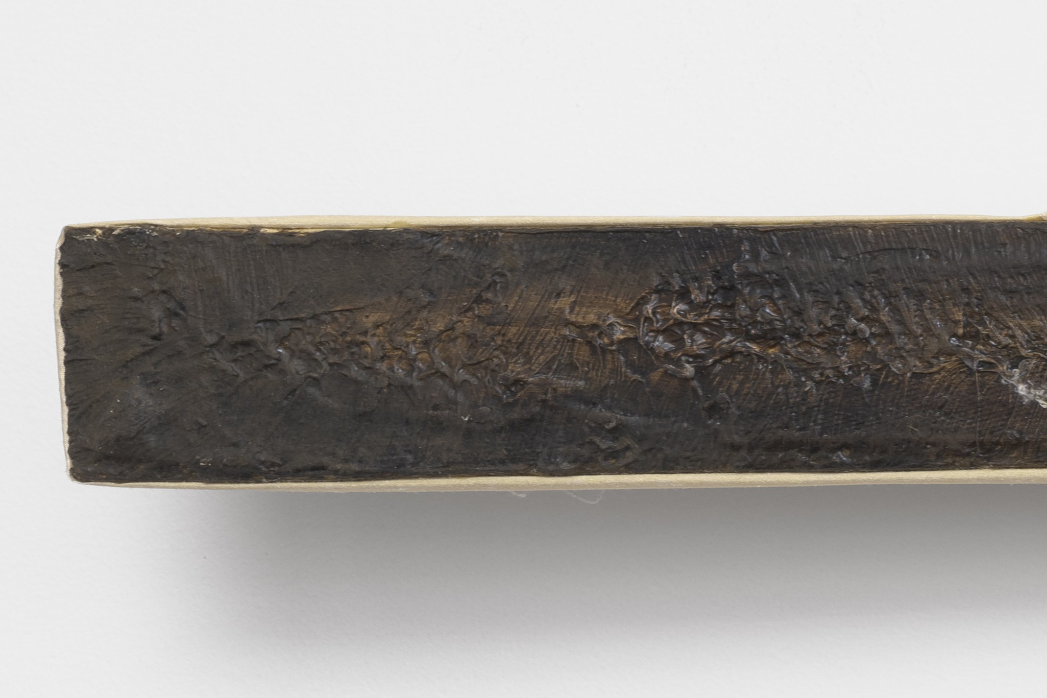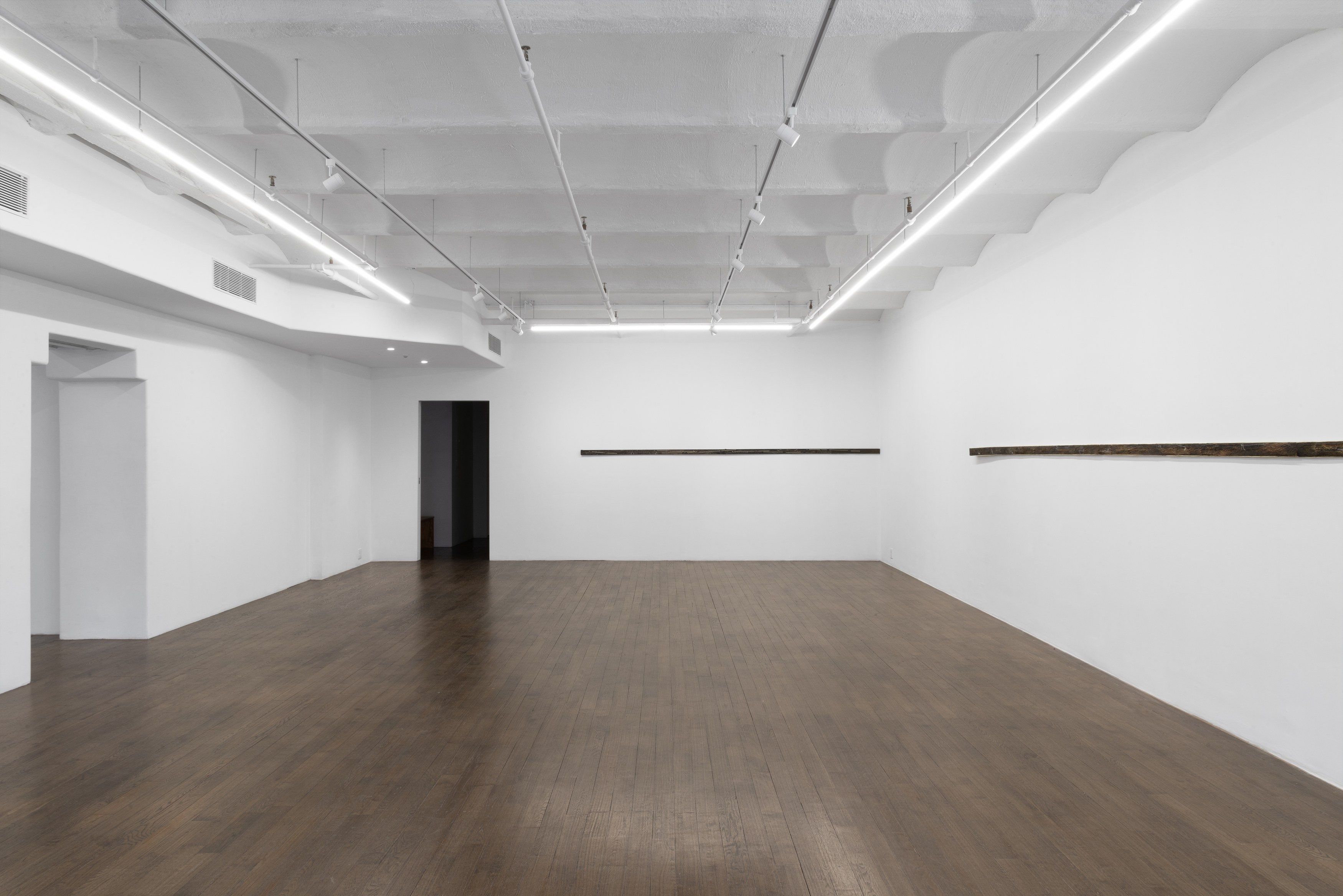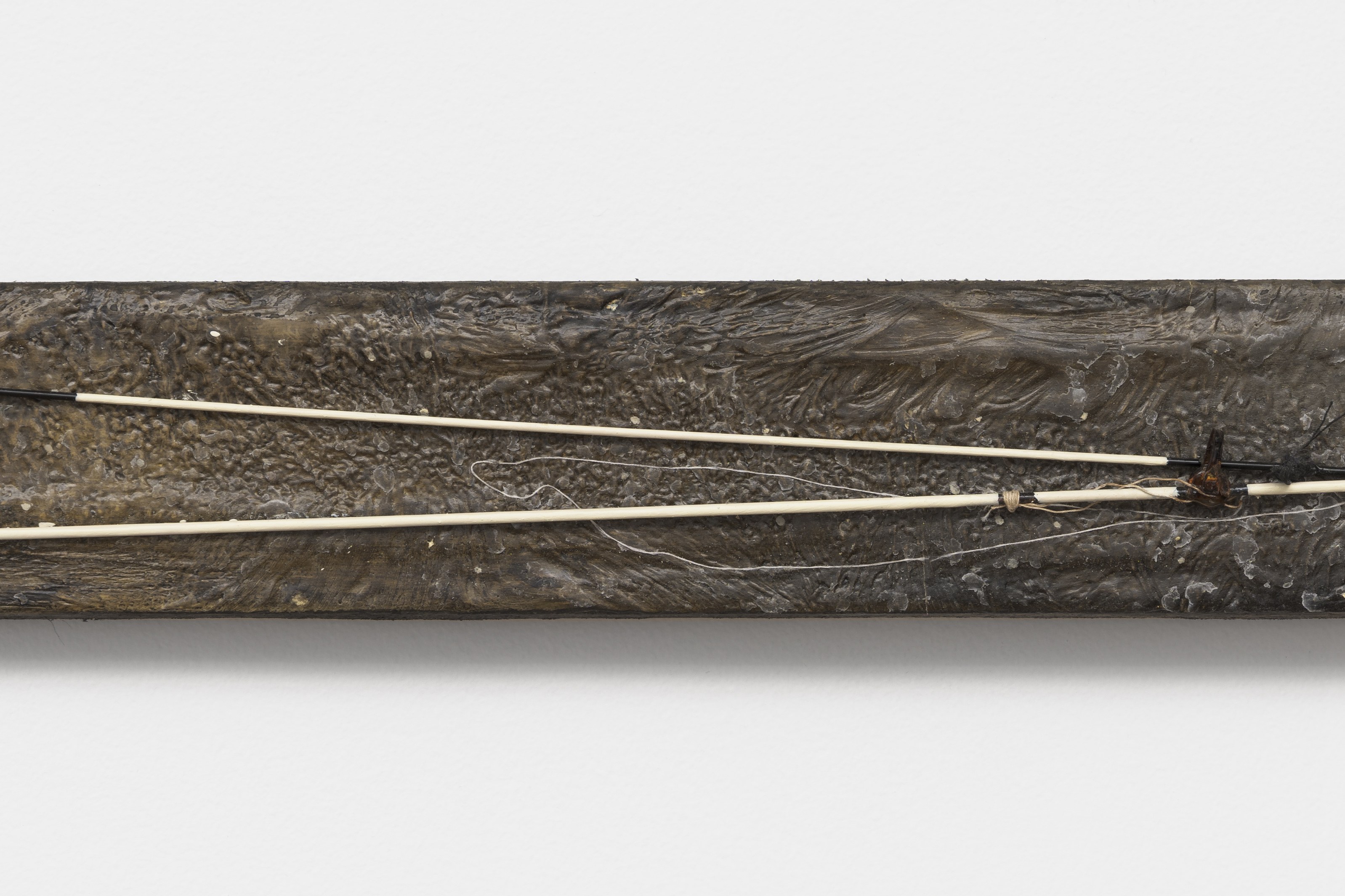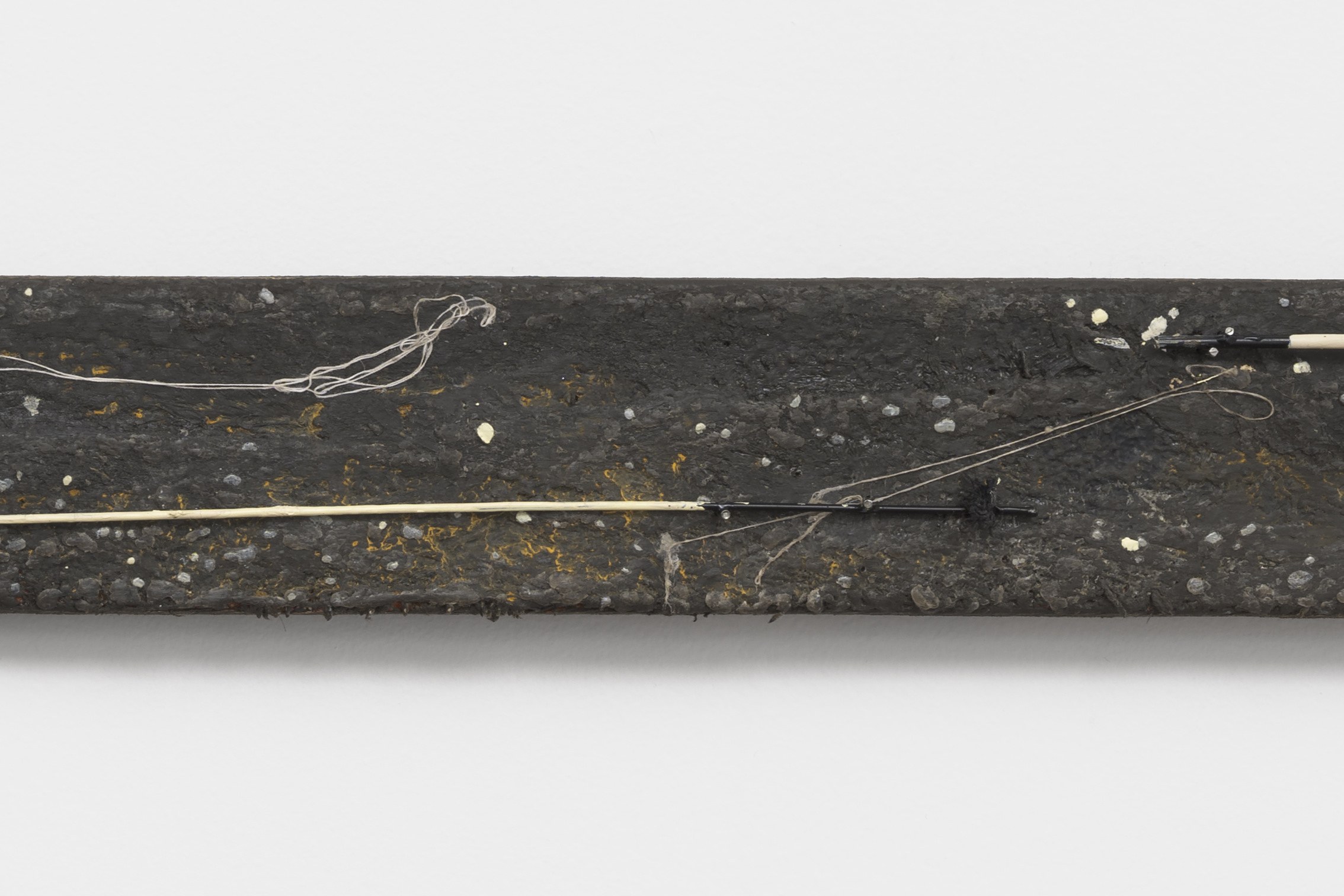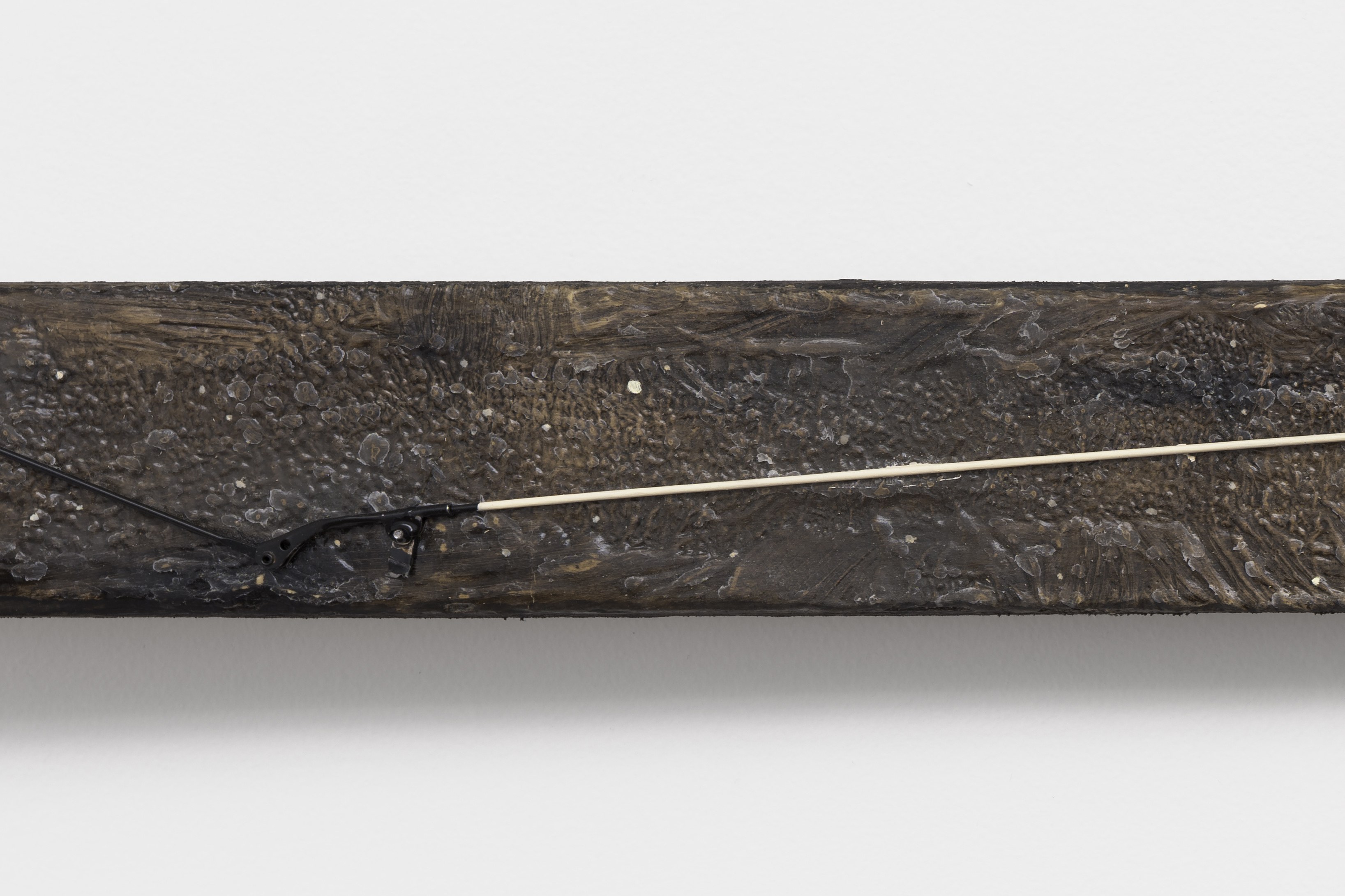 This exhibition presents a new series of elongated, asphalt-darkened works hung as a low horizon line. The narrow, compressed format frames instances of movement within solid, contoured boundaries. Composed of two or three parts, the oil painted works are articulated with metal umbrella ribs that extend across their surfaces in diagrammatic formations. Intricate, curving, and V-shaped lines trace directional motion over sedimentary texture, resonating with archival photographs I’ve been drawn to—those of subatomic particle paths and the mechanical infrastructures of refining plants.