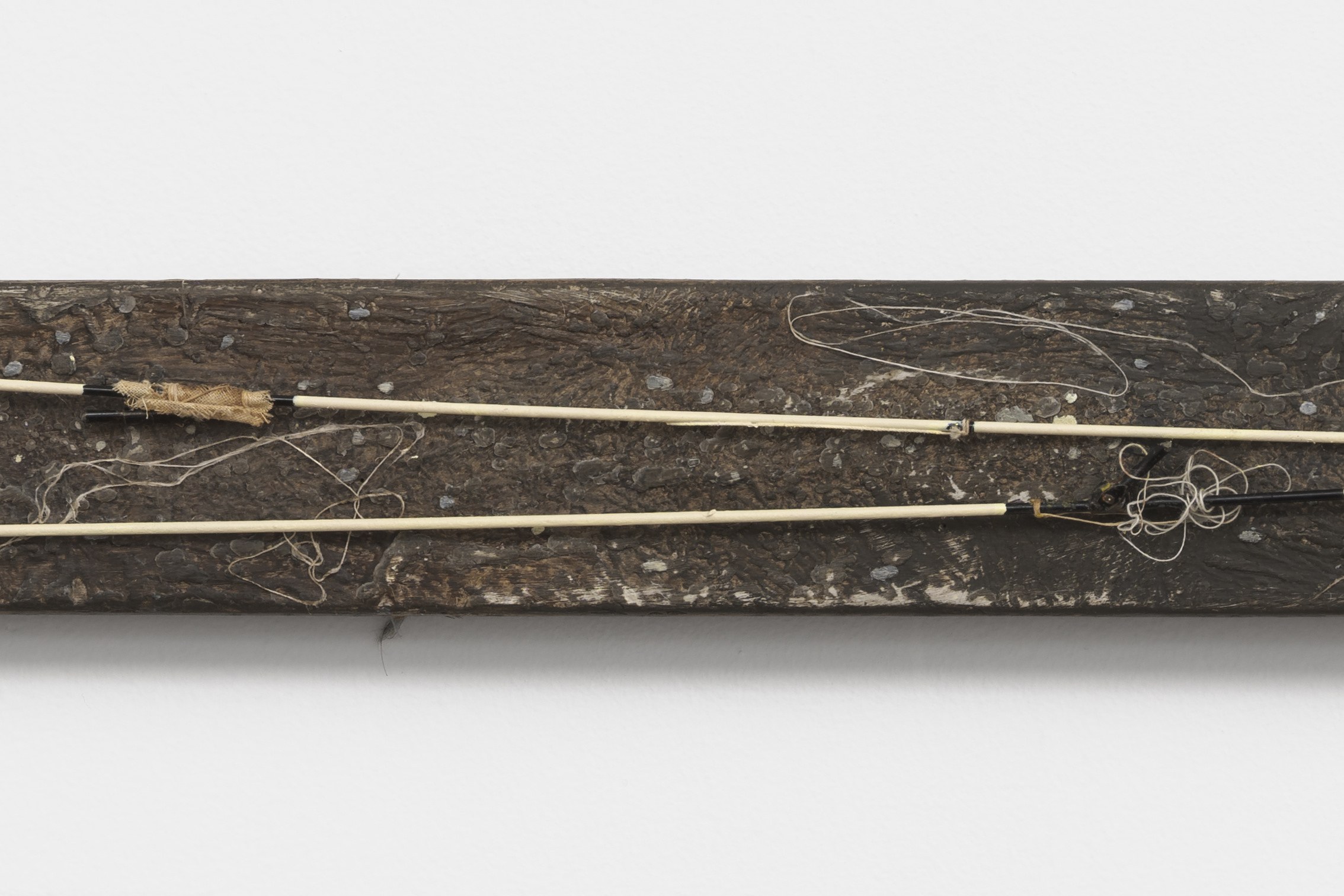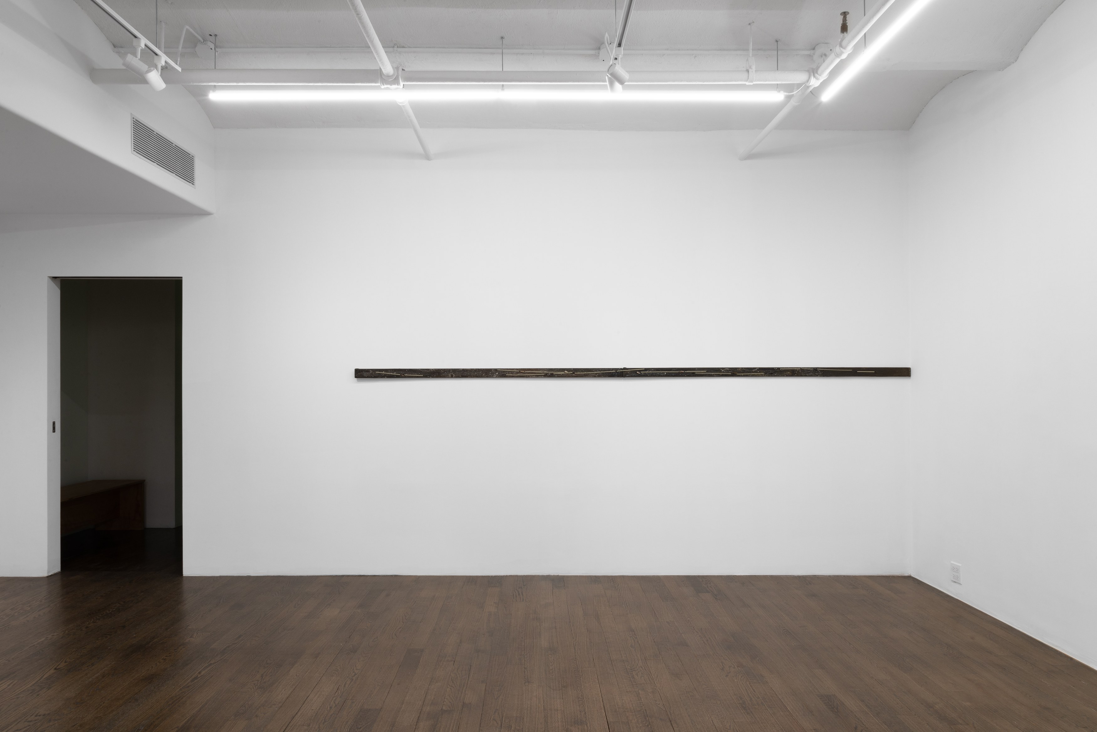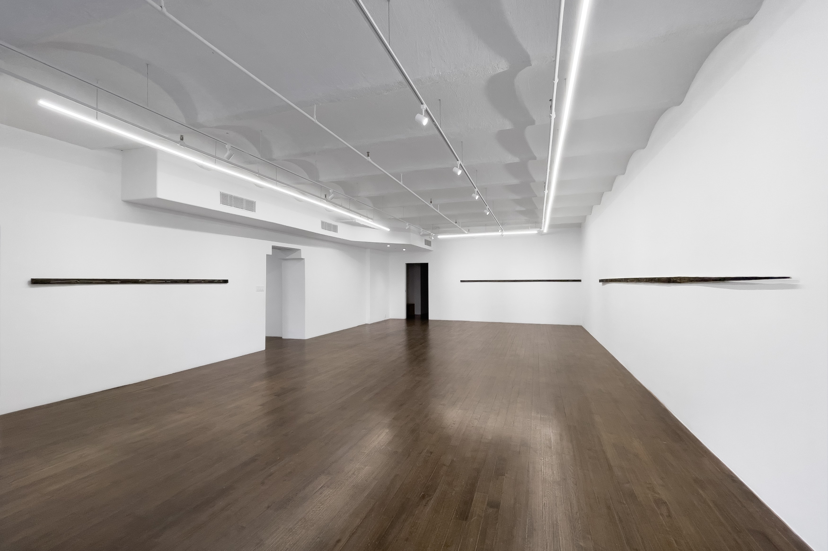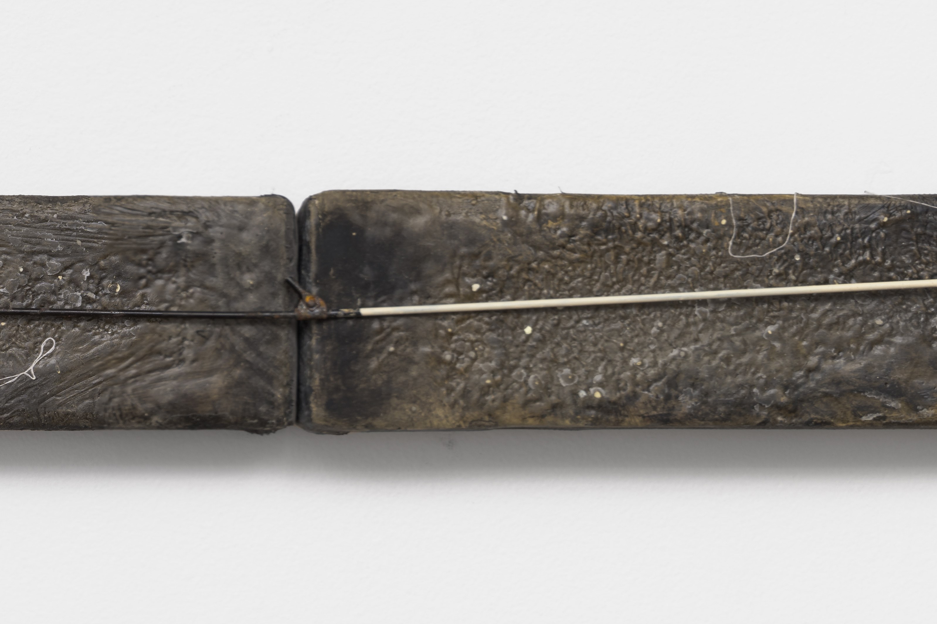 This exhibition presents a new series of elongated, asphalt-darkened works hung as a low horizon line. The narrow, compressed format frames instances of movement within solid, contoured boundaries. Composed of two or three parts, the oil painted works are articulated with metal umbrella ribs that extend across their surfaces in diagrammatic formations. Intricate, curving, and V-shaped lines trace directional motion over sedimentary texture, resonating with archival photographs I’ve been drawn to—those of subatomic particle paths and the mechanical infrastructures of refining plants.