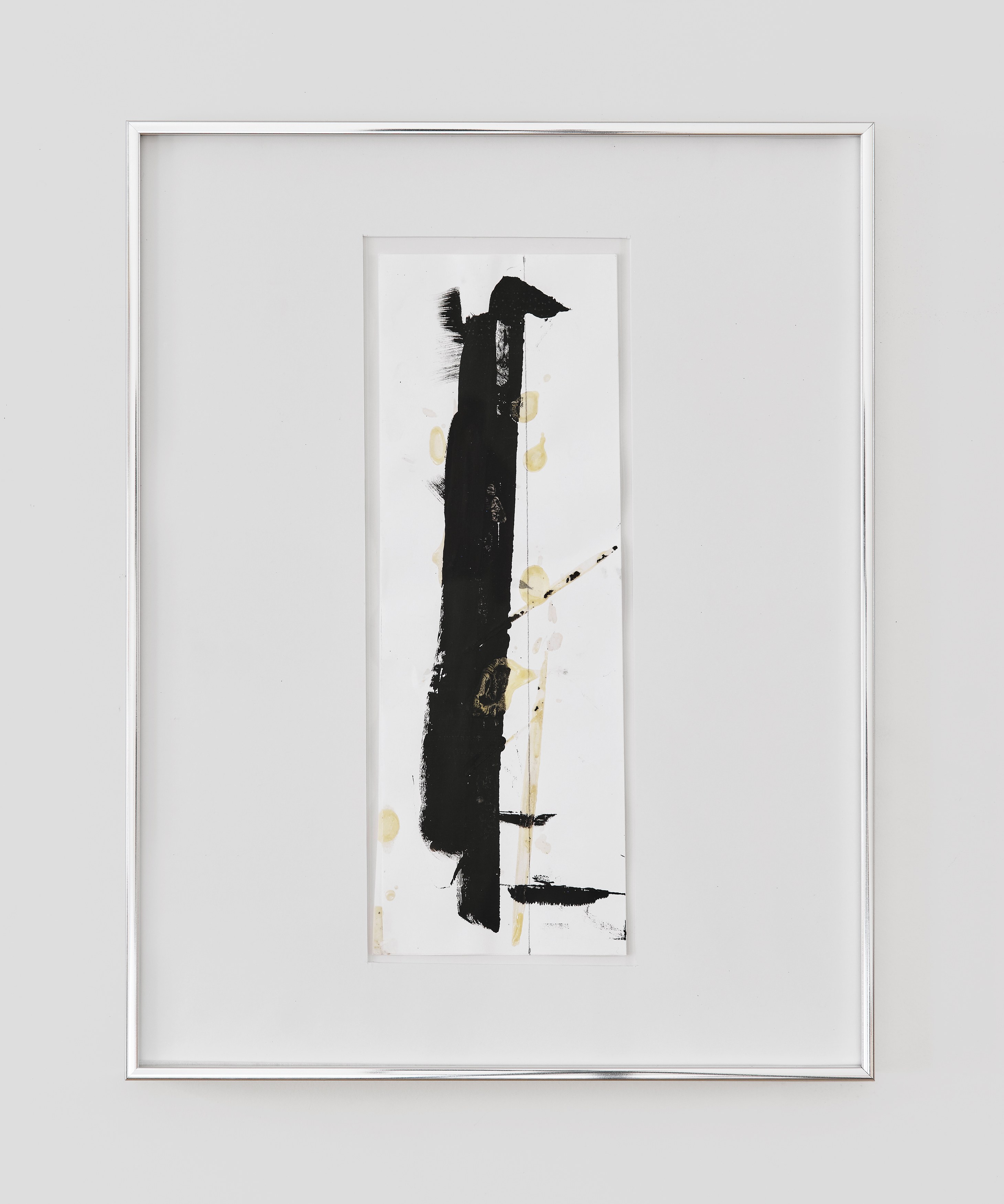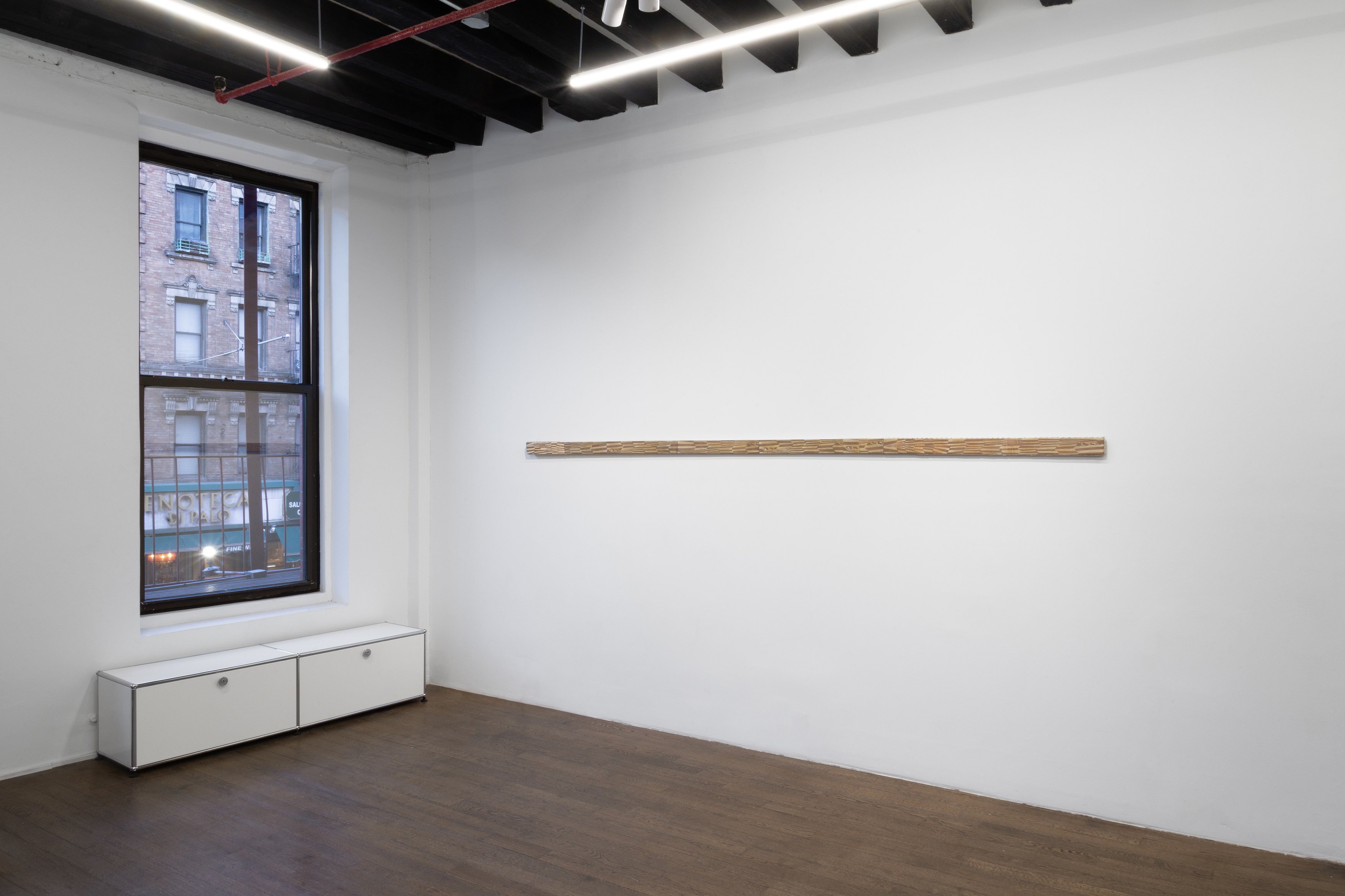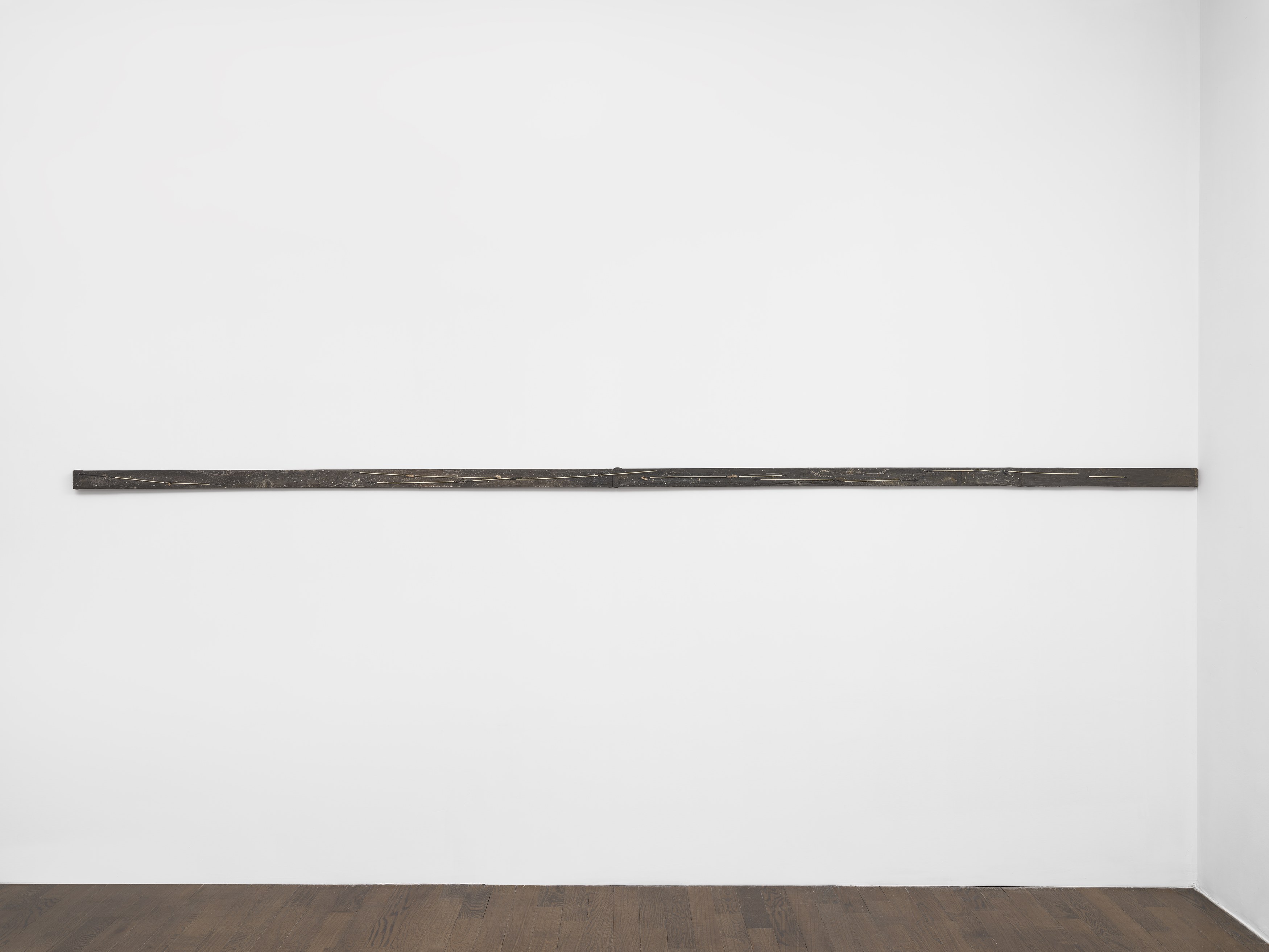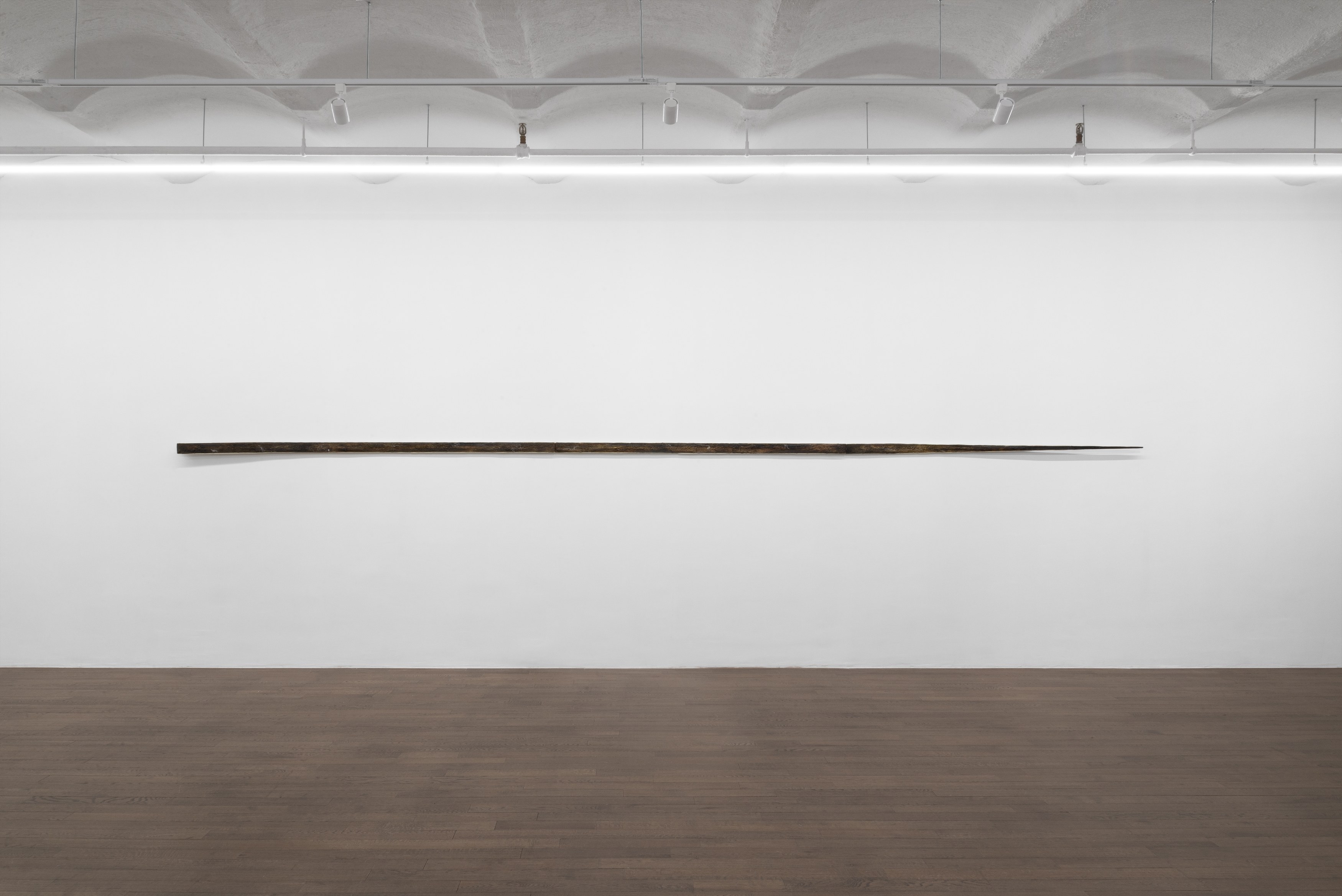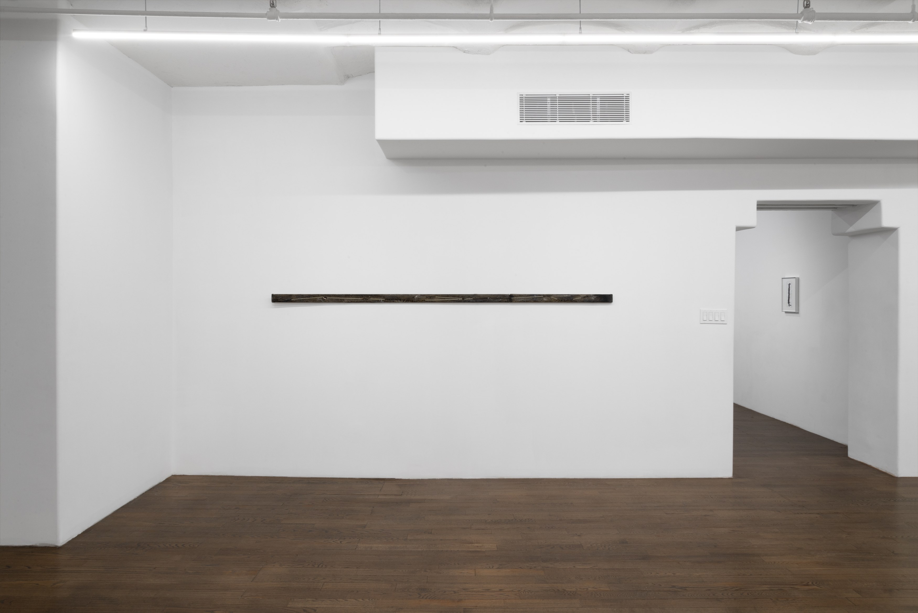 This exhibition presents a new series of elongated, asphalt-darkened works hung as a low horizon line. The narrow, compressed format frames instances of movement within solid, contoured boundaries. Composed of two or three parts, the oil painted works are articulated with metal umbrella ribs that extend across their surfaces in diagrammatic formations. Intricate, curving, and V-shaped lines trace directional motion over sedimentary texture, resonating with archival photographs I’ve been drawn to—those of subatomic particle paths and the mechanical infrastructures of refining plants.