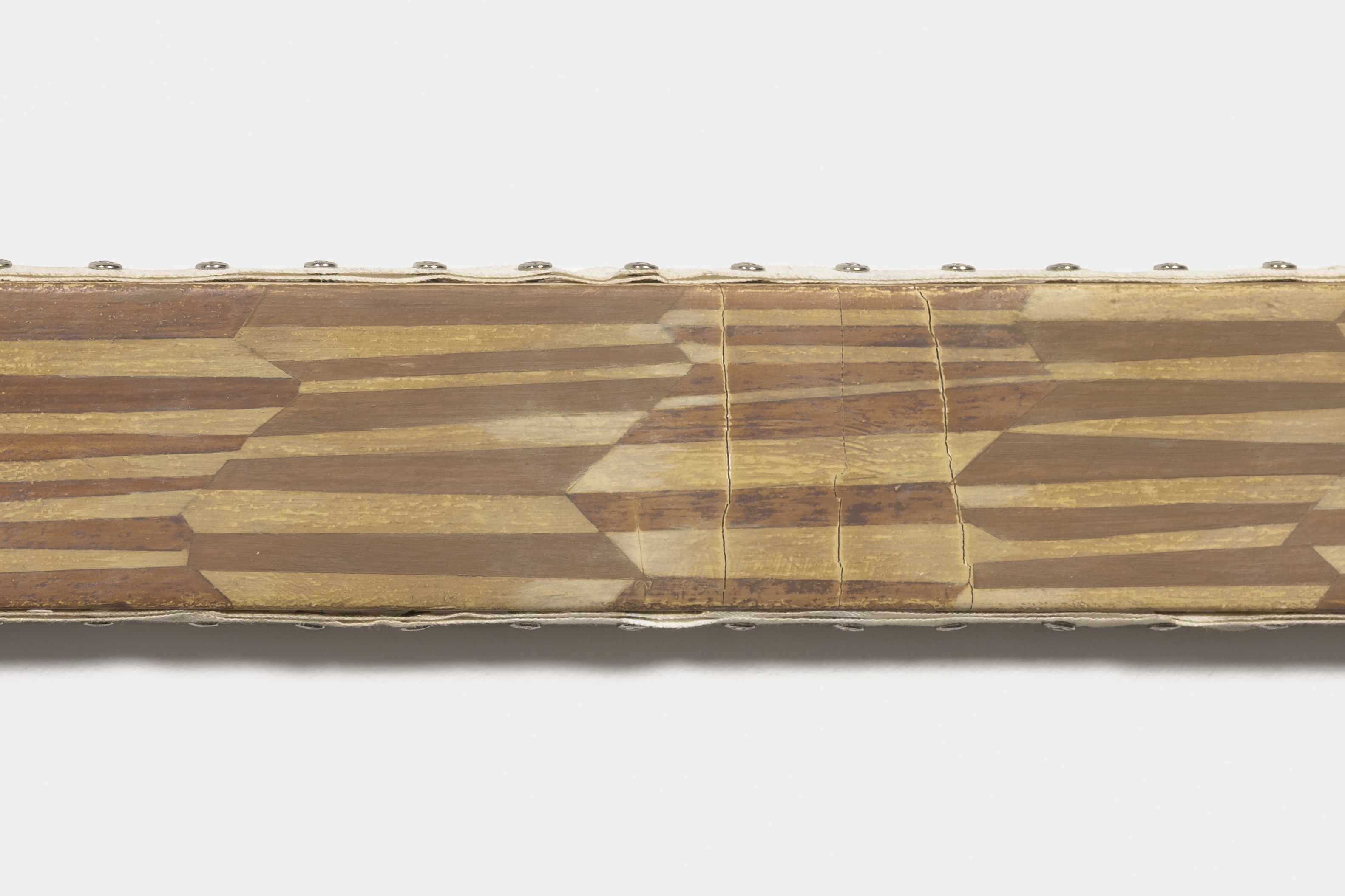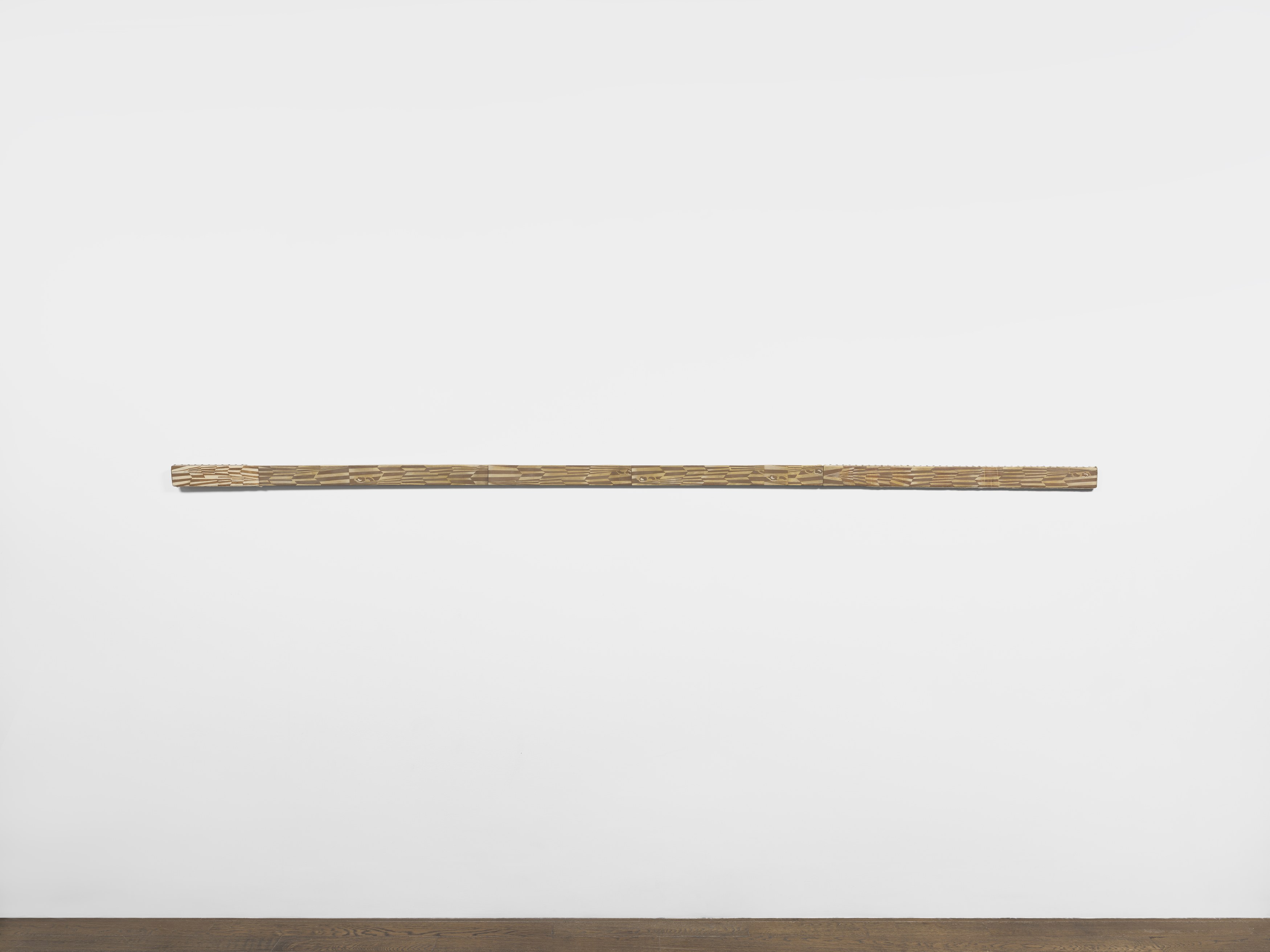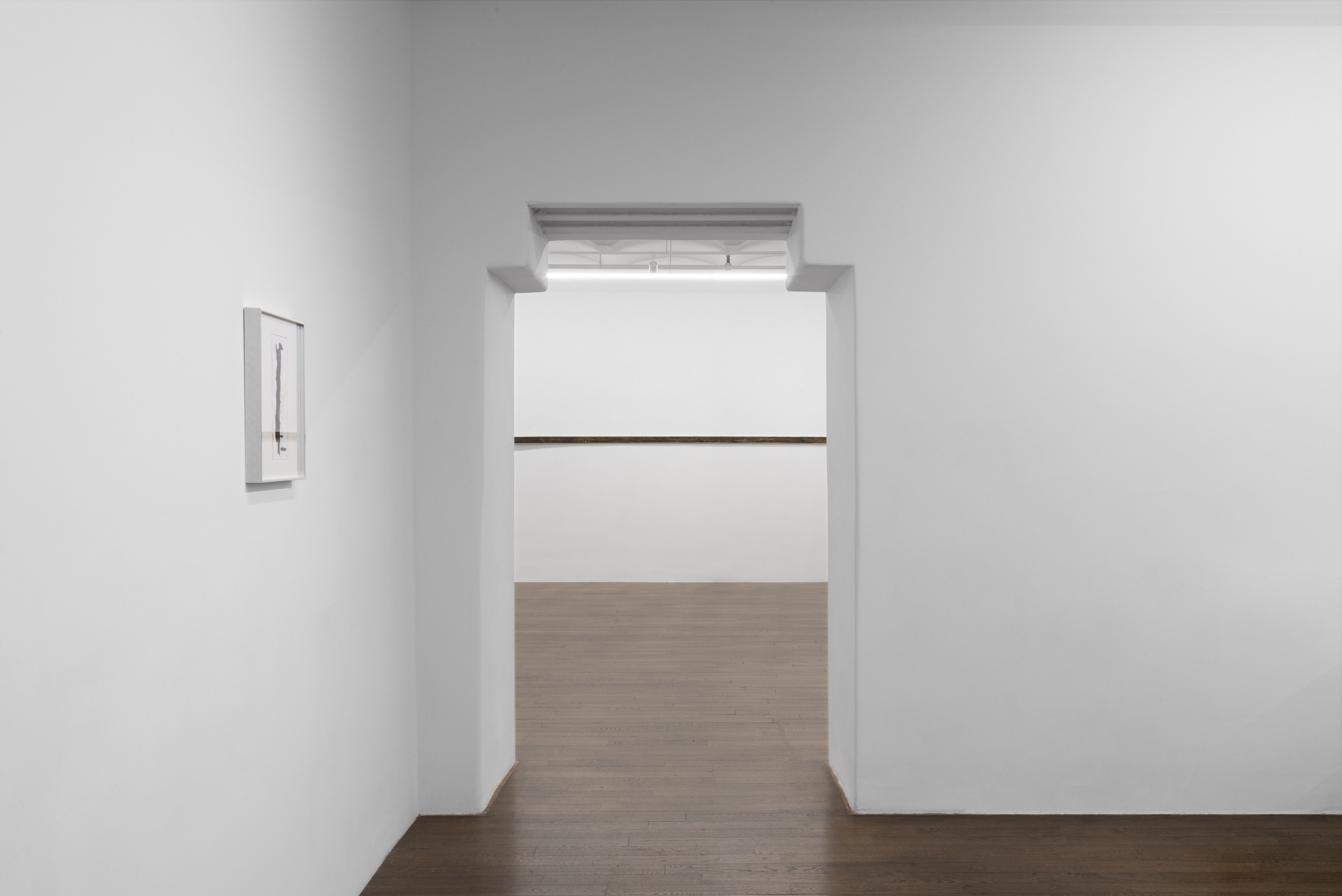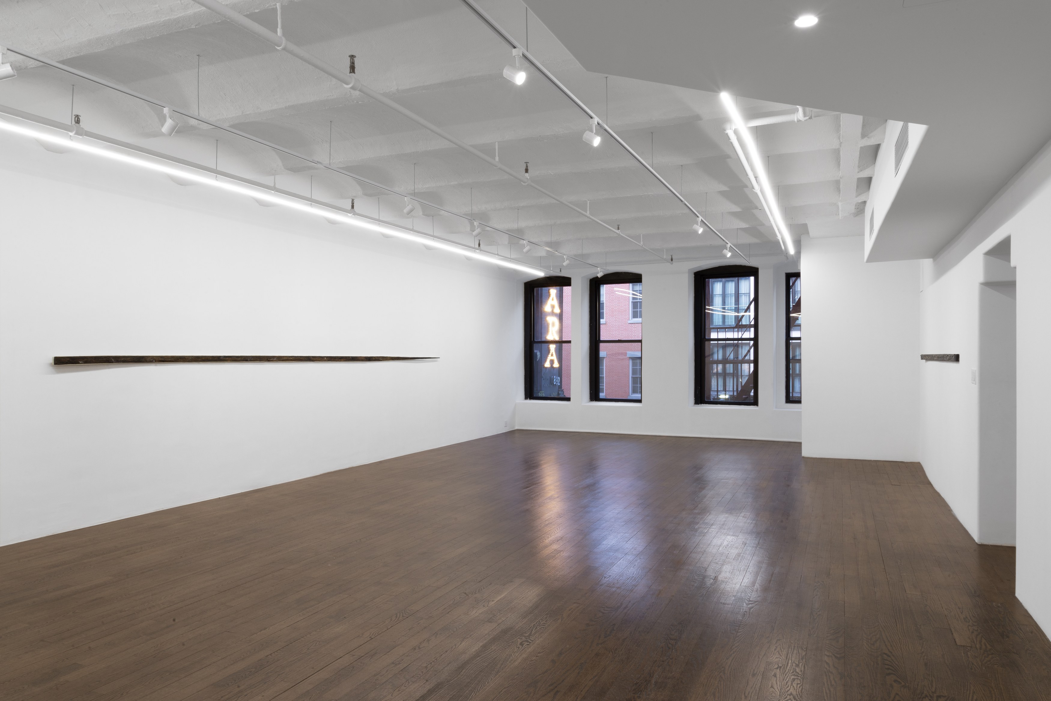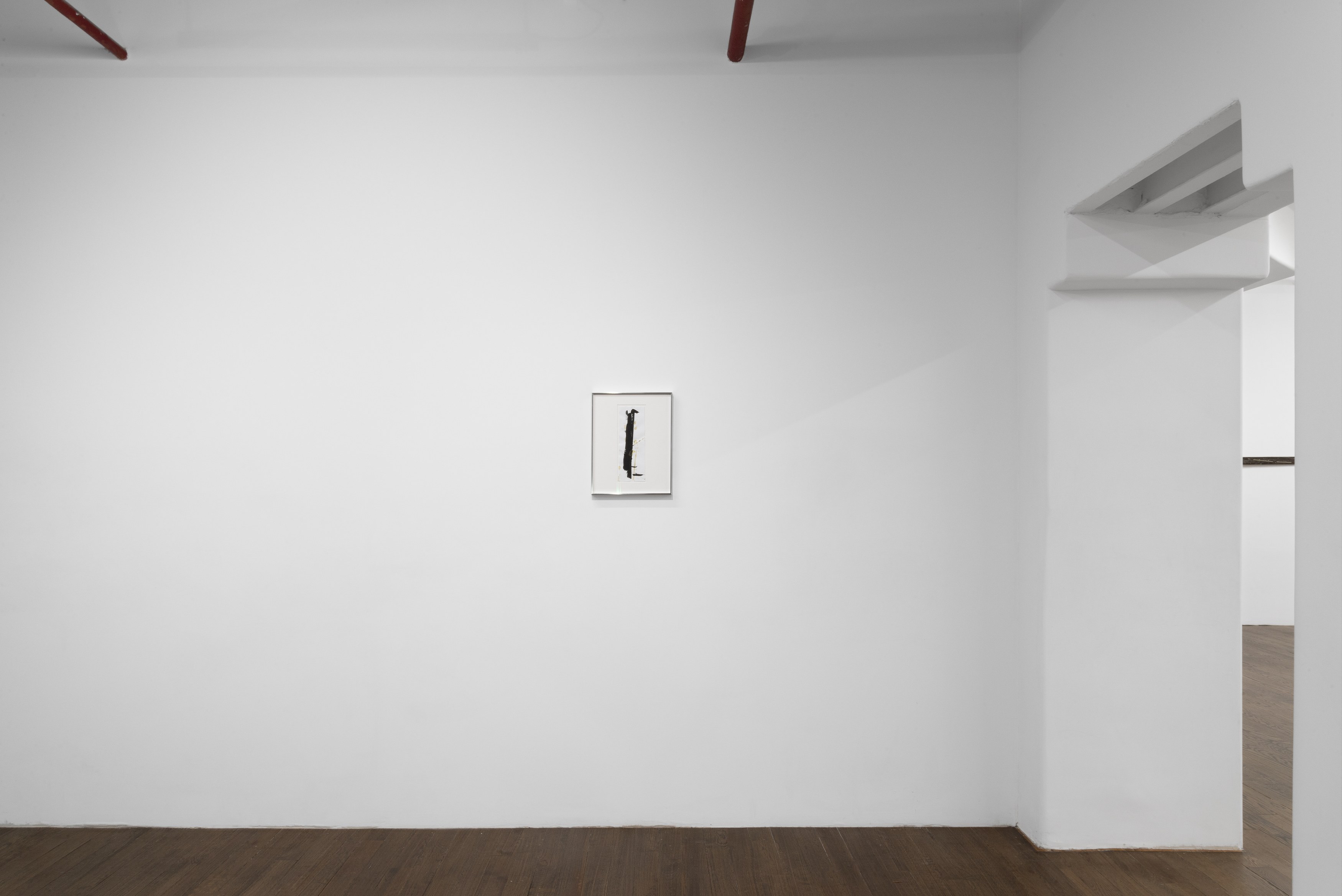 This exhibition presents a new series of elongated, asphalt-darkened works hung as a low horizon line. The narrow, compressed format frames instances of movement within solid, contoured boundaries. Composed of two or three parts, the oil painted works are articulated with metal umbrella ribs that extend across their surfaces in diagrammatic formations. Intricate, curving, and V-shaped lines trace directional motion over sedimentary texture, resonating with archival photographs I’ve been drawn to—those of subatomic particle paths and the mechanical infrastructures of refining plants.