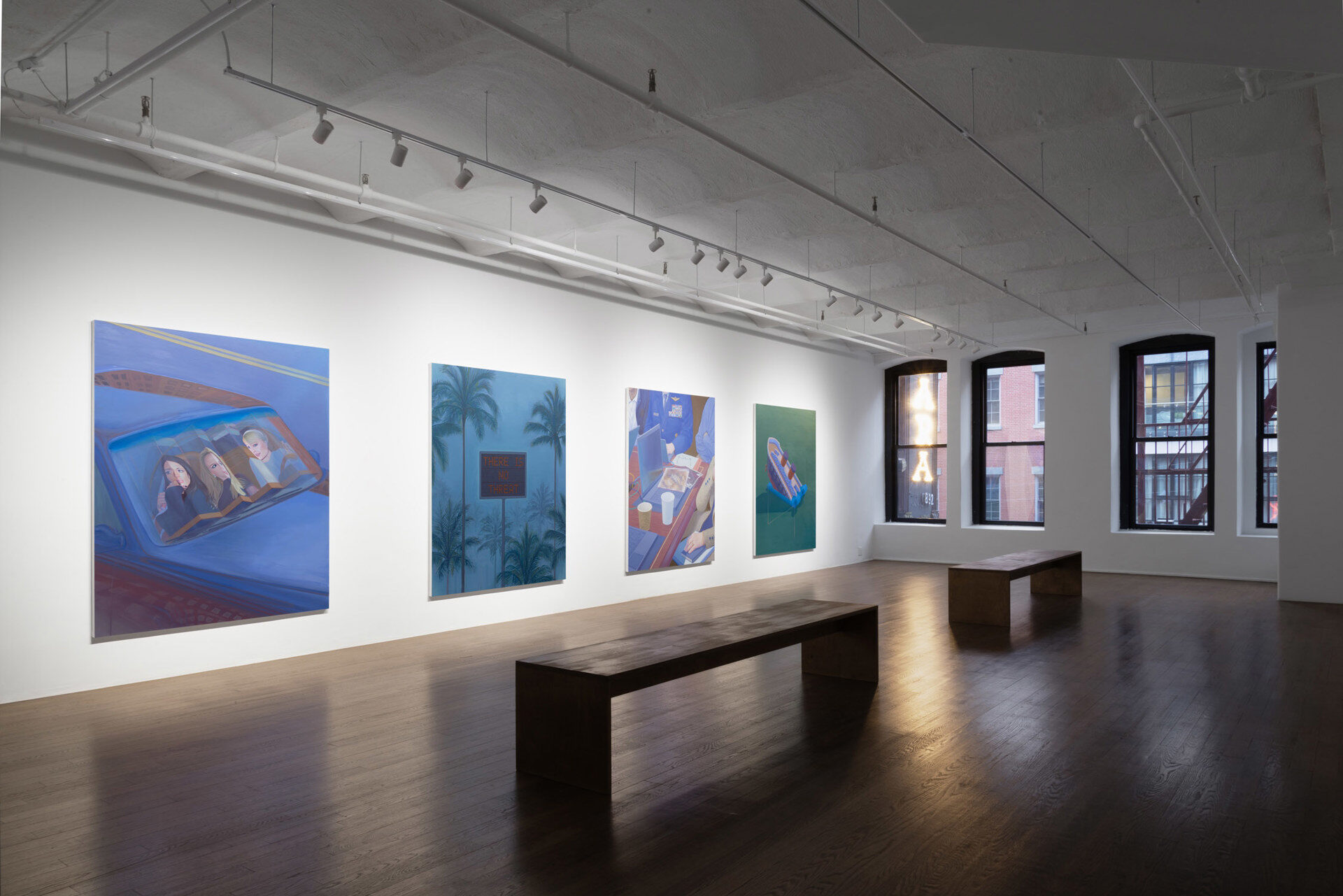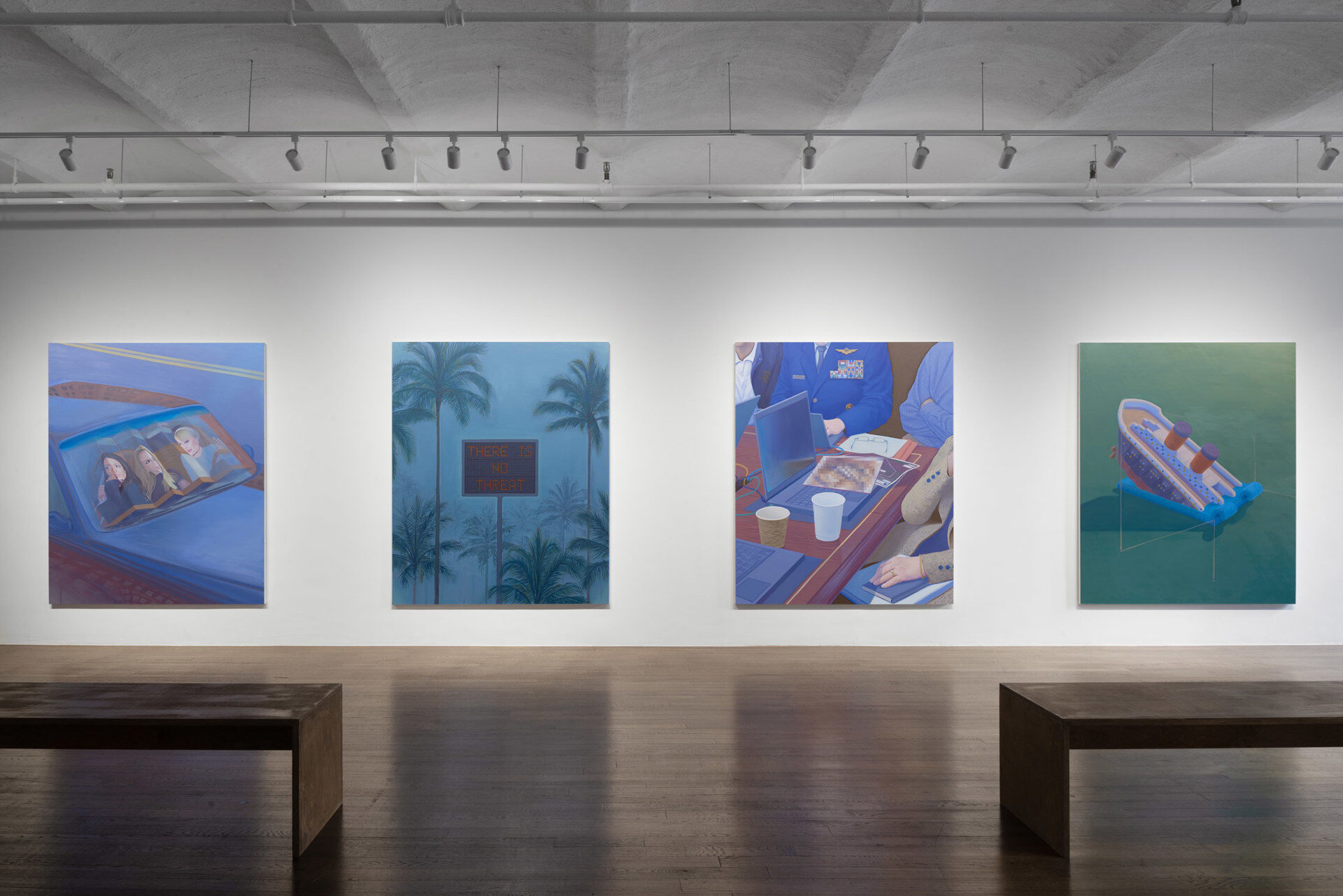 In a sequence of four paintings, Witt Fetter continues to reflect on the contemporary condition of images in American visual culture. Through a repetition of color, form, and compositional structure, the paintings build a network of historic moments arranged in unexpected relation to each other. The work exists somewhere between genre and history painting—specific people, places and events are depicted in their afterlives as mutated fragments.
