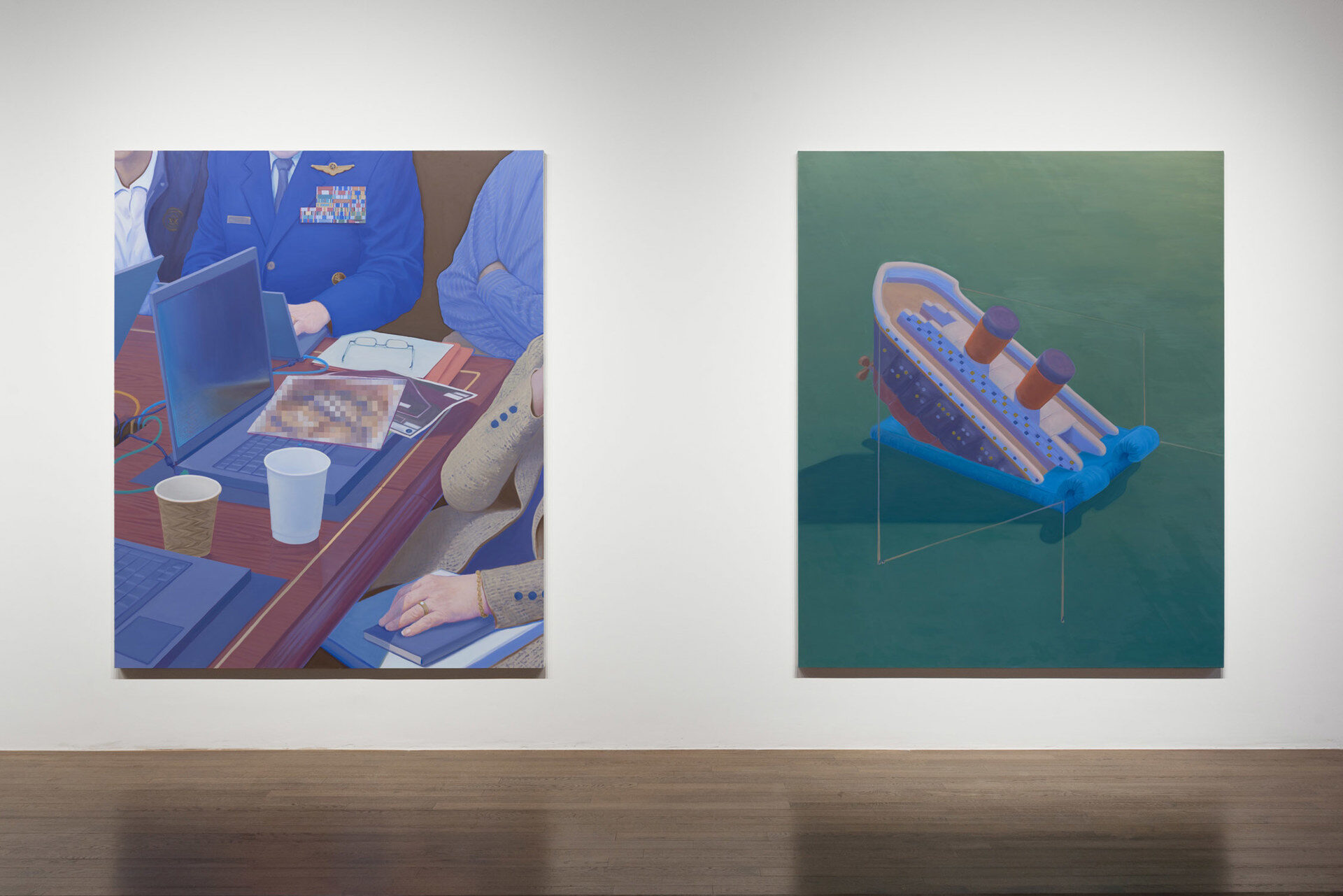 An artifact of mid-aughts pop culture folds into the lenticular surface of a windshield sun reflector. A public reassurance of safety following a falsely issued missile alert obfuscates a reality of ongoing disaster. A photograph of government and military officials during the raid to capture and kill Osama Bin Laden is cropped into a still life of abstracted violence and war fought under fluorescent lights. A hundred-year-old tragedy, the sinking of the Titanic, dissolves into the shape of an inflatable bouncy slide.